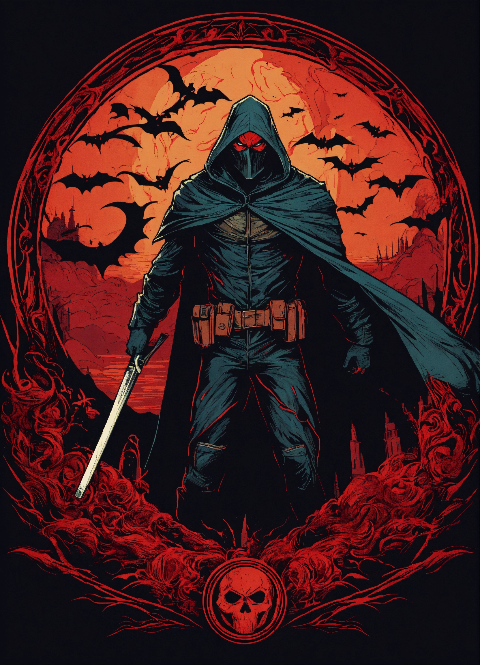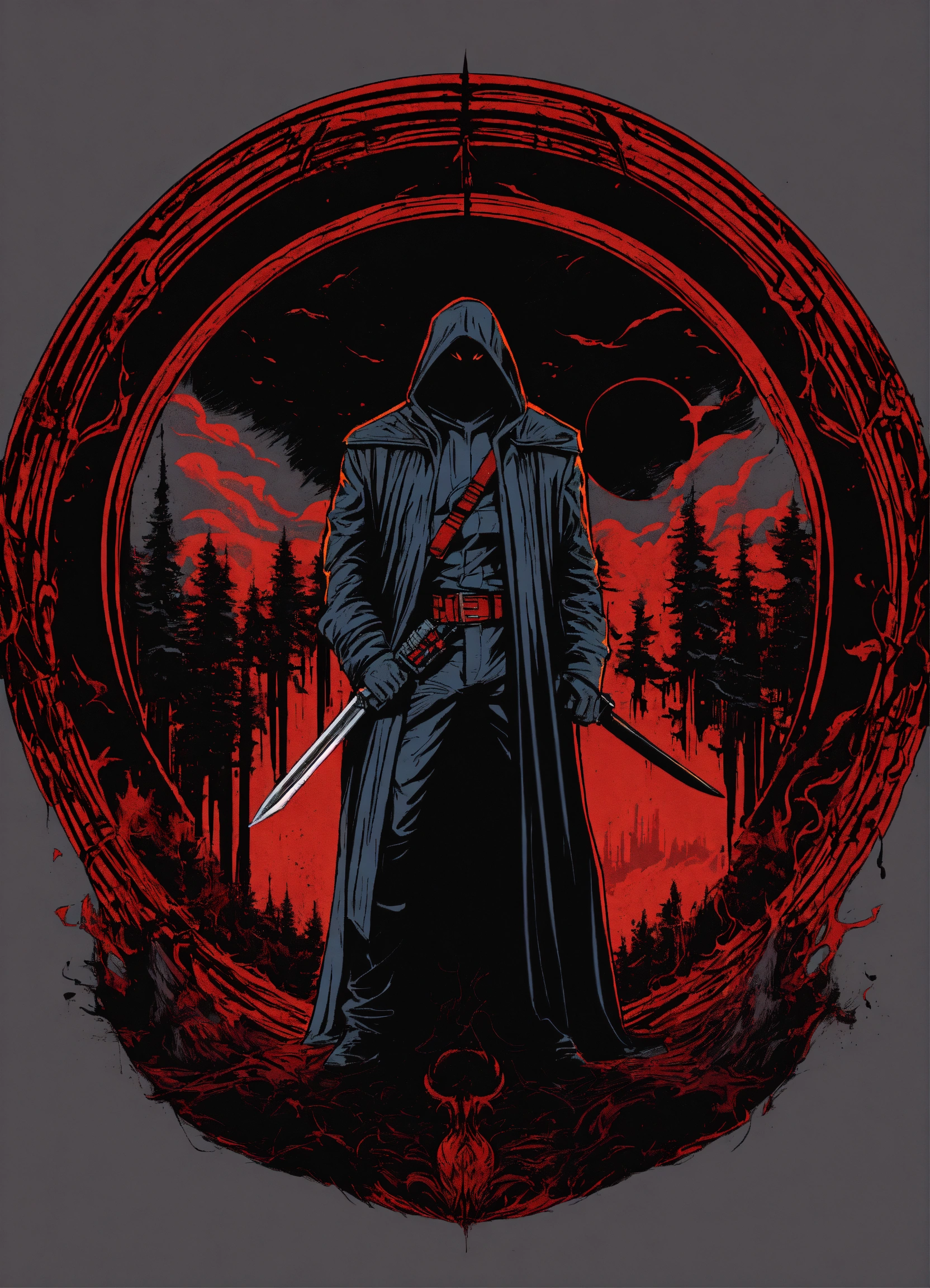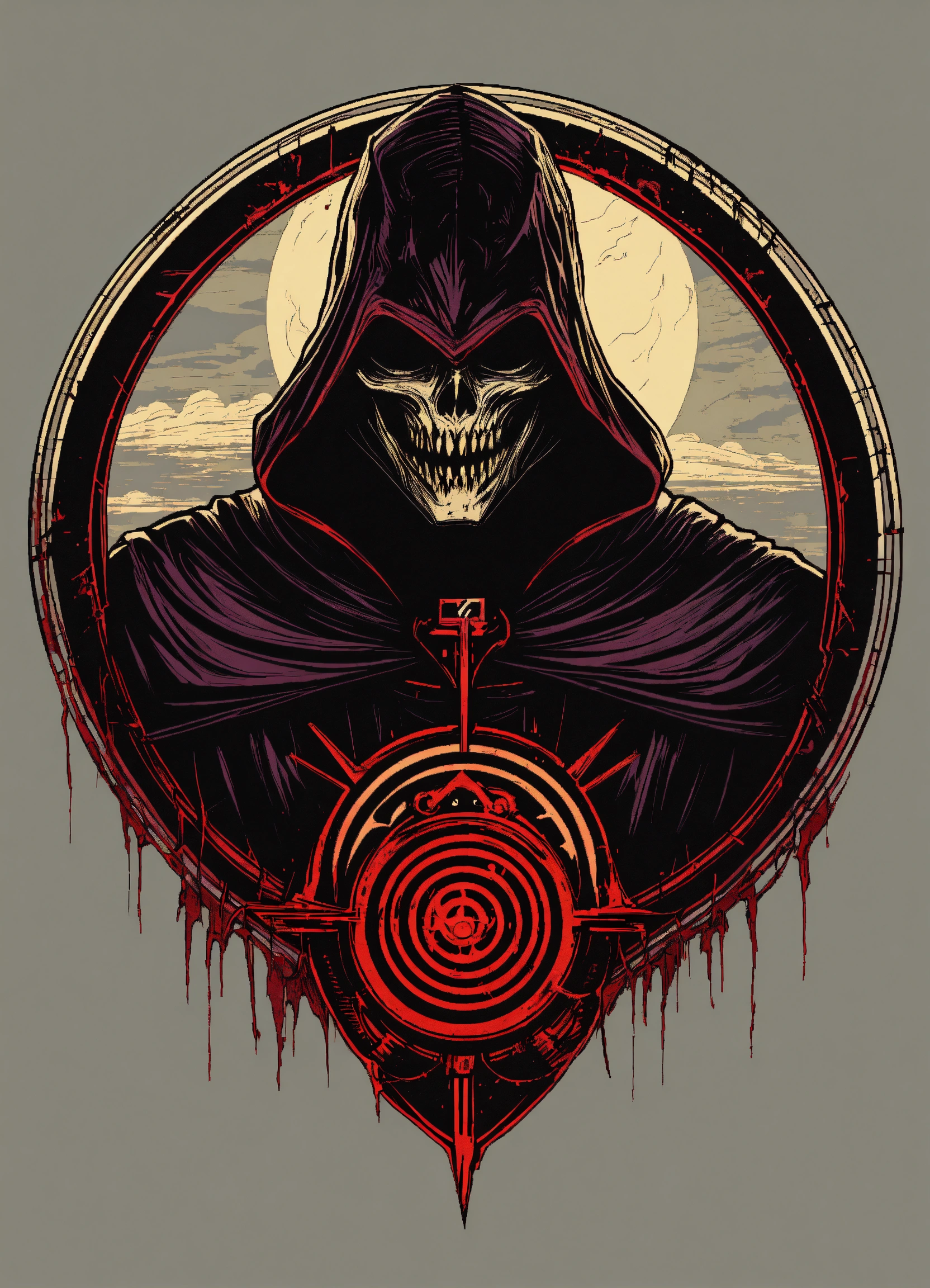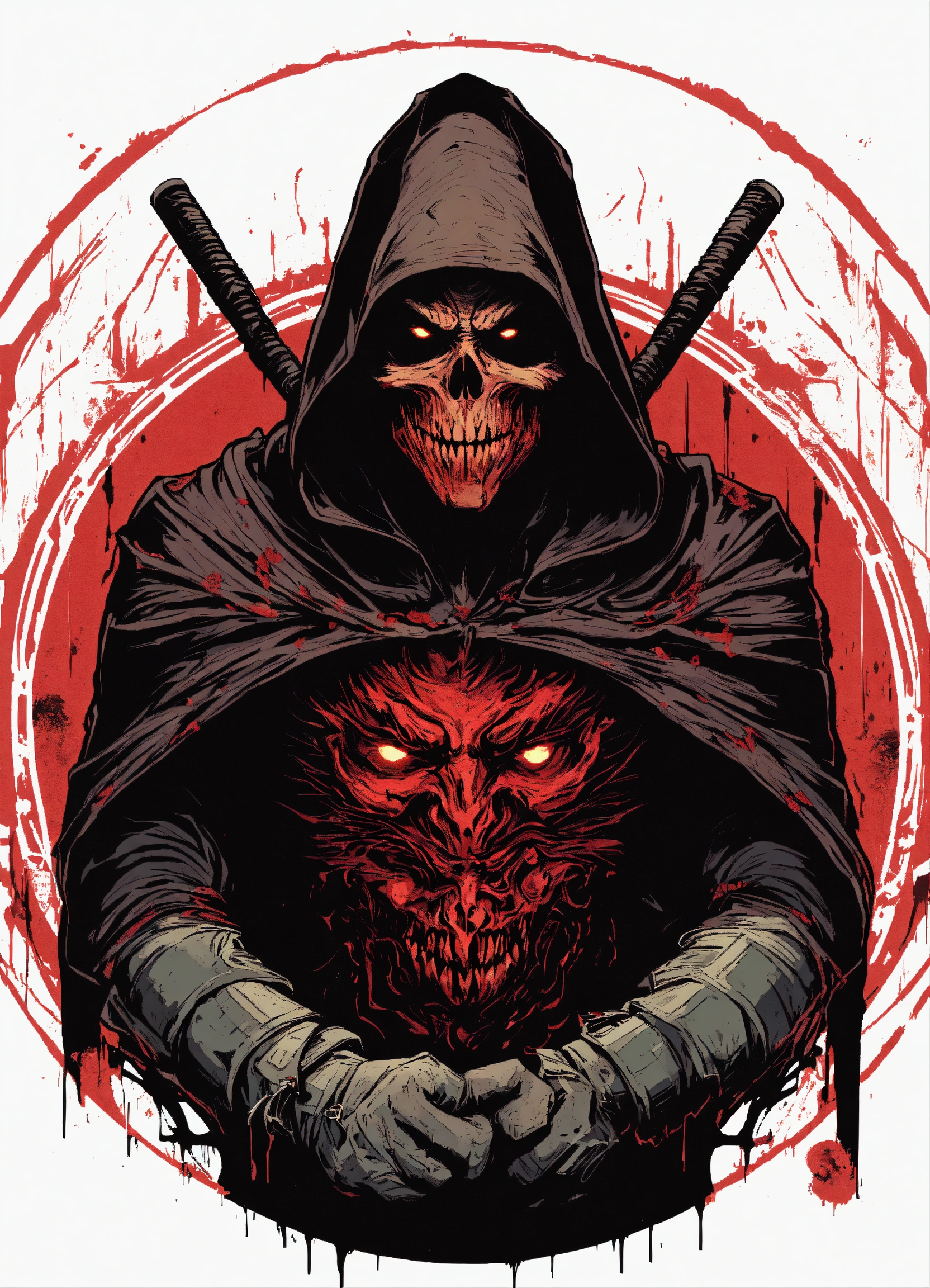 Evil scary ominous vigilante in a circle, tshirt design, retro, vector artwork, art by dan mumford, white background