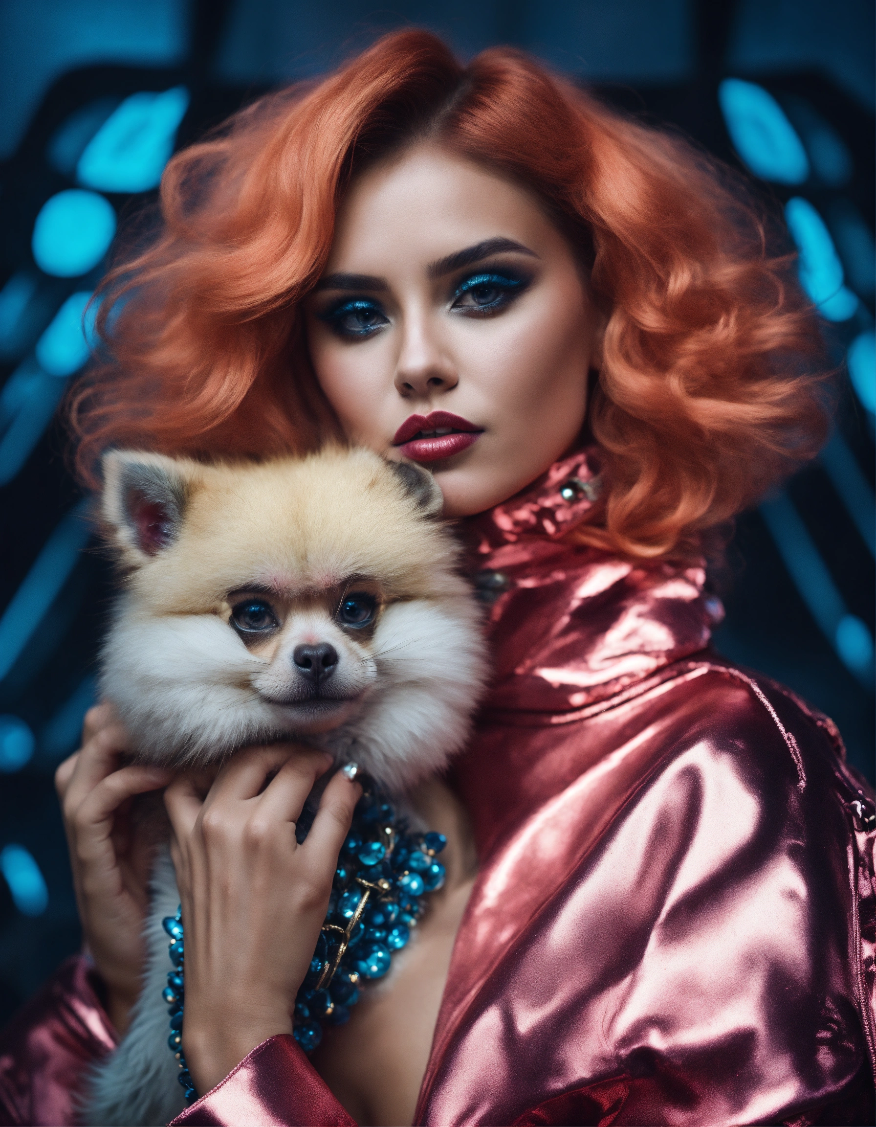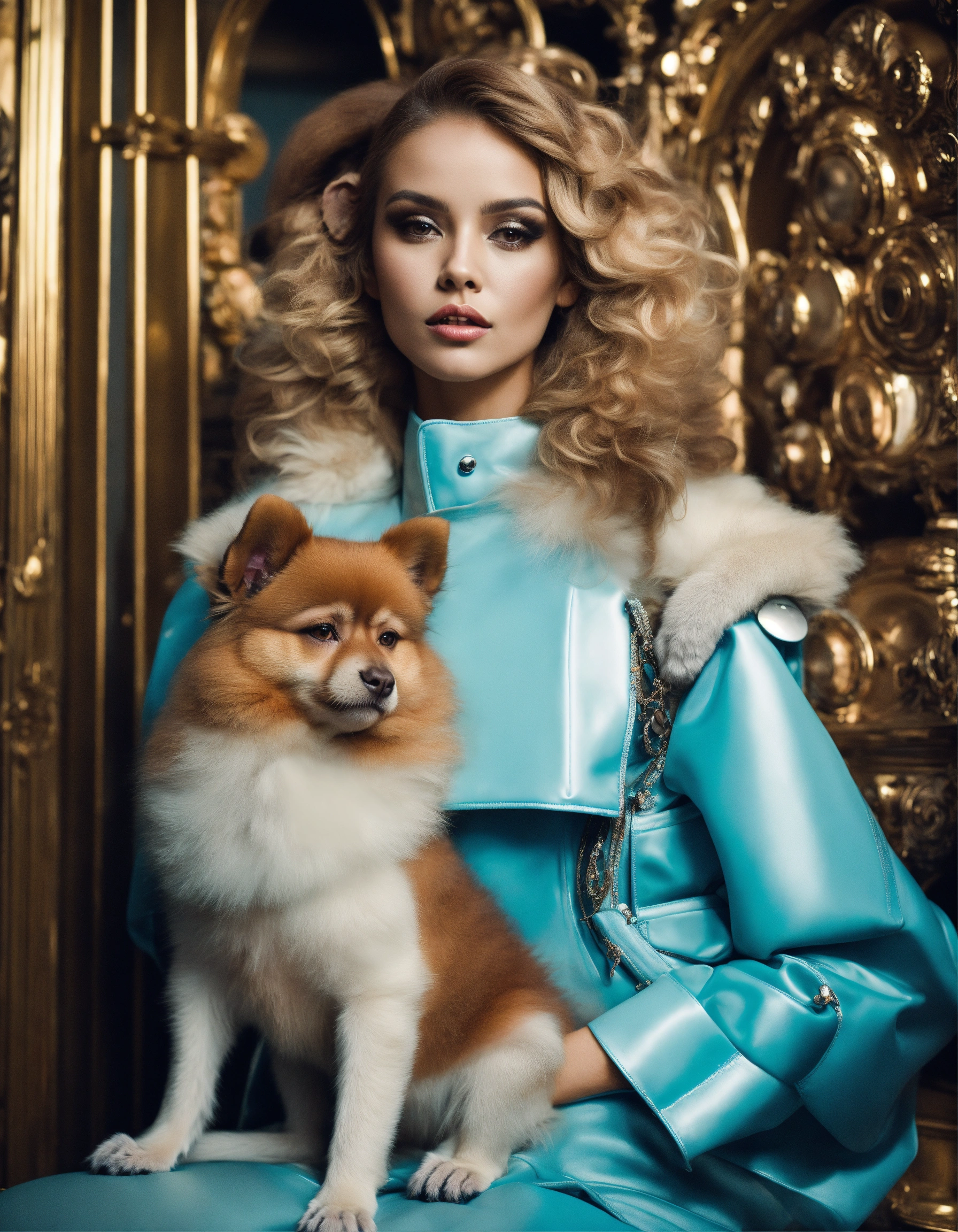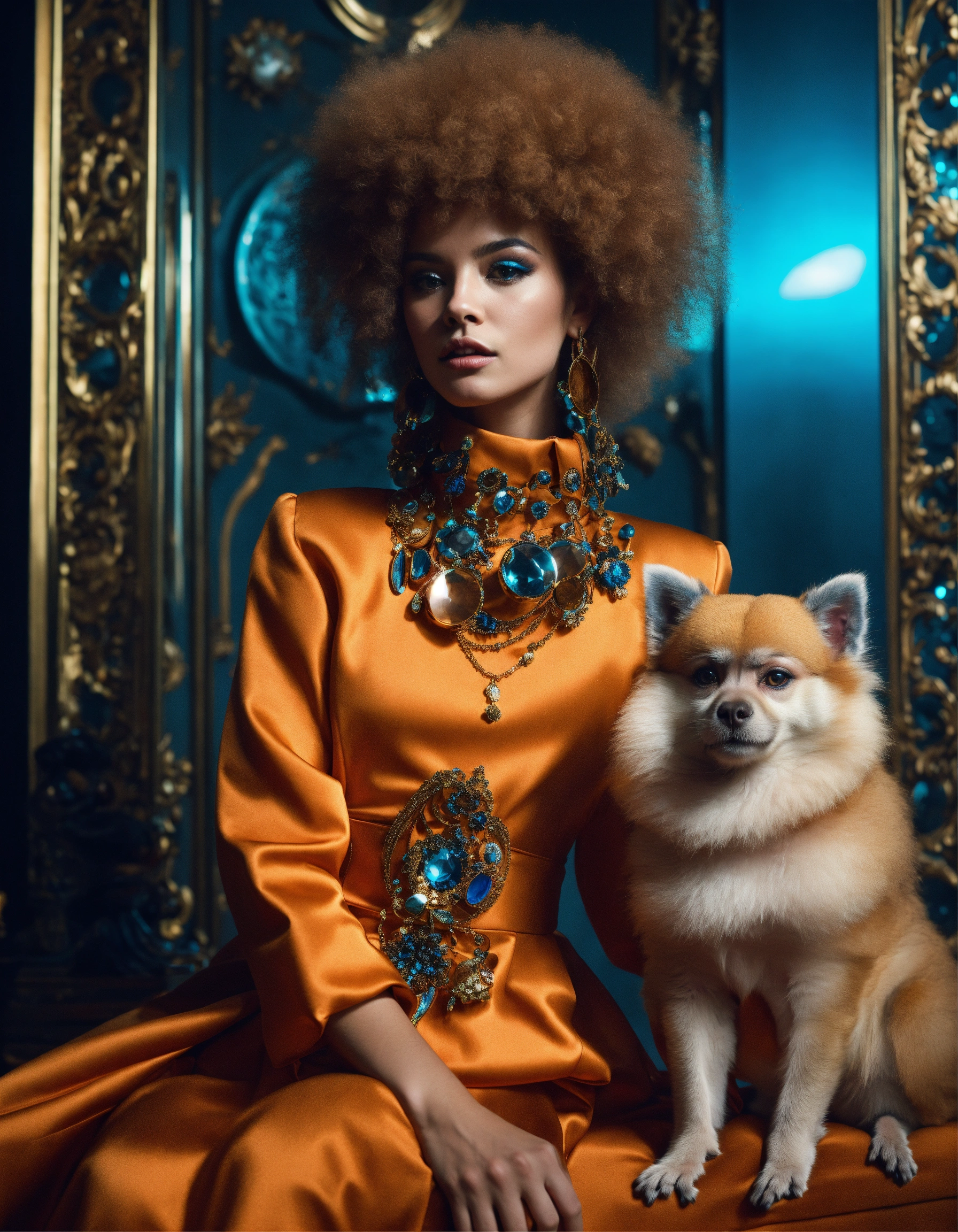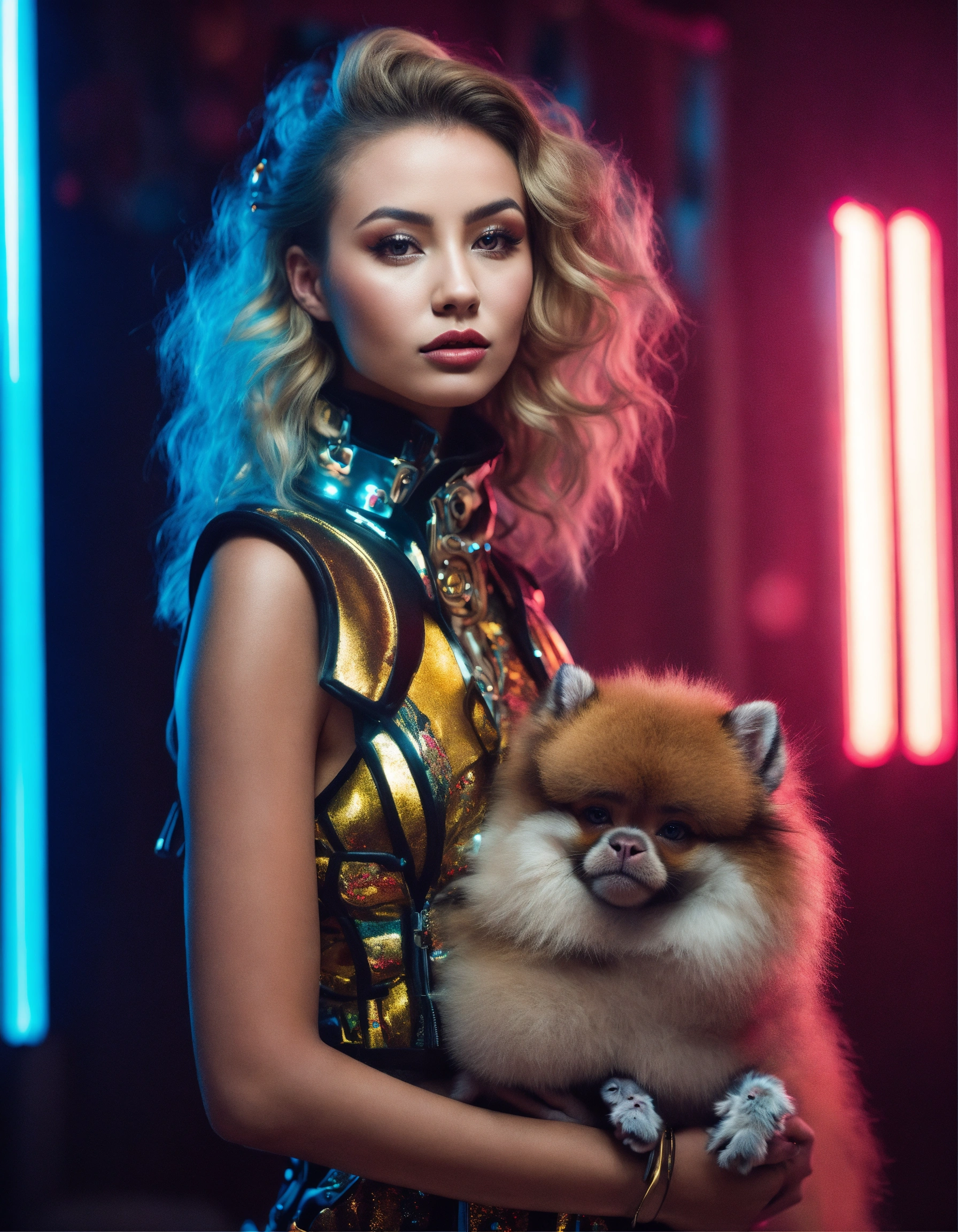 Fashion shooting with a beautiful fashion model with futuristic style in cosmos, futuristic and baroque style, with a pomerian and monkey in her arms
