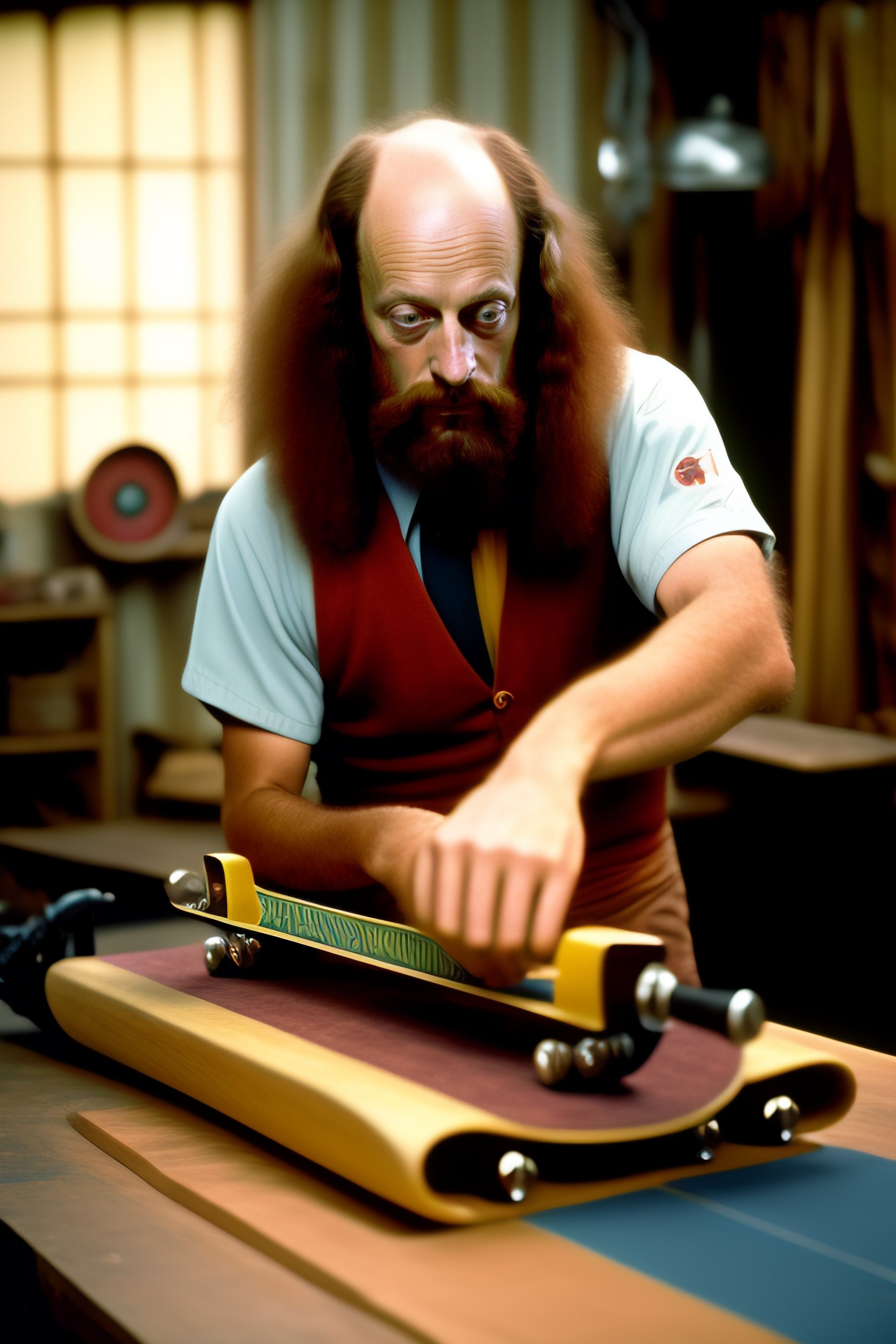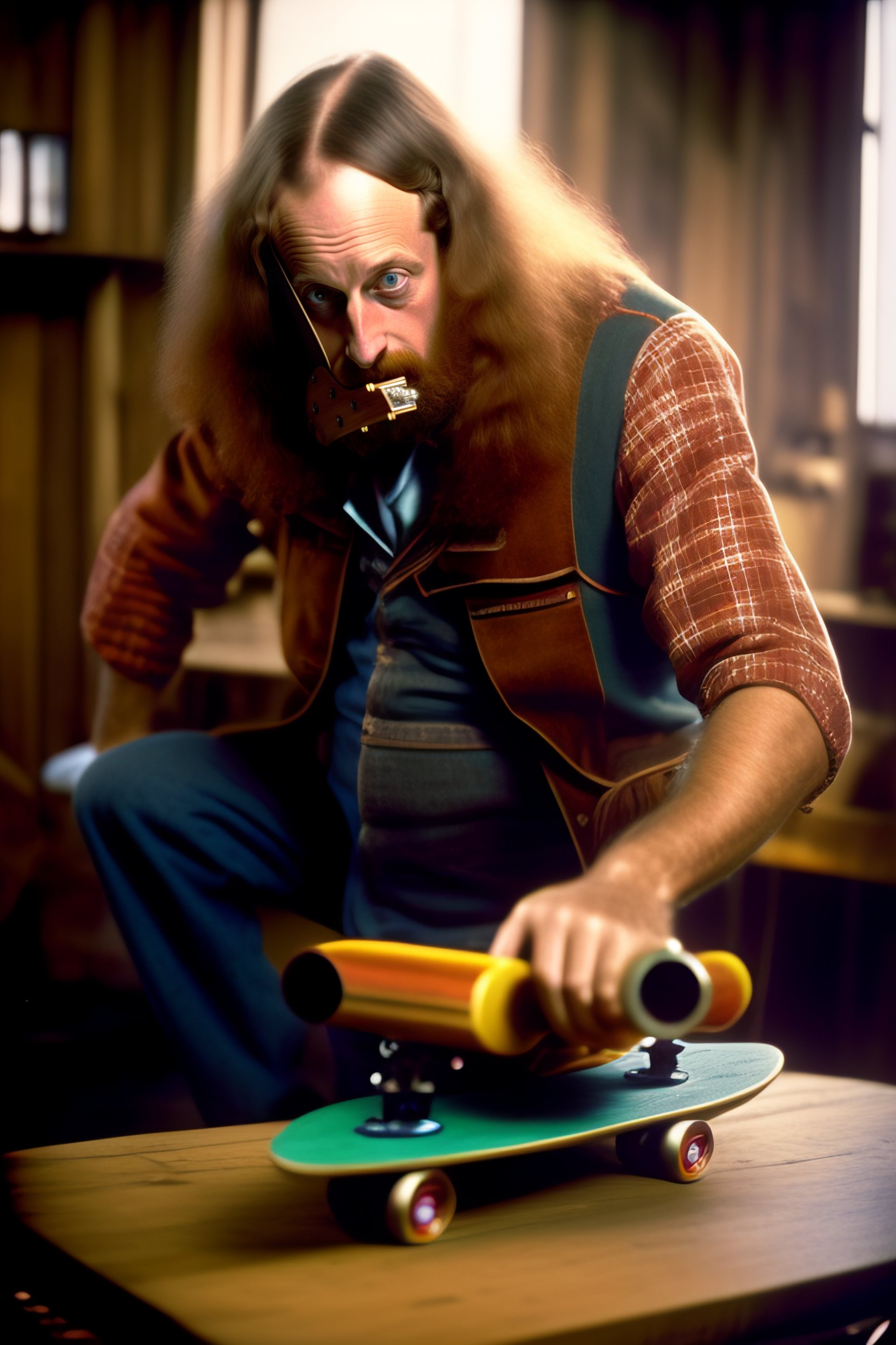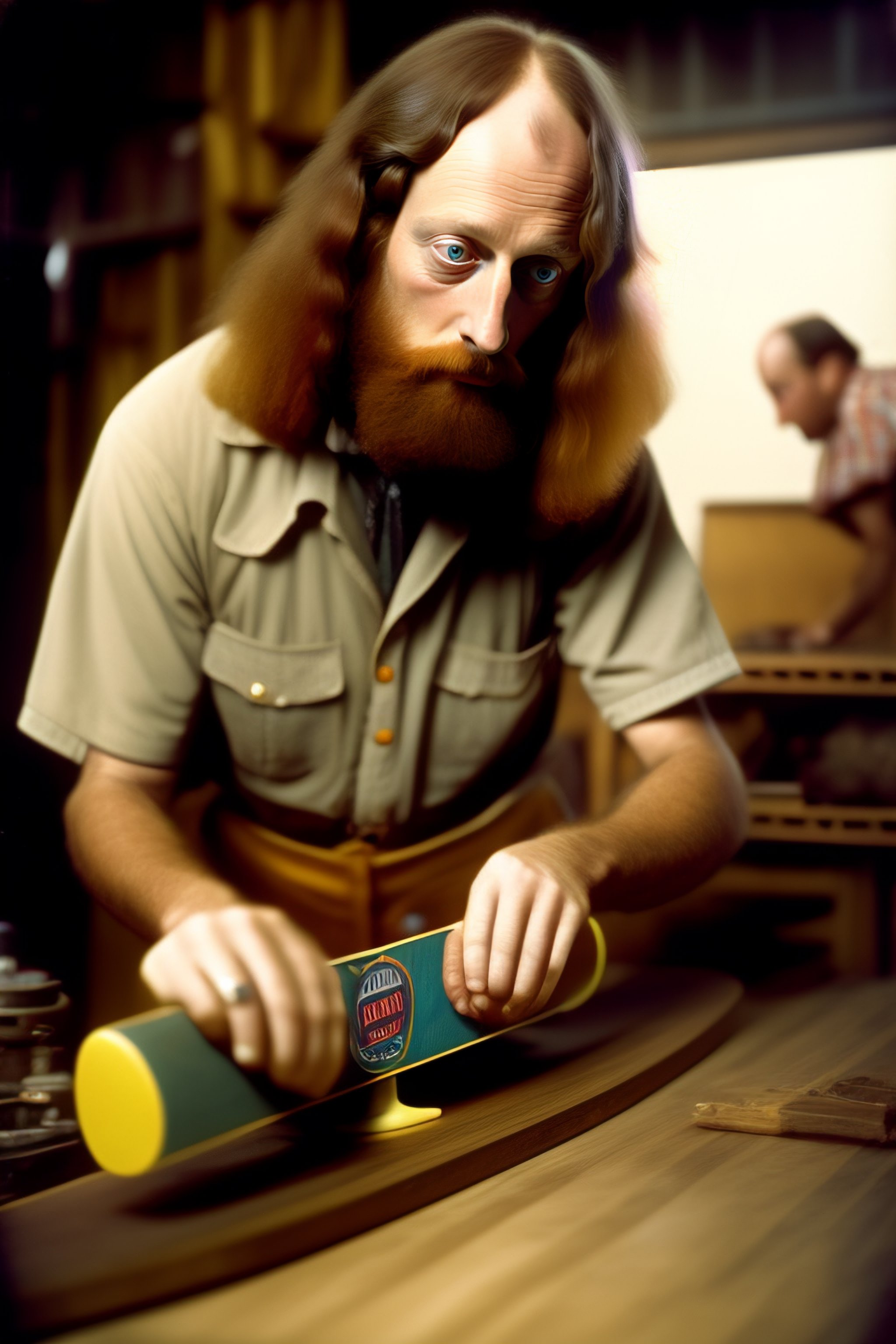A photo of chris elliott with long hair building a skateboard by philippe halsman, setting in an engineer workshop, canon lens, shot on dslr 64 megapixels sharp focus, vintage photography, victorian colorised