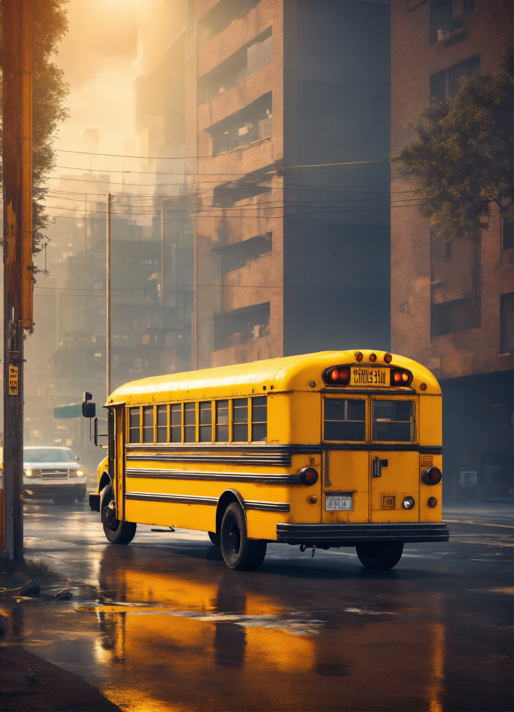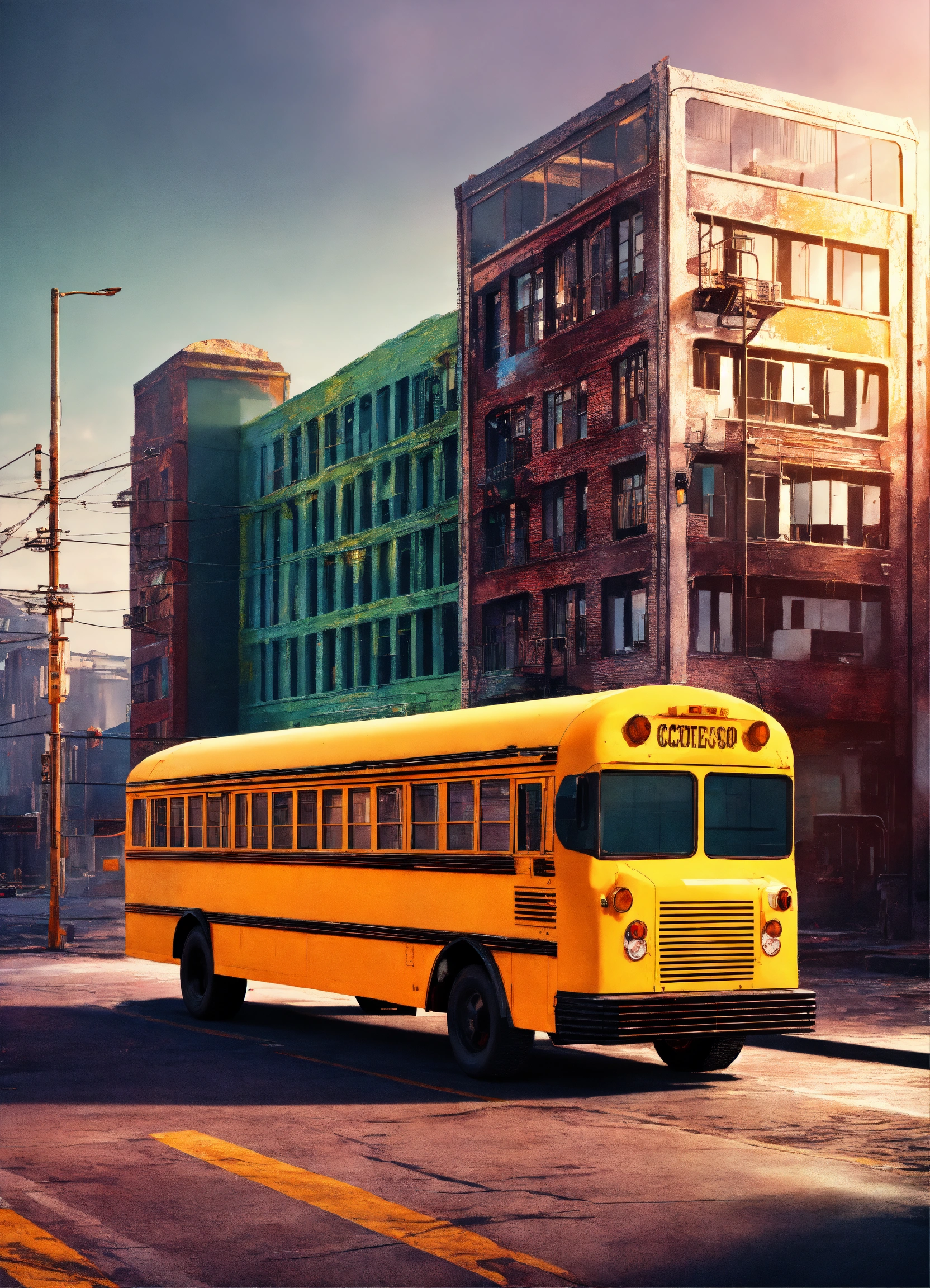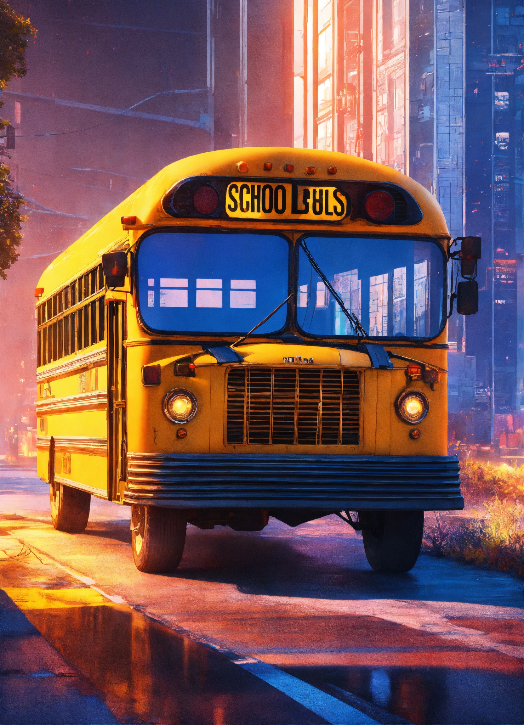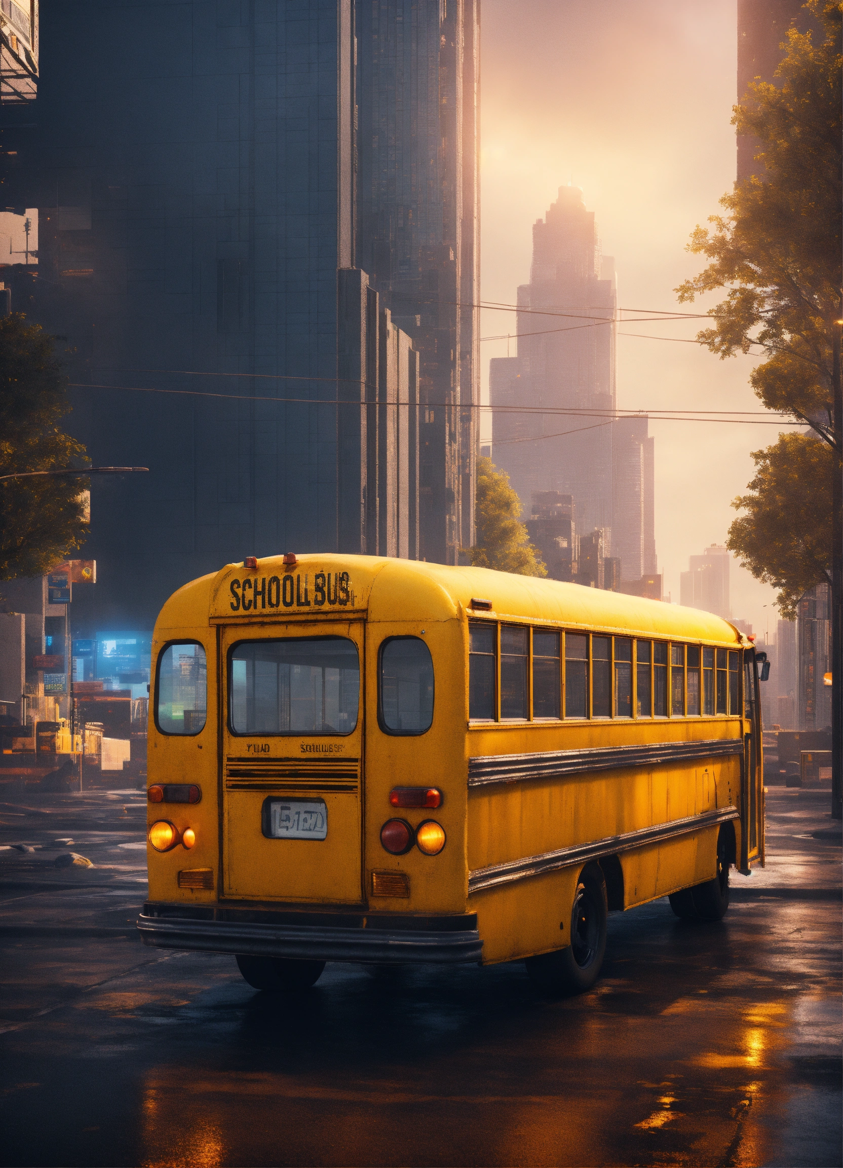 Futuristic cityscape with a side view of an old beat up yellow school bus. realistic, vivid colors octane render trending on artstation, artistic photography, photorealistic concept art, soft natural volumetric cinematic perfect light, uhd city skyline.