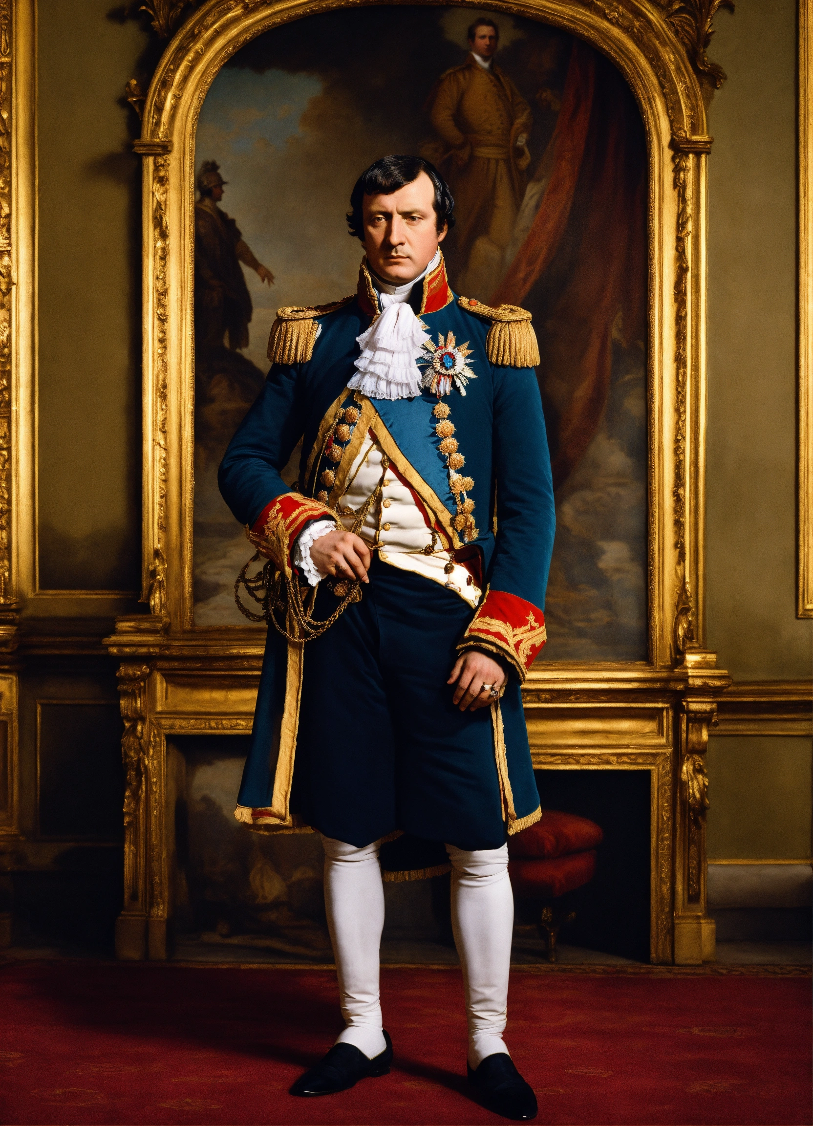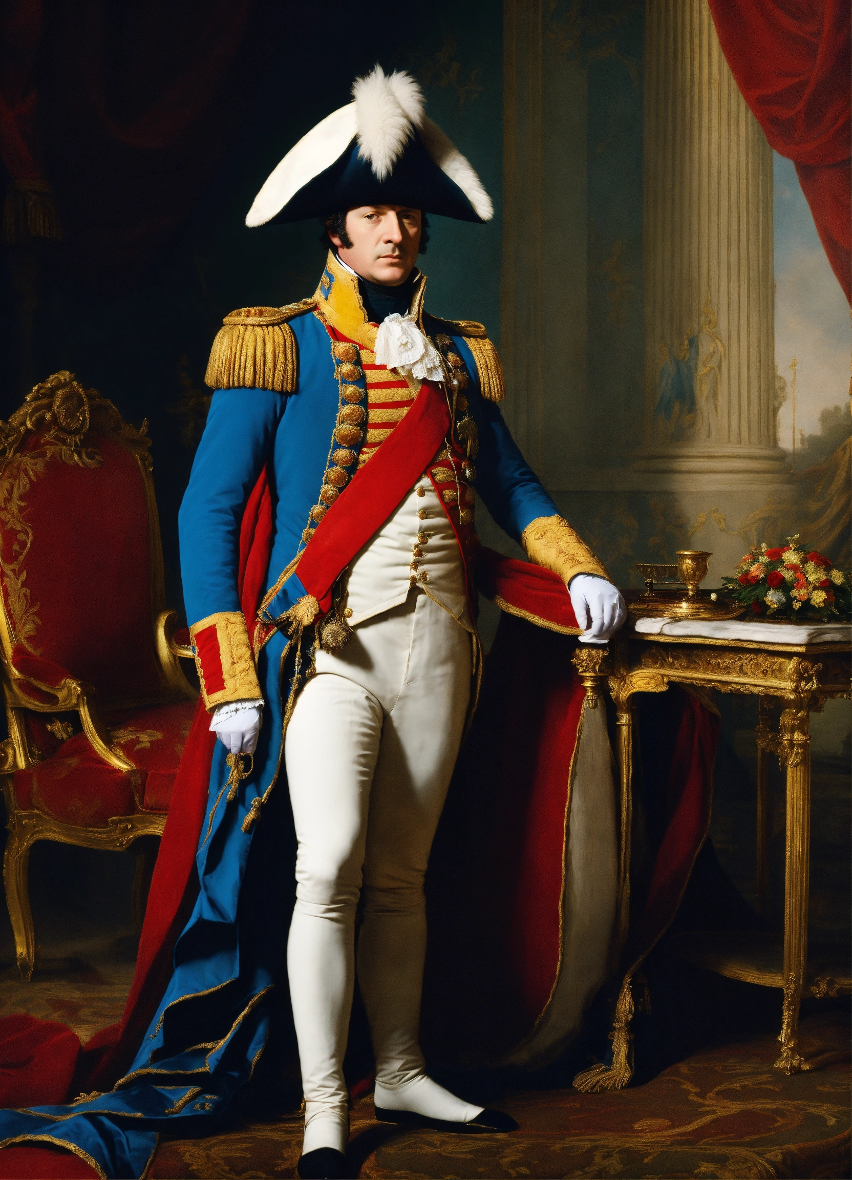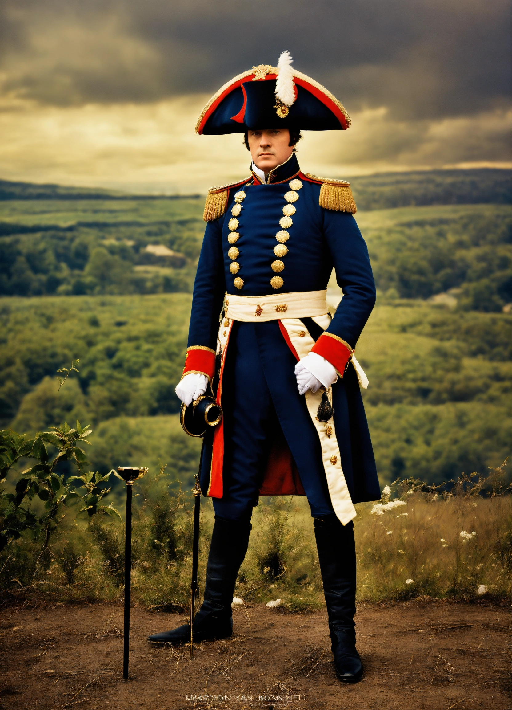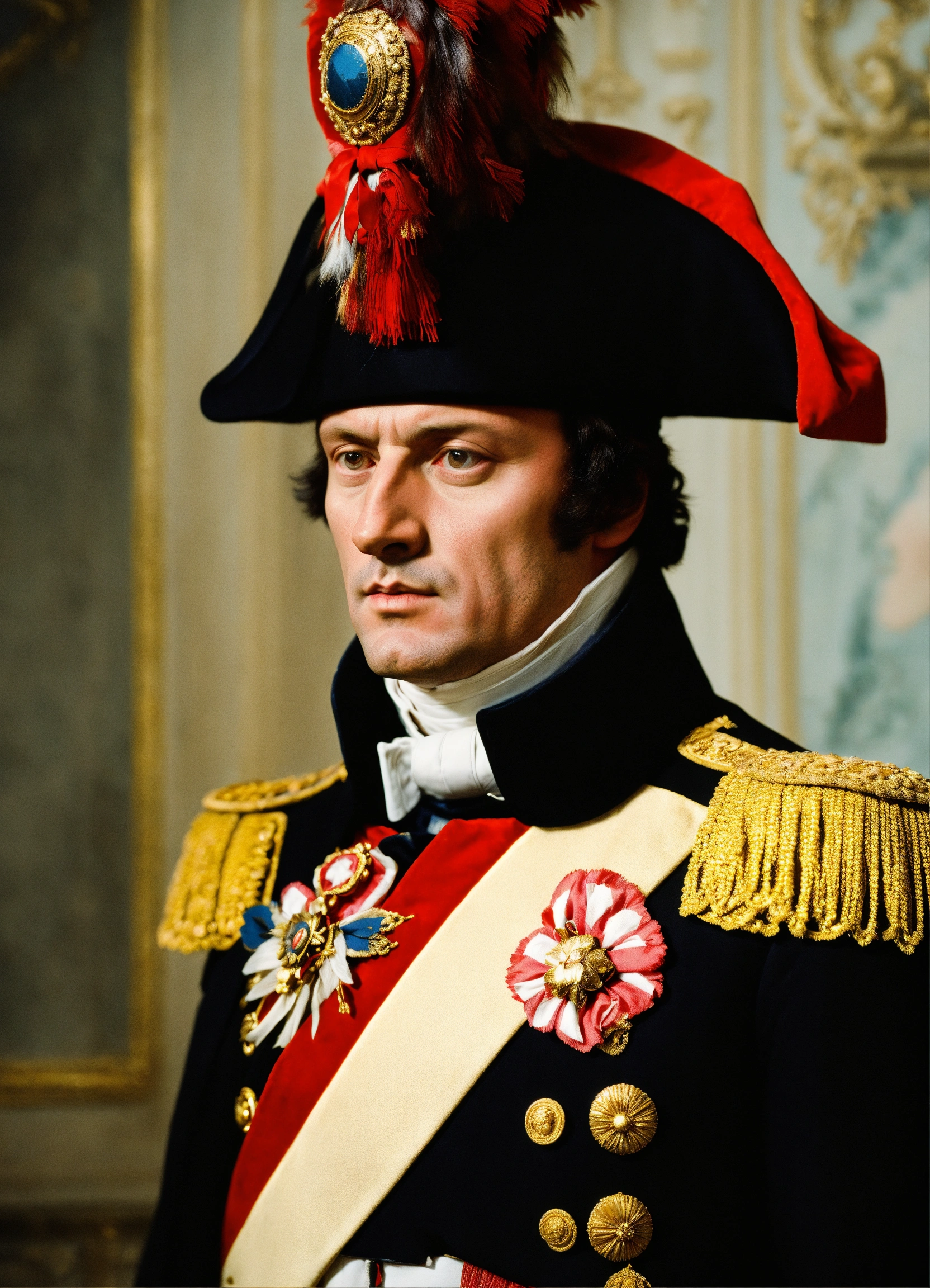 Imagine you're taking a photo behind the scenes of a movie about emperor napoleon bonaparte. capture for me a picture of emperor napoleon bonaparte portrayed by an actor in a surreal style, exuding the solemnity and strength of a king