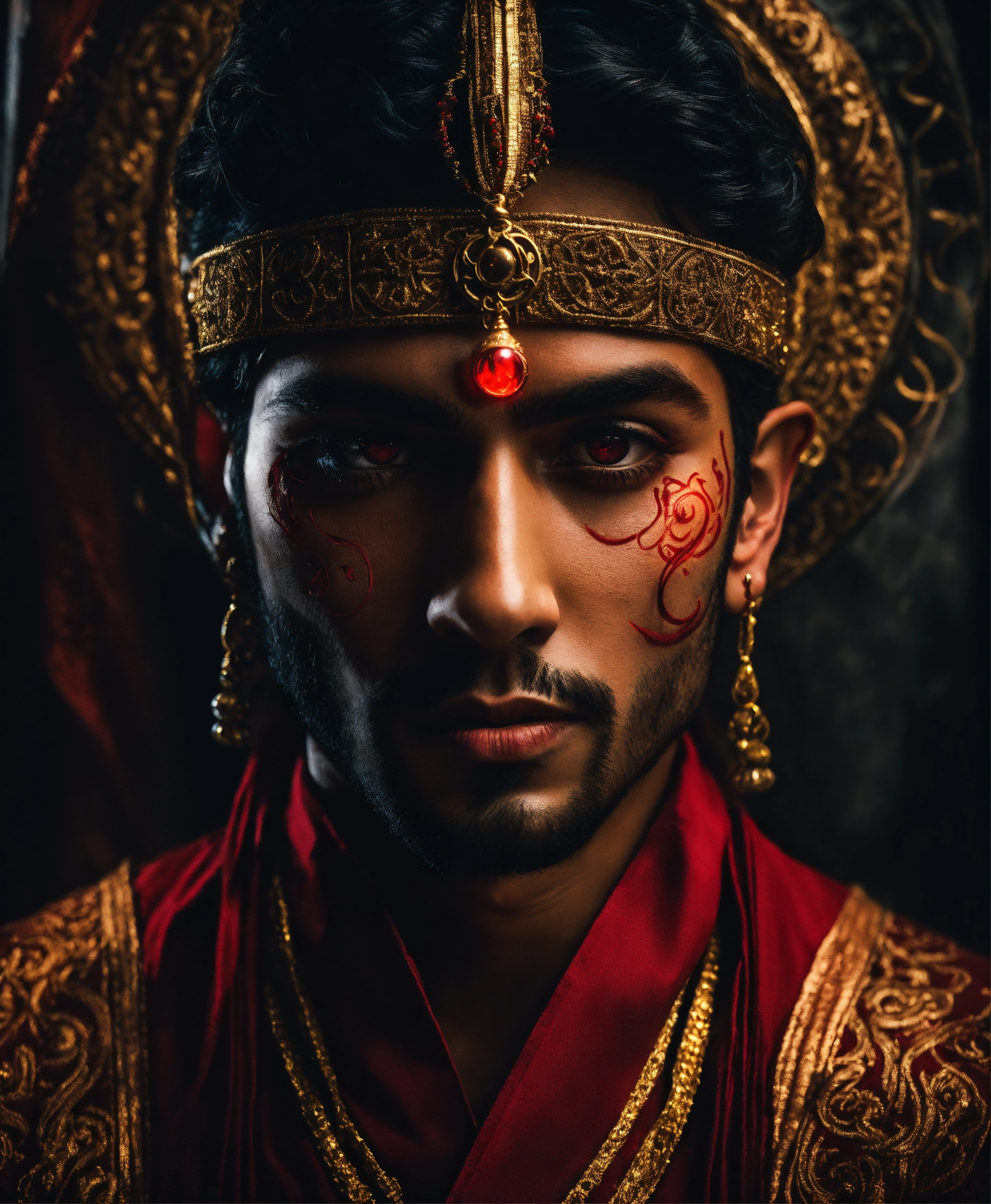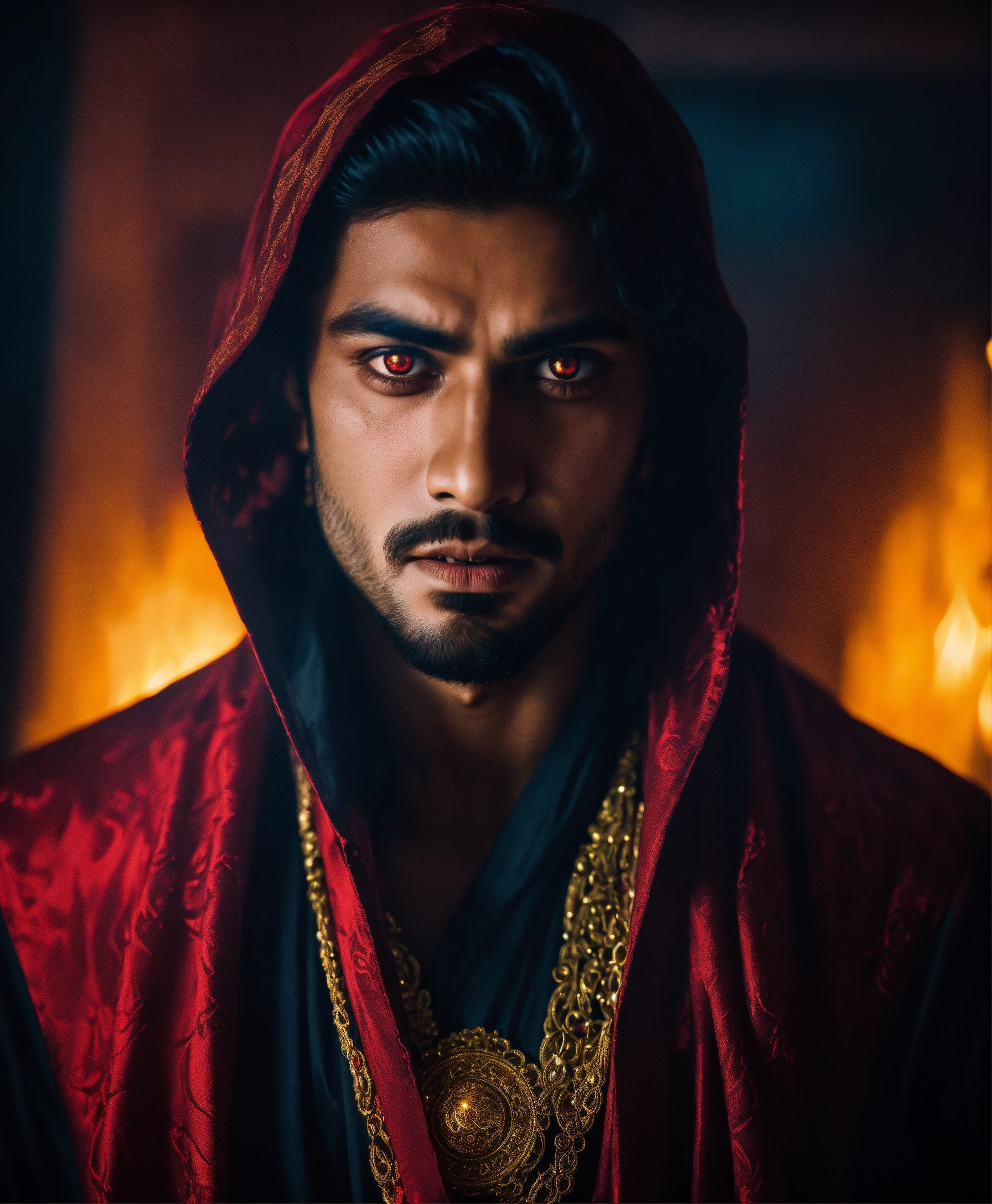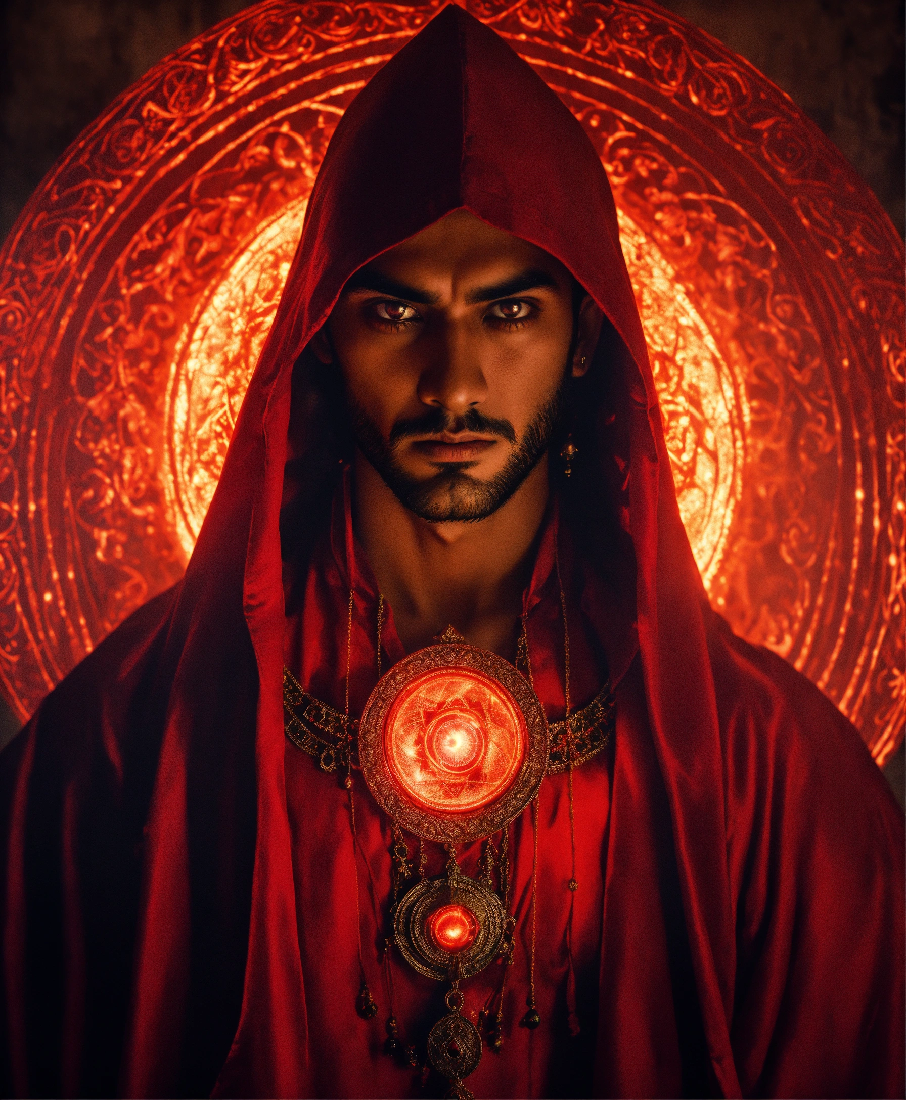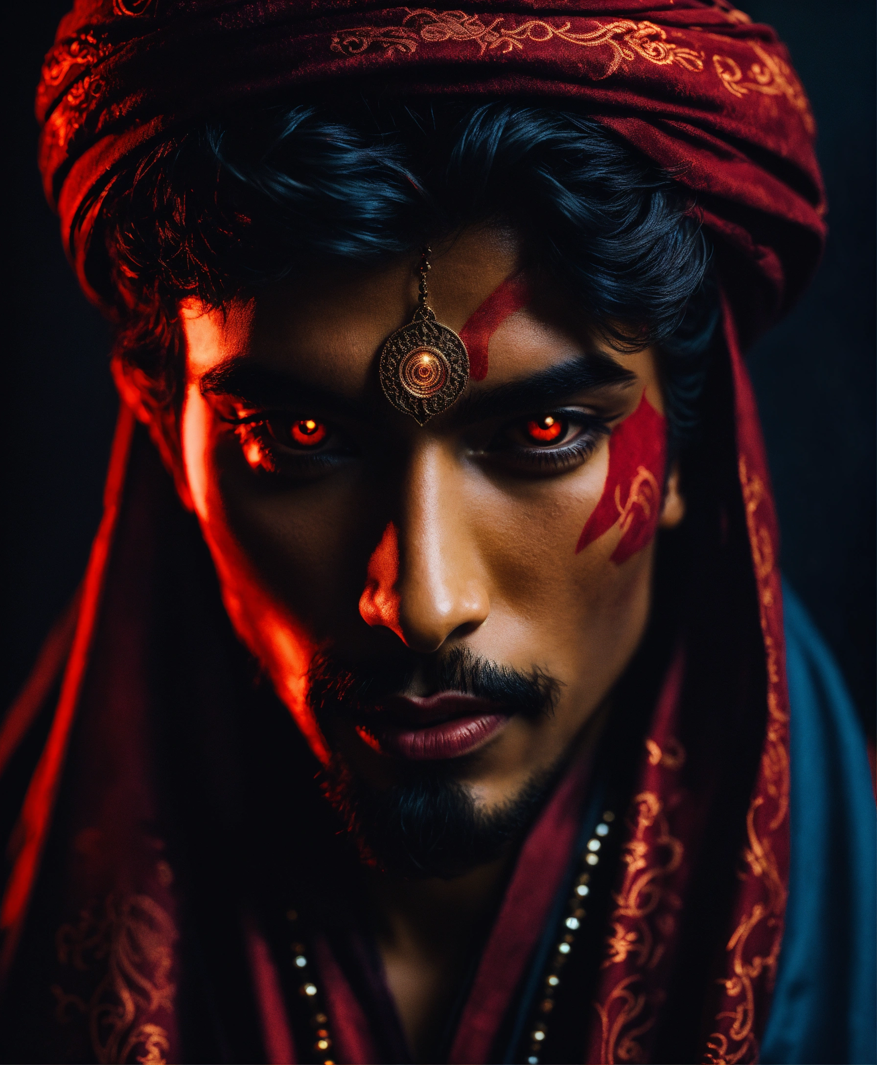 Dark, mysterious and dramatic headshot of a young handsome south asian evil sorcerer with glowing hypnotic eyes, occult powers, sinister aura, dark red elaborate ritualistic robes