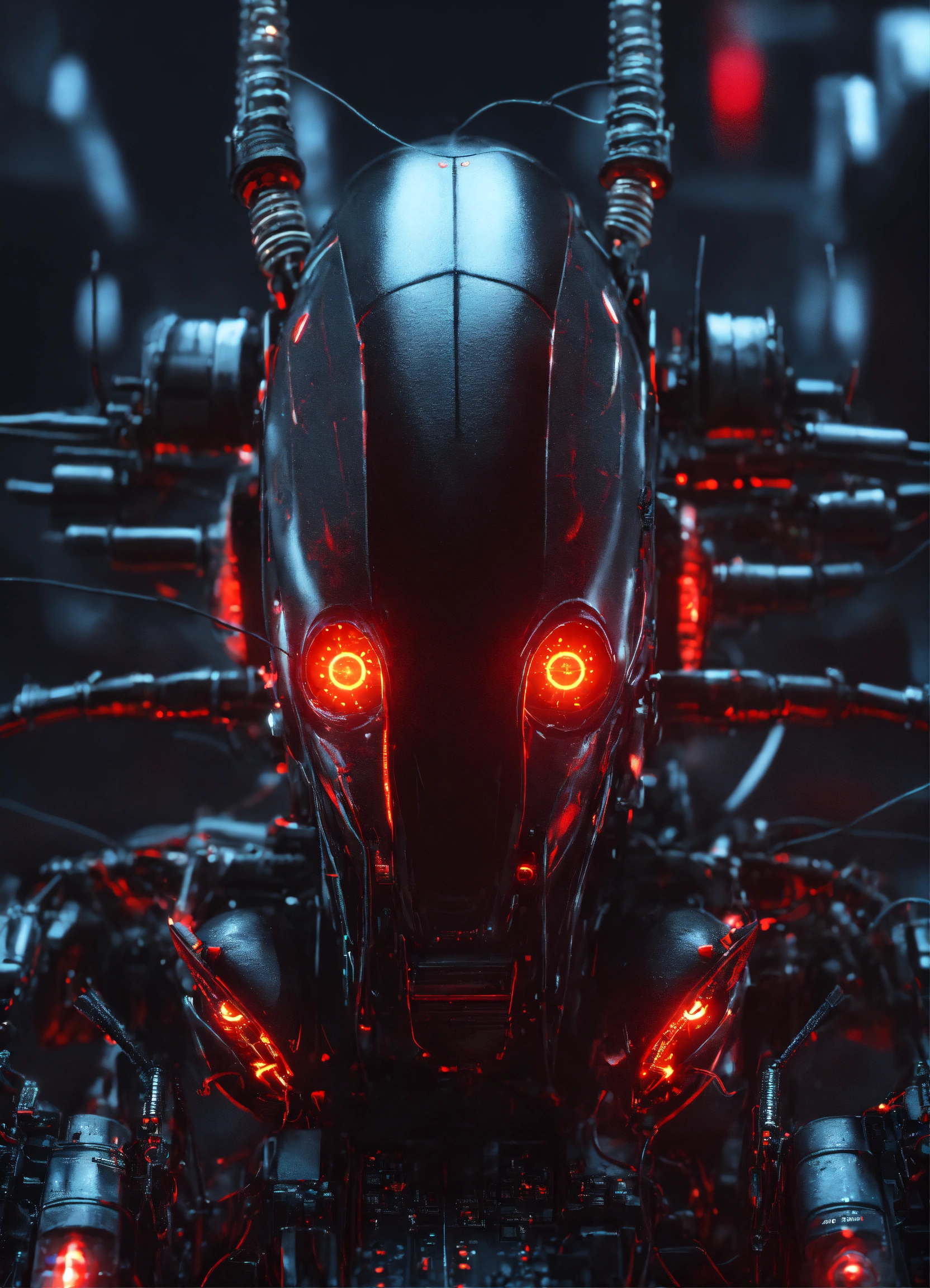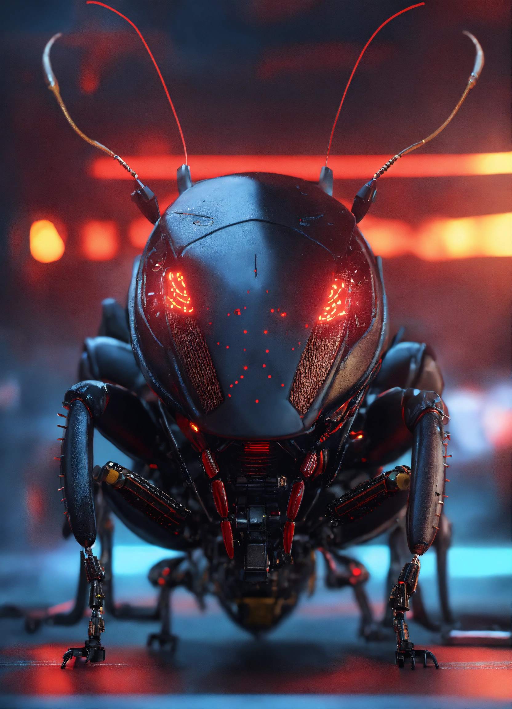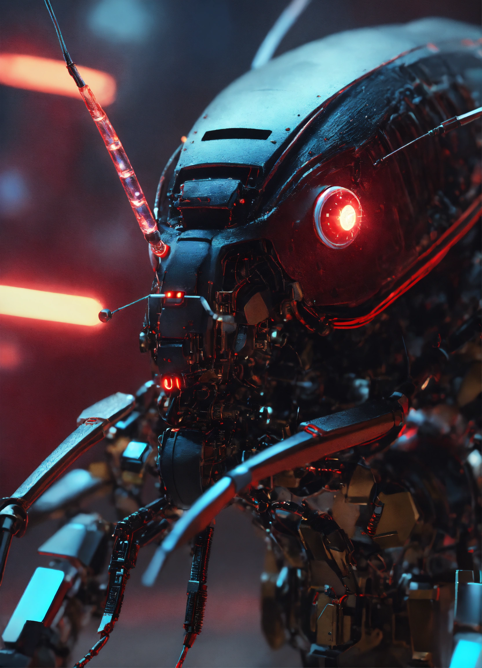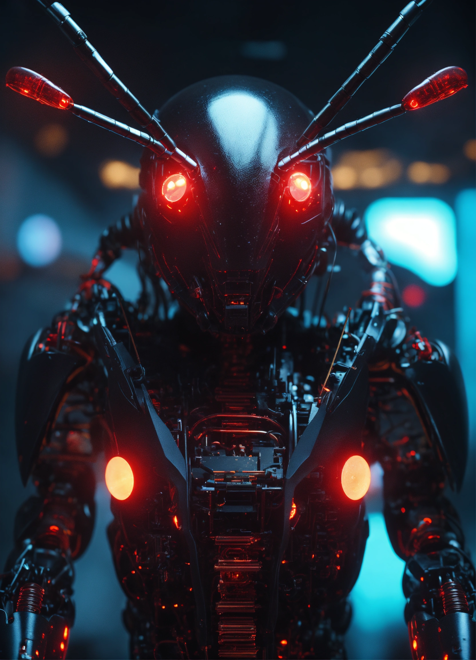Zoom out of black cockroach faced humanoid with red glowing eyes, detailed circuitry. and hi-tech antenna shooting paralysing frequencies from his powerful antenna, realistic, 8k