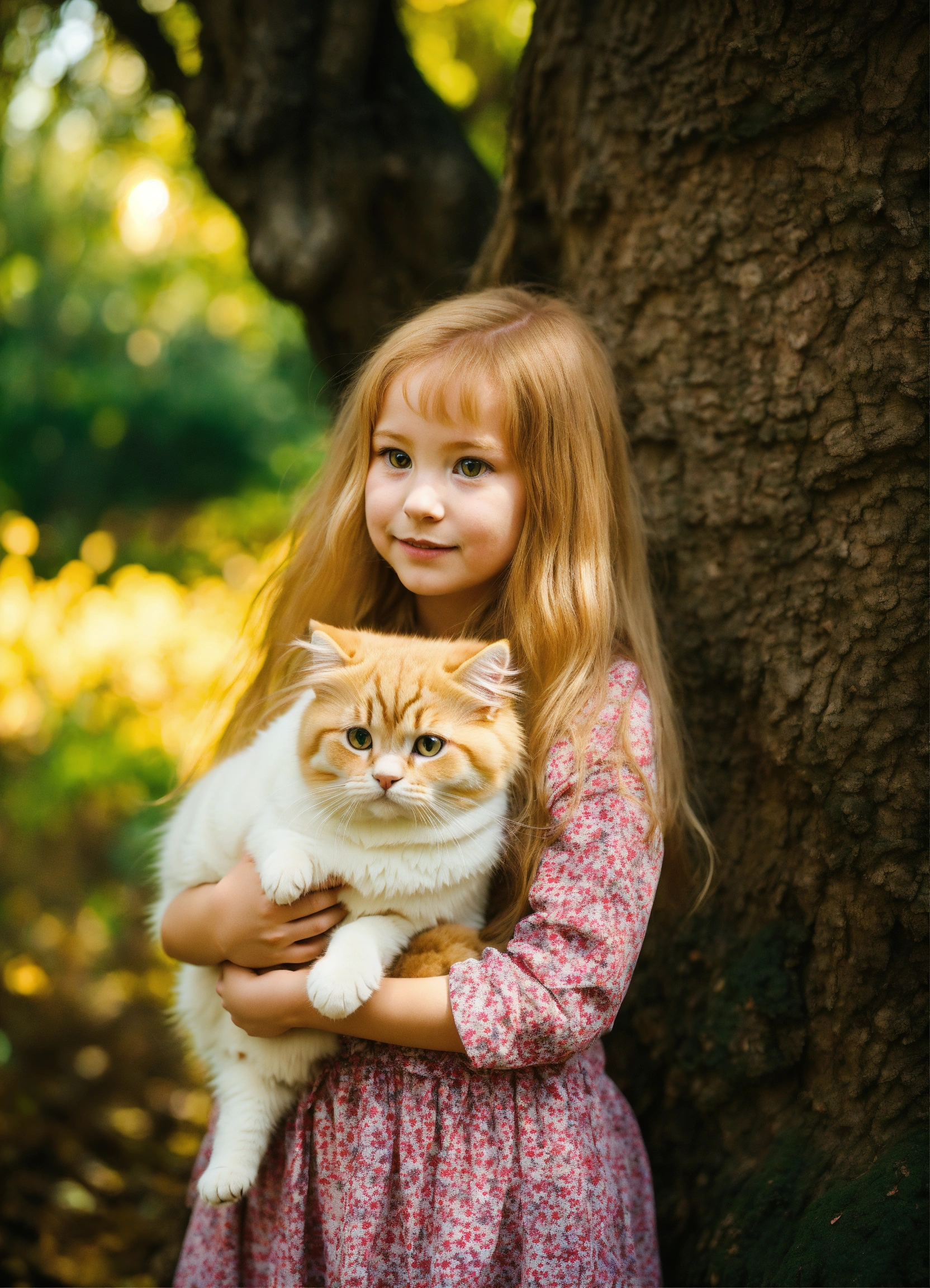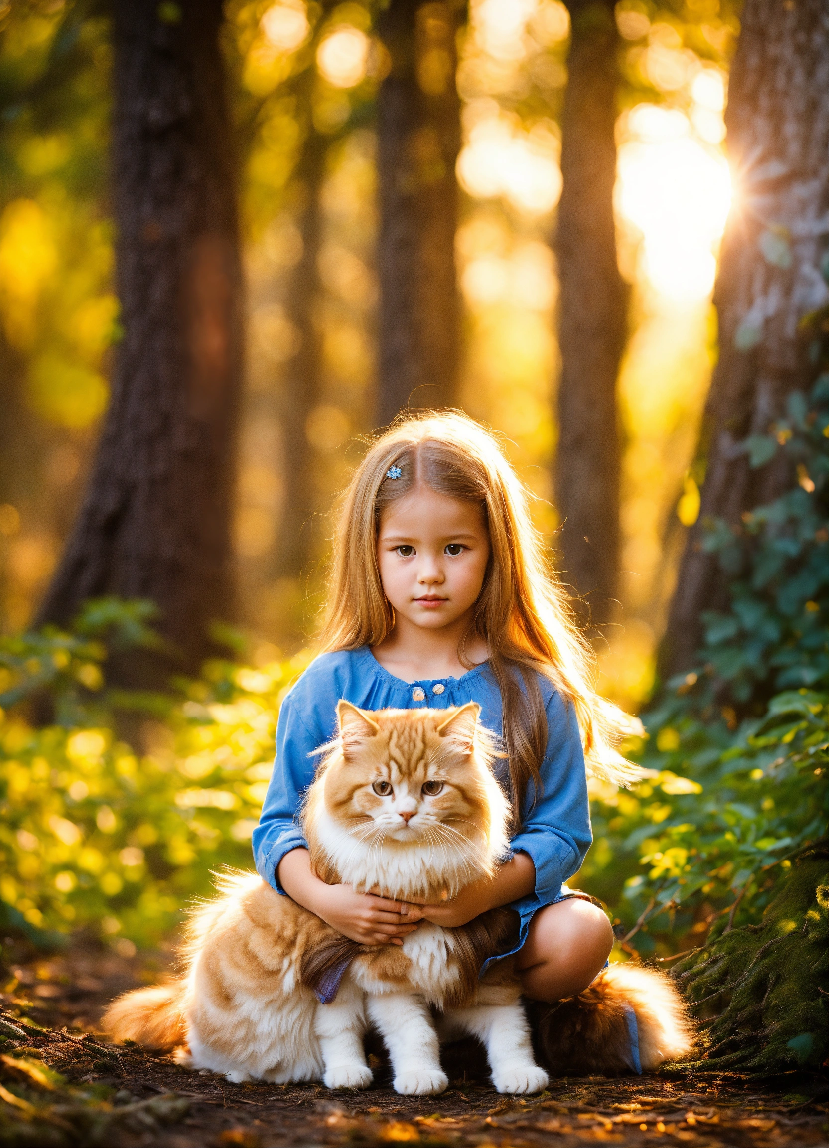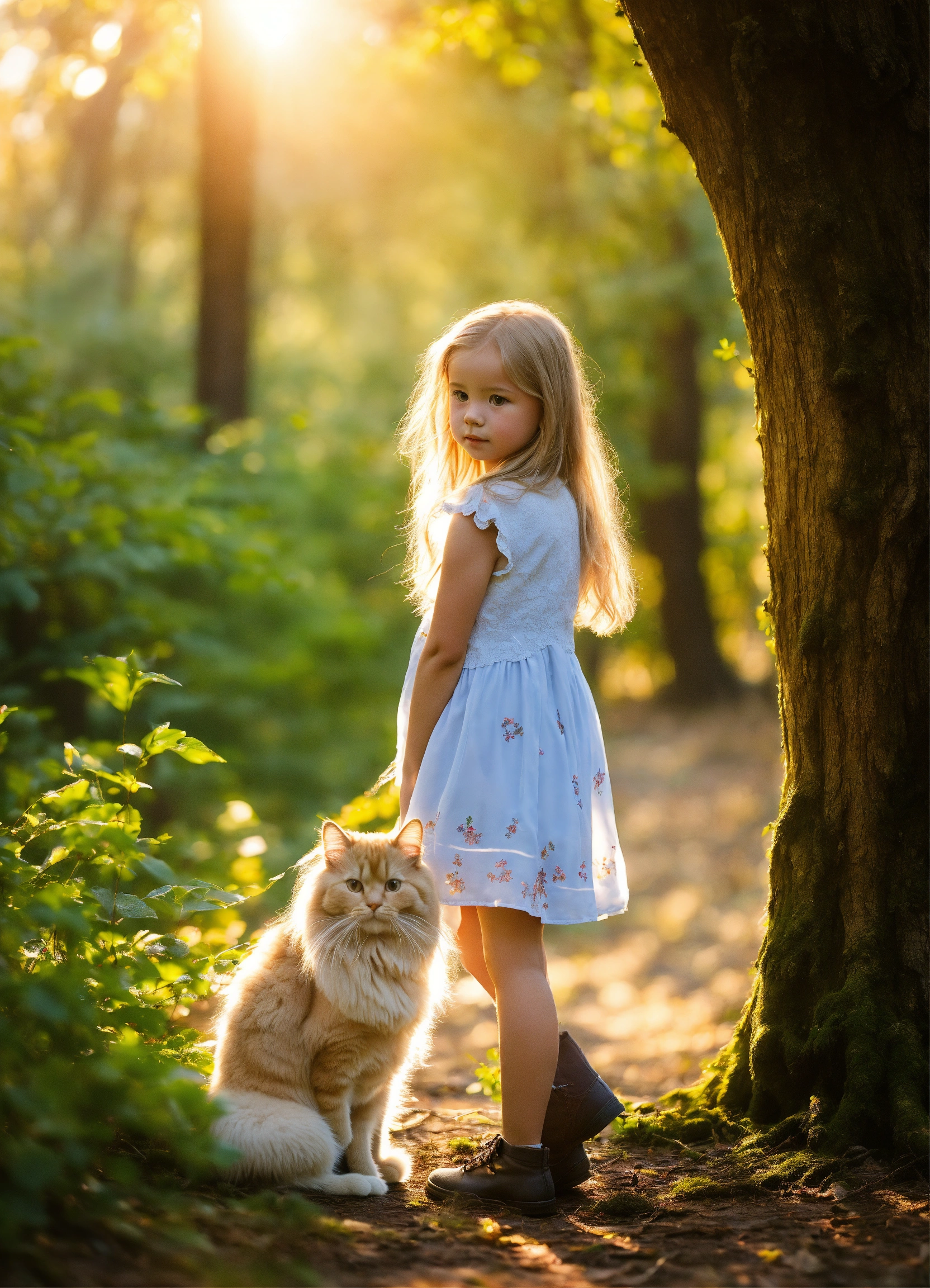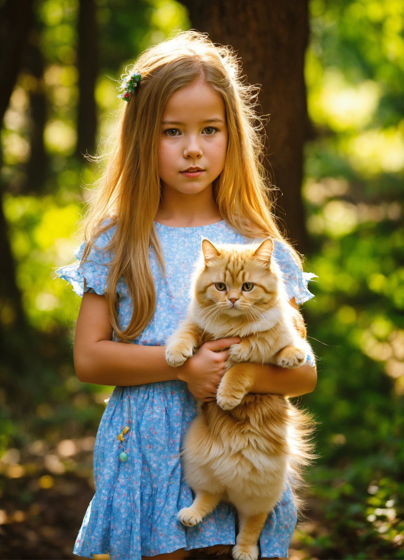 A little british girl with long golden hair. holding the persian cat in his arms, staring ahead. standing under the big tree in the forest. sunlight.