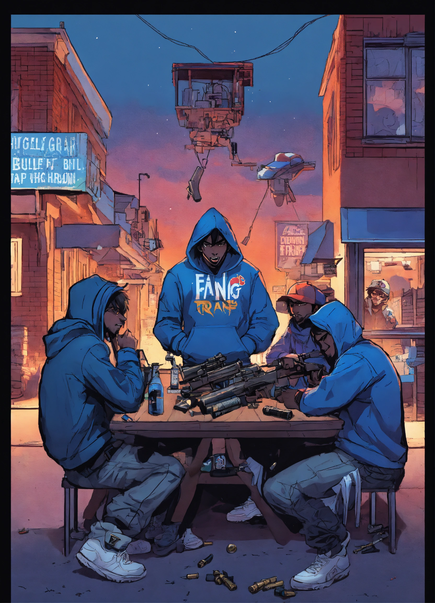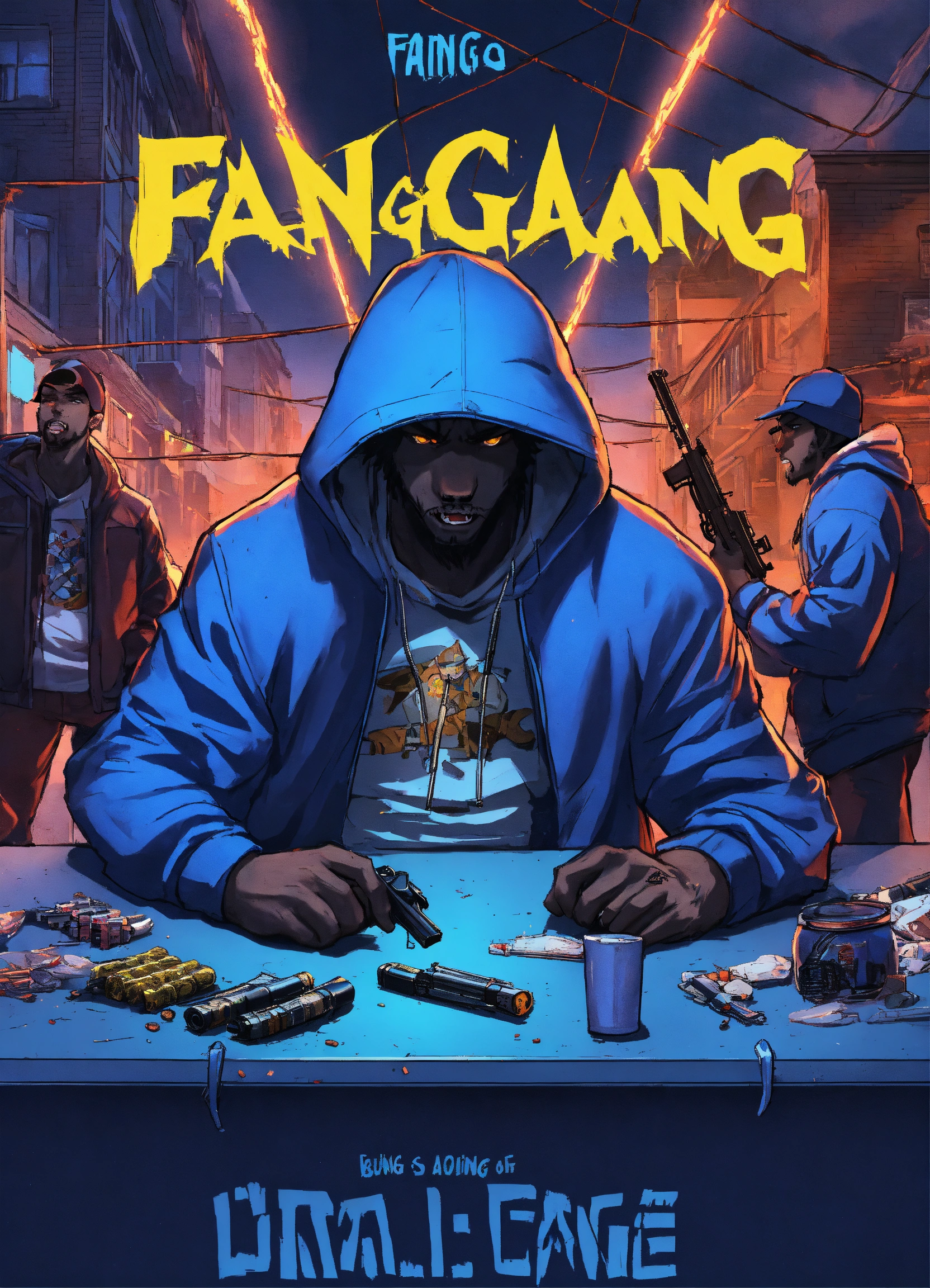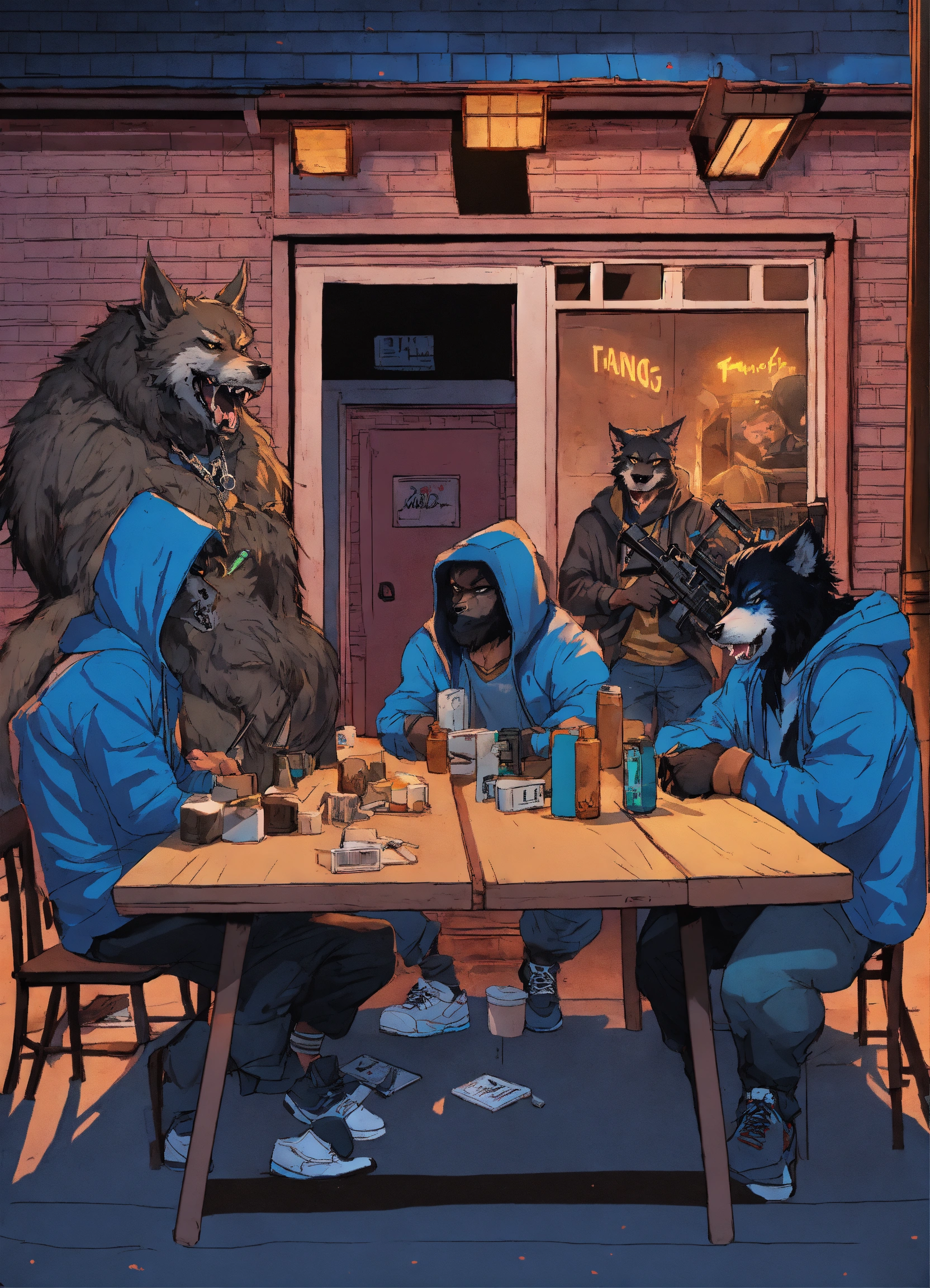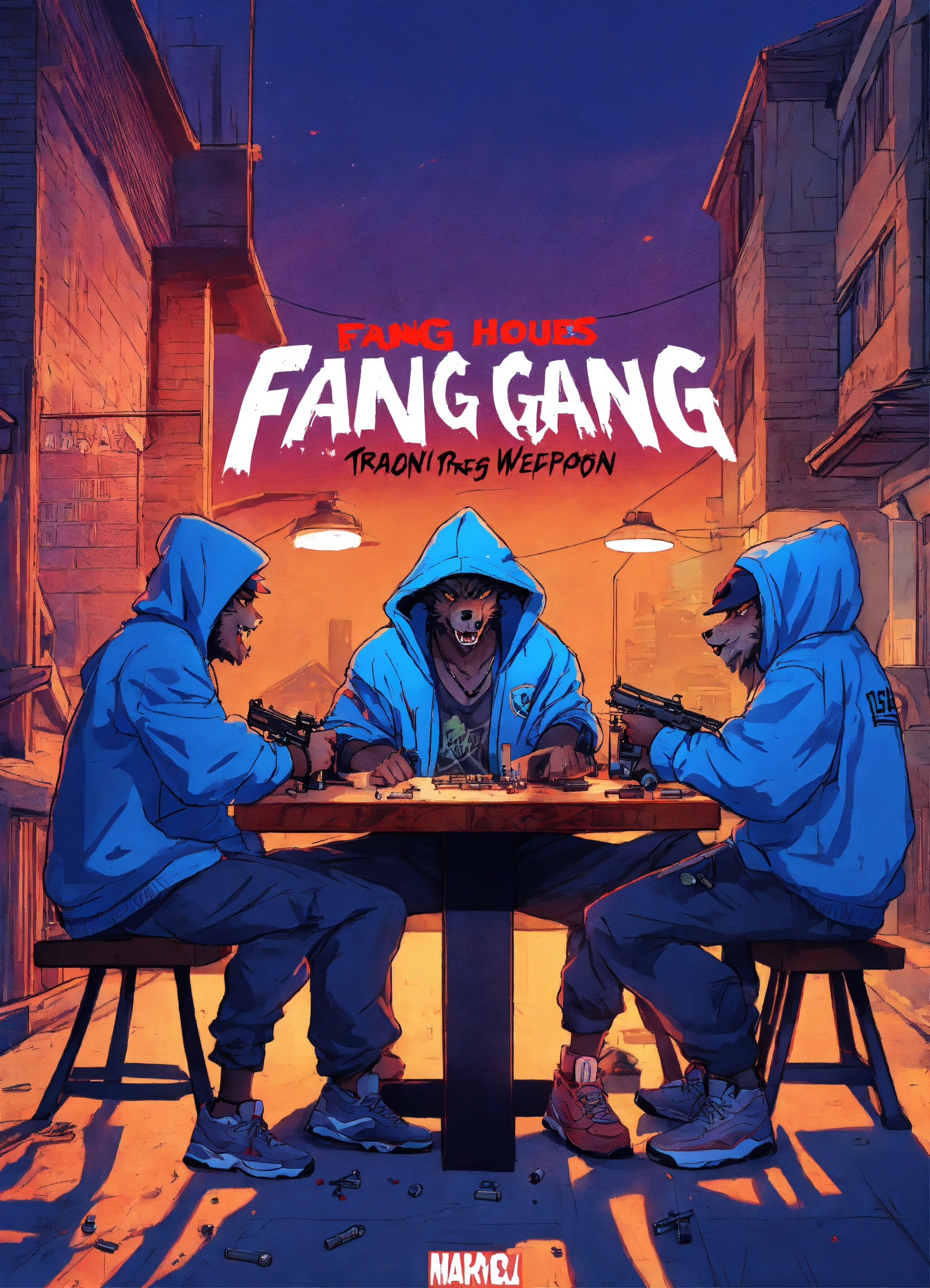 Werewolves in hoodies and baseball caps with the words fang gang in blue, guns bullets, loading weapons, sitting at a table of a trap house in urban city neighborhood
