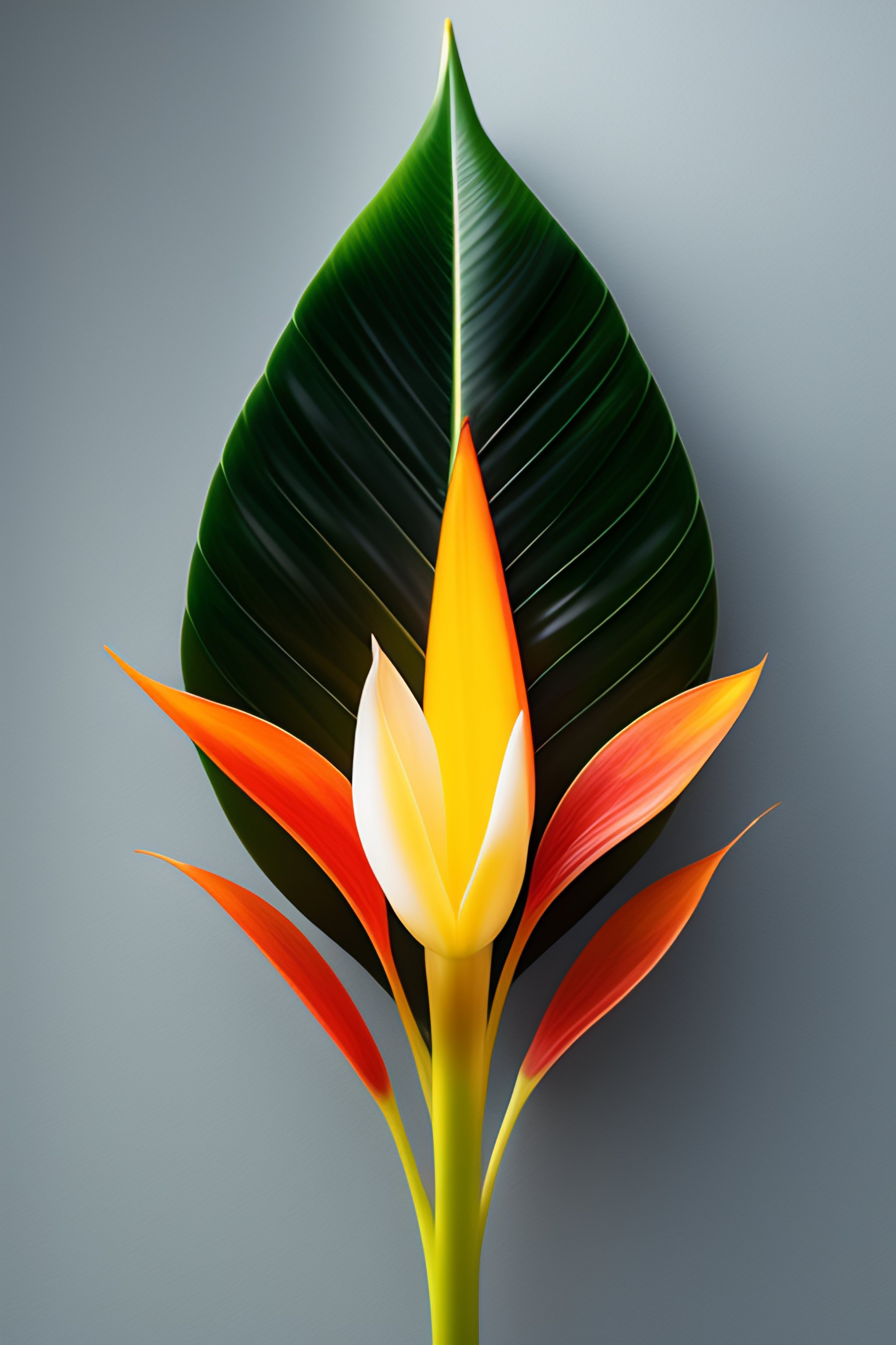Product photo of a strelitzia plant with large, tall leaf hanging to the right against a white background