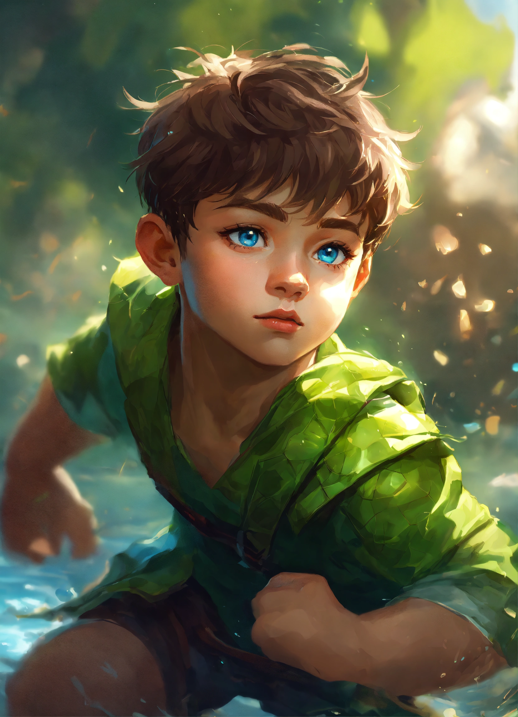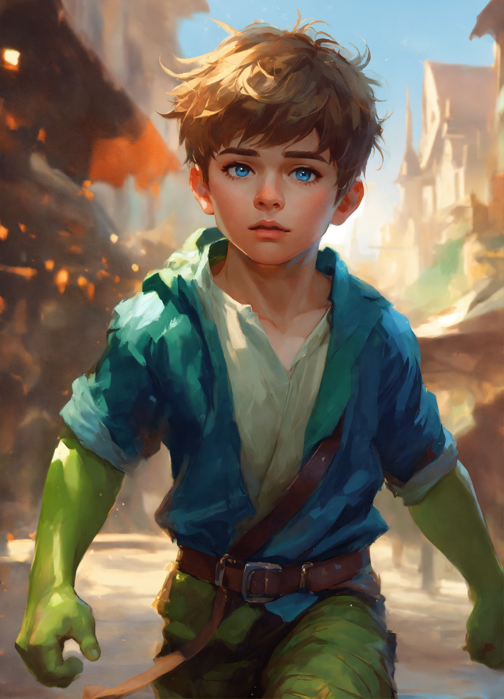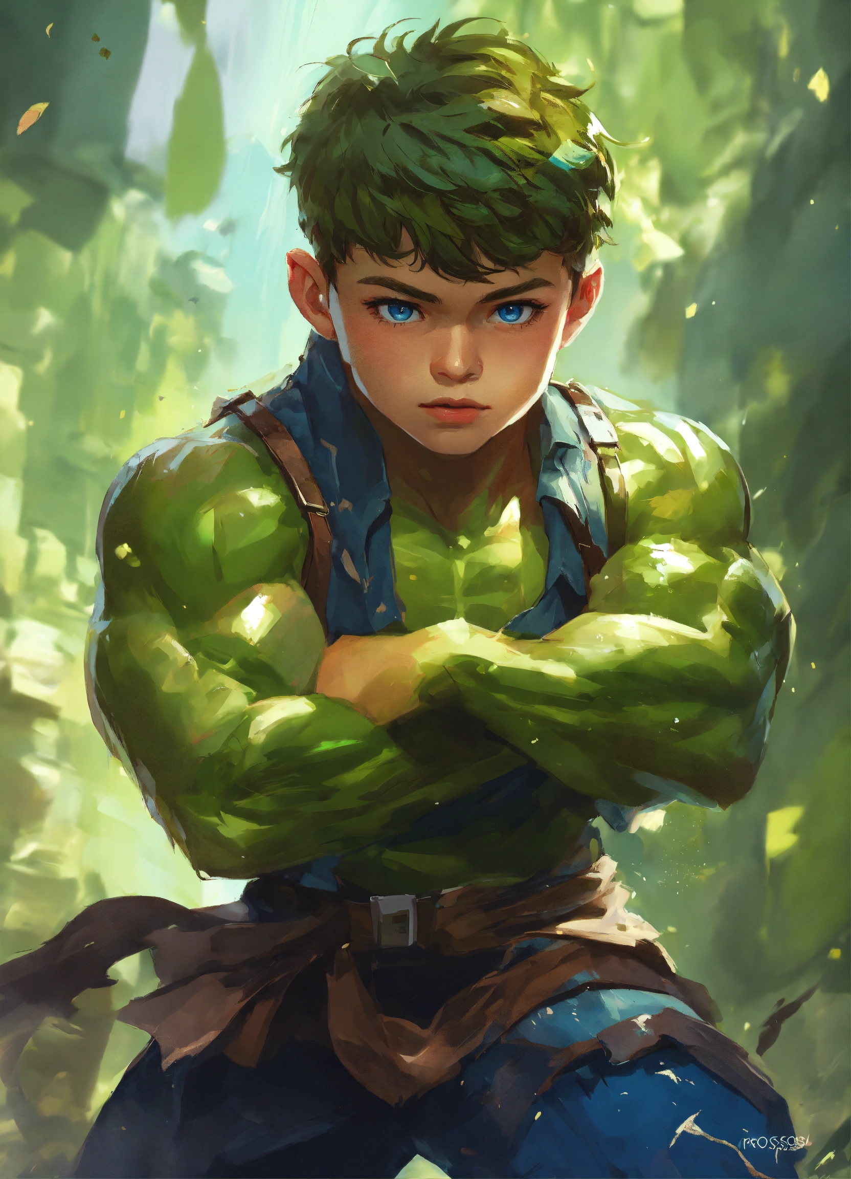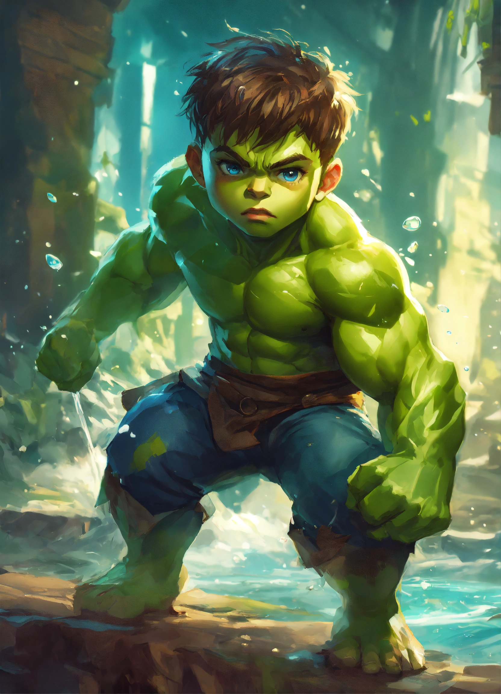 Realistic, cute boy dressed in hulk theme, wearing medieval cloth, dynamic, amazing, extraordinary pose, big and blue watery eyes, brown and short hair, digital art by rossdraws, impressionist style