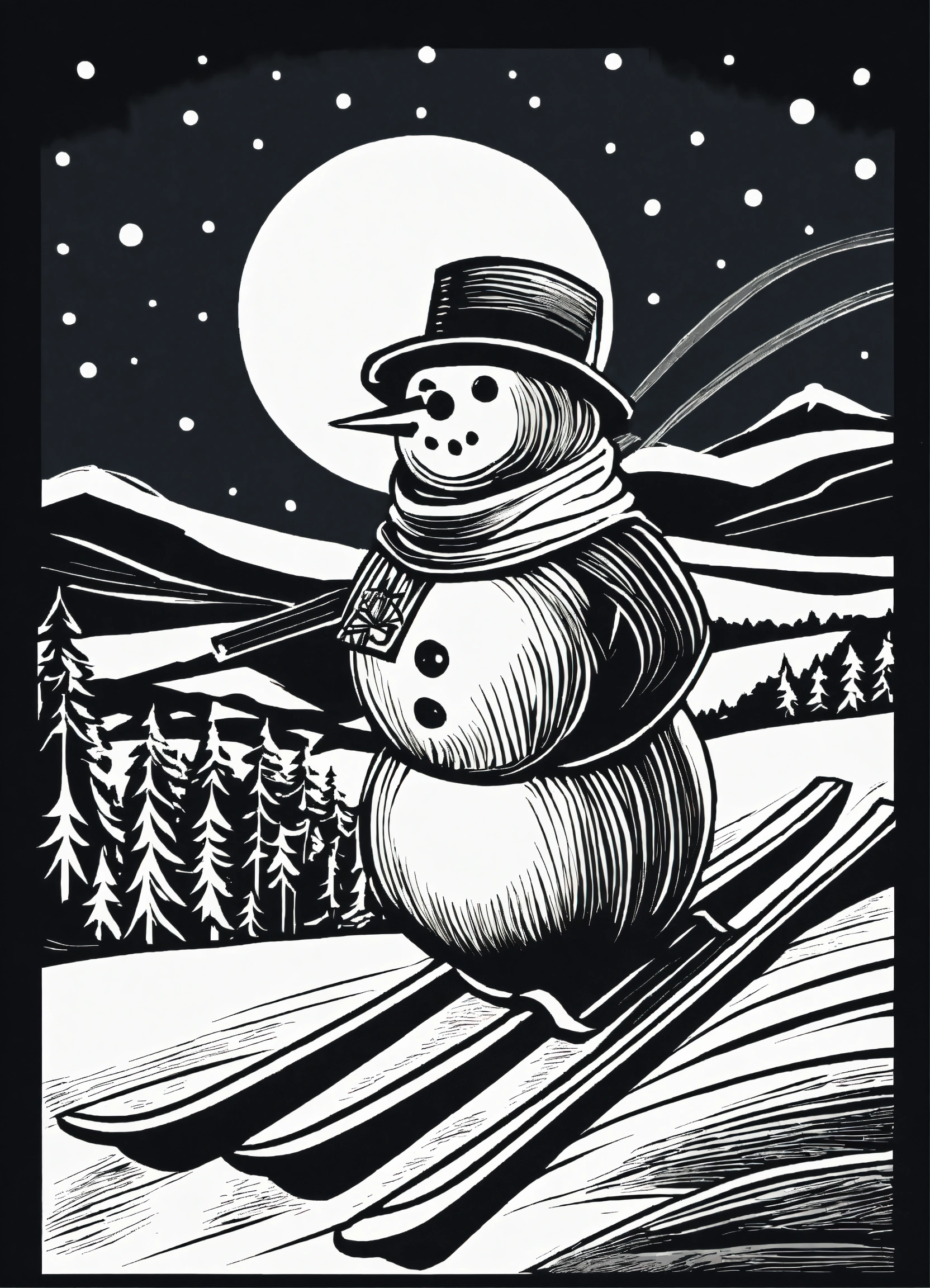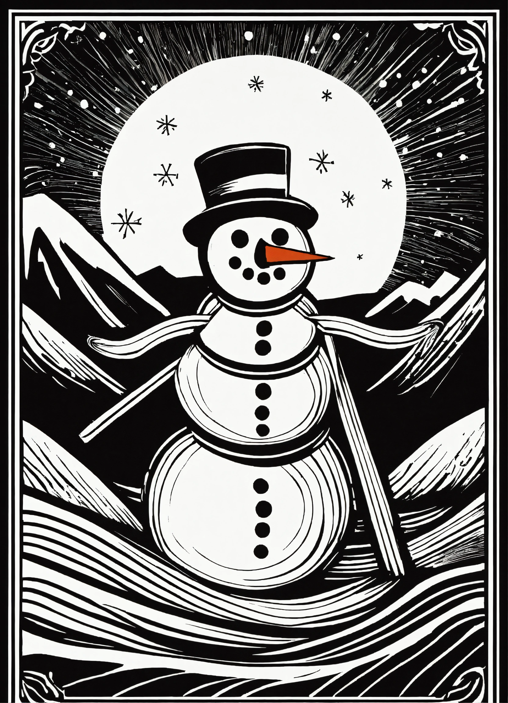 Stylized linocut design of a snowman skiing