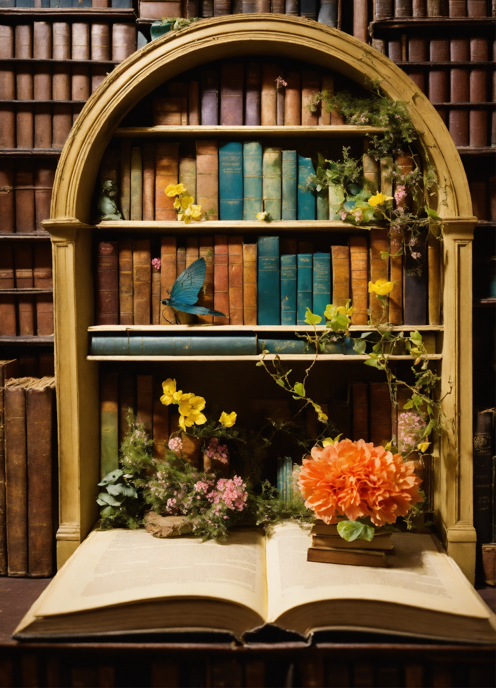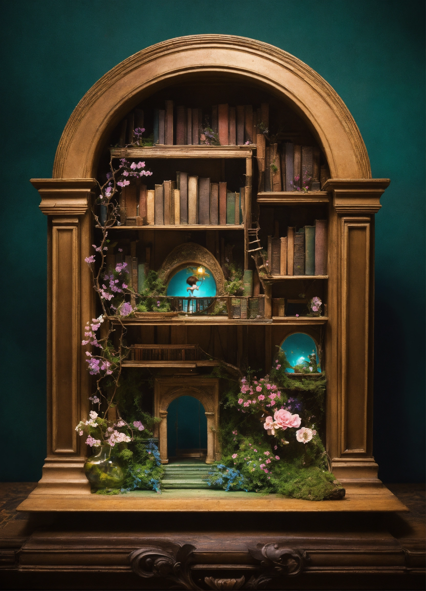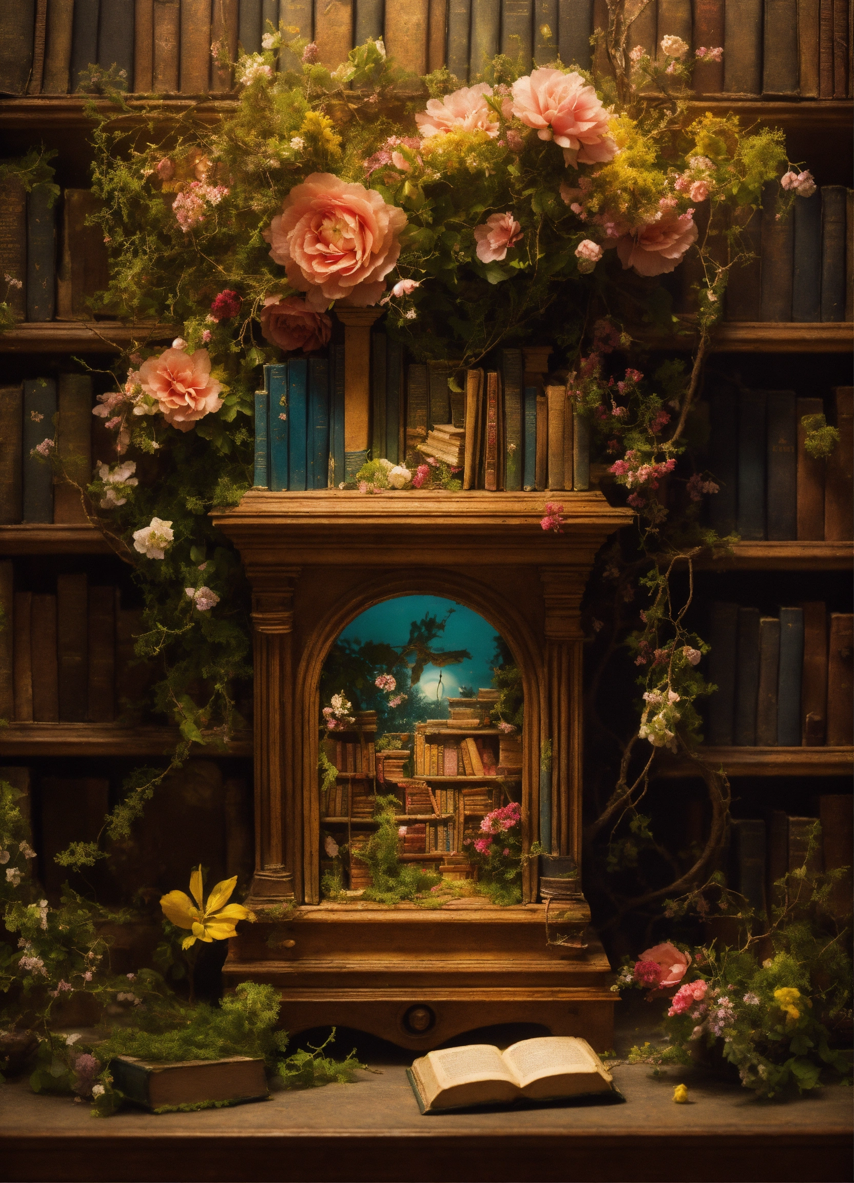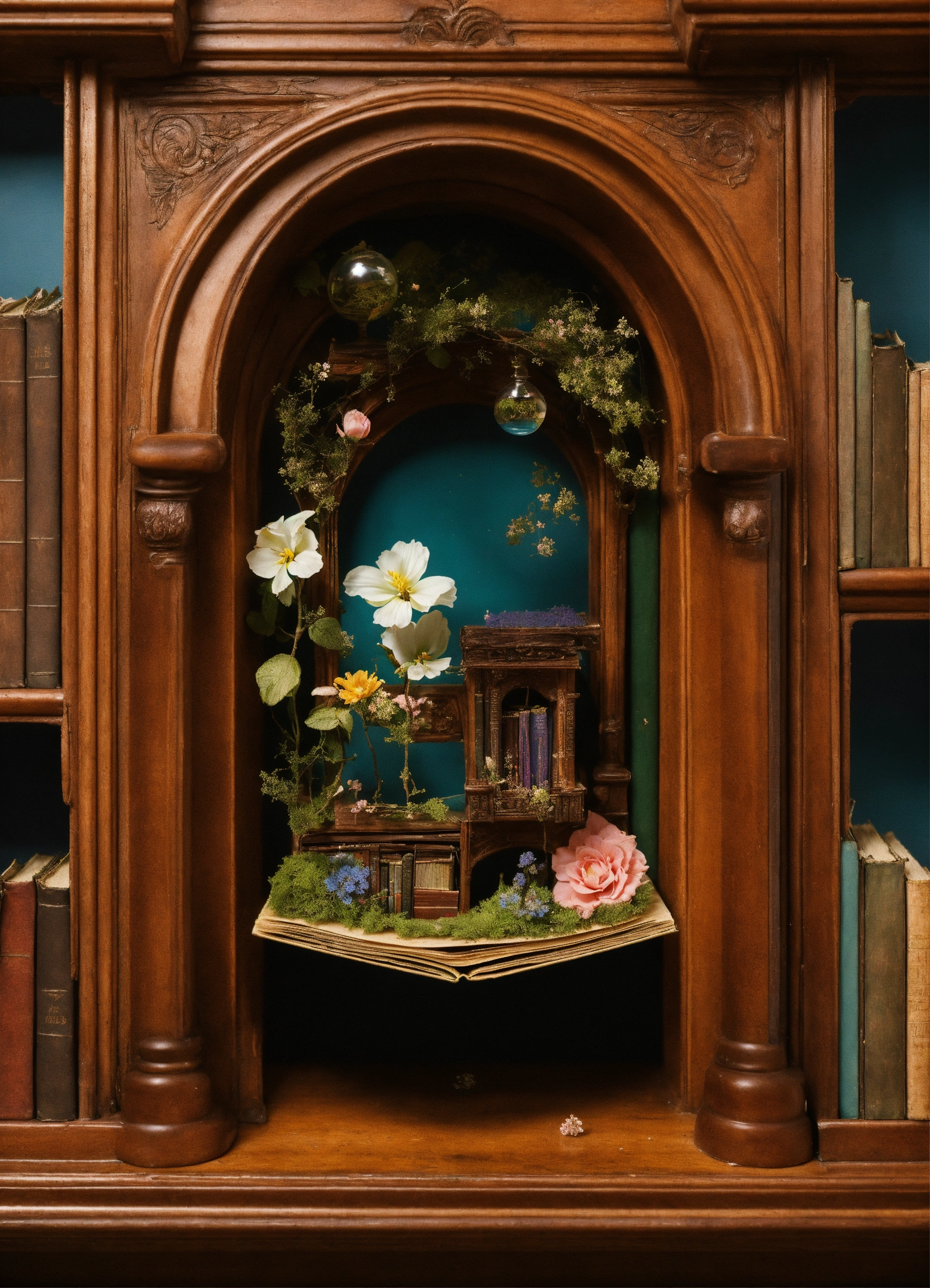 A mini enchanted world is born among old books on a victorian shelf, like a luninous portal, flowers, branches and flowers begin to invade the shelf and intertwine through the books, a dreamlike and surrealist scene, inspired by fantasy films