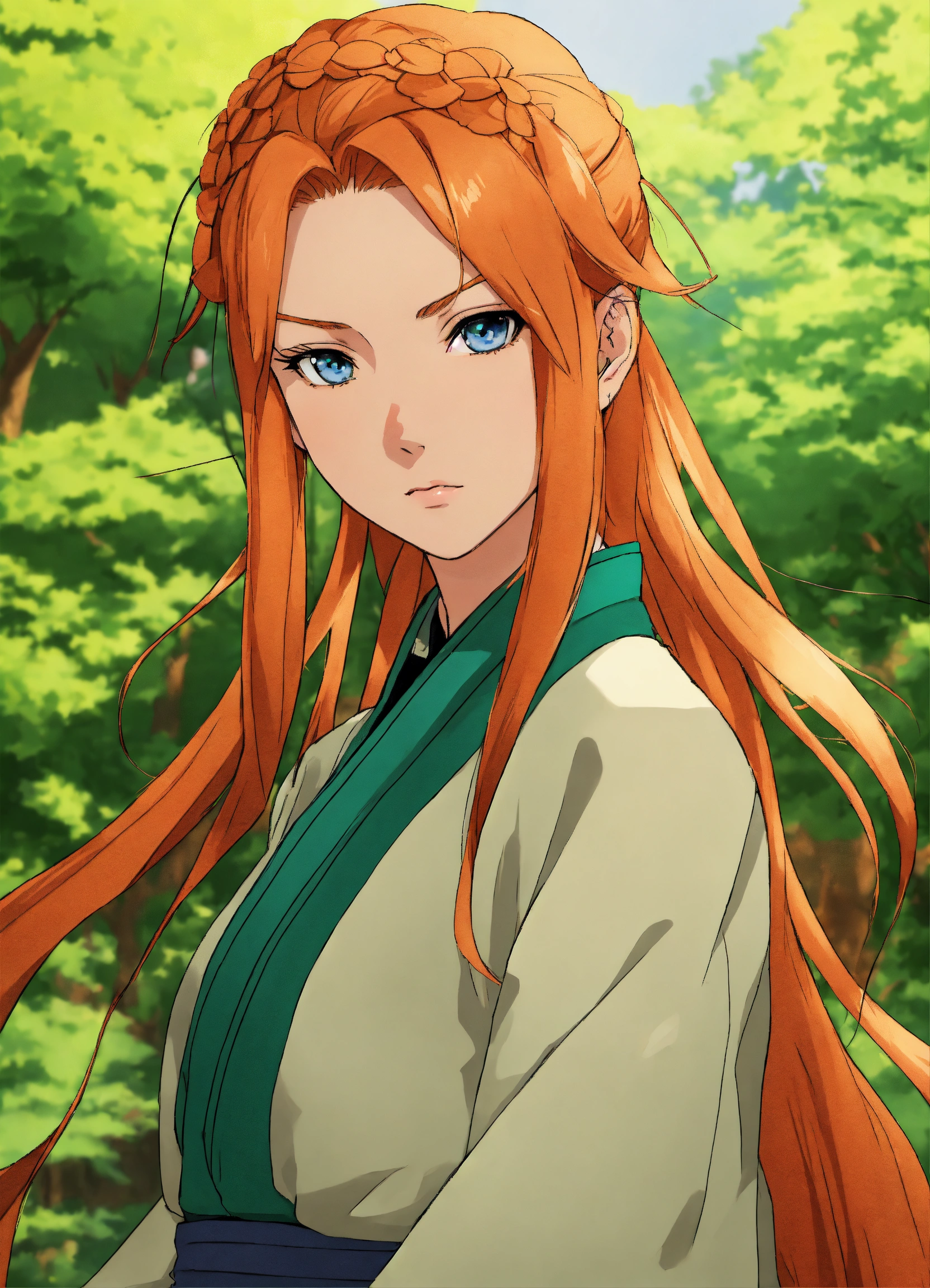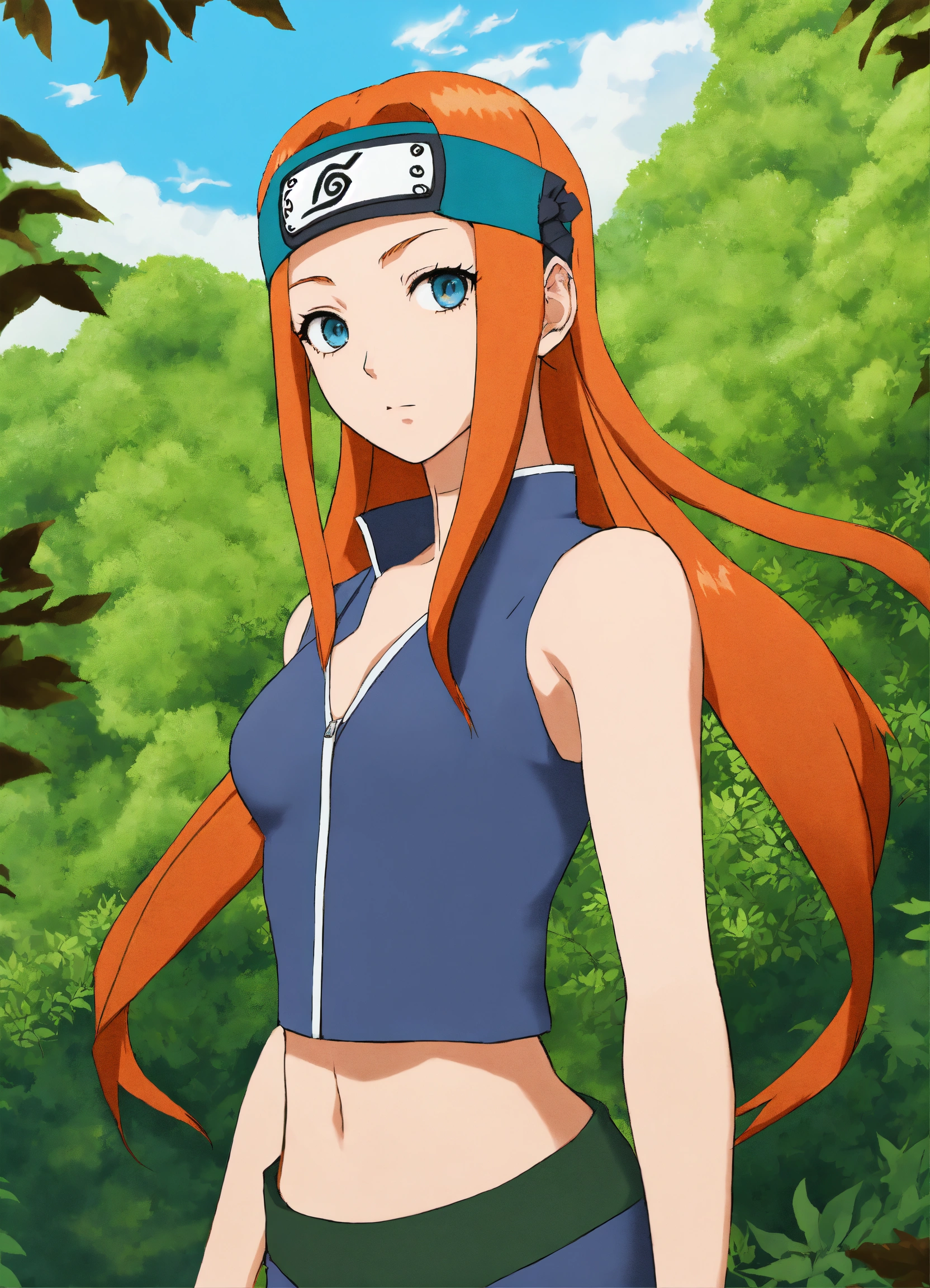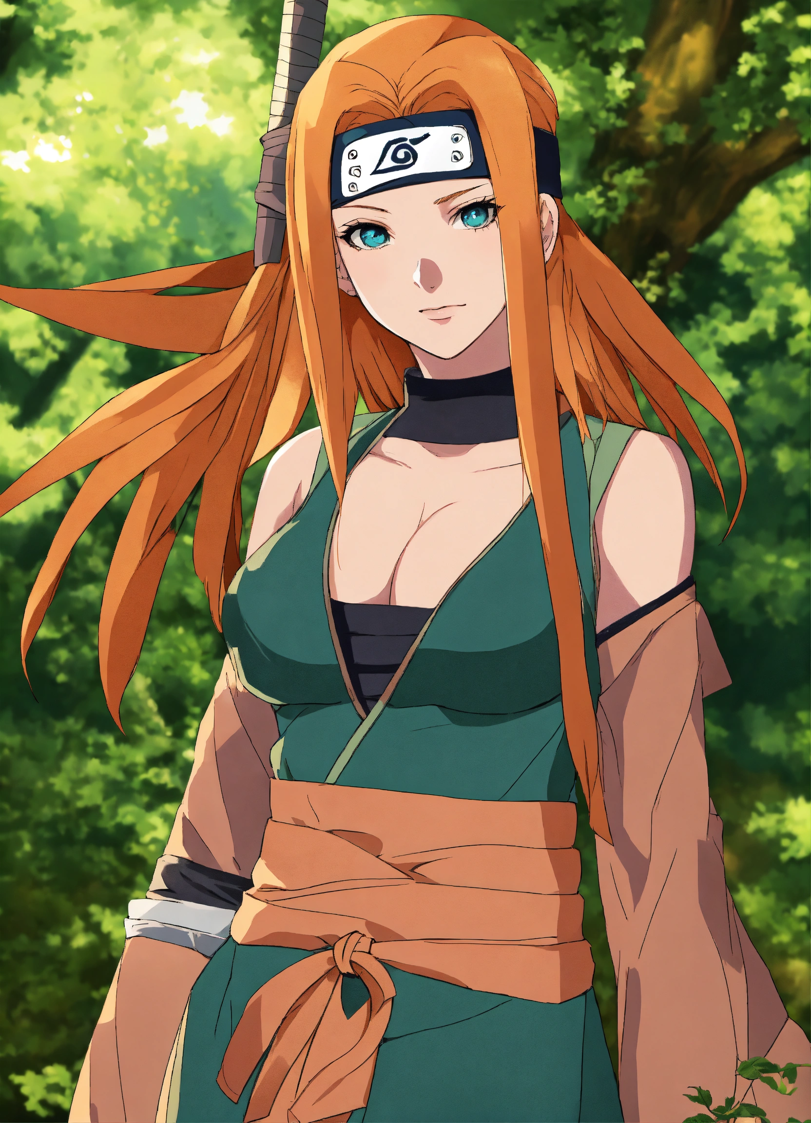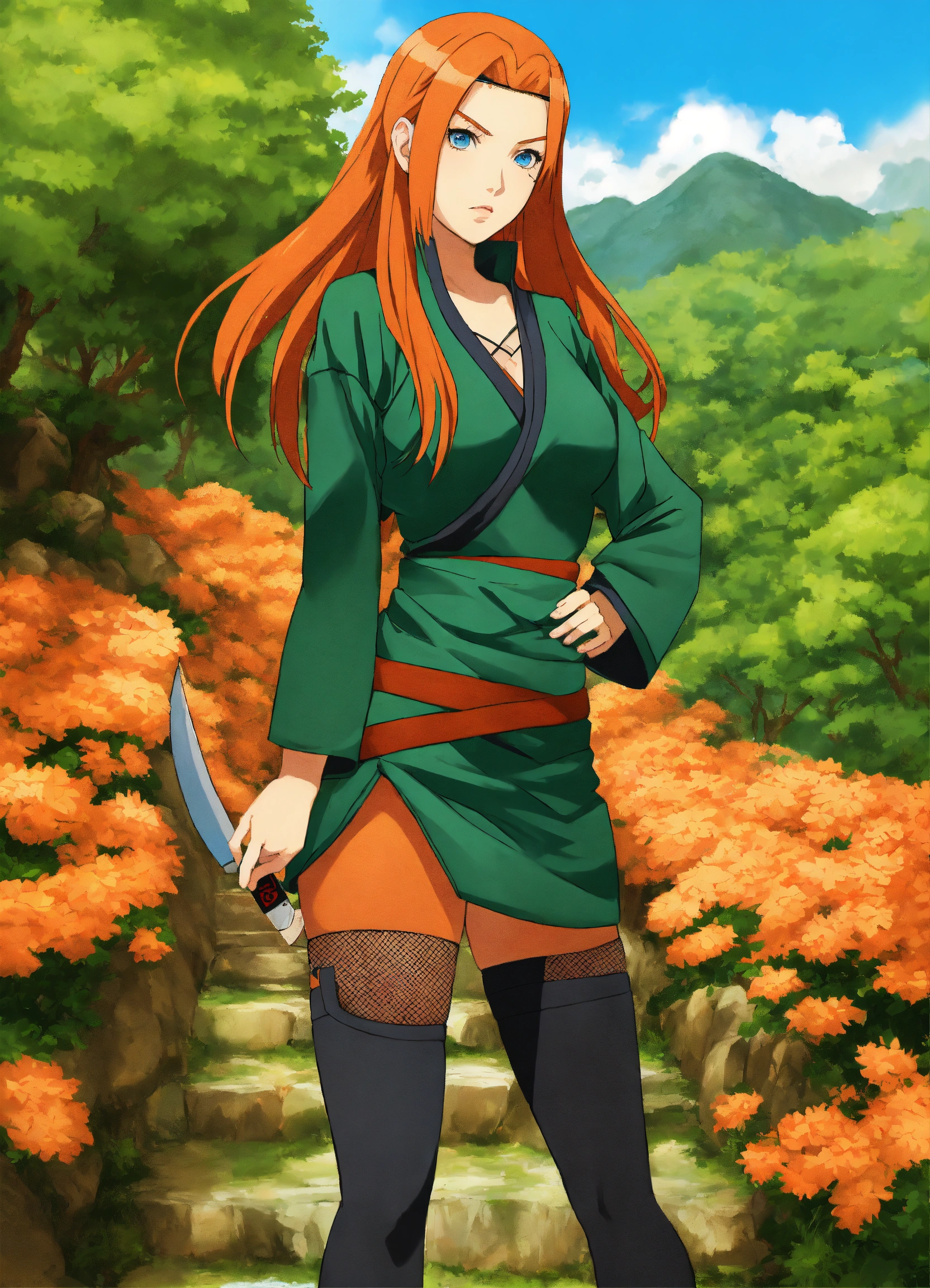 Naruto-style art, masashi kishimoto art, anime, naruto manga, naruto anime, original character, ginger hair, blue eyes, pretty woman, kunoichi, shinobi, konoha, ginger long hair, ginger hair, blue eyes, beautiful girl, beautiful young woman in naruto style art, feminine, fishnets, village hidden in the leaves headband, fishnets, green kunoichi attire, feminine kunoichi attire, naruto headband, fishnets tights on legs, flattering kunoichi fishnets with green outfit, long hair down and flowing, full body, older woman, jonin, jonin kunoichi, stylish outfit