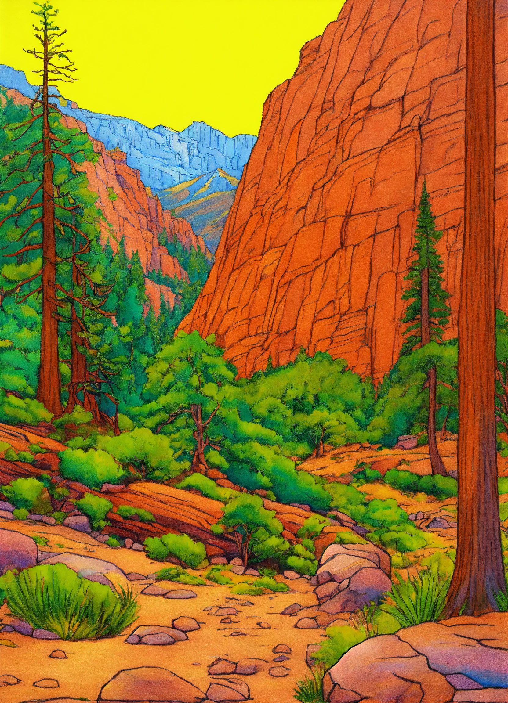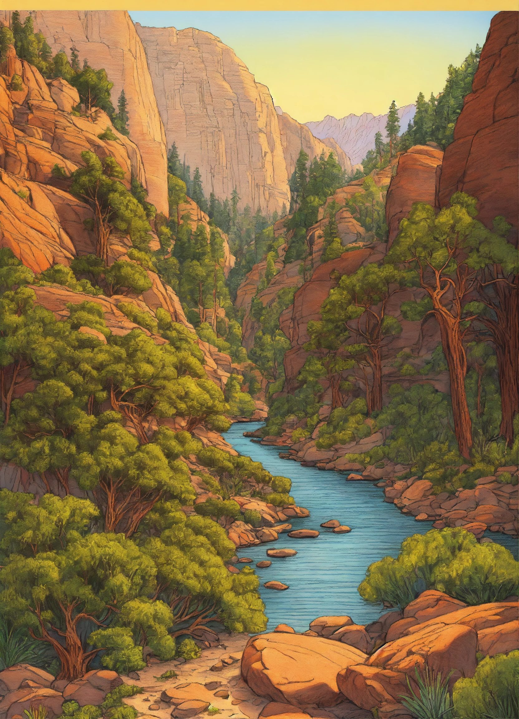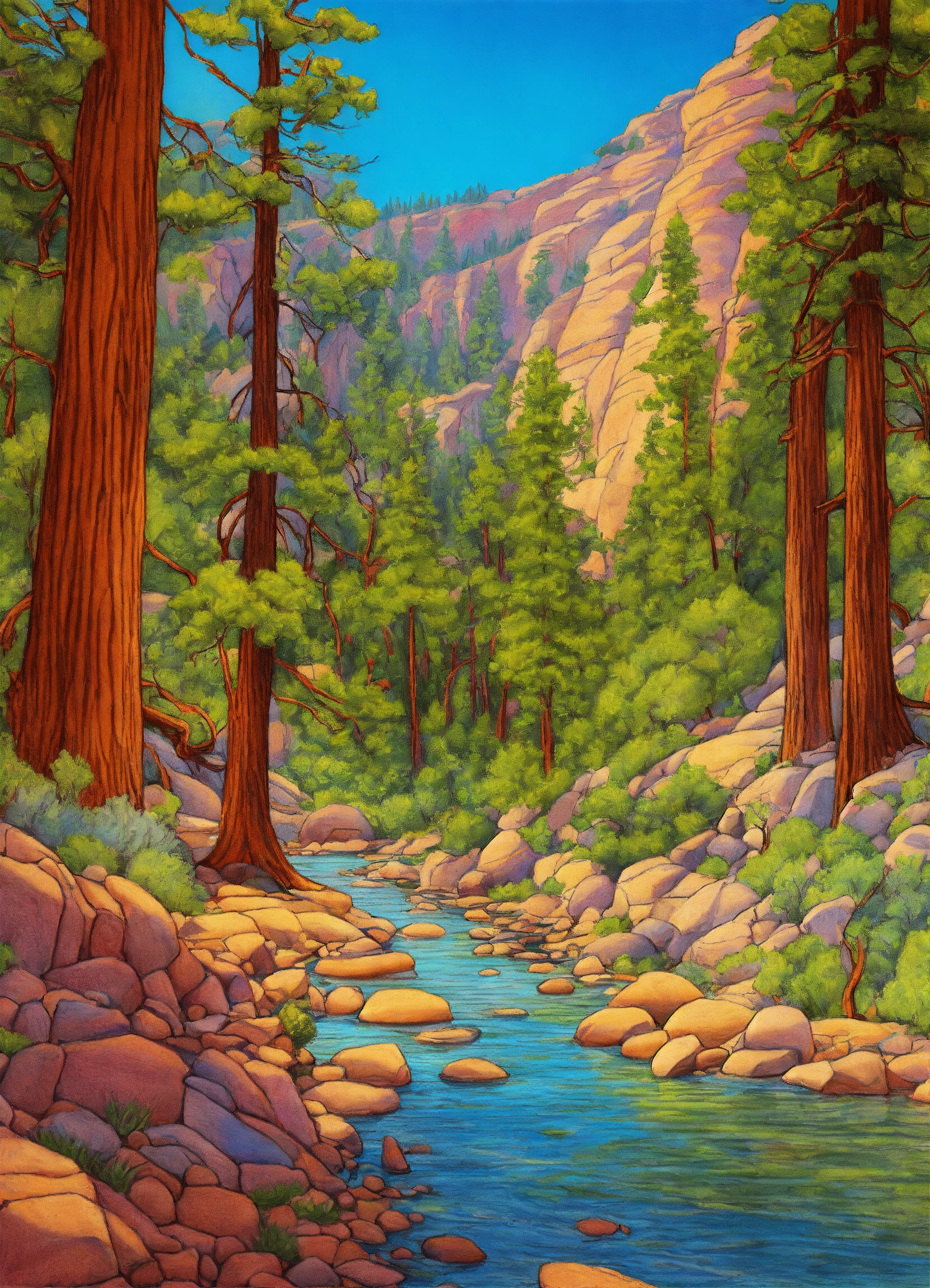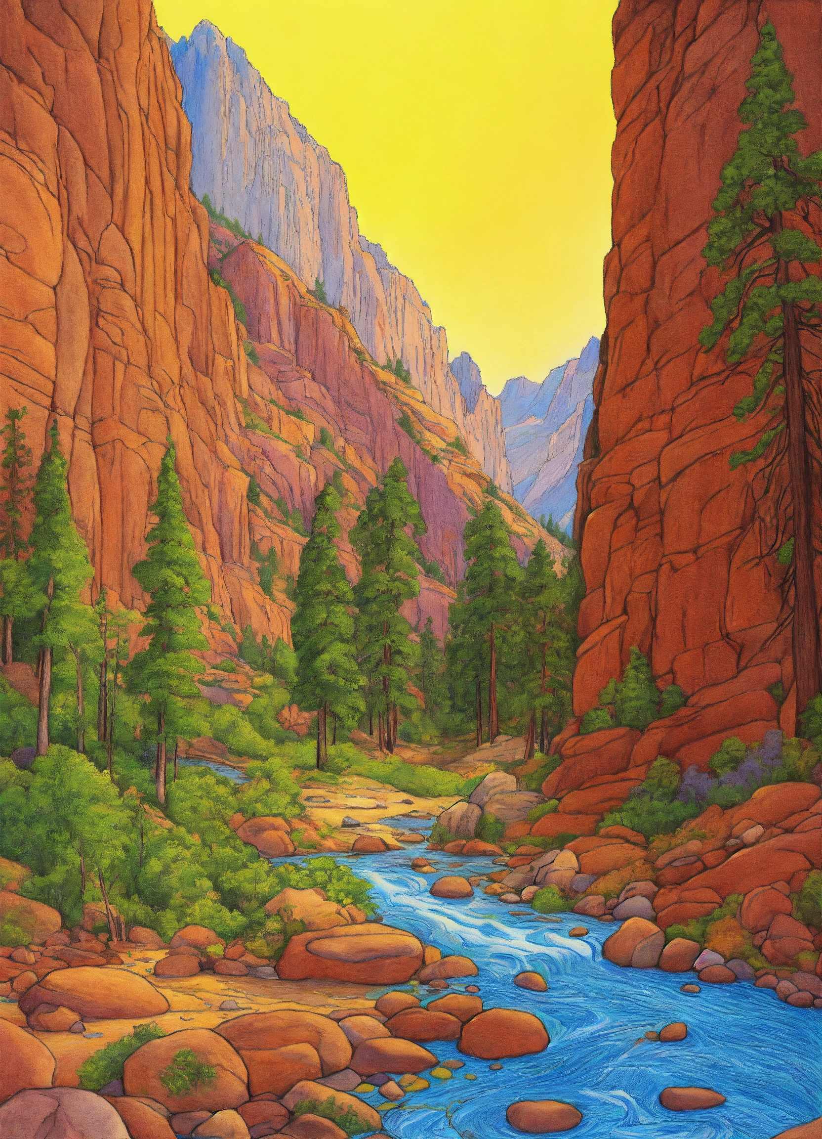 Drawing kings canyon national parks usa in summer. line drawing, clean clear lines, coloring book style, bright colors, intricate details, elegant, discreete, serene, magical, peaceful, fine detail, pastel pencils, winsor mccay style.