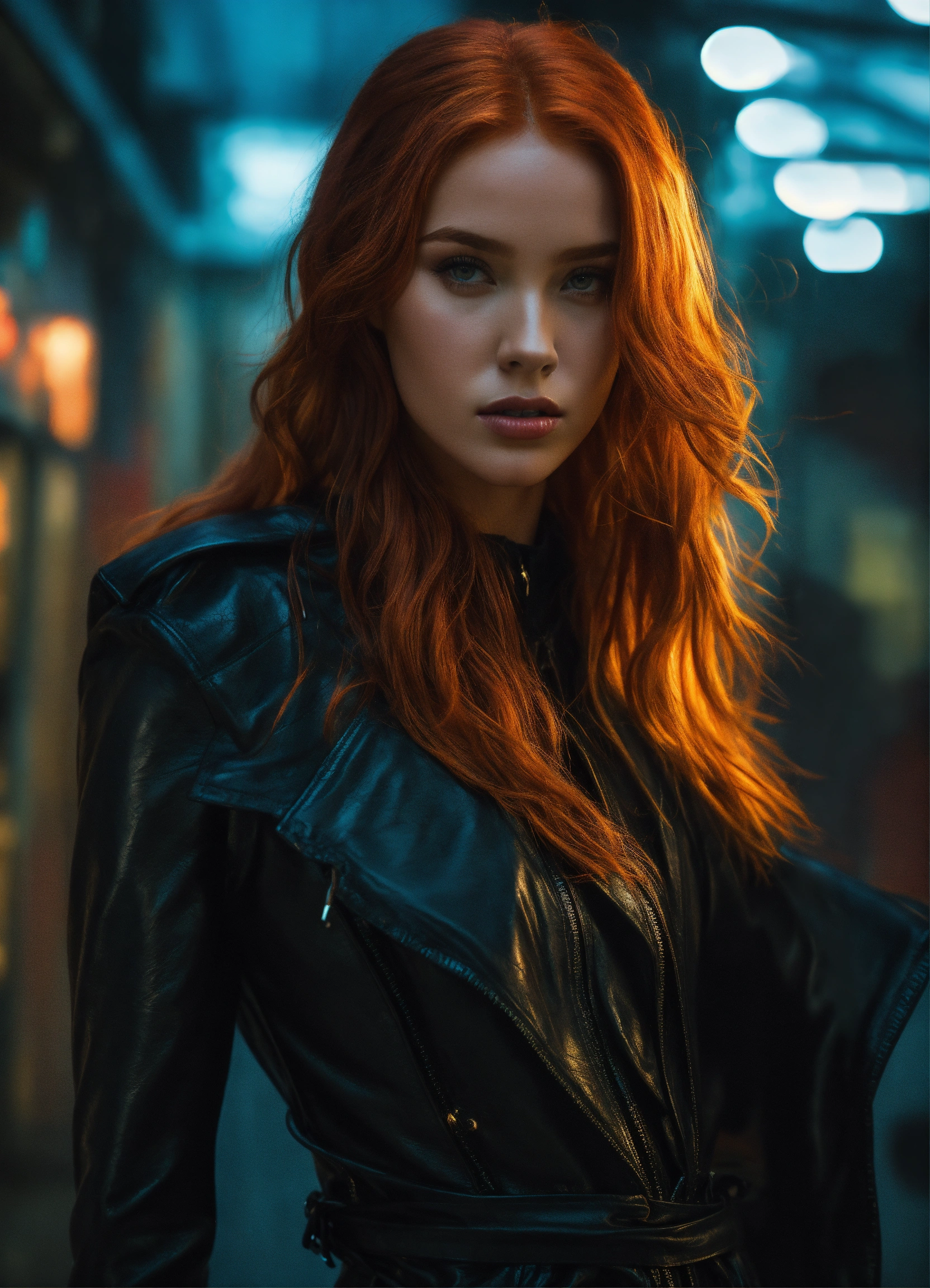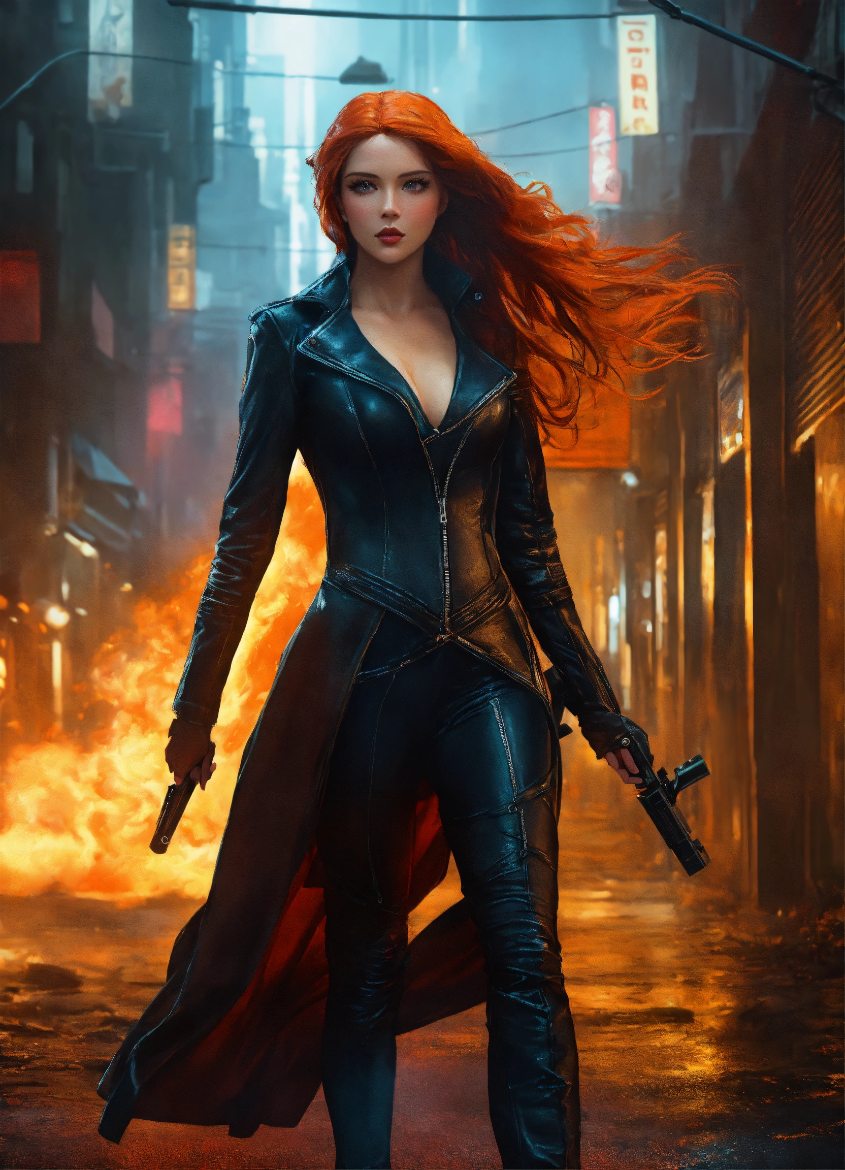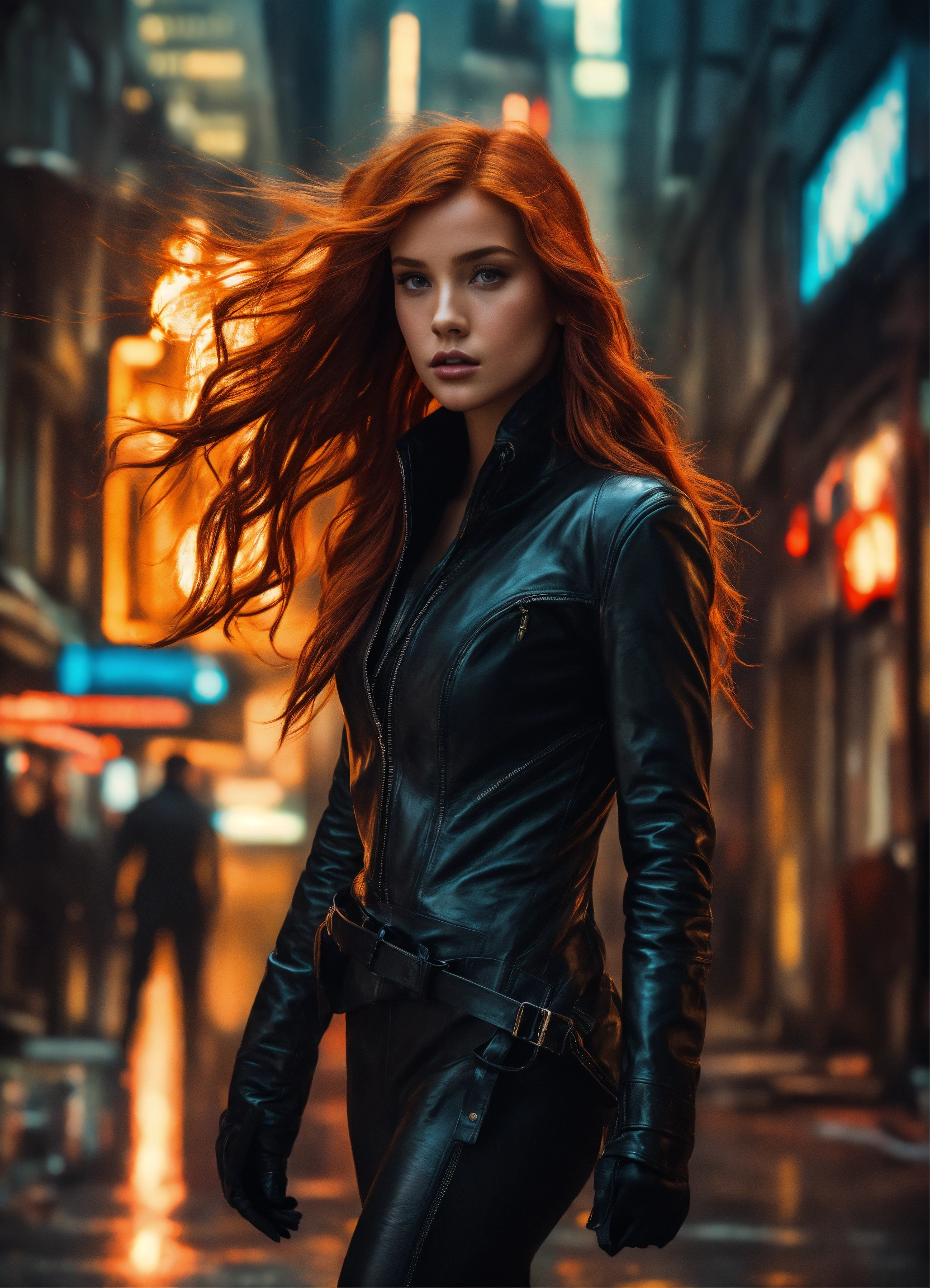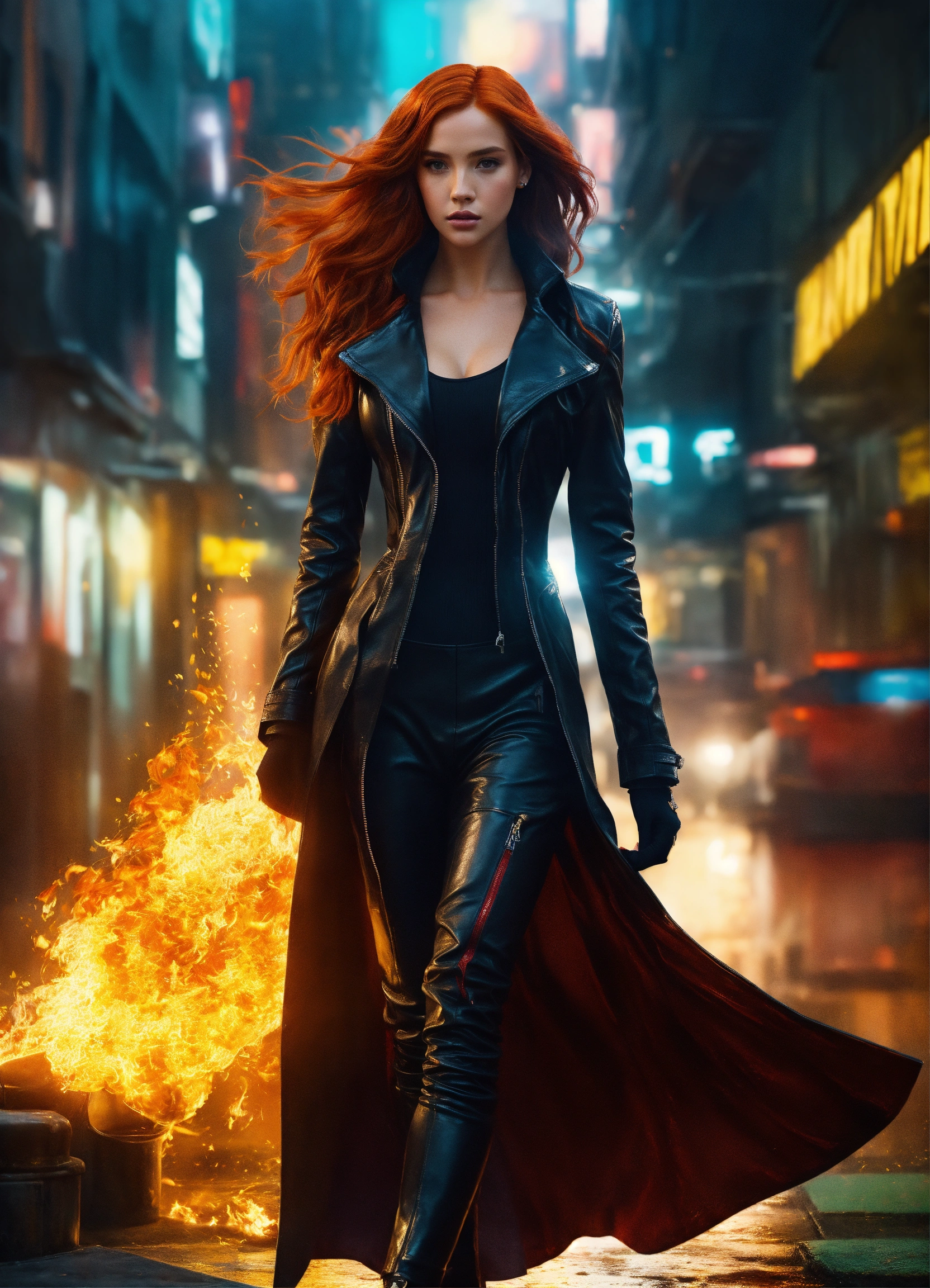 A beautiful, shapely irish redhead female goddess princess with long hair, a noble princess warrior, perfect face, beautiful woman, shapely hour-glass figure, stunning woman wearing a long black leather jacket and a black super spy stealth suit, full covered, walking in a dark alley of a futurist blade runner 2049 city, fully covered, flowing red hair, long hair, hour-glass figure + fire powers, full body shot editorial + photorealistic oil painting + photorealism + 4k, 8k, hdr, hr --v 4