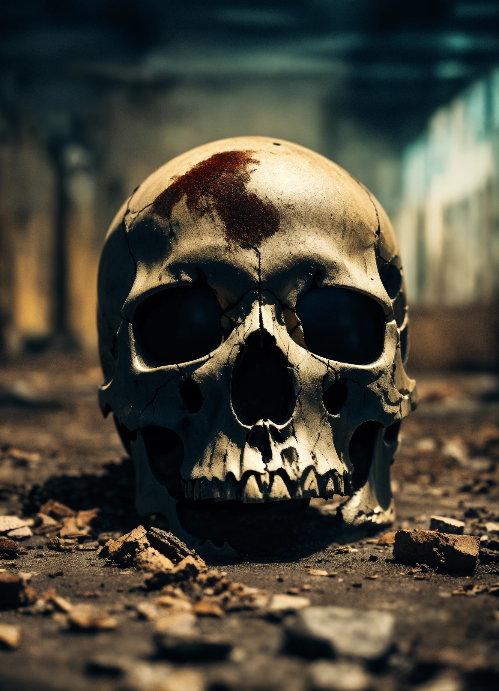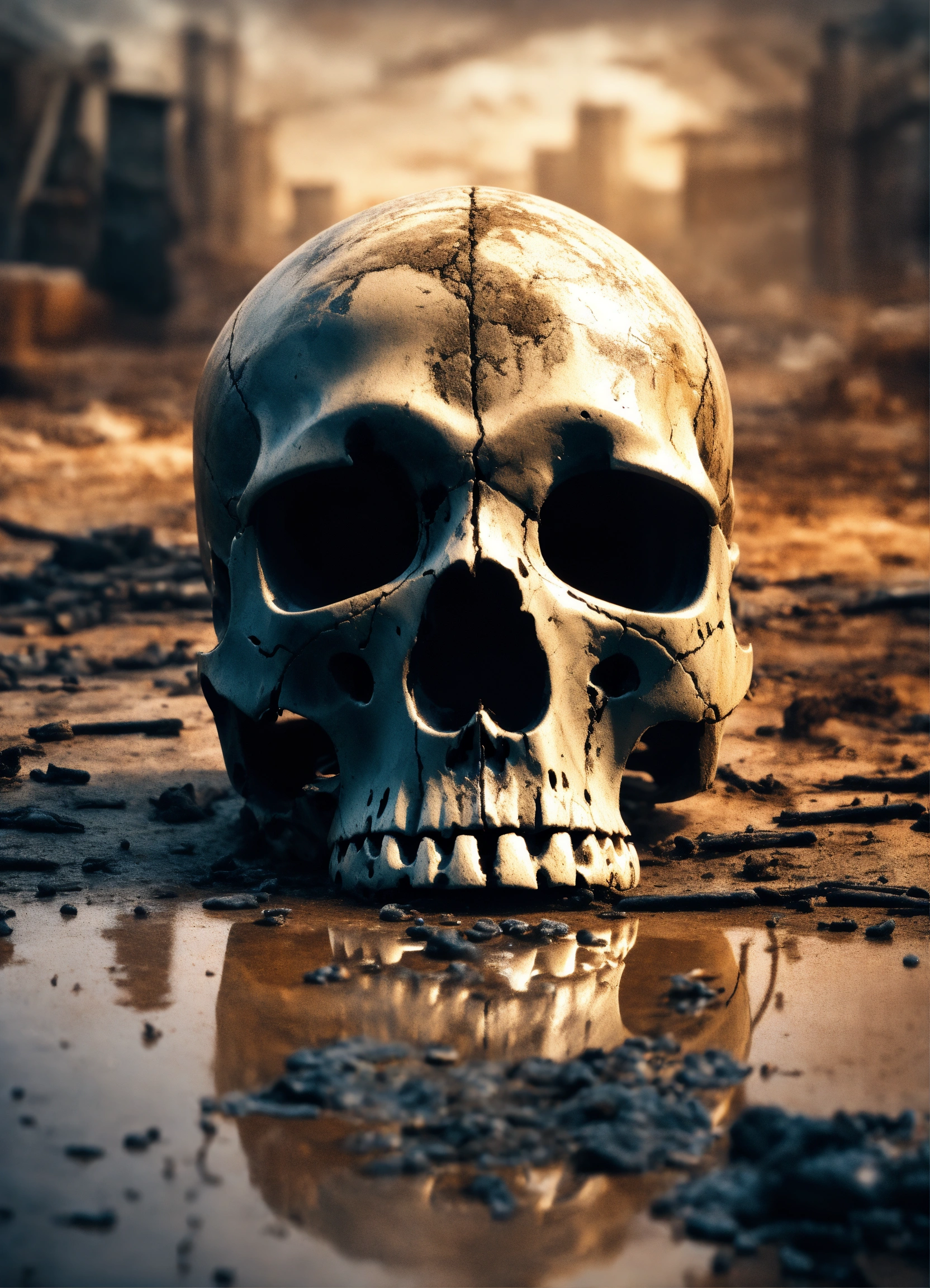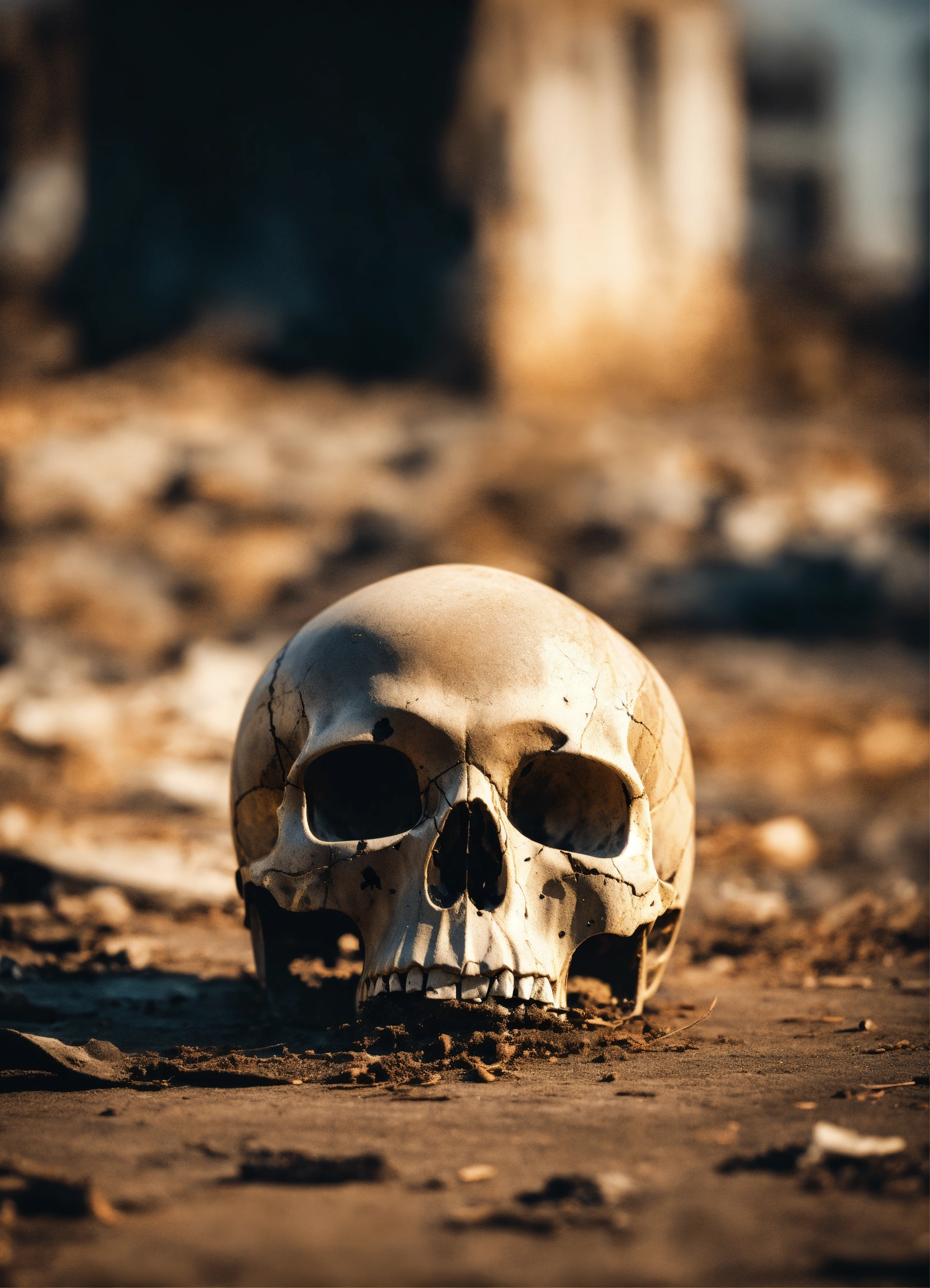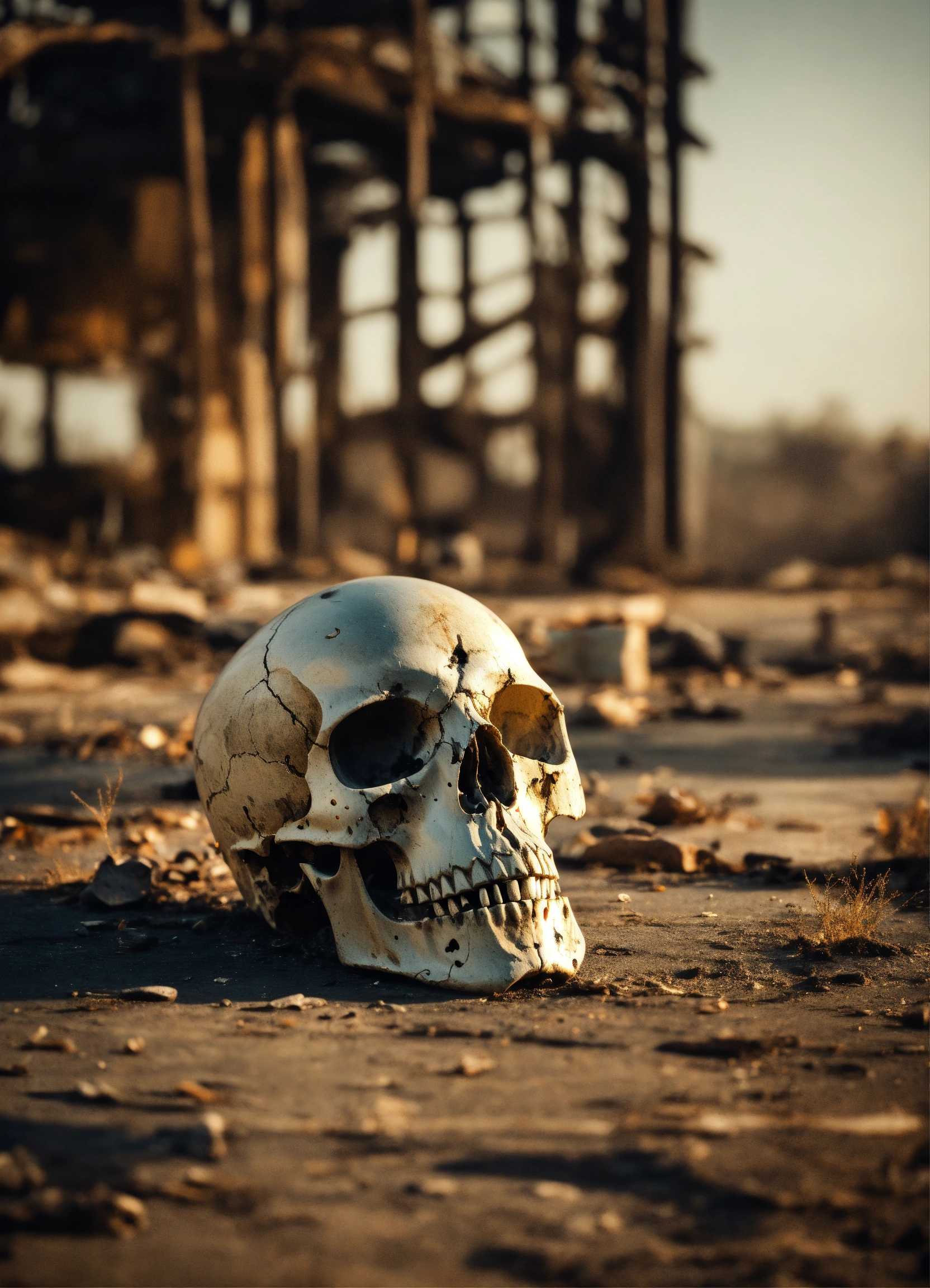 A skull on the floor on a blurred post apocalyptic background, detailed, masterpiece, high quality photo
