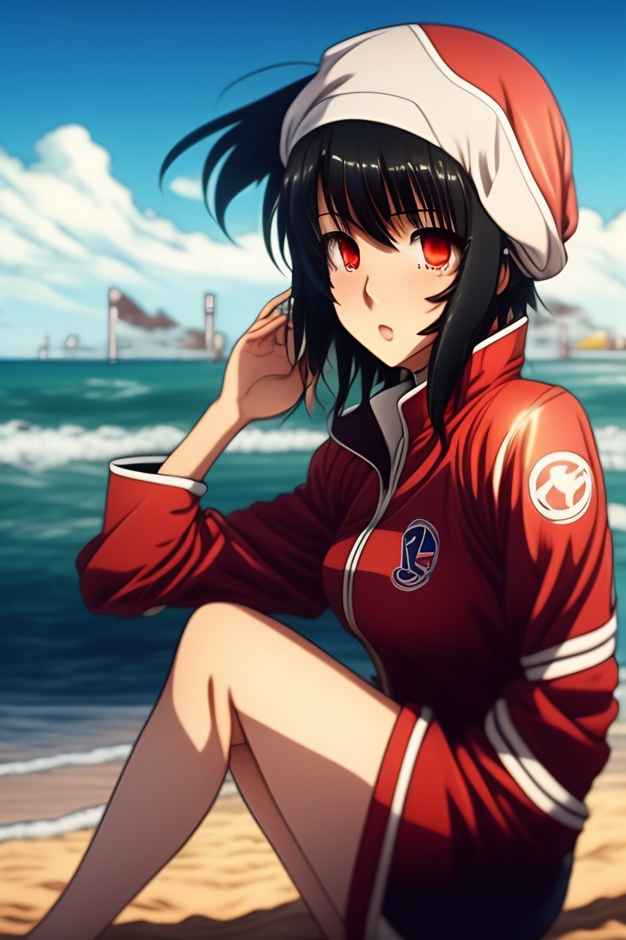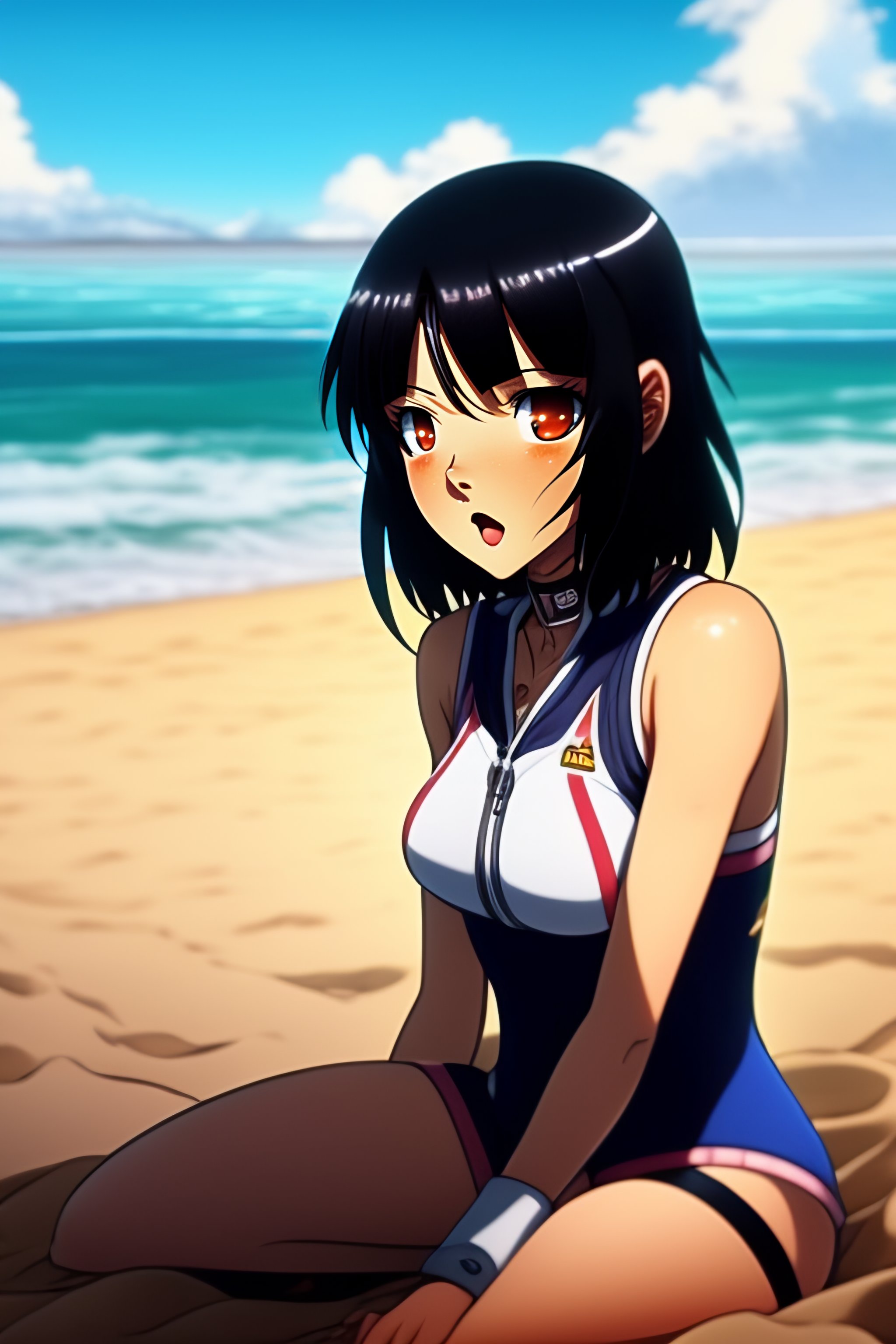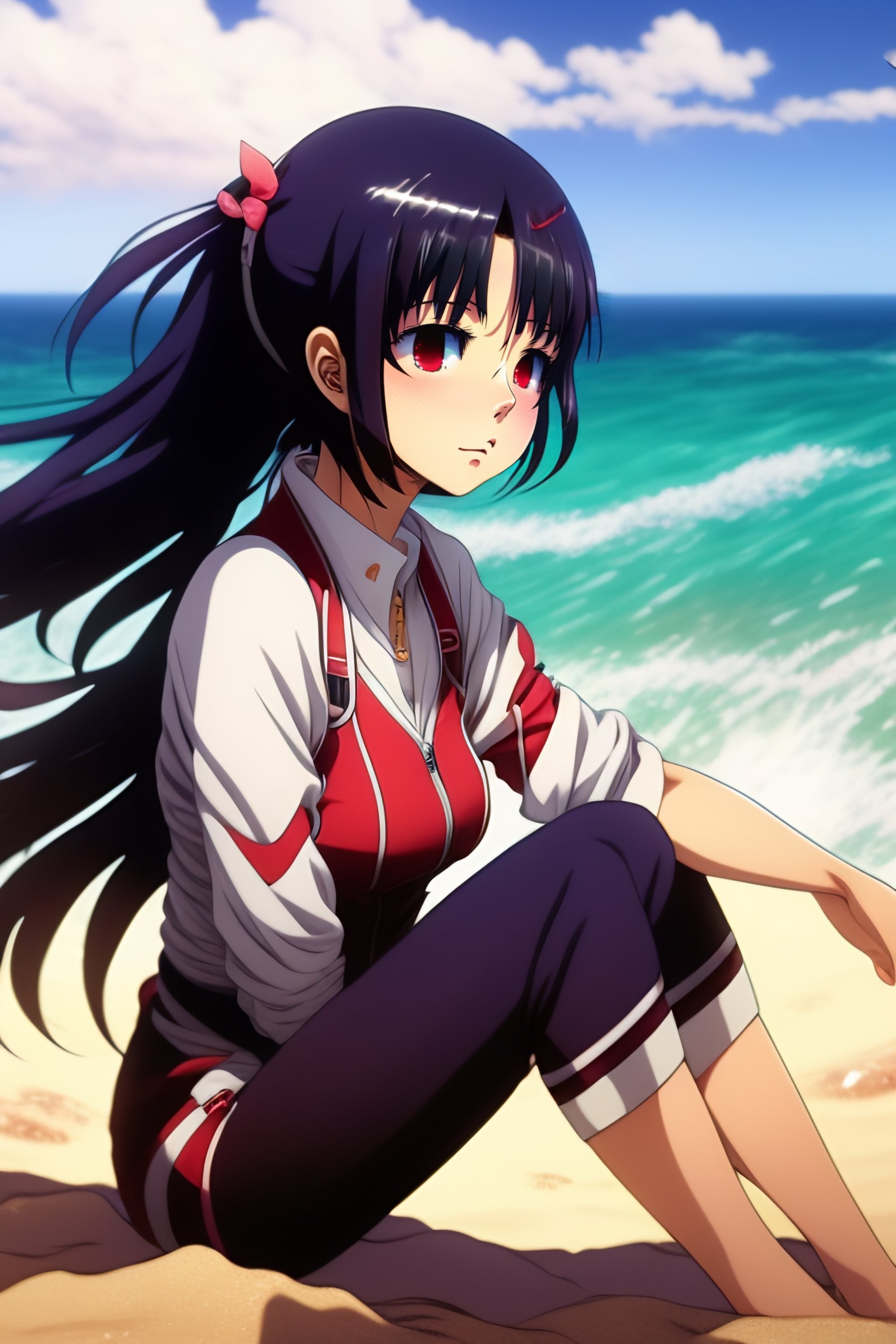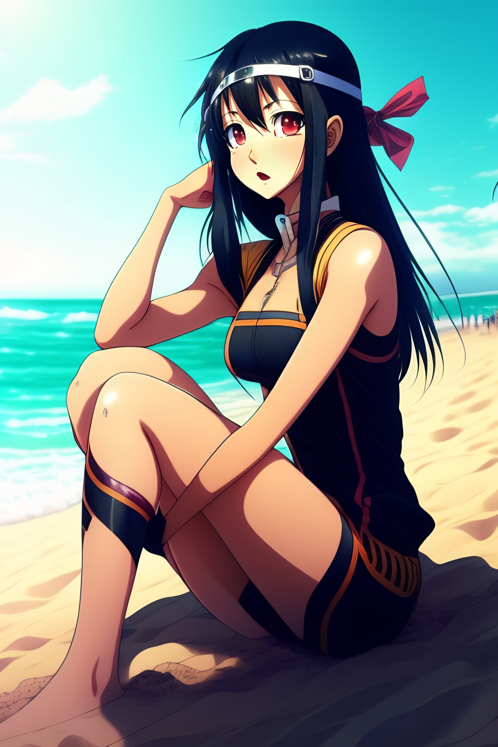90s anime vintage fit enthused cute shy mikasa ackerman with shiny dark eyes from attack on titan at beach sitting down on the sand, black eyes, long black hair, blue bow in hair, dark mikasa beautiful eyes, wearing tight zipper bathing suit, hajime isayama lines, she is sitting on the sand, playing volleyball, super shiny bathing suit, reaching out her hand, reaching out her hand for someone to hold it