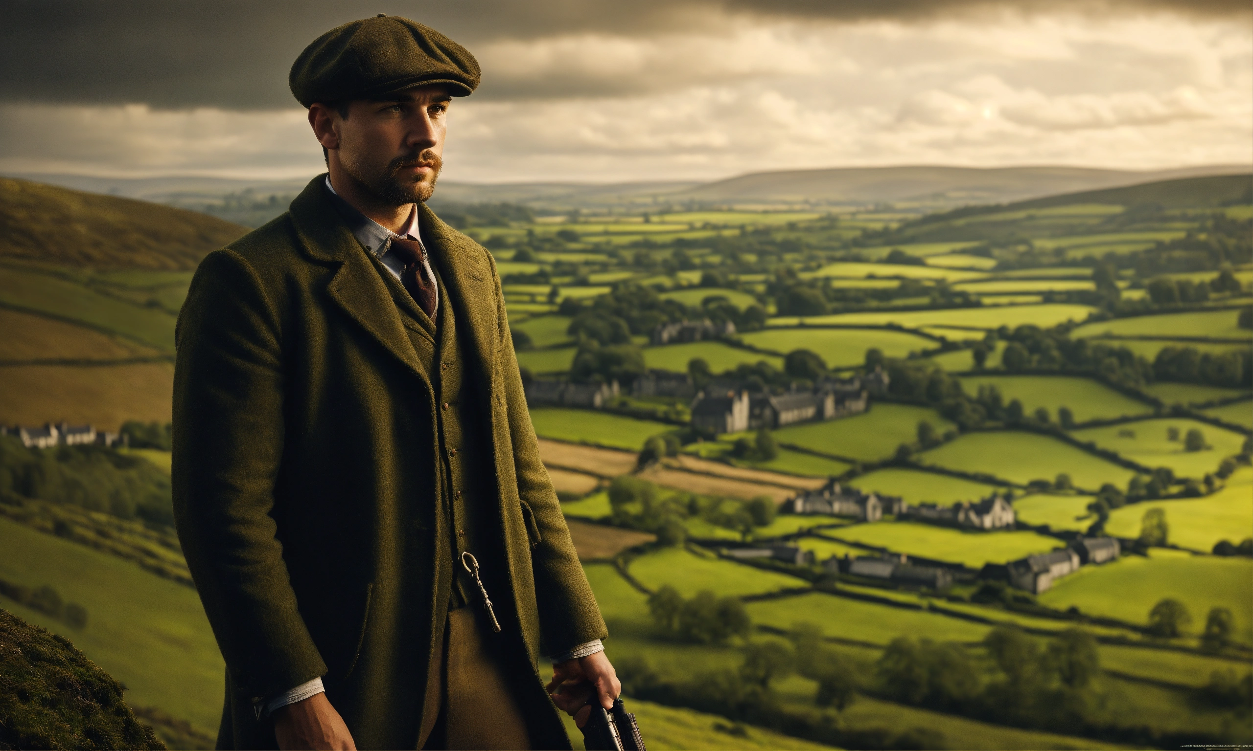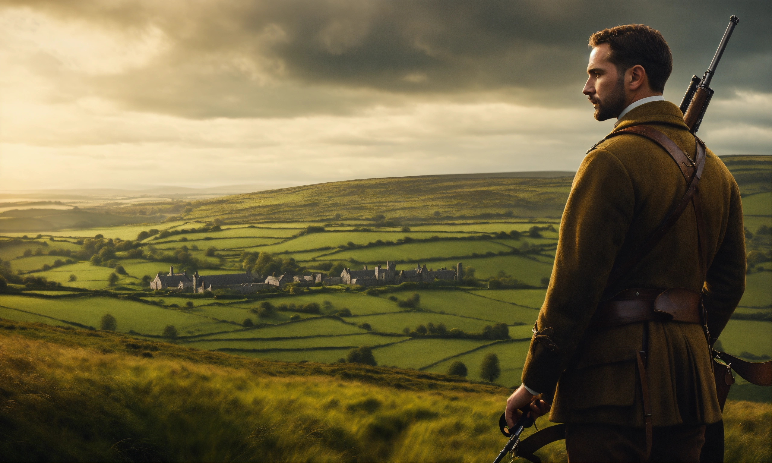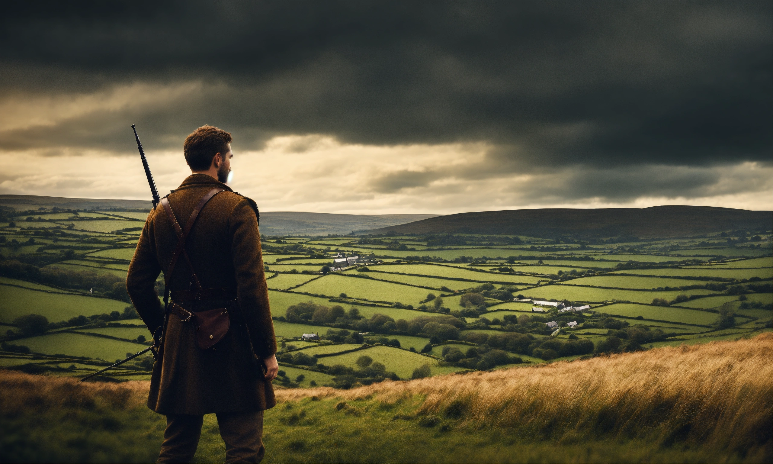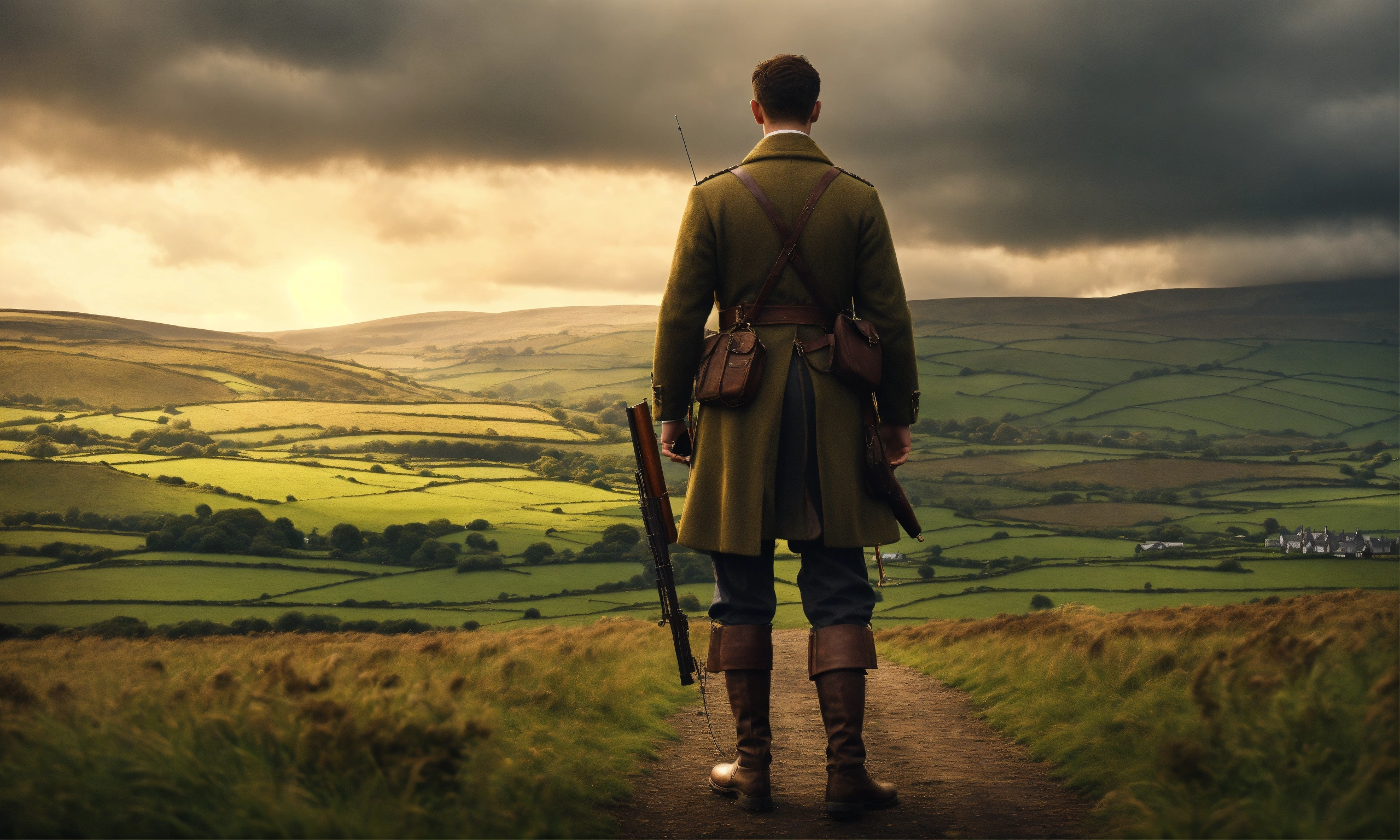 Cinematic wallpaper of a 1920s hunter, 35 years old with short hair, caucasian man, stoic, realistic body proportions, in ireland, irish countryside in the background, cinematic, grimdark, ultra detailed, realistic, hd