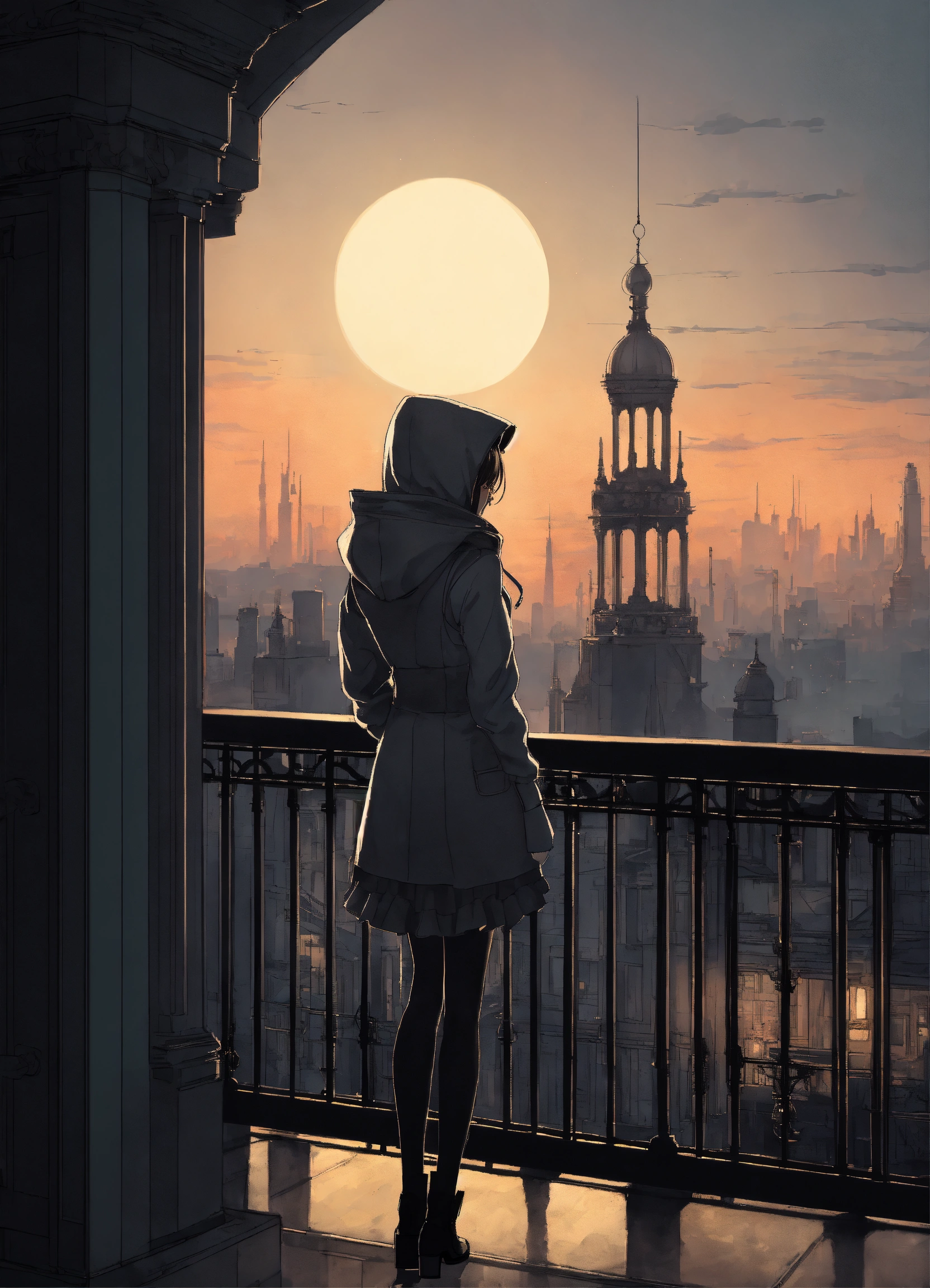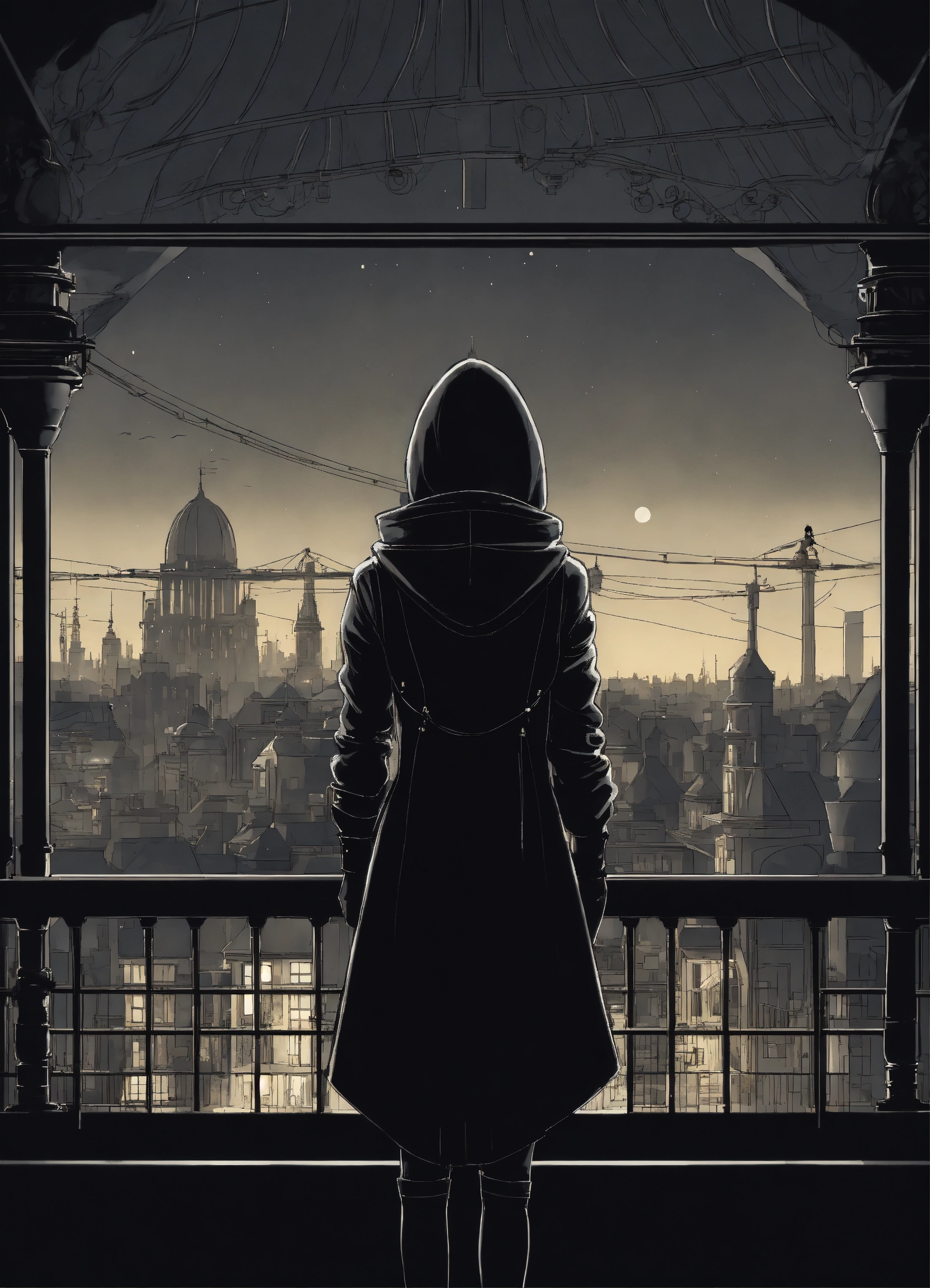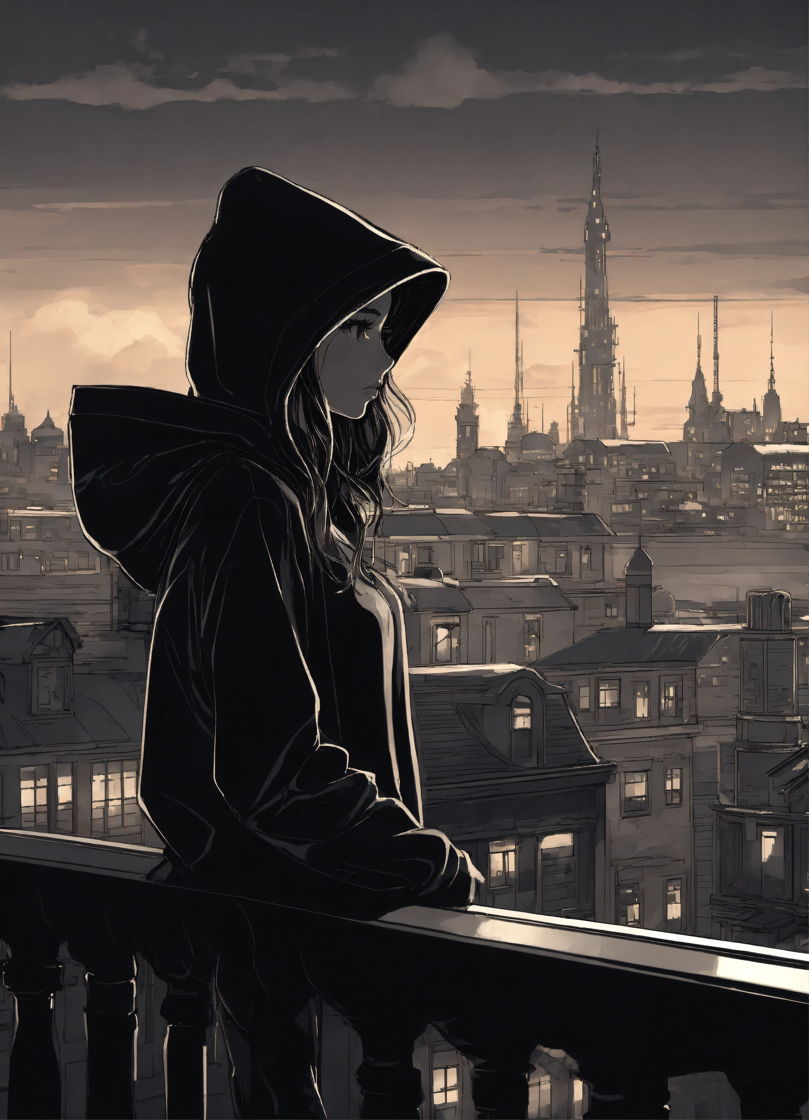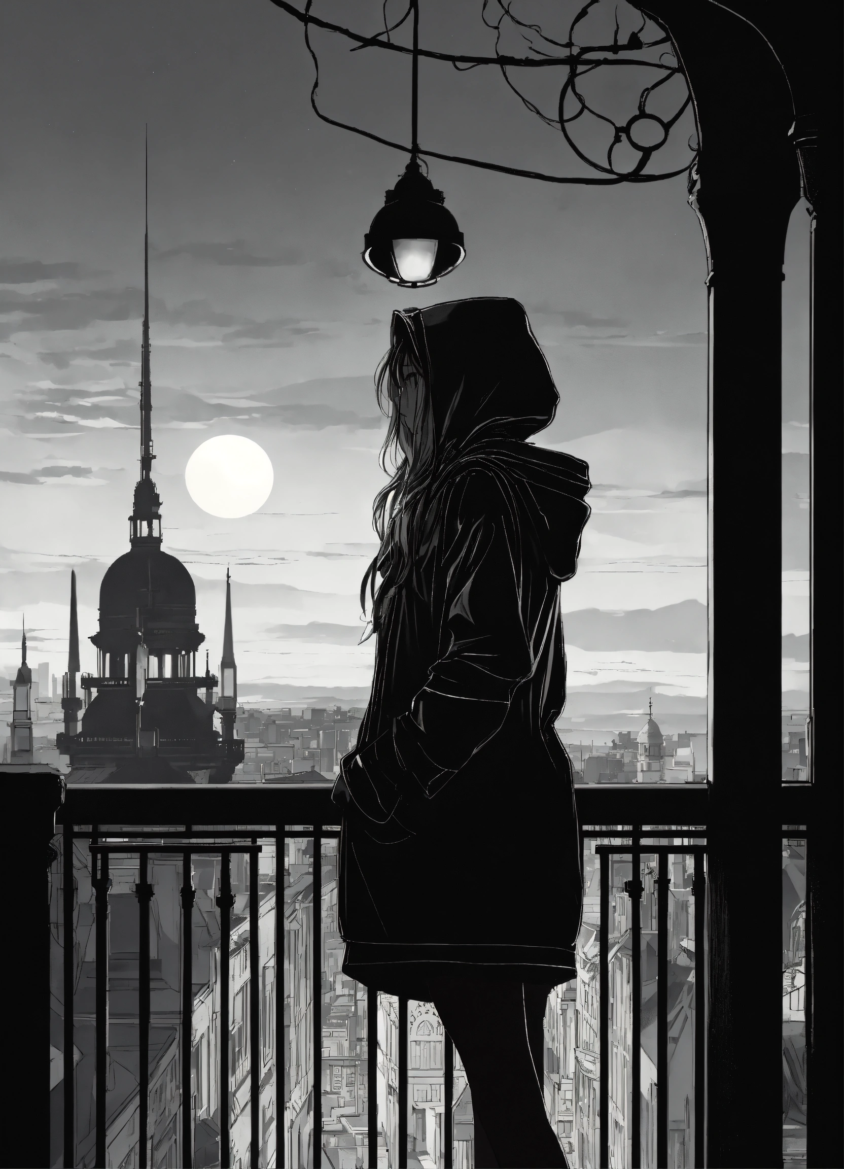 A girl silhouette wearing a hoodie outside a balcony, victorian retro futuristic city skyline at evening, steampunk, realistic style, greyscale beautiful