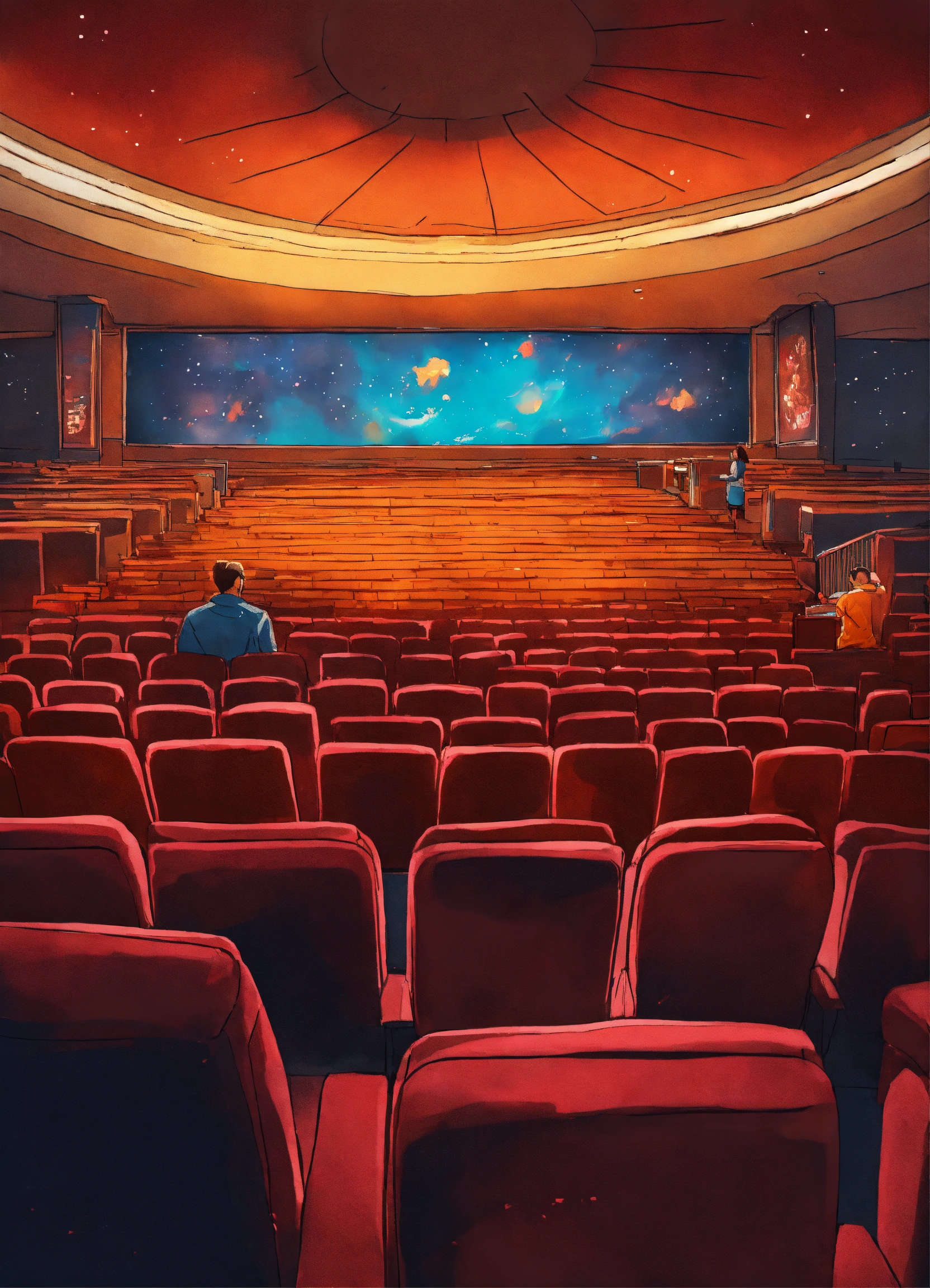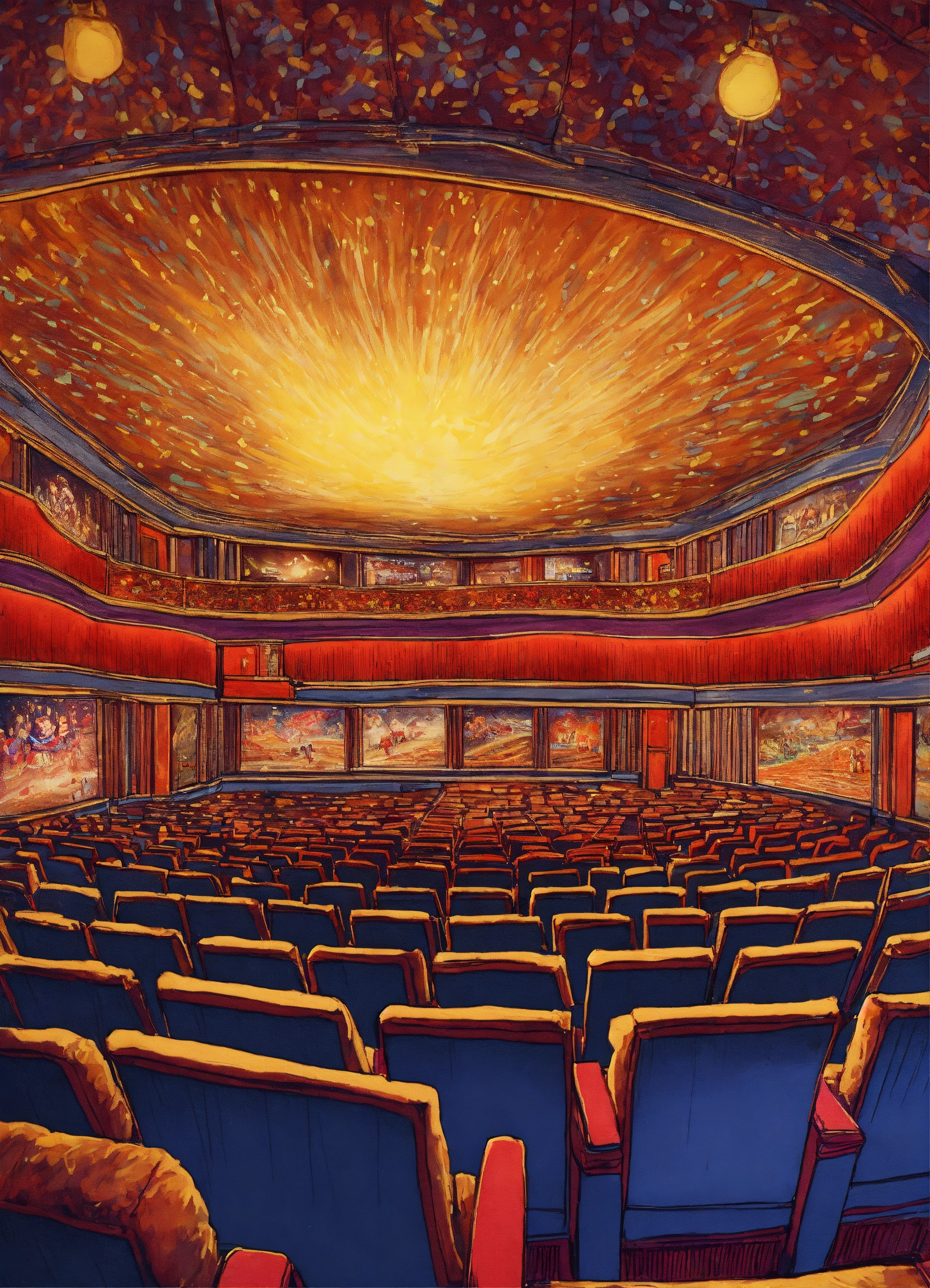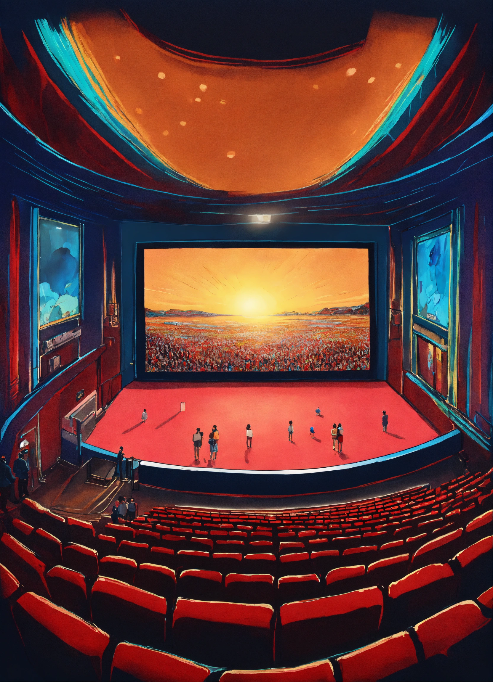 A hand drawn painting of the inside of an inox movie theatre where people are enjoying a movie on the screen. highly detailed crisp photo in 4k, wide-angle, sharp, vibrant, vivid.