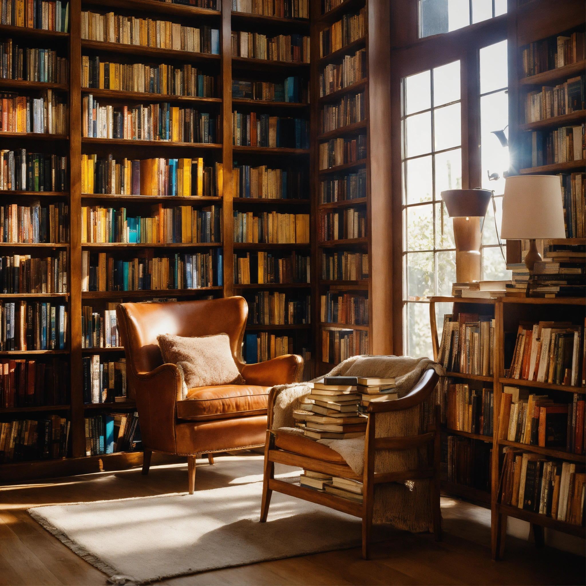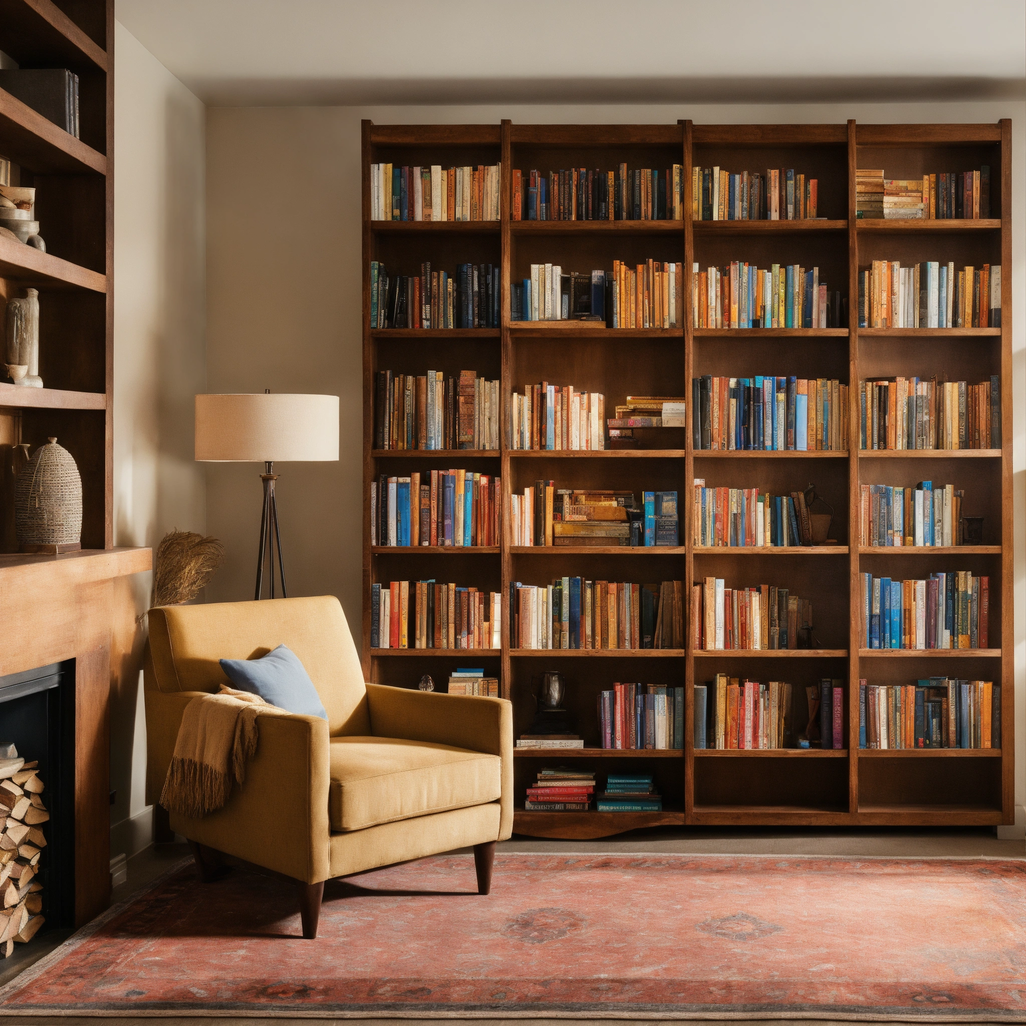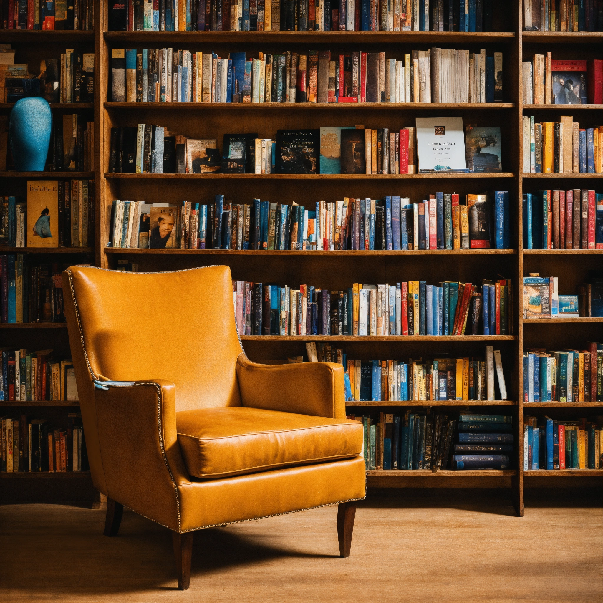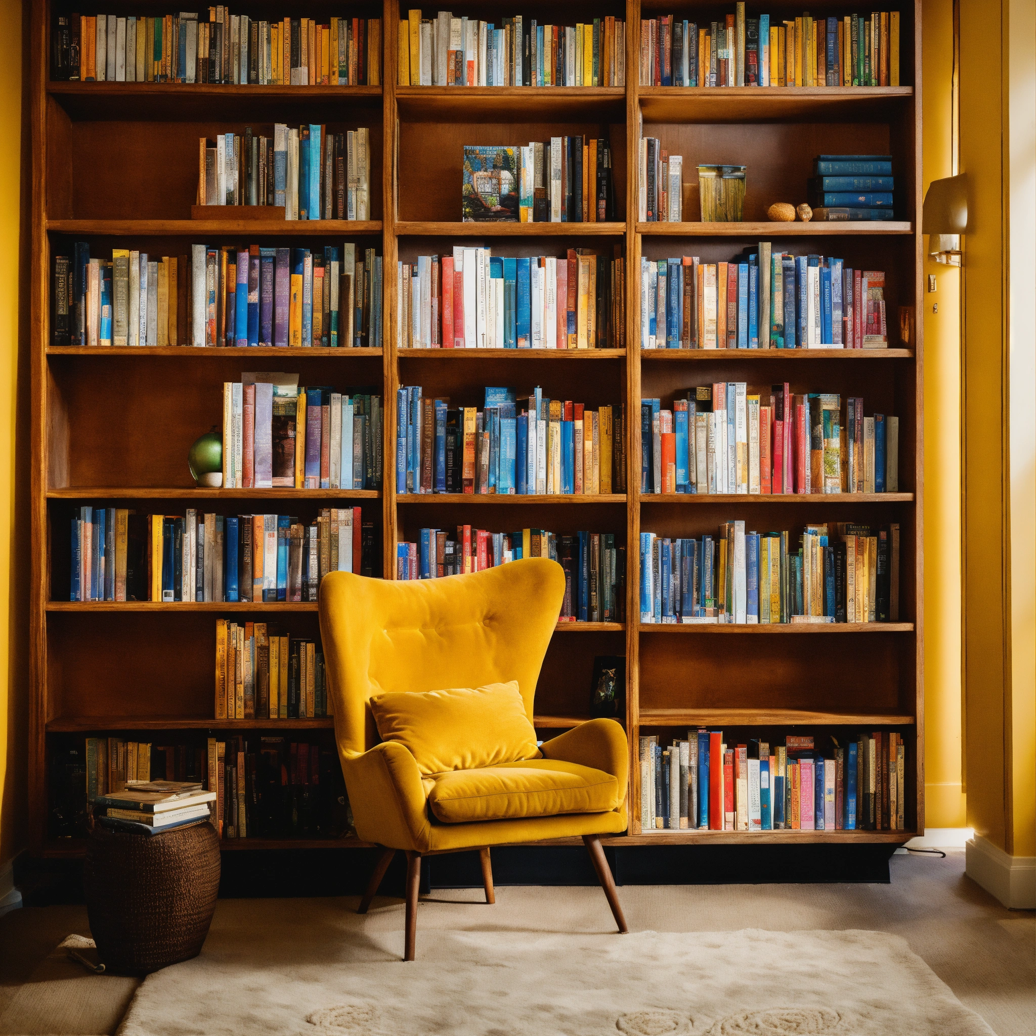 A photo of a bookshelf full of books, the books are organized by genre and author, the bookshelf is in a well-lit room with a comfortable chair