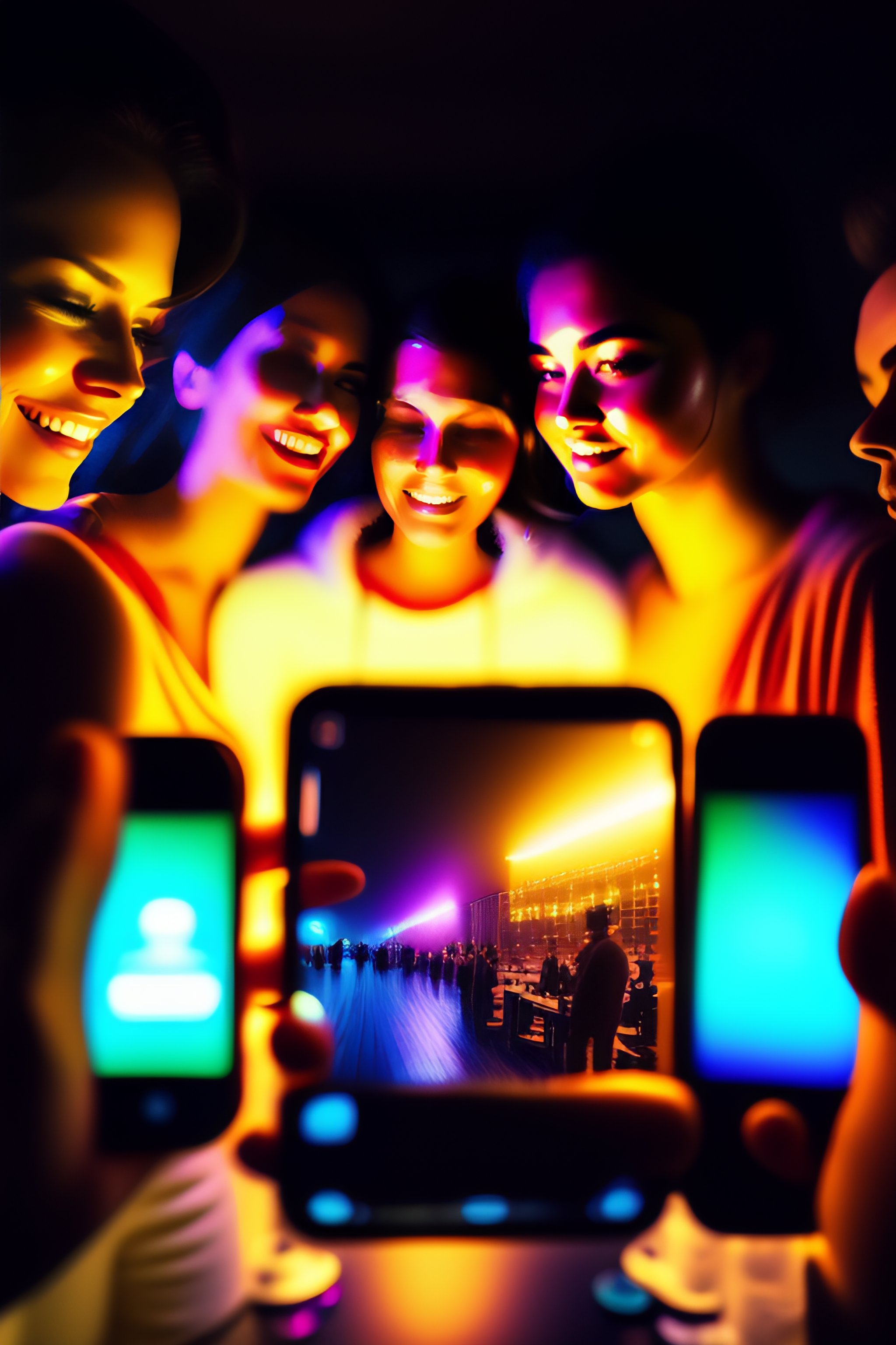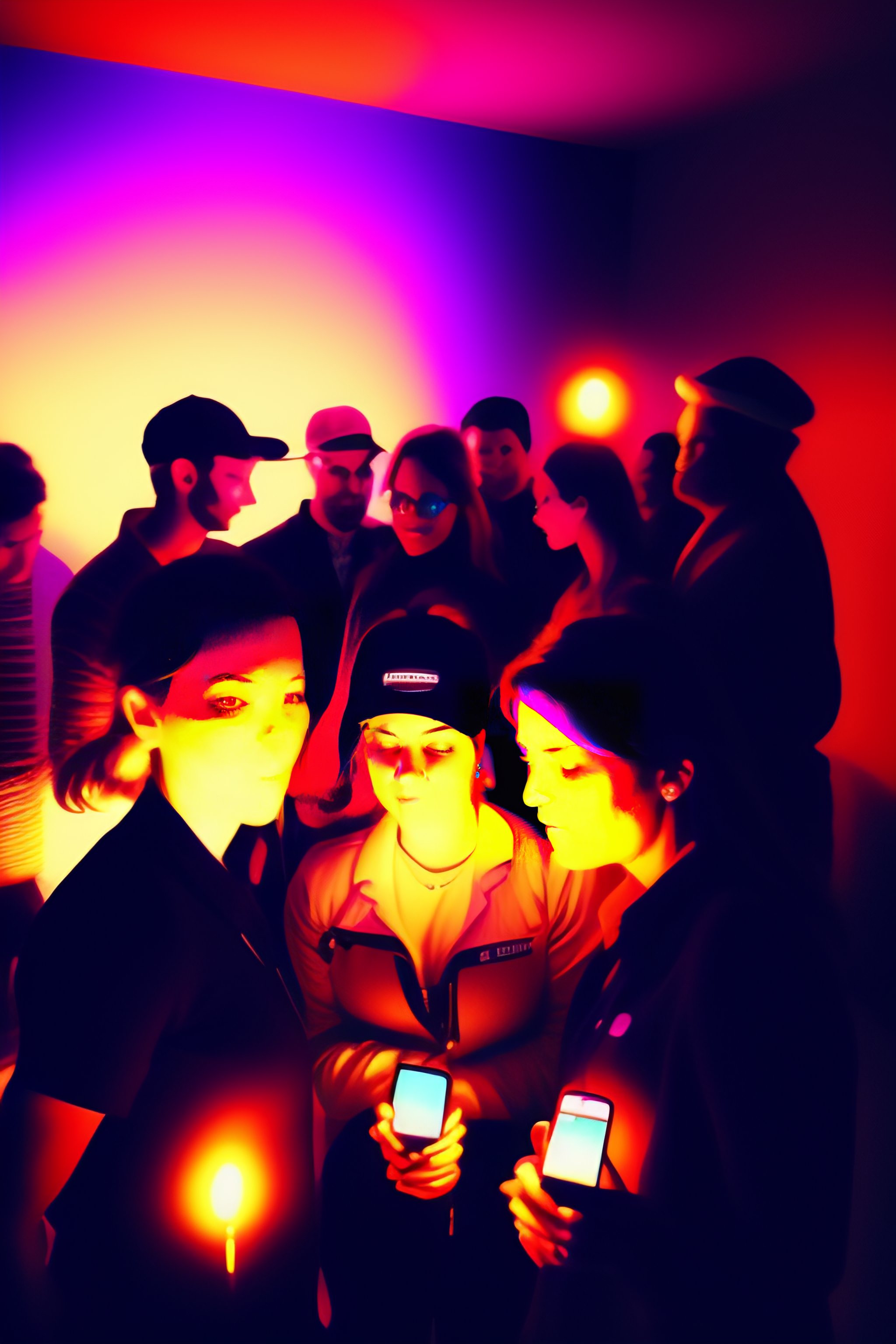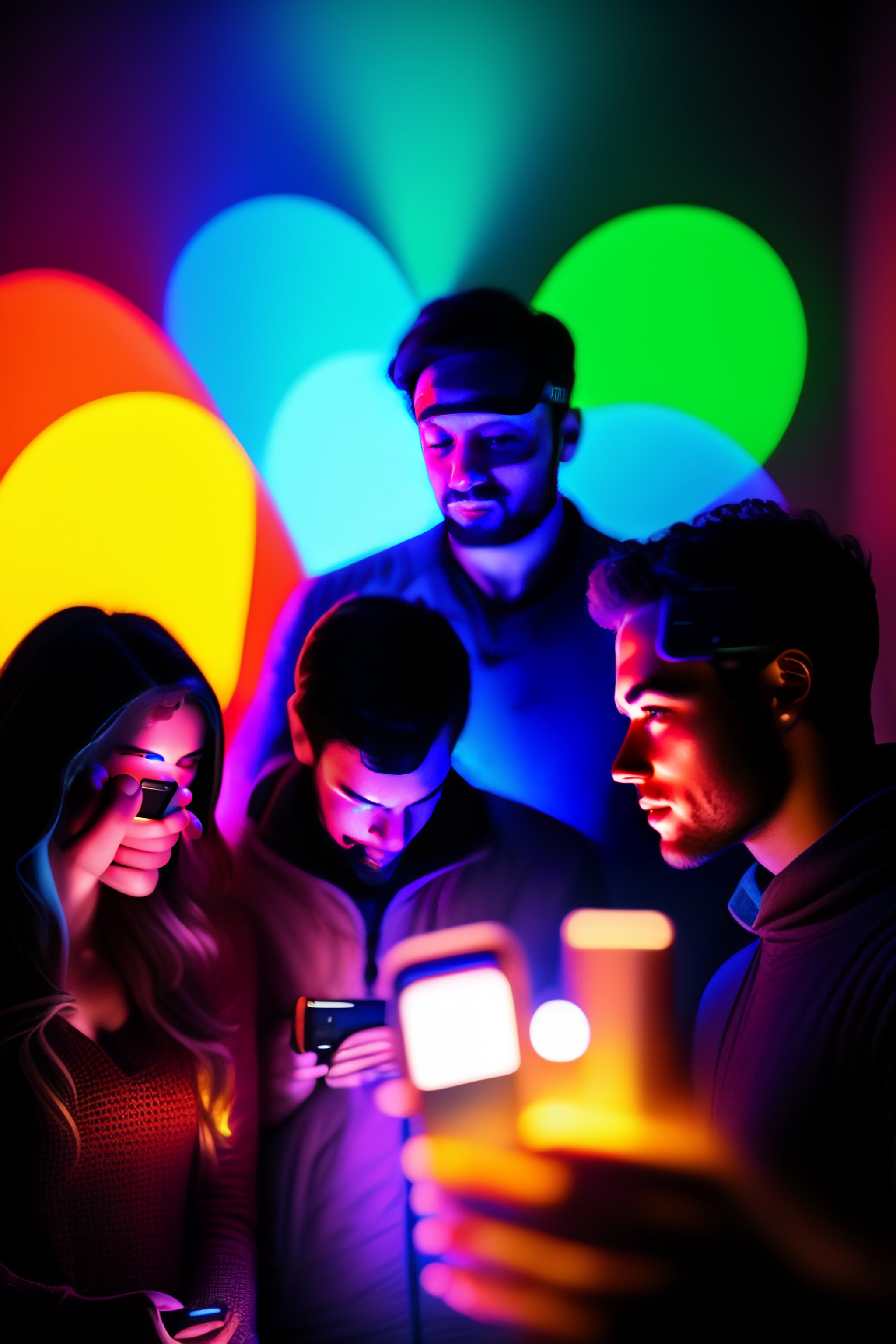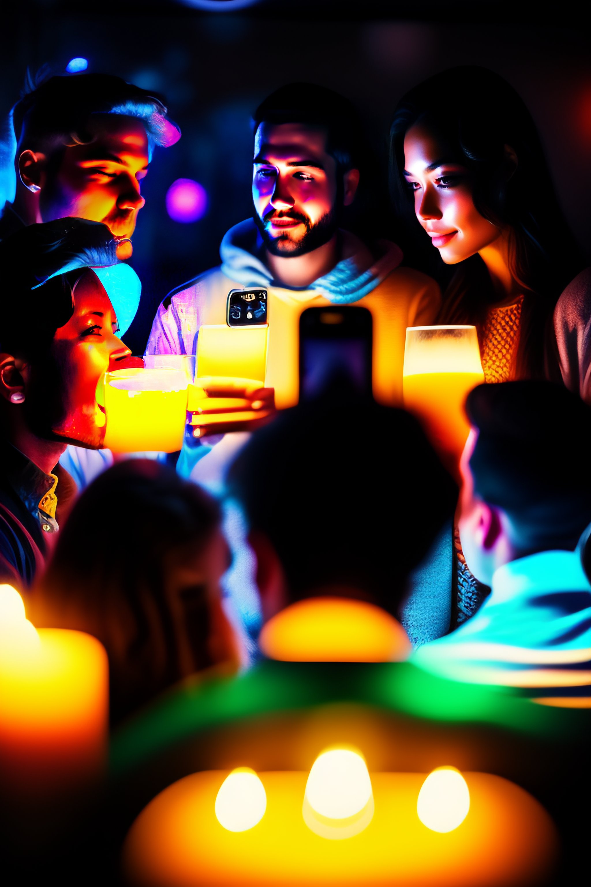 Gopro of group of people in a dark room, illuminated by the different color of screen of their smartphones. calm social setting. partecipating in a social game. talking, listening. picture taken with smartphone, iphone 12 camera, 4k, highly detailed, vibrant colors, contrasting