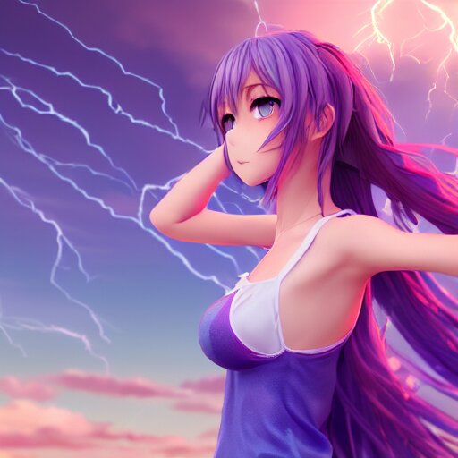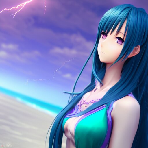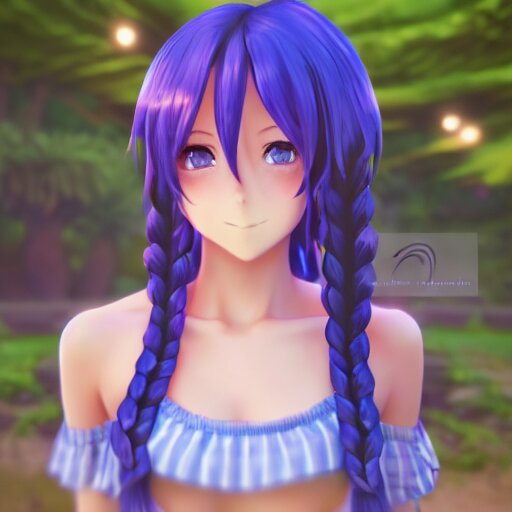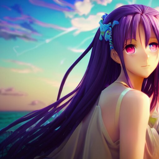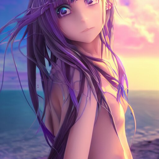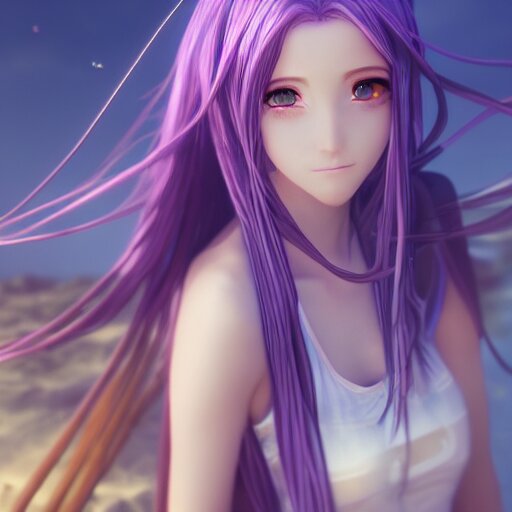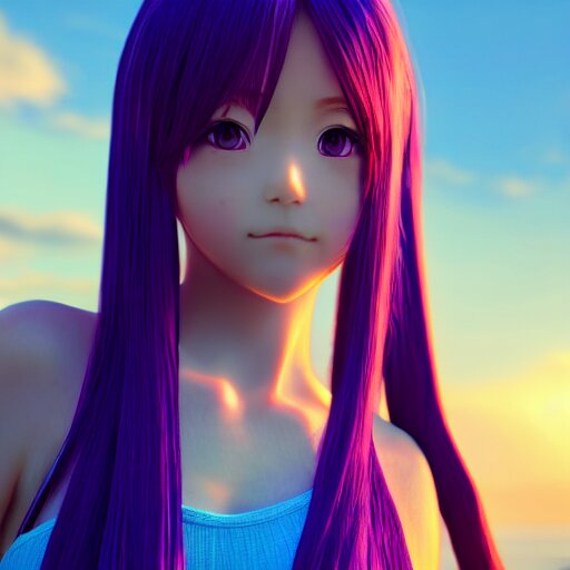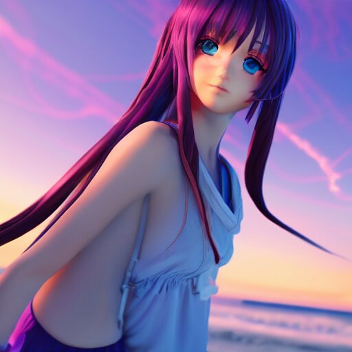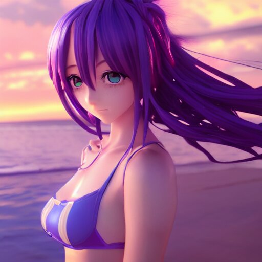 Render as a very beautiful 3d anime girl, long braided purple hair, azure blue eyes, full round face, short smile, casual clothes, serene beach setting, cinematic lightning, medium shot, mid-shot, highly detailed, trending on artstation, unreal engine 4k, cinematic wallpaper