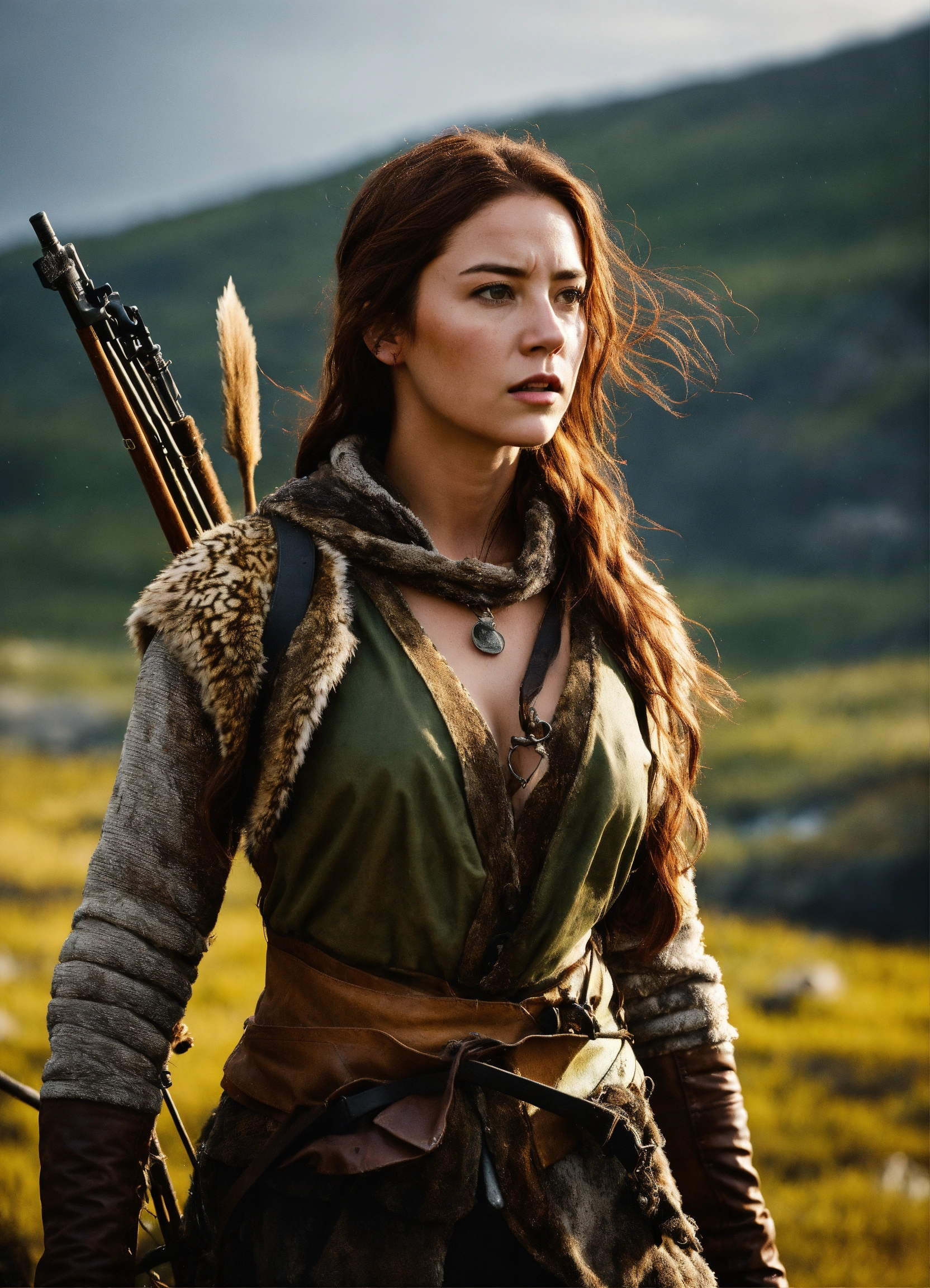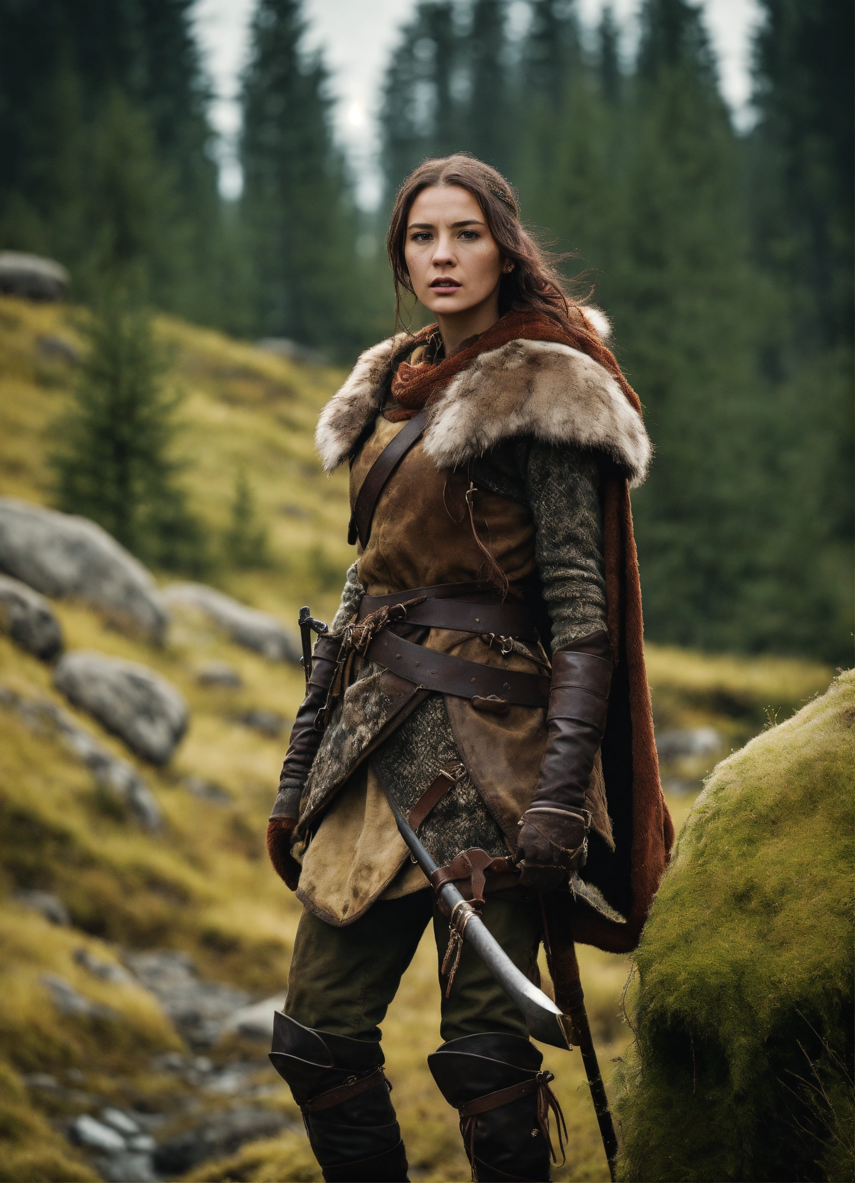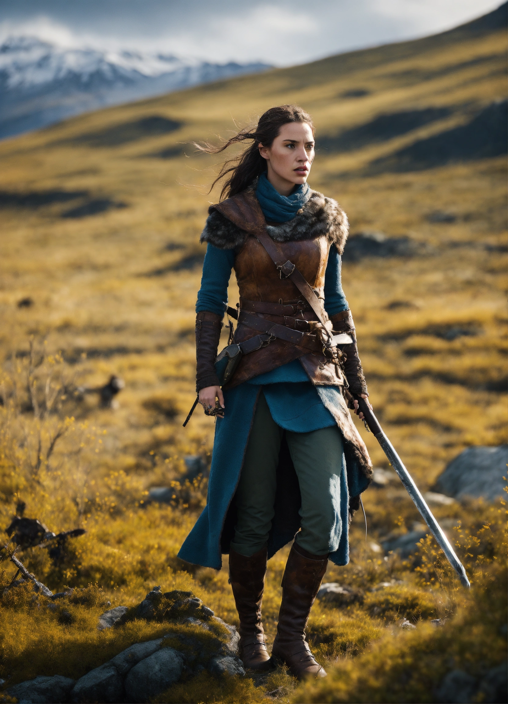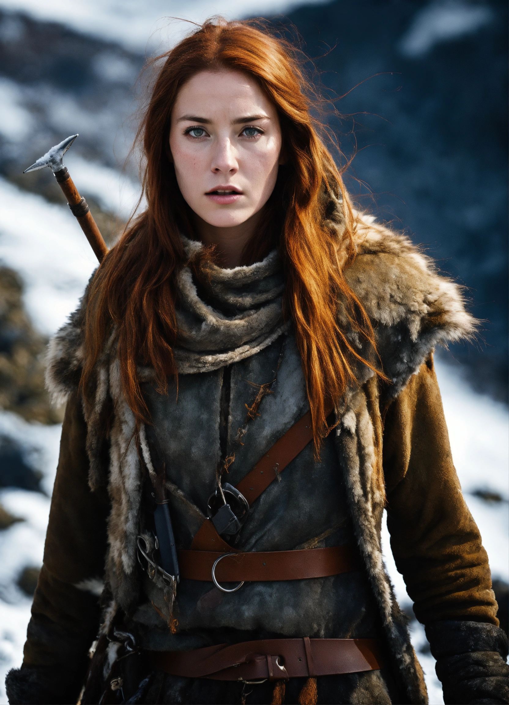 Characters alana, wild animals description alana's survival journey, reaching the wall era medieval fantasy. attire alana in survival mode. location the harsh northern landscape. action alana hunting and gathering. background a frigid and unforgiving wilderness. shot type tracking shots. style hyper-realistic, cinematography, photo-realistic, humans. aspect ratio 916