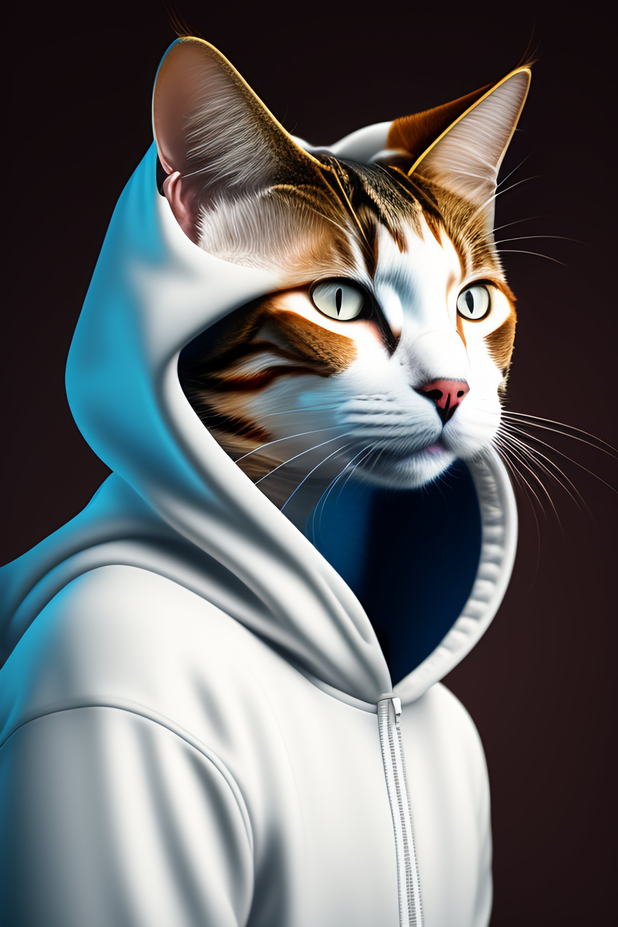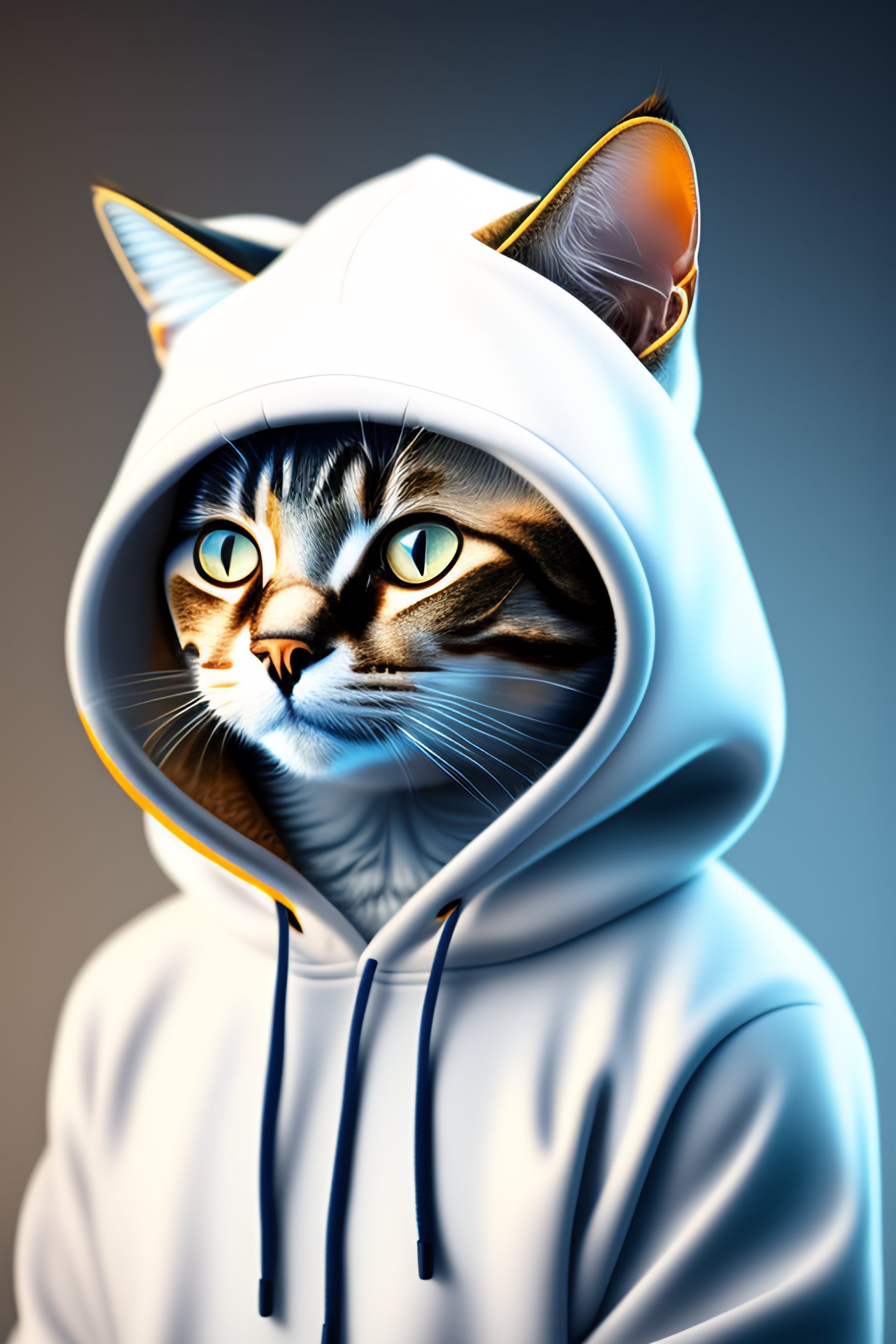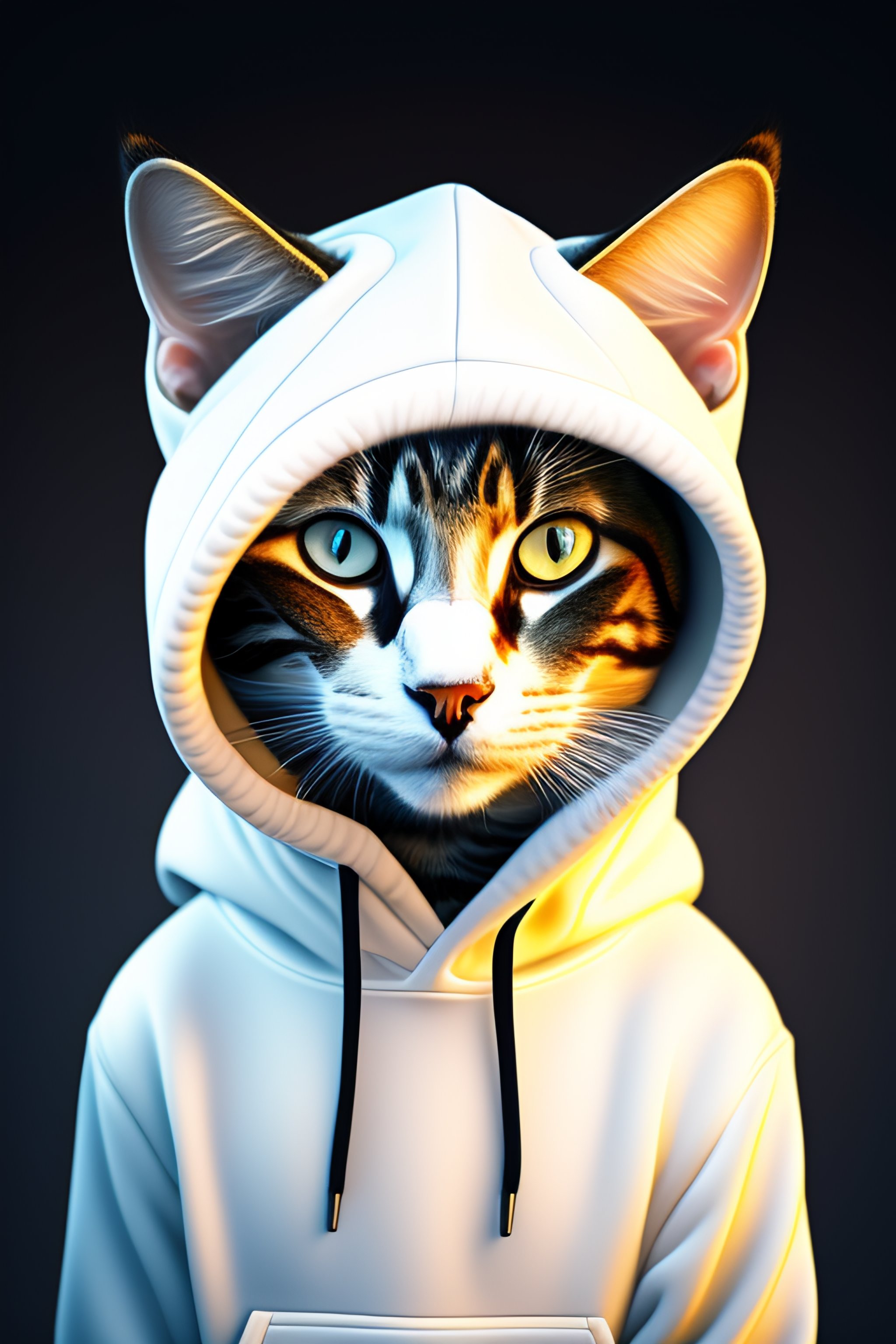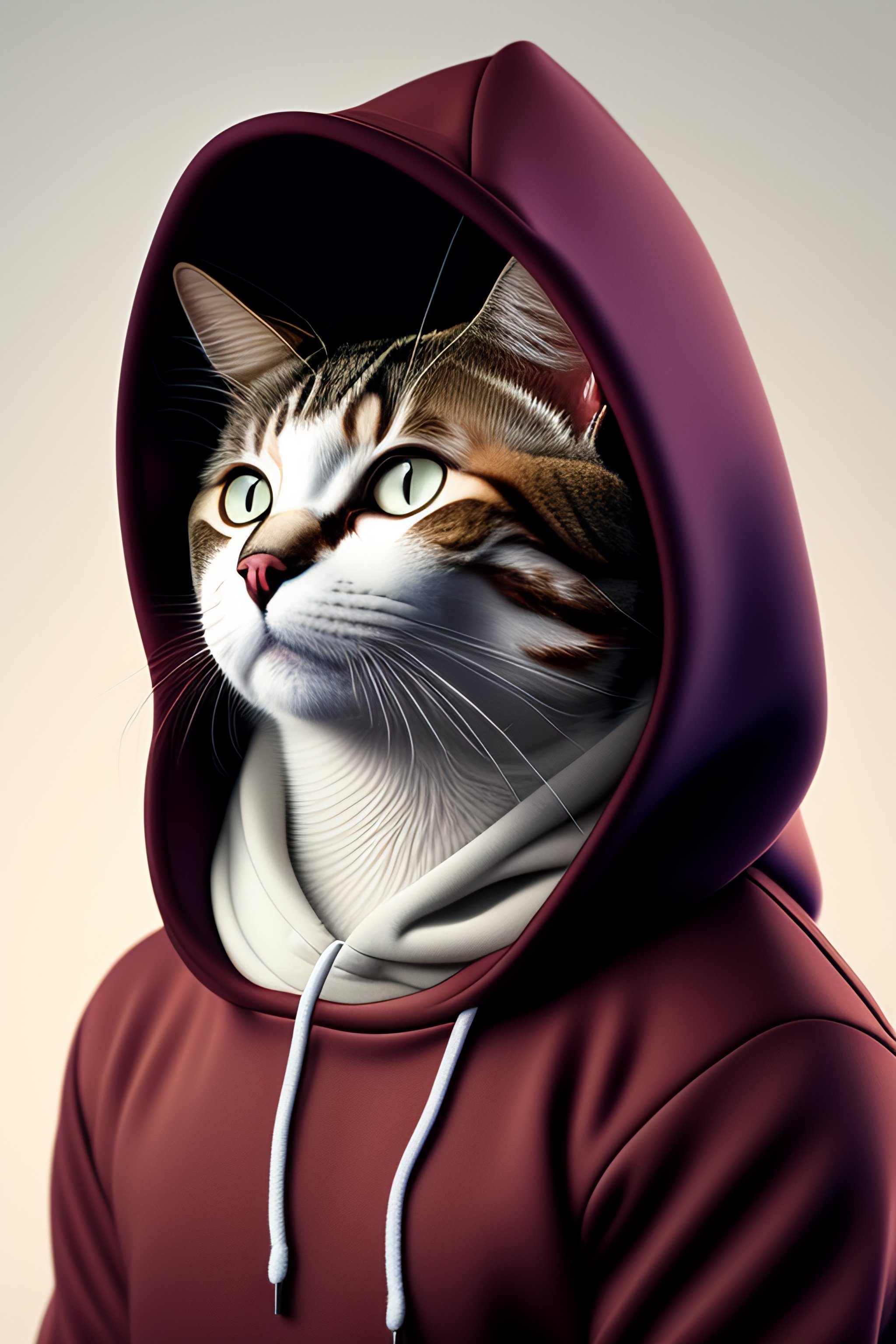 Cartoonic portait of cat wearing a hood and hoodie looking at me with focus