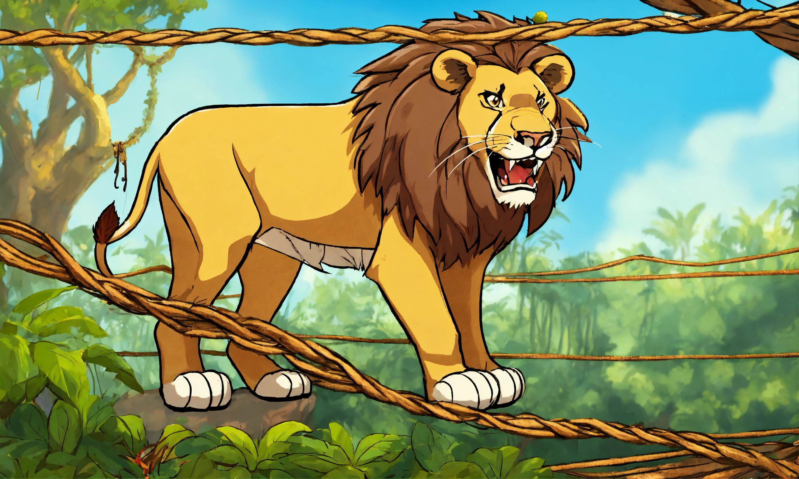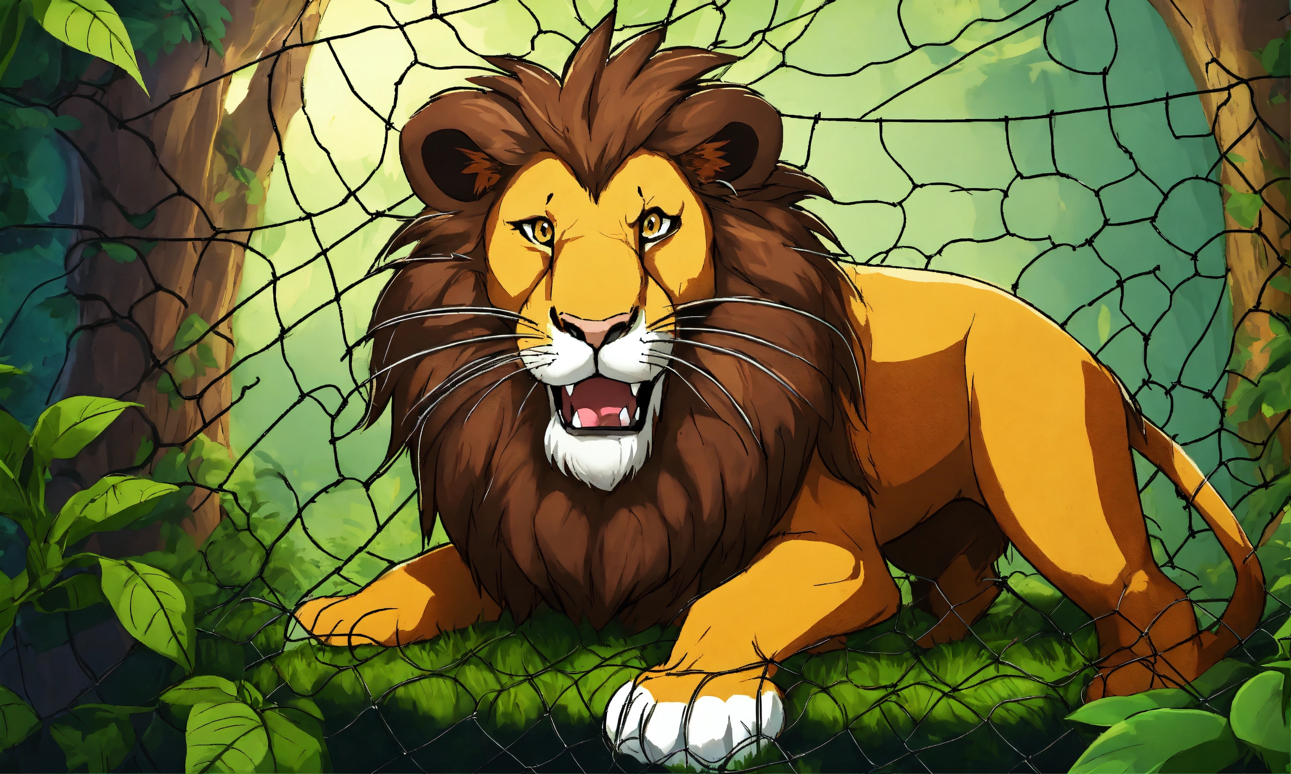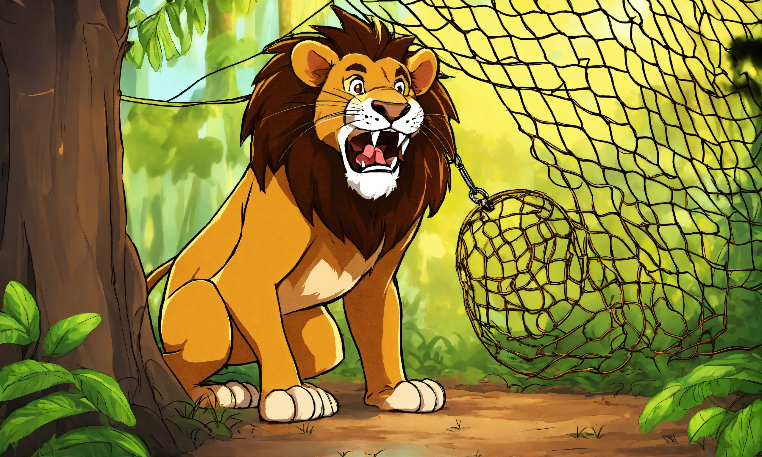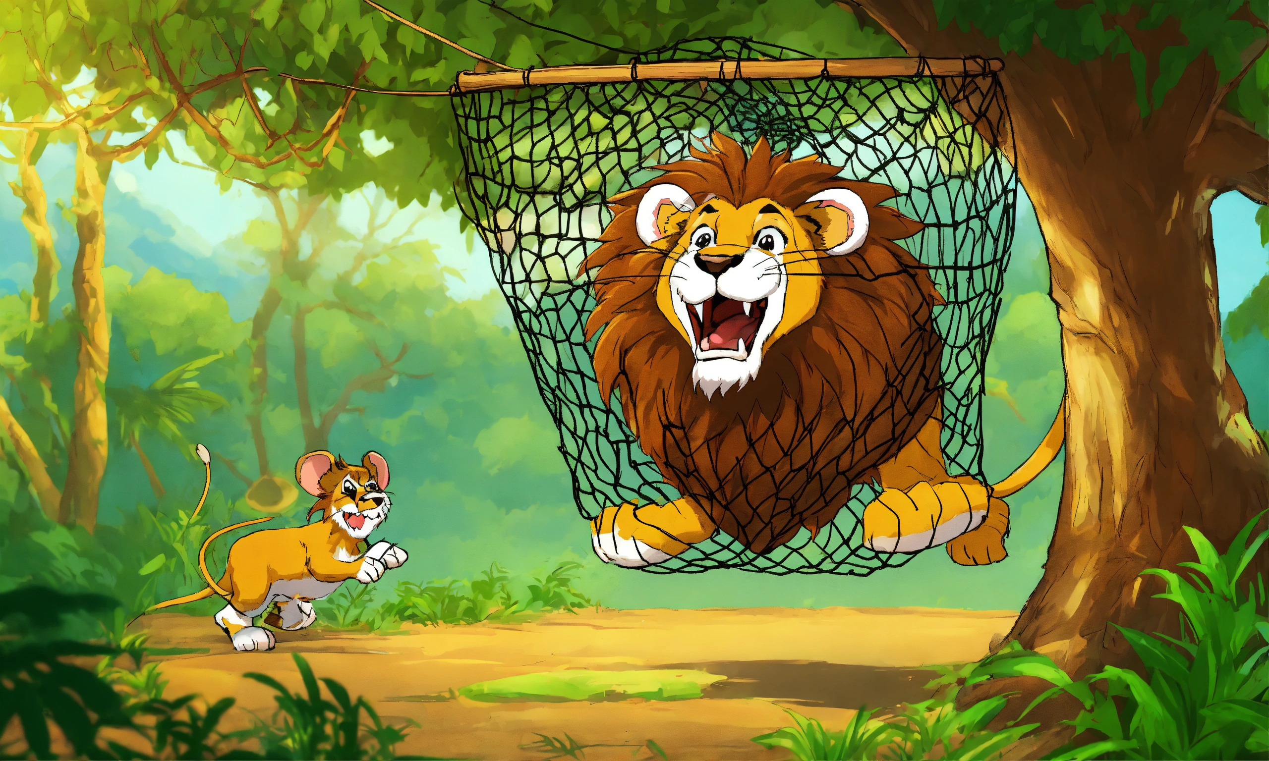 Cartoon big lion was captured and trapped in a net and hang to the tree and with mouse sharp teeth, the mouse nibbled through the net in jungle