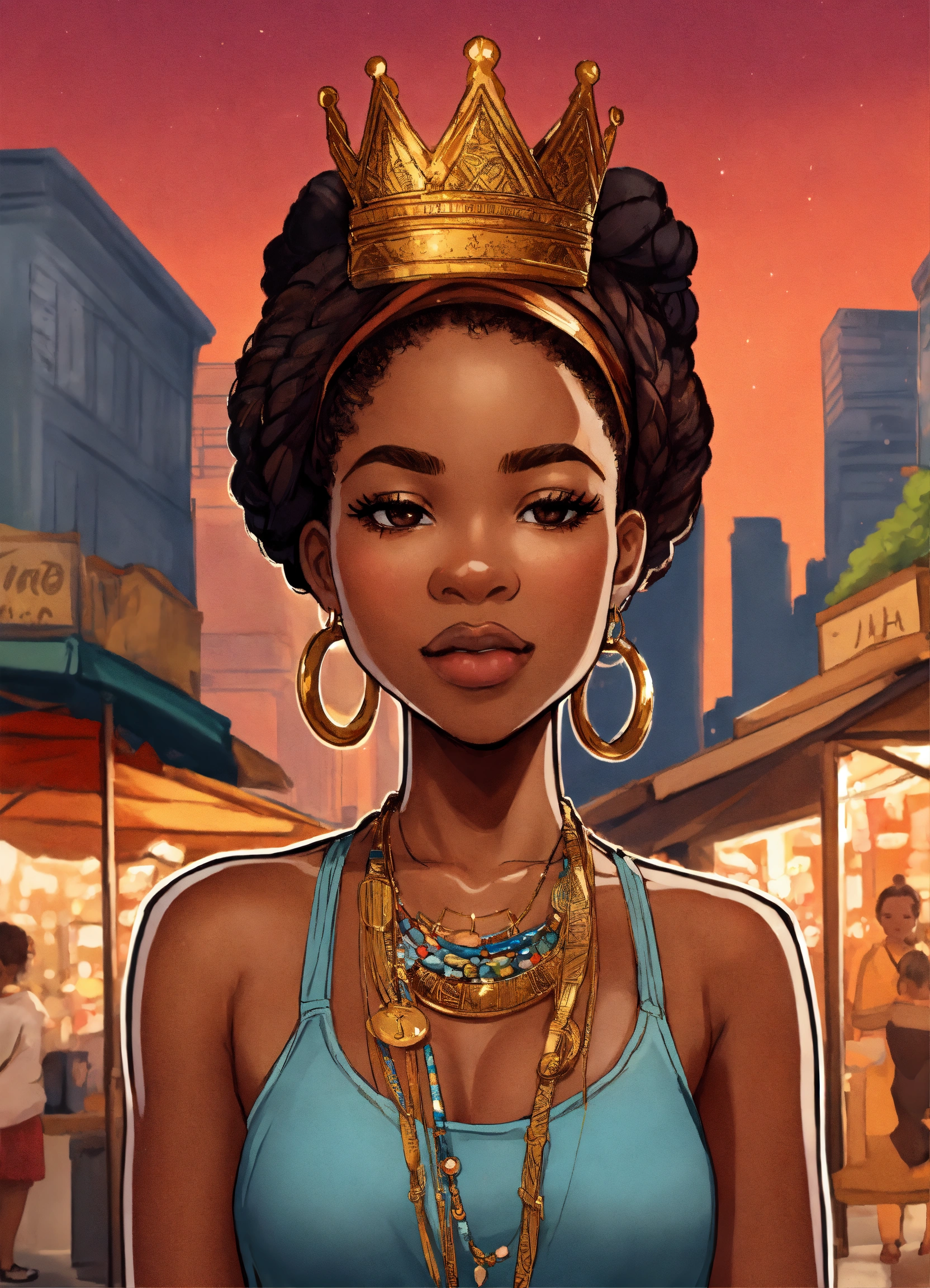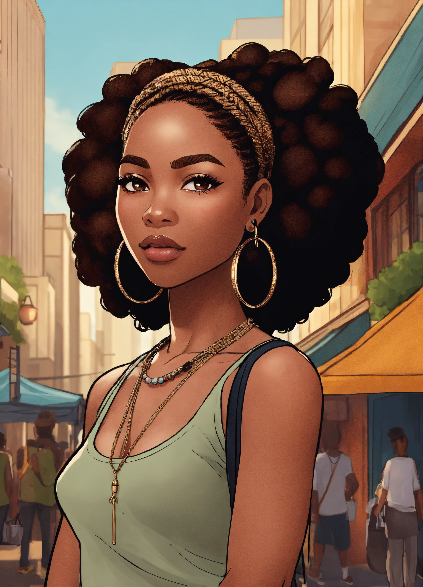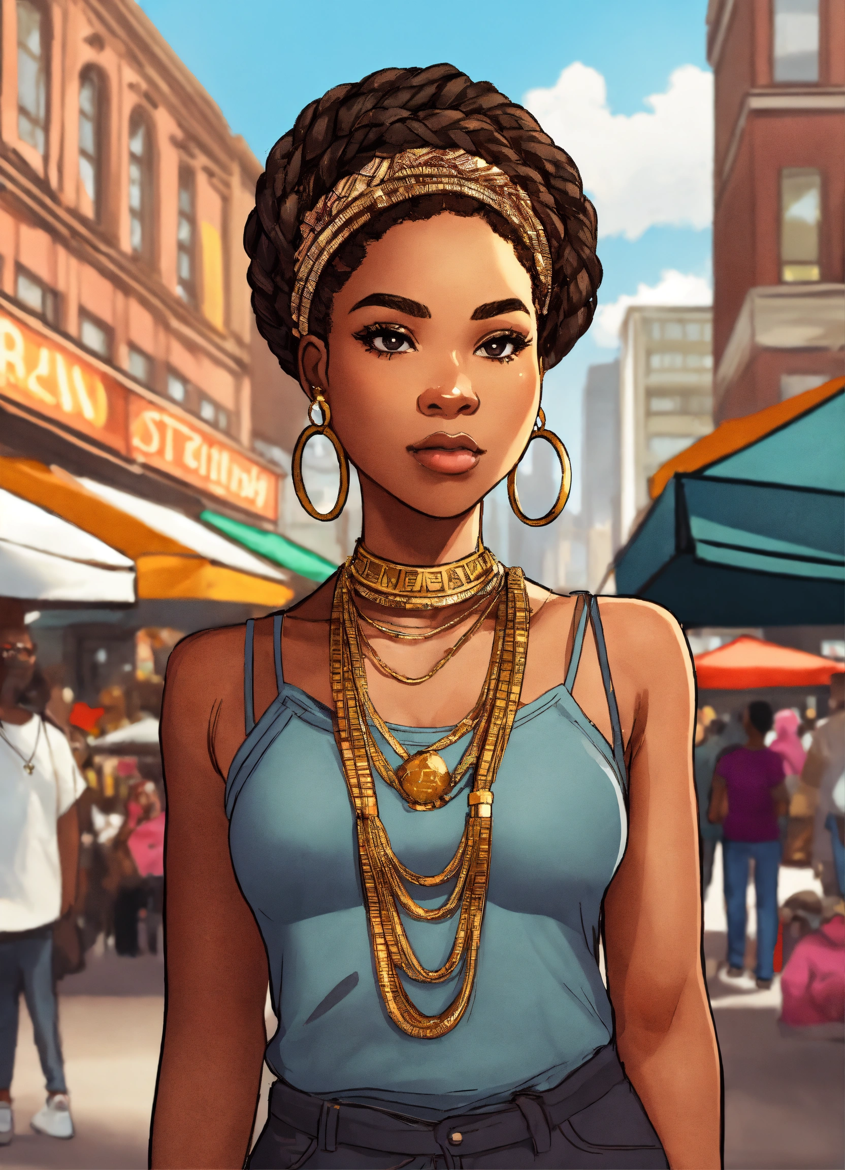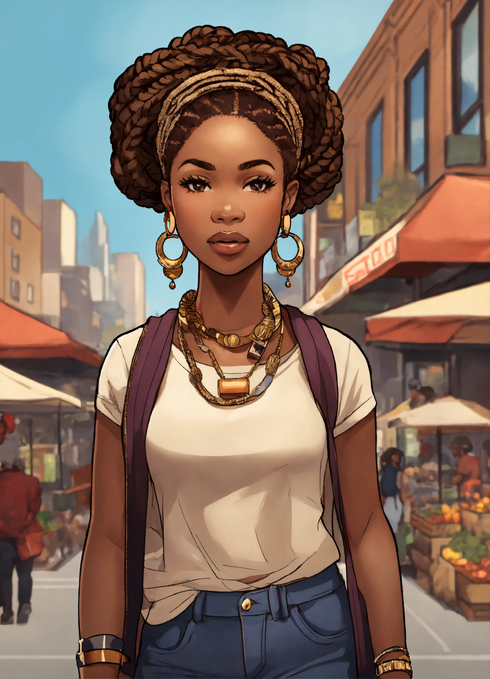 Digital illustration of a chibi-style african american woman with a braided crown, standing confidently against a backdrop of a bustling city street market. she wears her casual outfit, complemented by hoop earrings and a necklace.