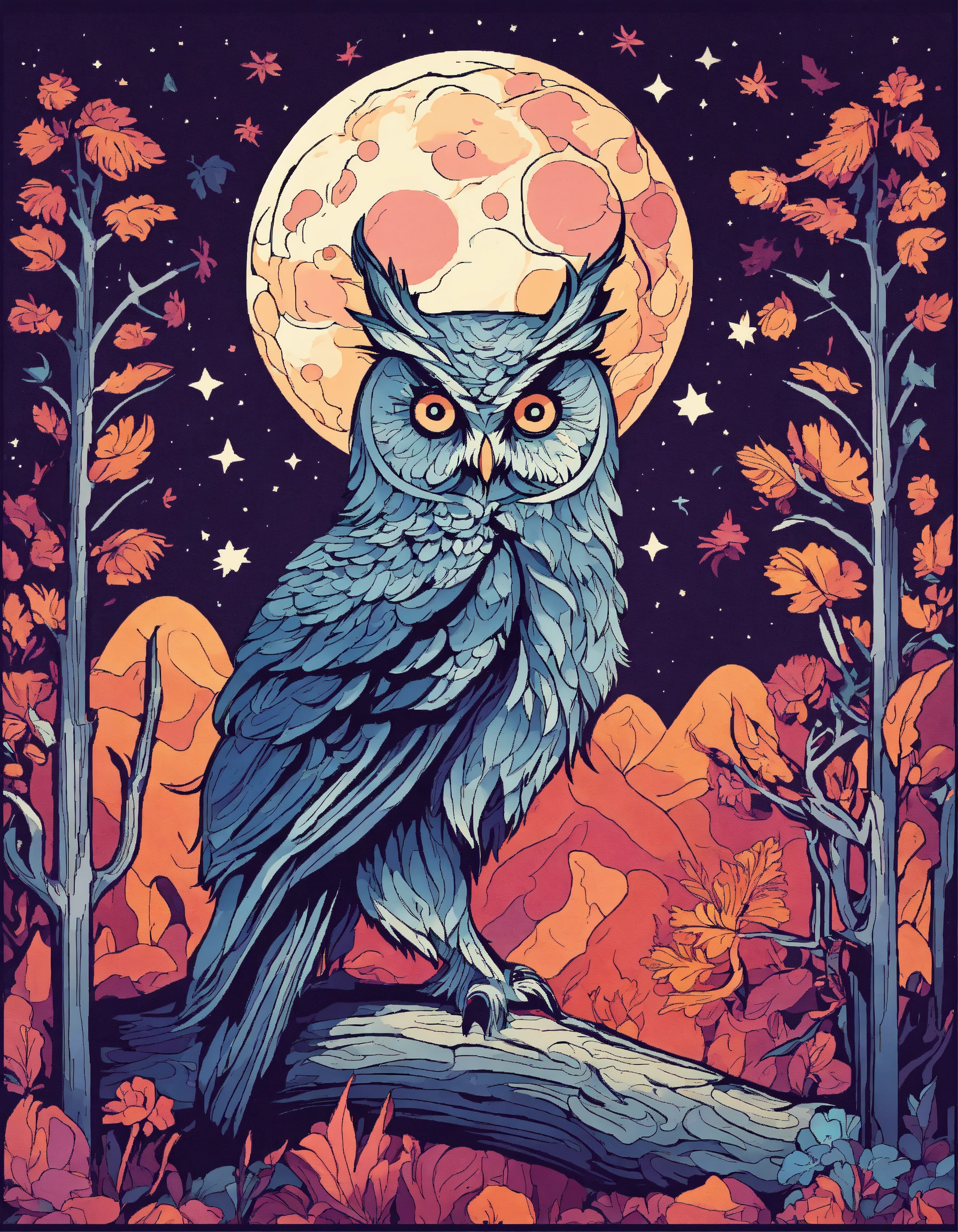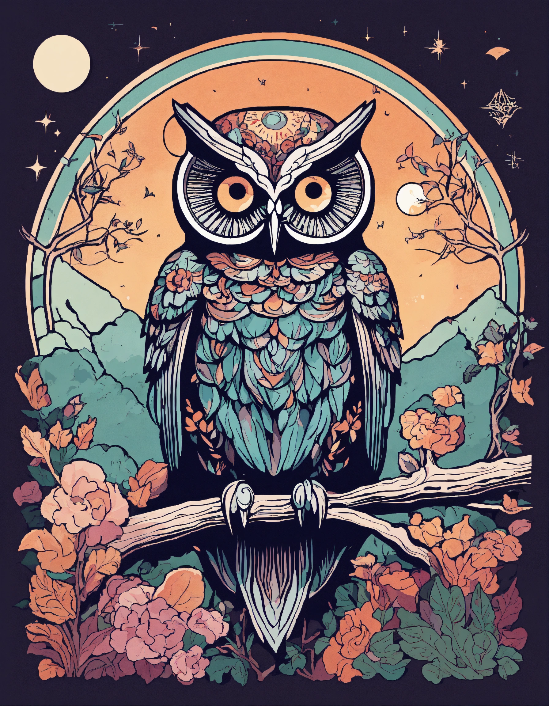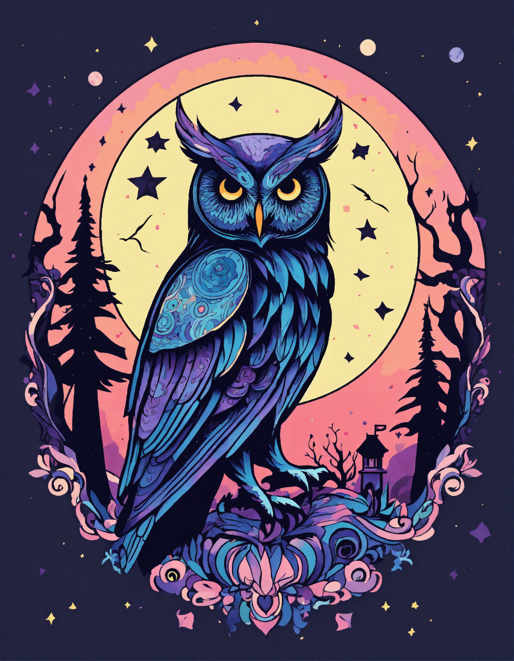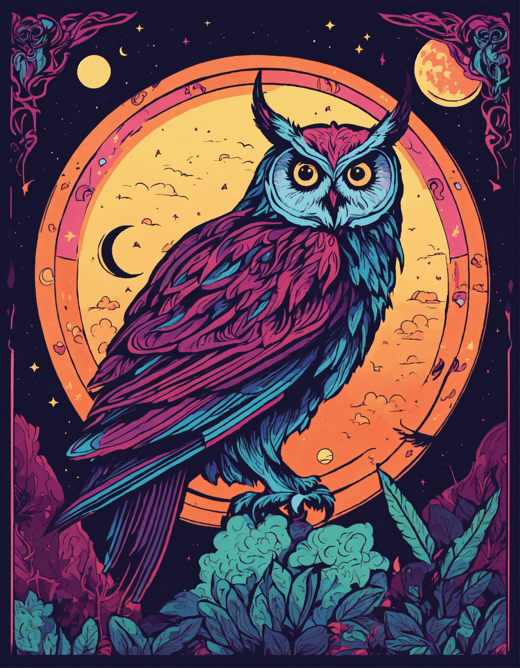 Witch club psychedelic illustration art, die-cut sticker, paper cut, magazine illustration, highly detailed, simple, smooth and clean vector curve, no jagged lines, vector art, moon behind owl, no backround