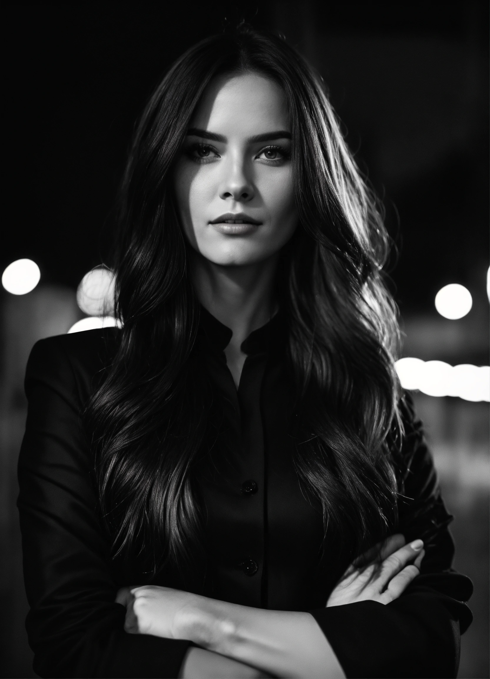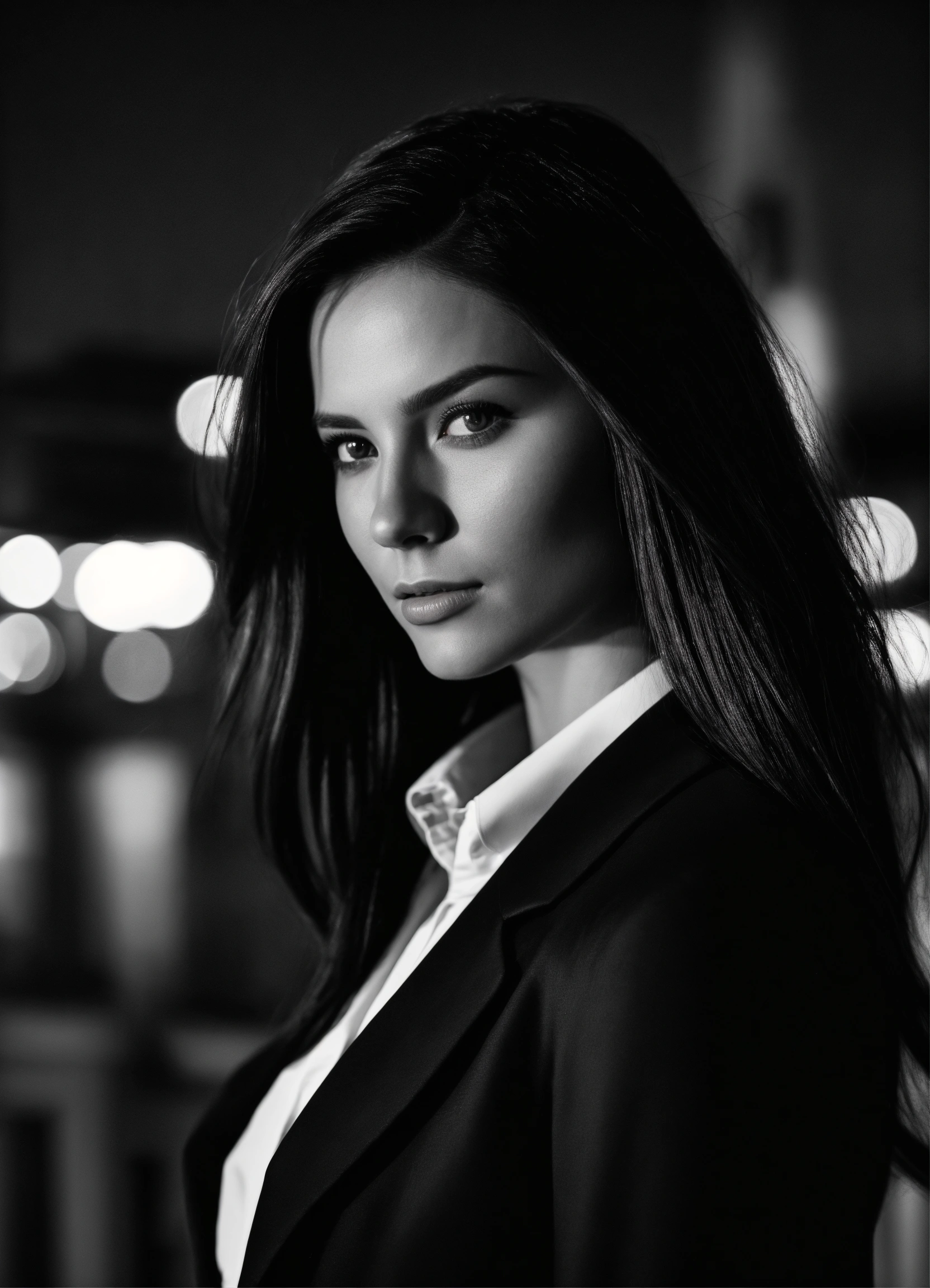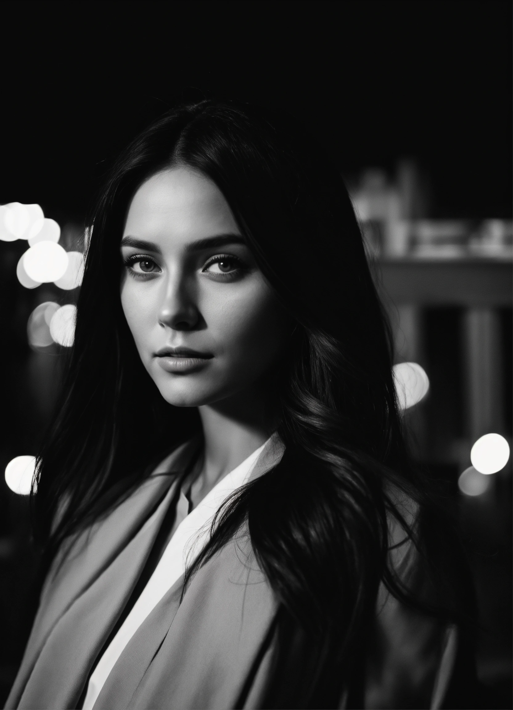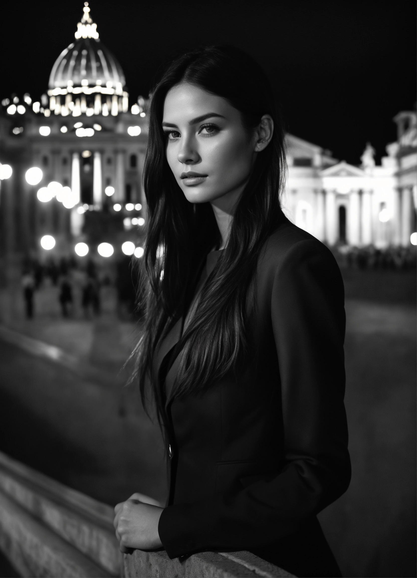 Photo of model women long dark hair, black and white, realistic, portrait, not painted, very detailed faces, skin with pores, 4k, dark suit, skin not smoothed, looking into the camera, dark shirt. vatican in rome in full view at night as background