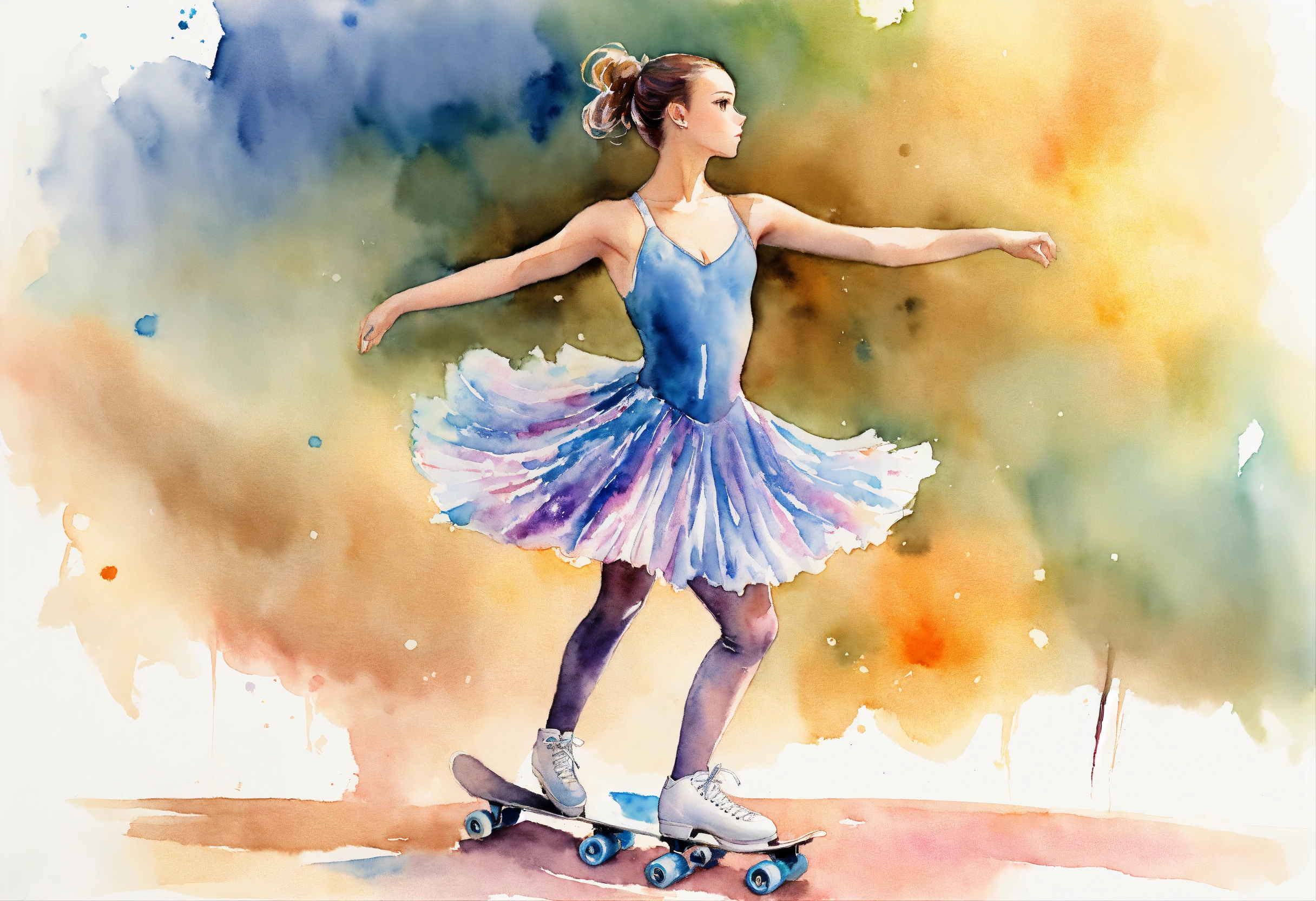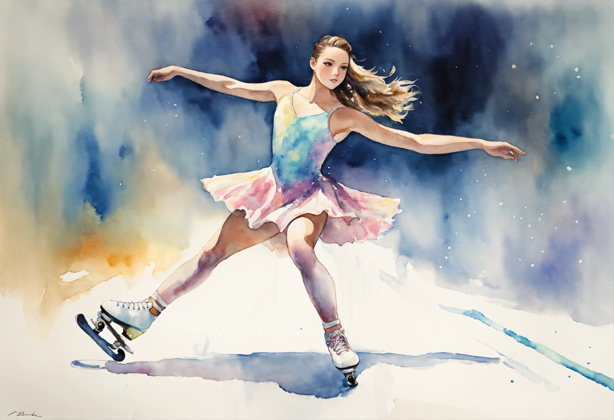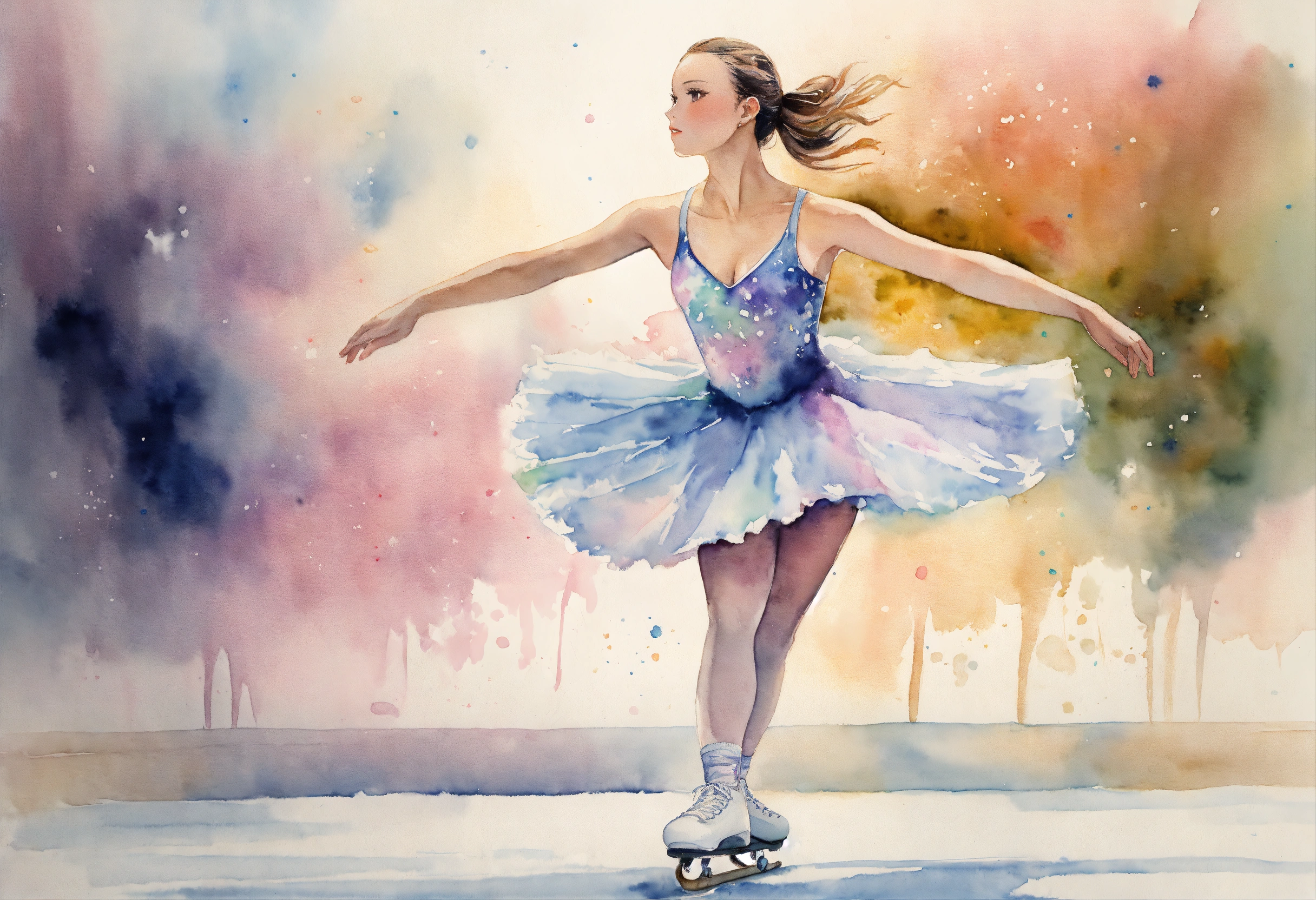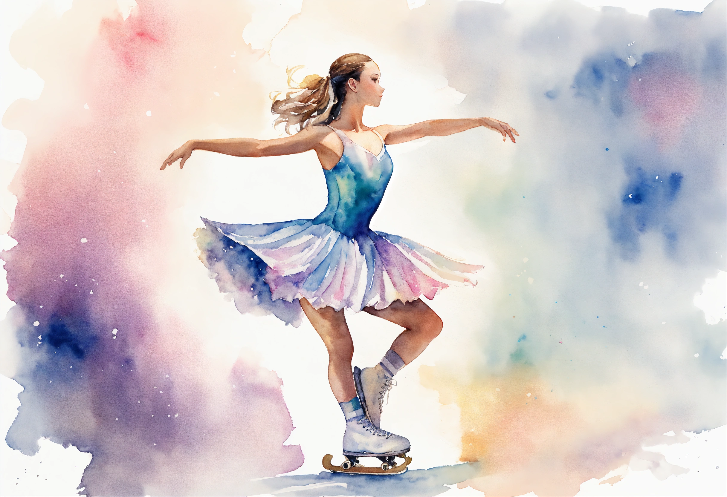 Full body watercolor of a young female figure skater wearing a detailed skate dress, soft pastel colors, wide angle