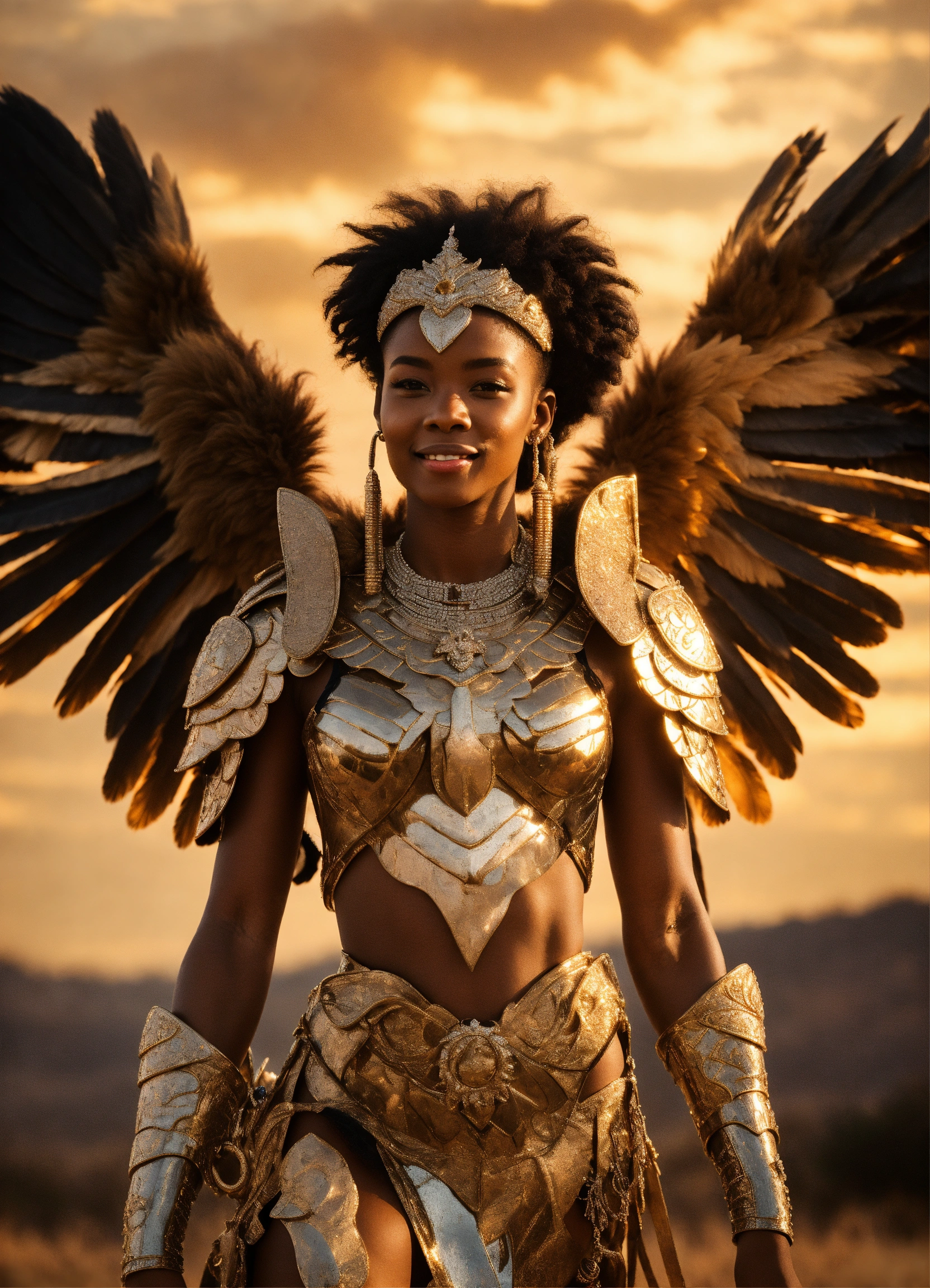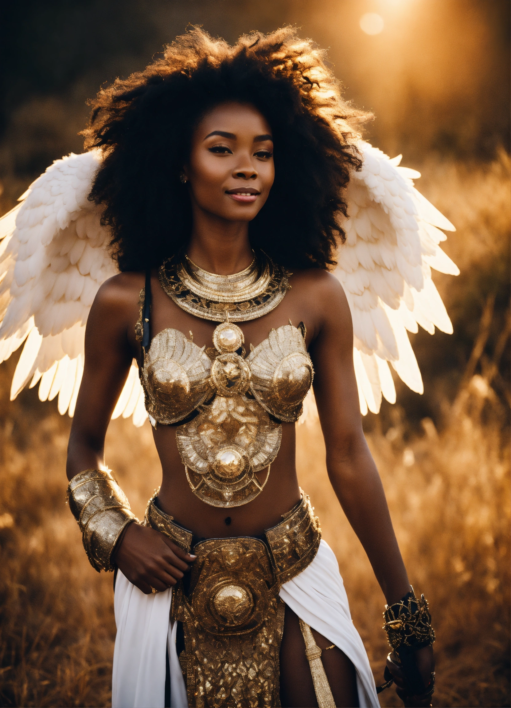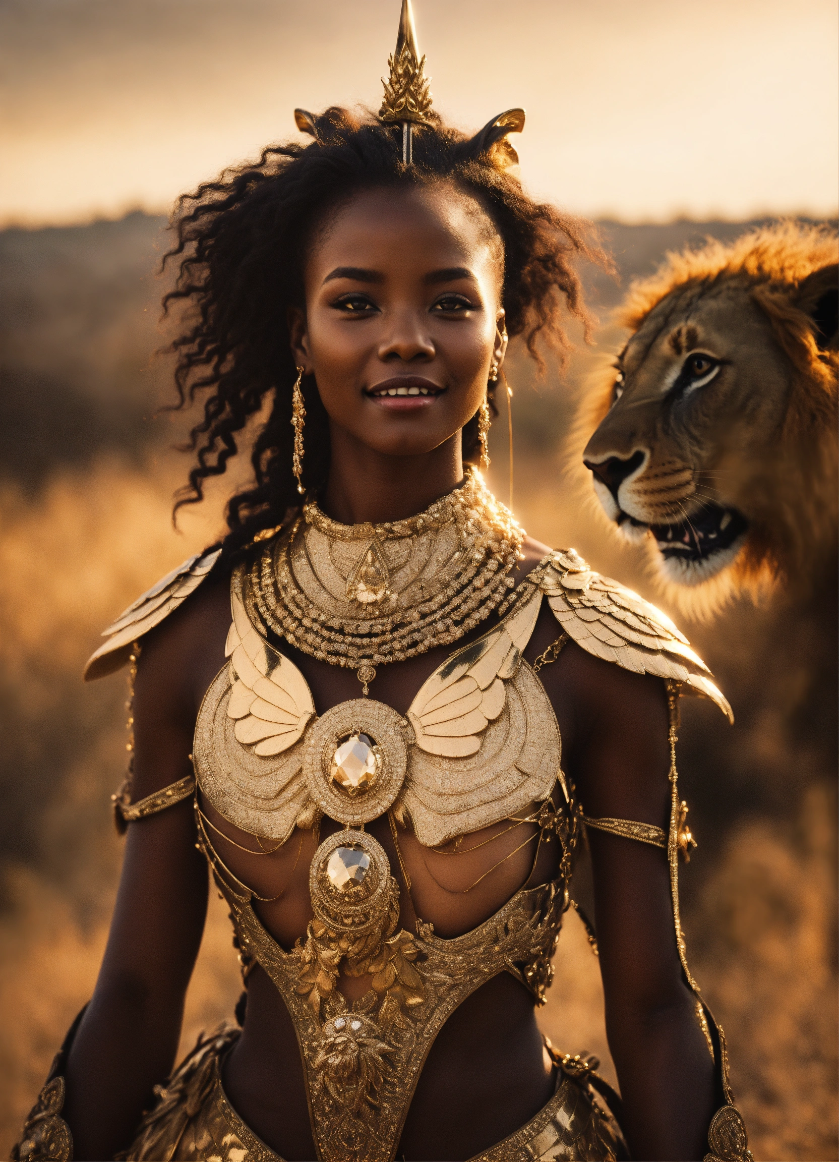 Stunning iconic photo of 25 year old feminine very thin supermodel black female joyous archangel with massive full white angel wings attached to her back, protecting a majestic lion, very high cheekbones, smiling and staring intensely directly into camera at me while guarding a majestic lion, holding an african spear, long black hair with soft curls, eyes centred on me, wearing futuristic diamond-encrusted warrior armour, tastefully dressed, symmetrical, protective, fierce, fantasy photoshoot, background is gorgeous african landscape with a lion, the air filled with heaven-lit sparkles everywhere. film grain.