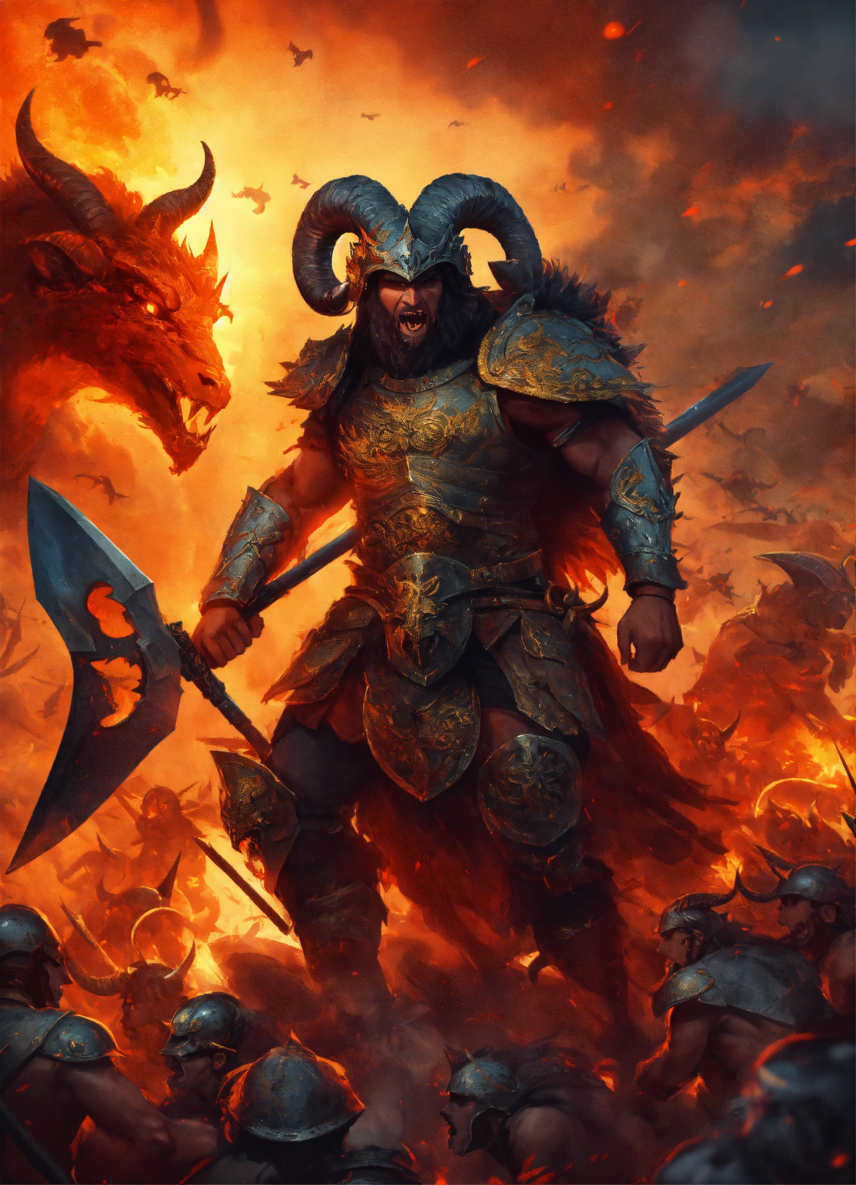 A monster warrior with the head of a ram, leading an army of demons to war, war scene, chaos and destruction, heavy fighting