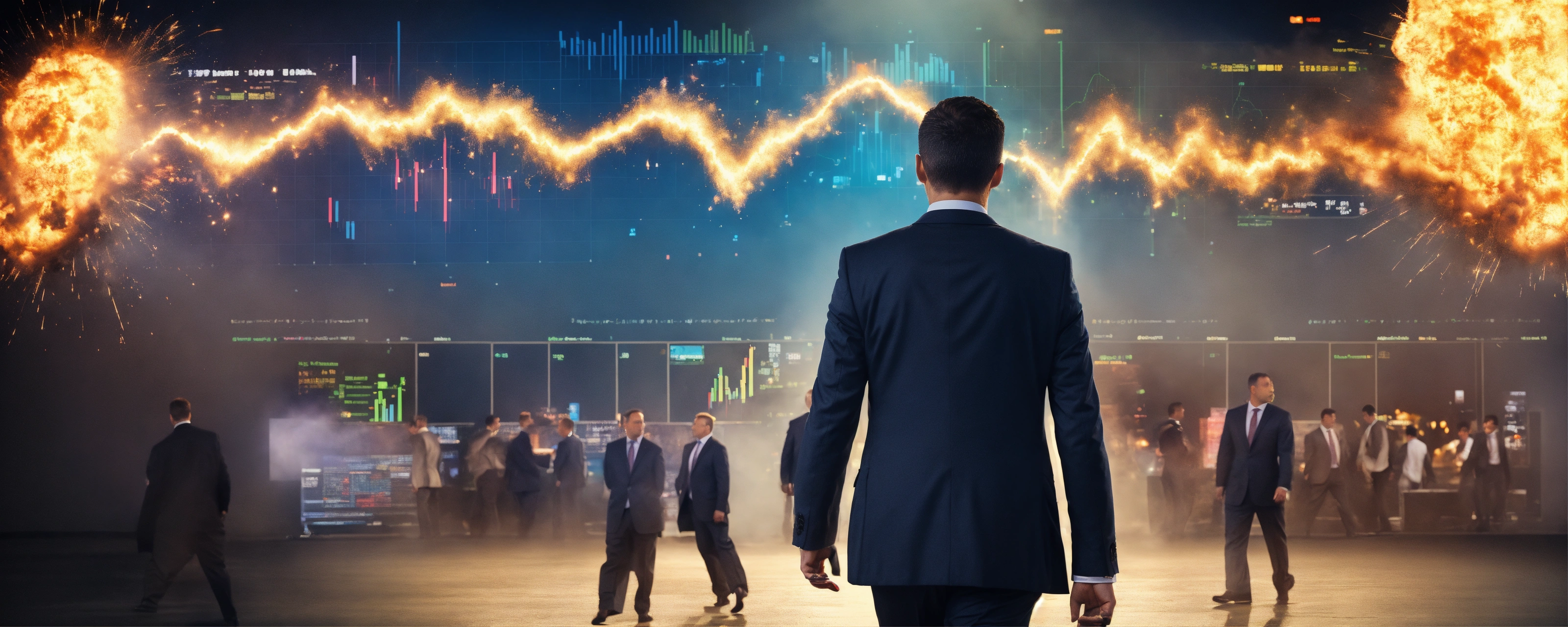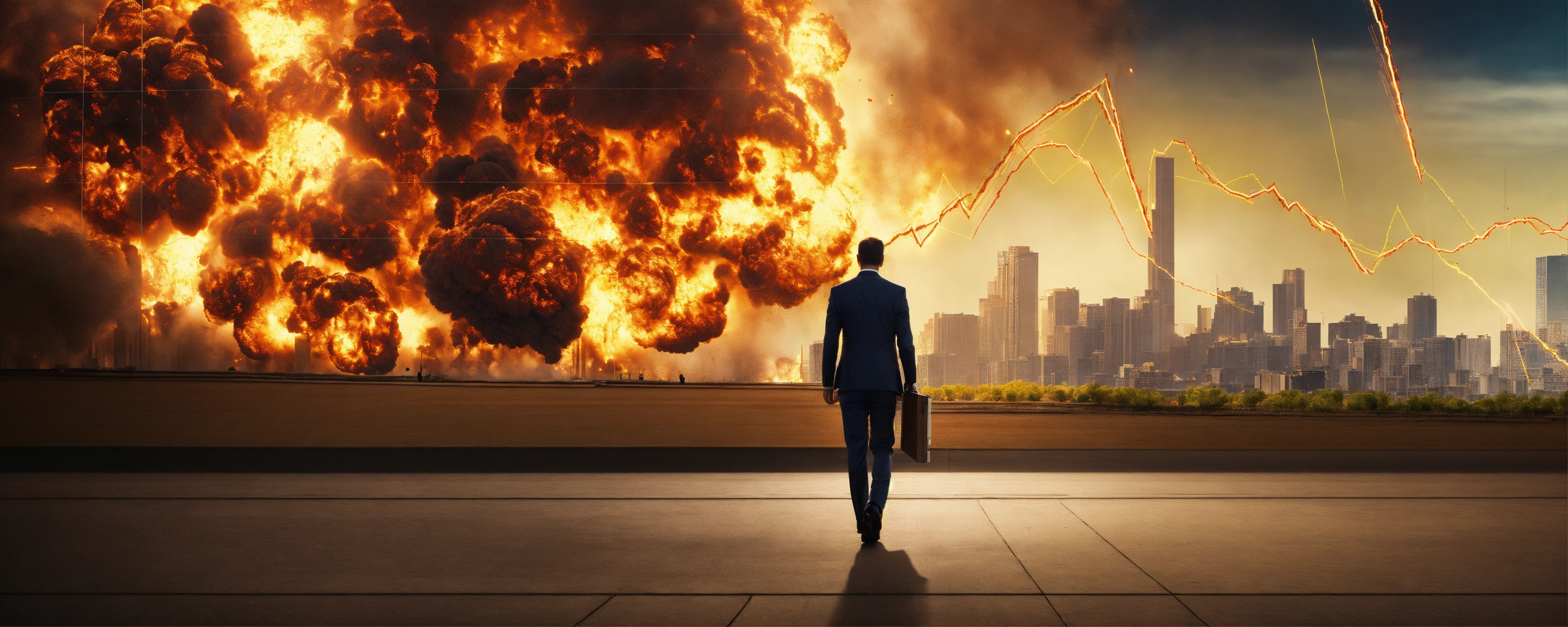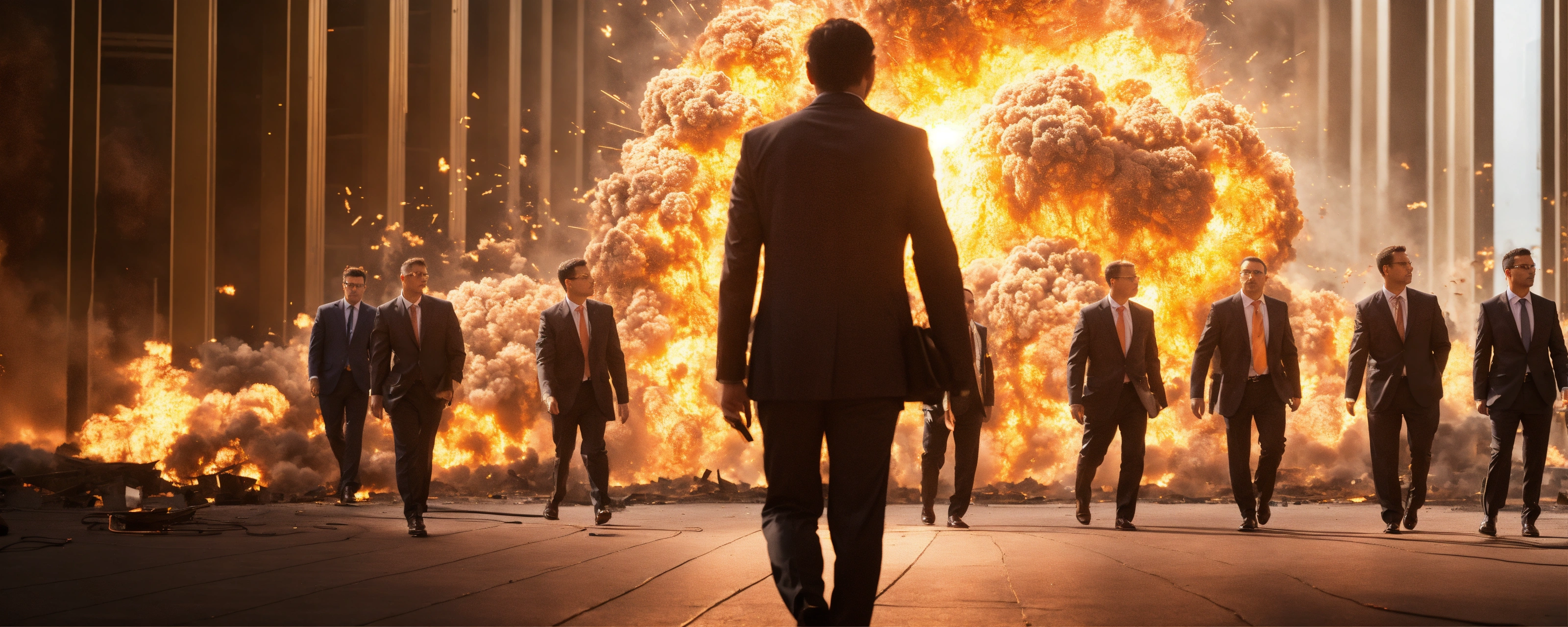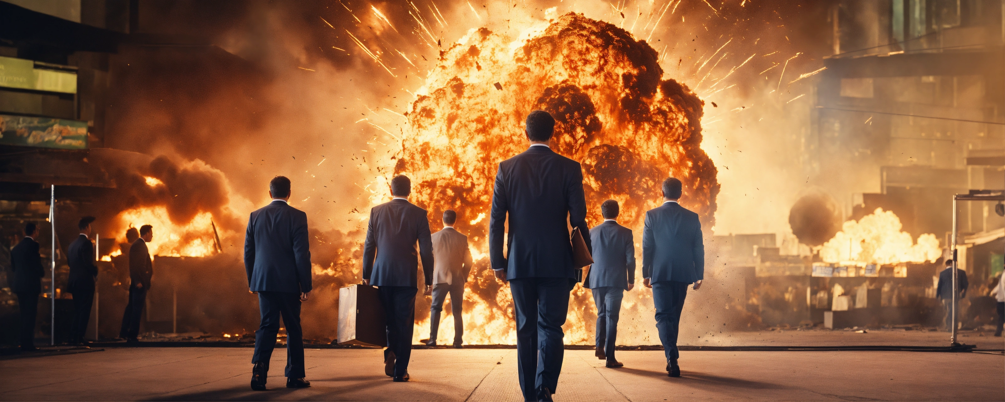 5 business man facing forward walking away behind an explosion and at the background is a in a peak of a market chart