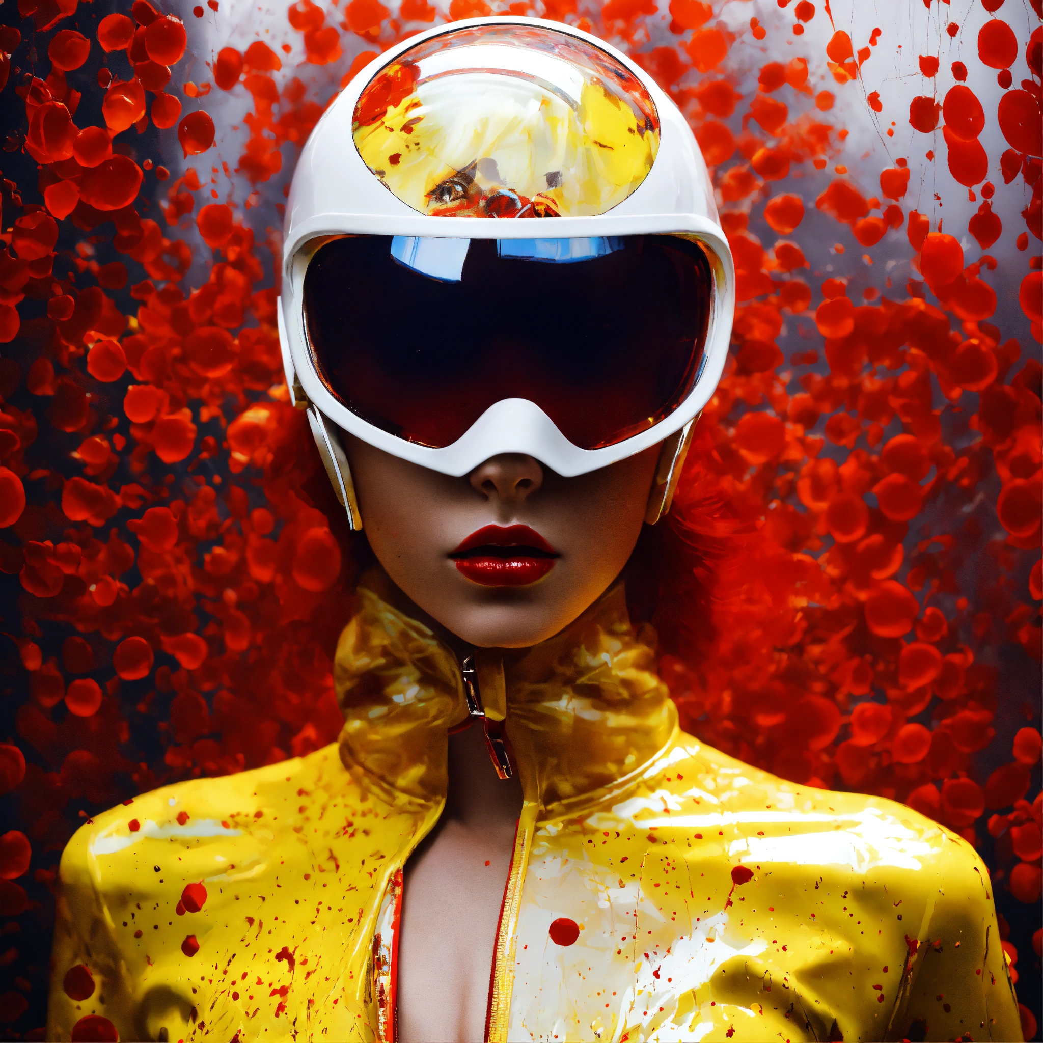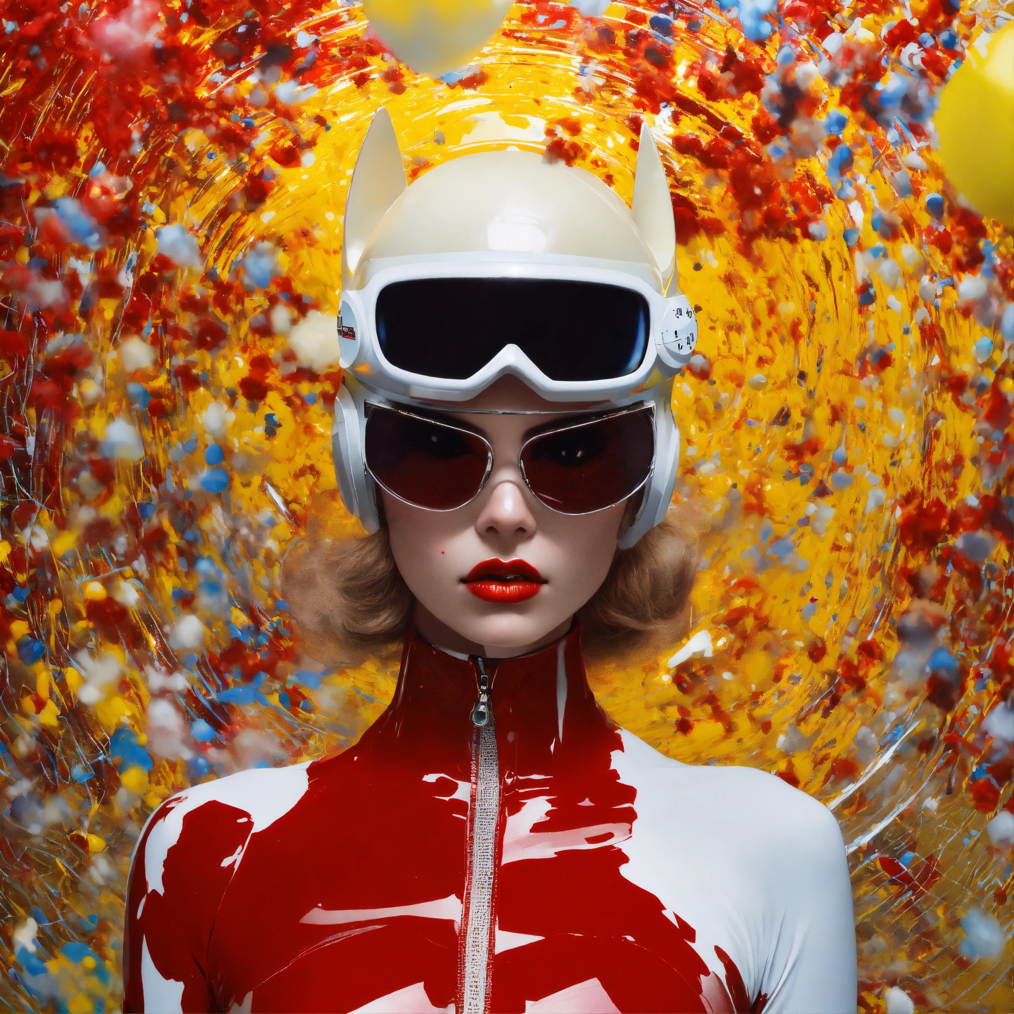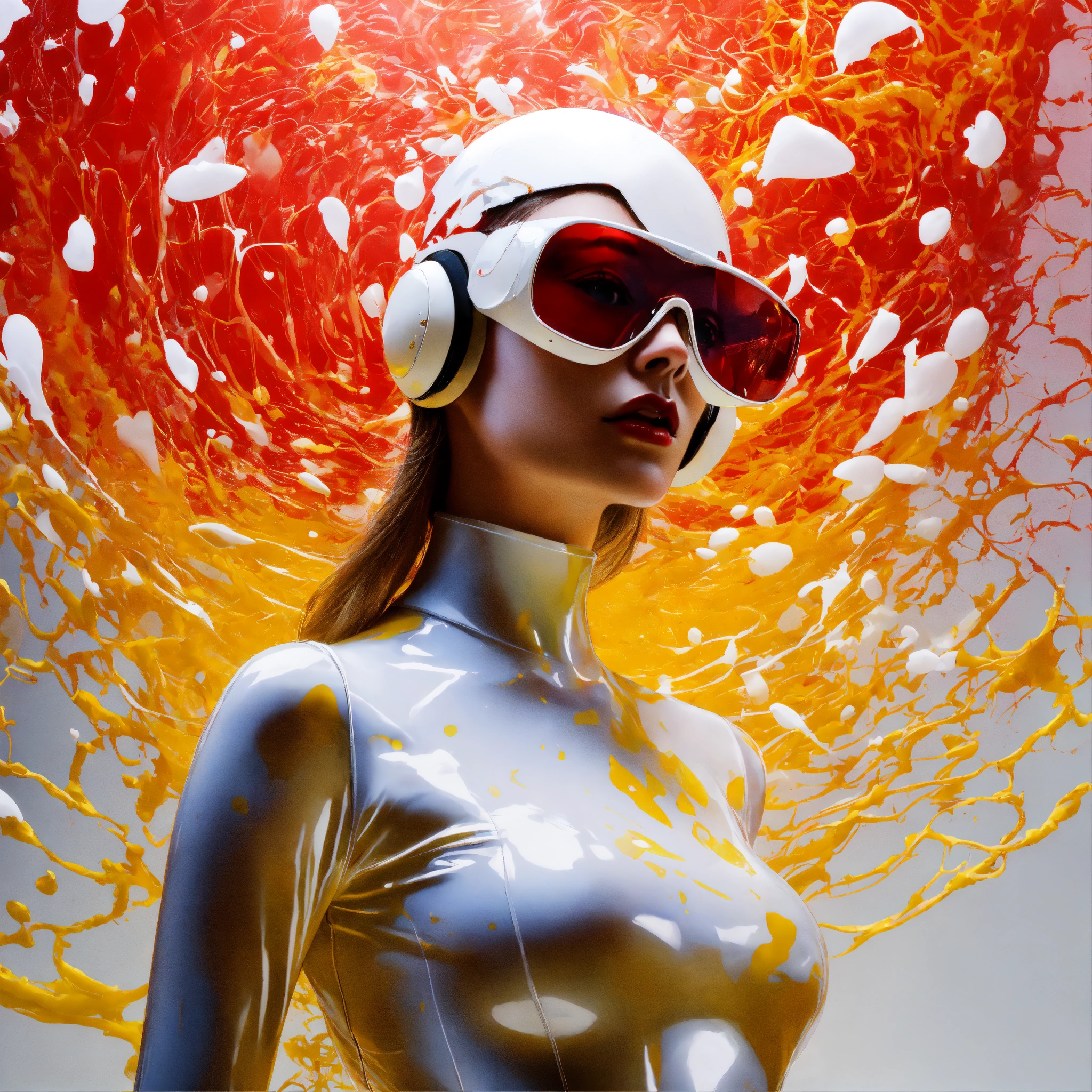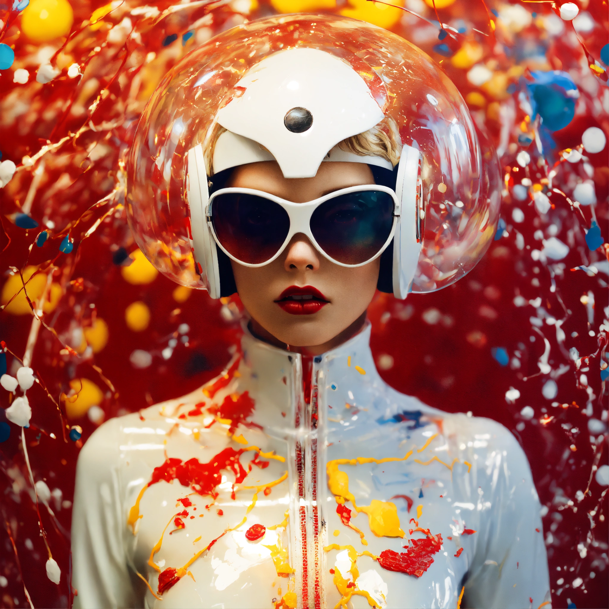 Deflagration of 60's vintage, white, red, and yellow photography, a hi tech sci-fi fashion model woman, with her cat woman plexiglass helmet and sunglasses in a plexiglass bodysuit, emerges from spiral white ink splatters, 80 degree view, art by sergio lopez, natalie shau, james jean and salvador dali