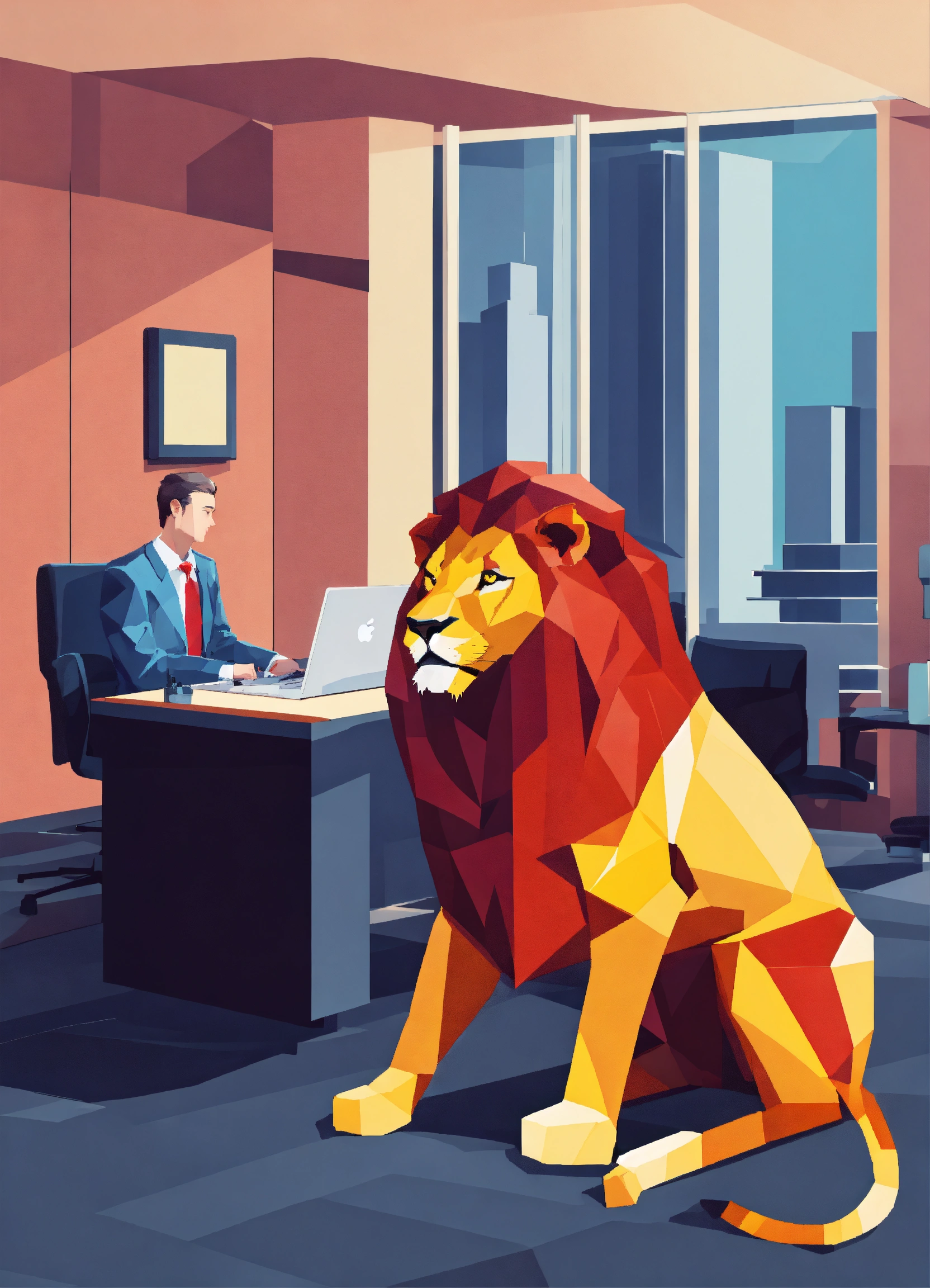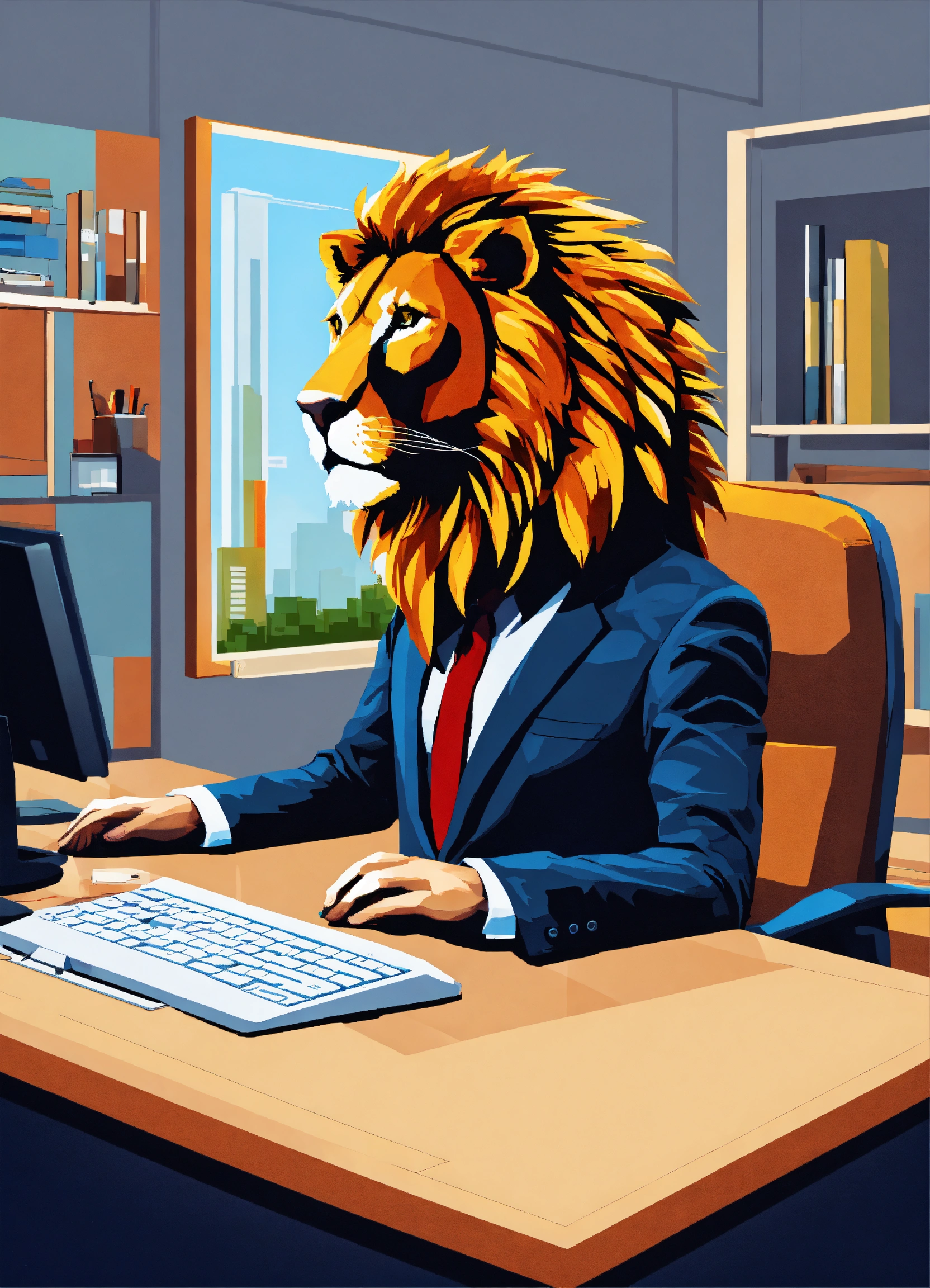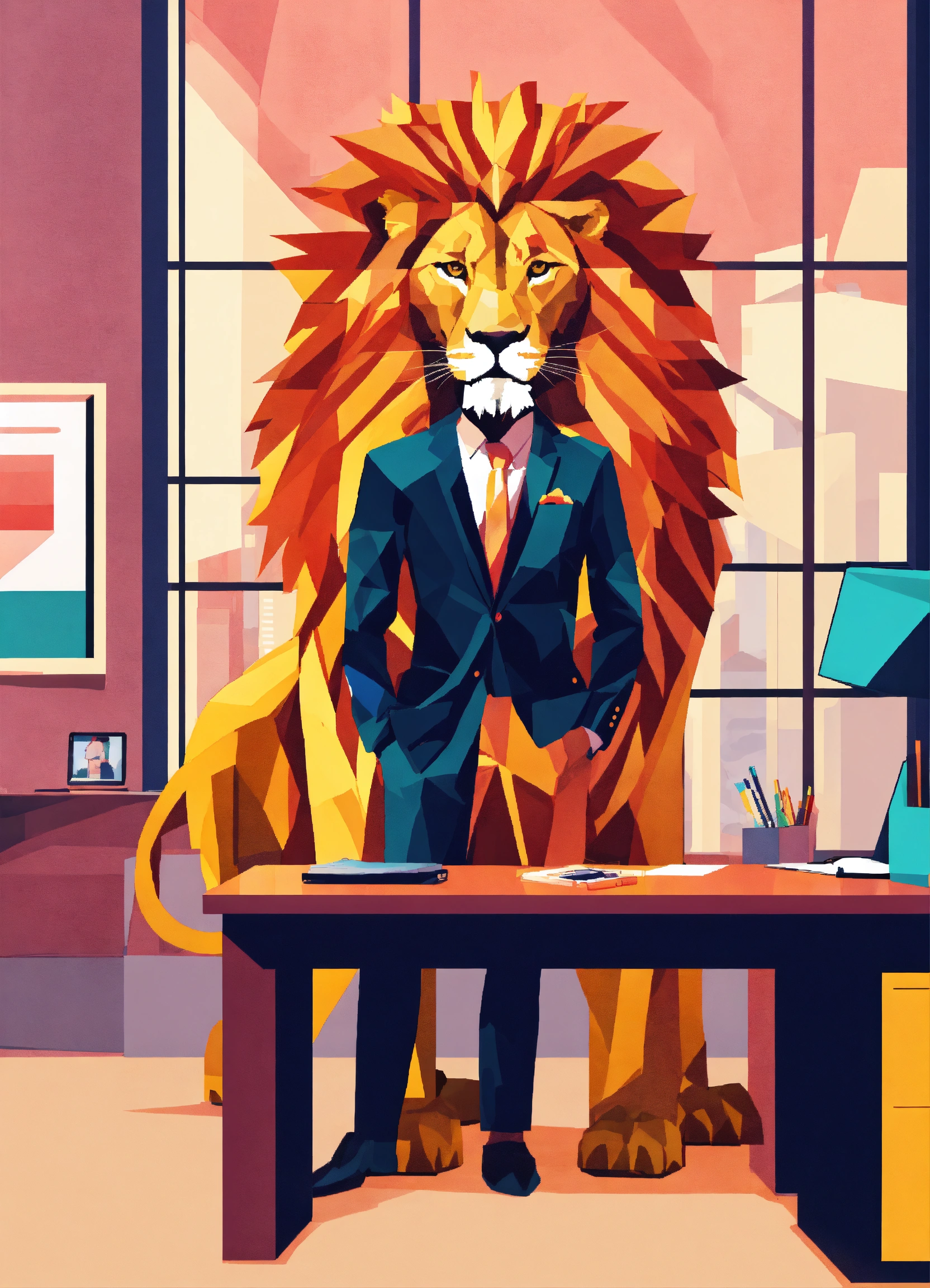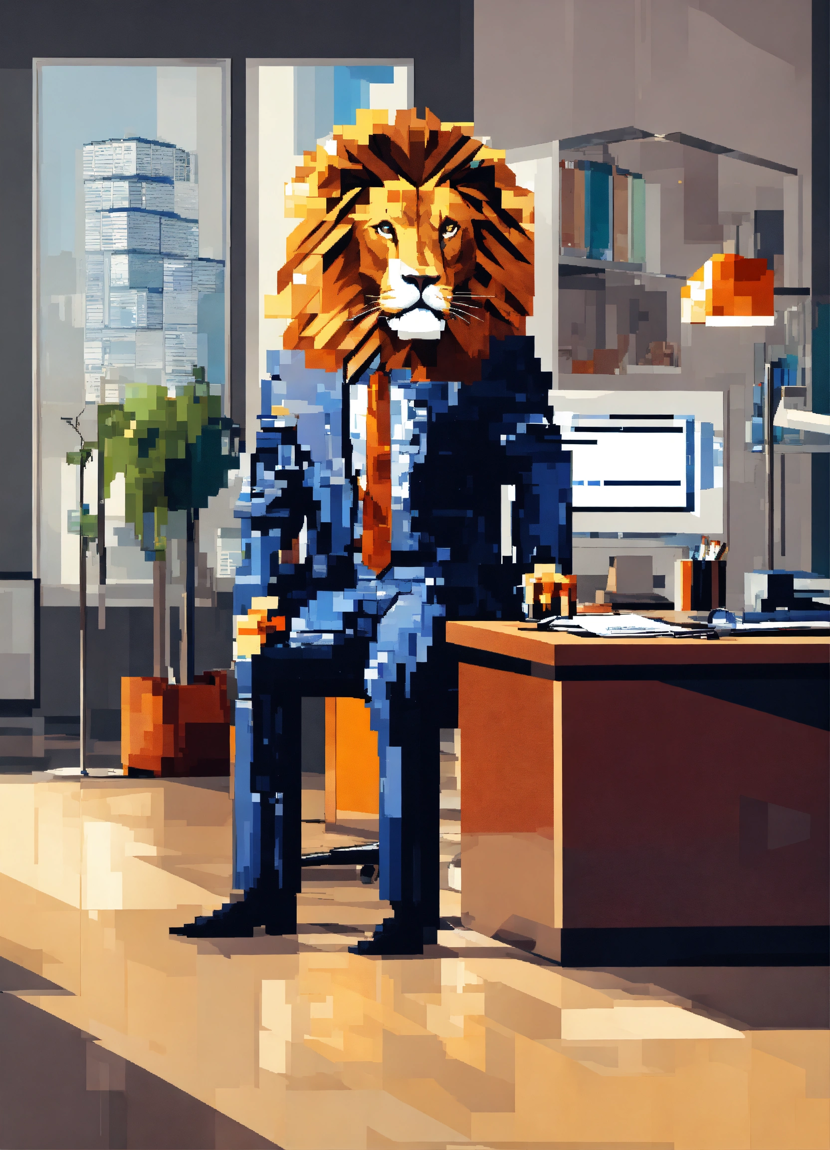 Lion with human body and business suit behind modern desk in office abstract in pixel at the viewer