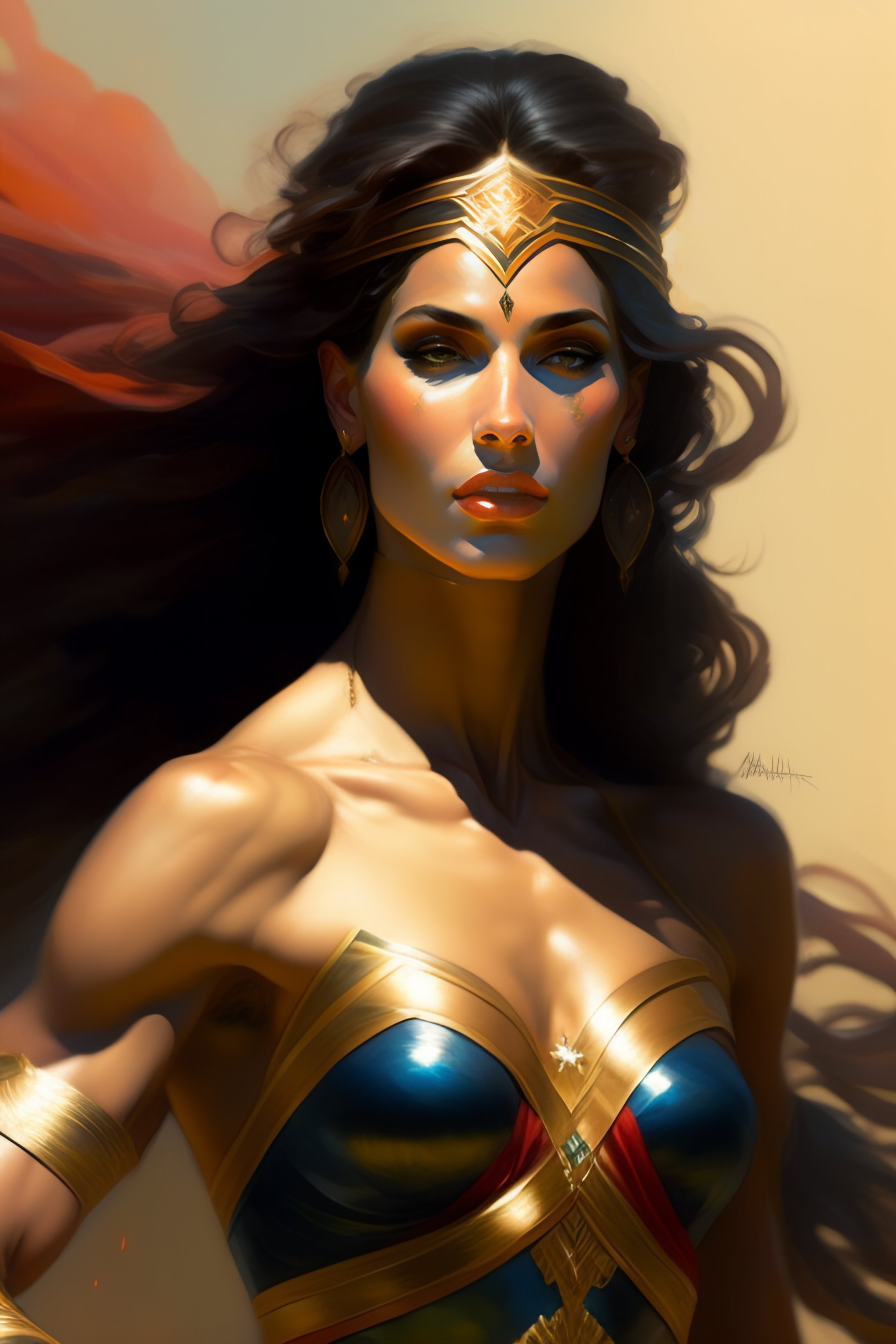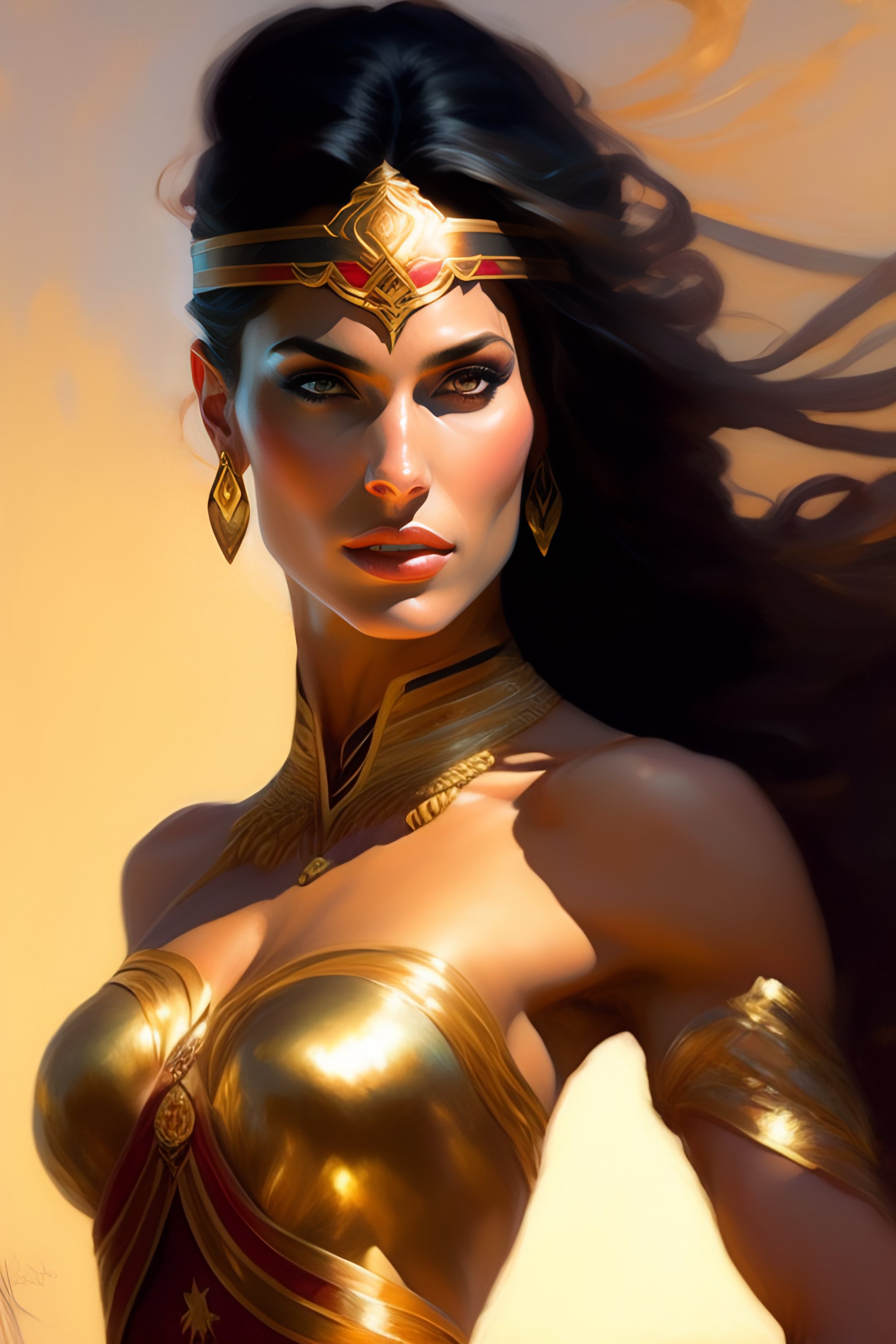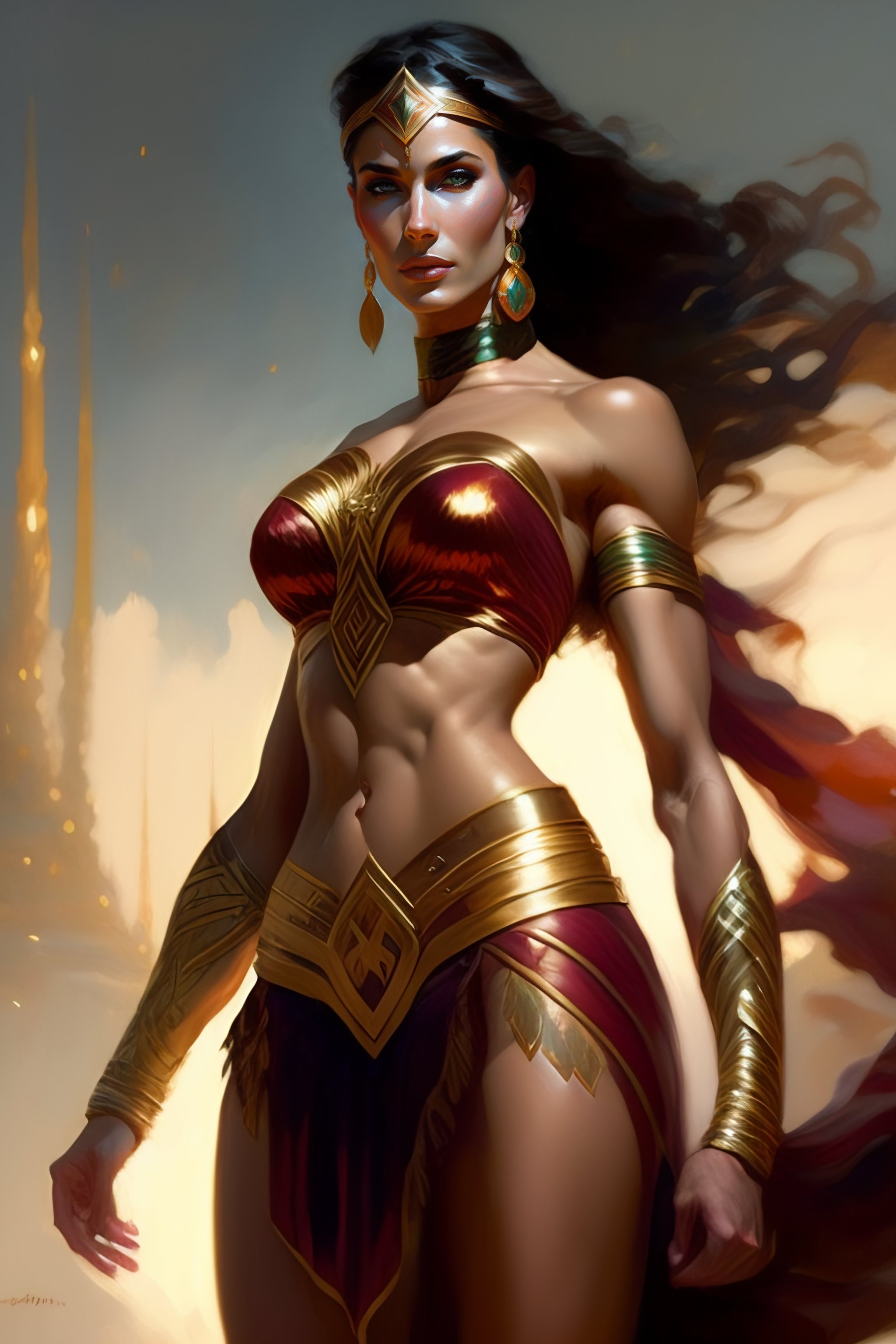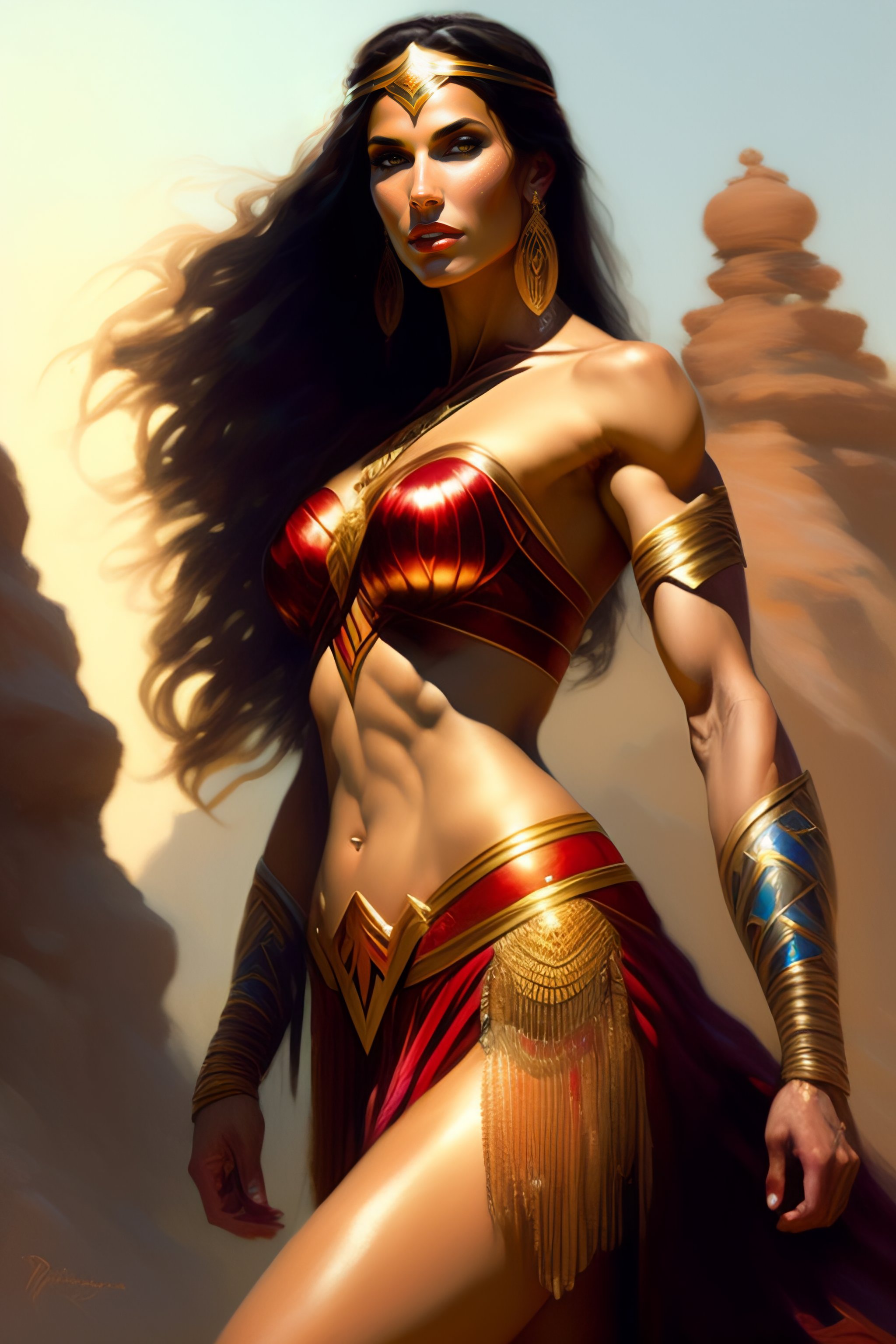 Skinny muscular wonder woman doing belly dance art by greg rutkowski and alphonse mucha