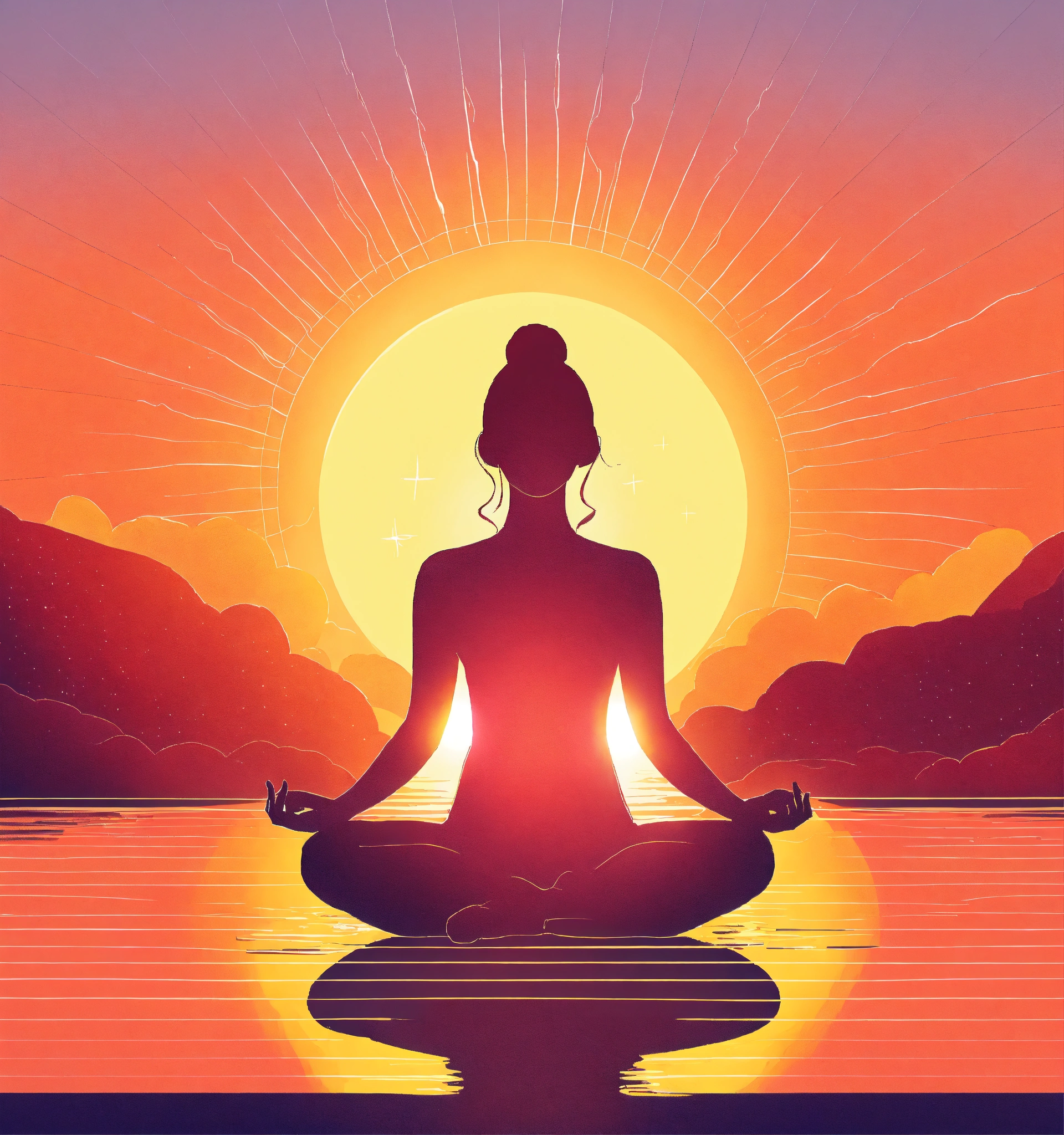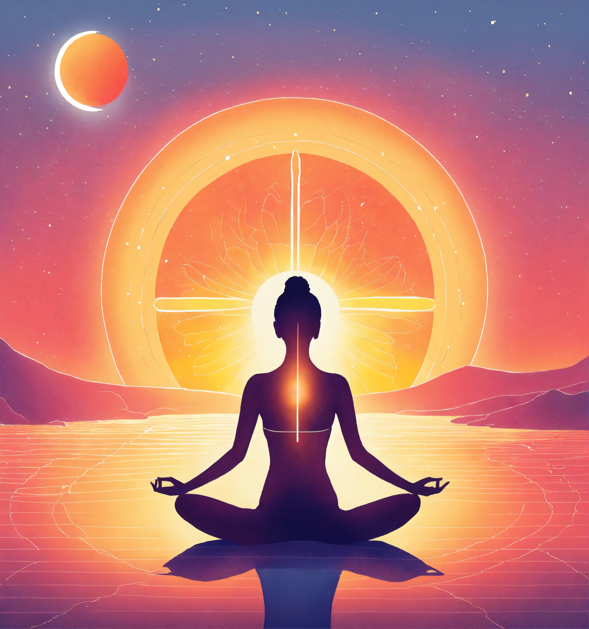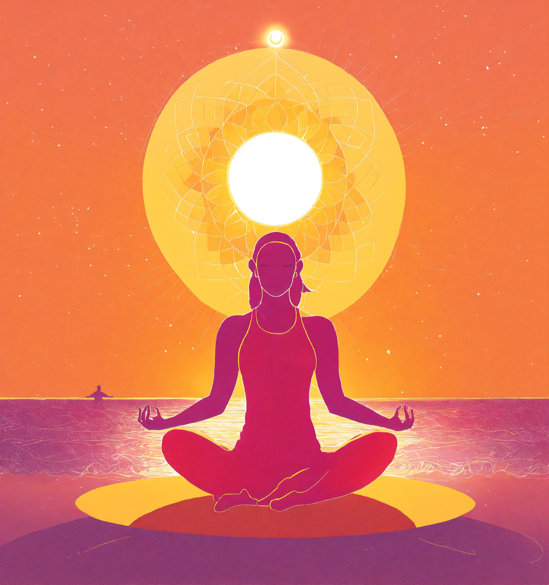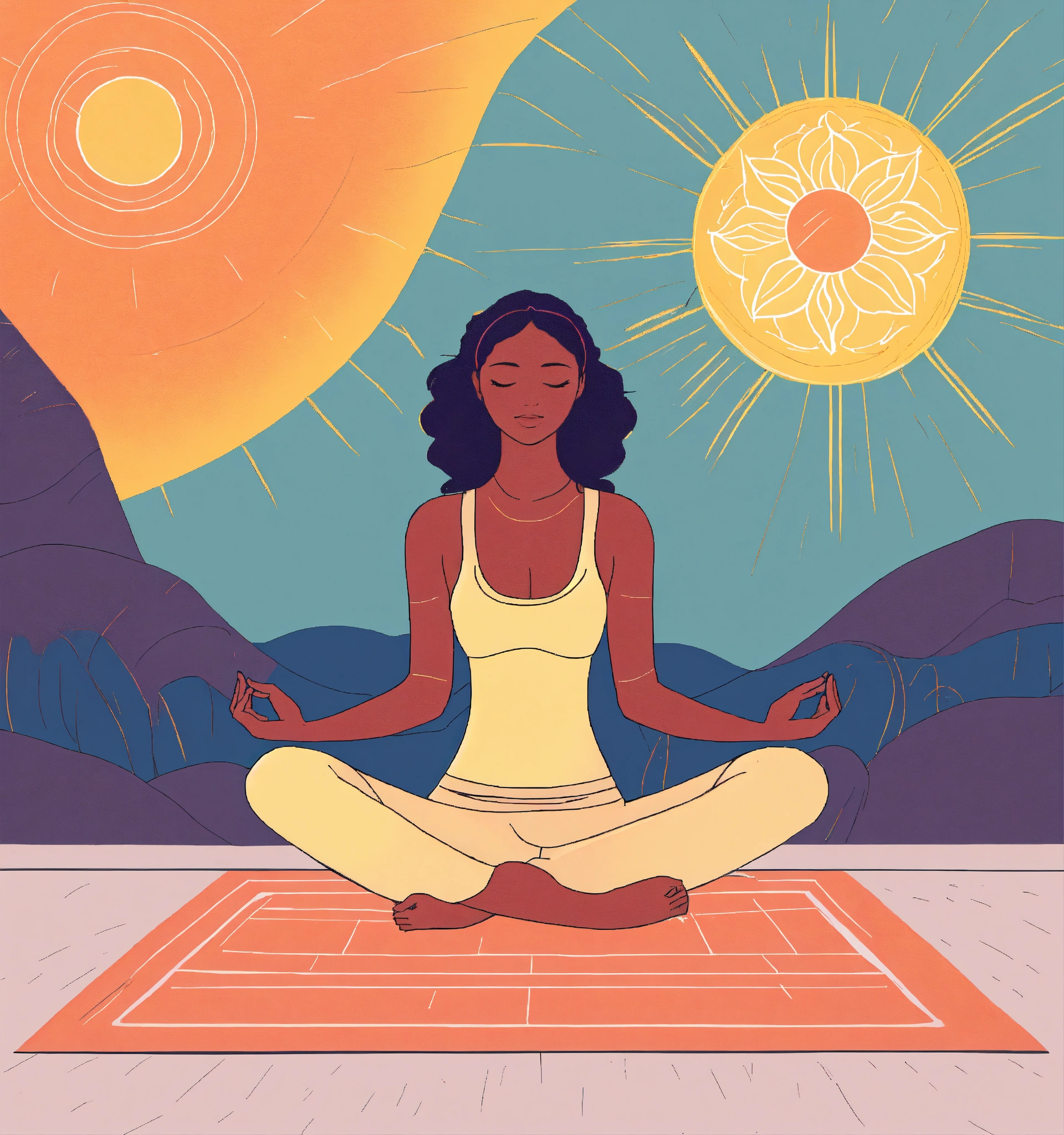 Minimalist illustration with spiritual color pencils of a woman doing yoga and sun in the background