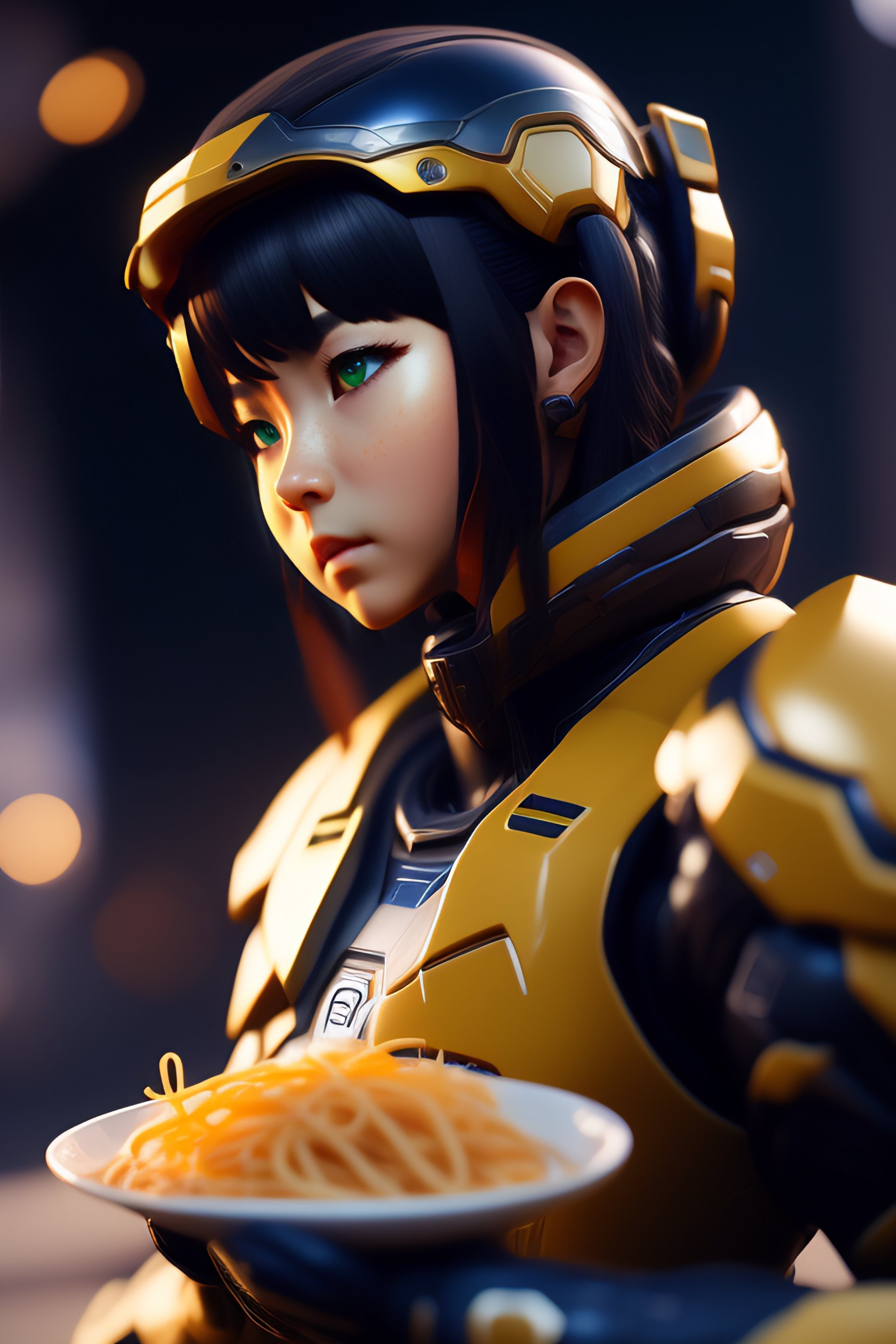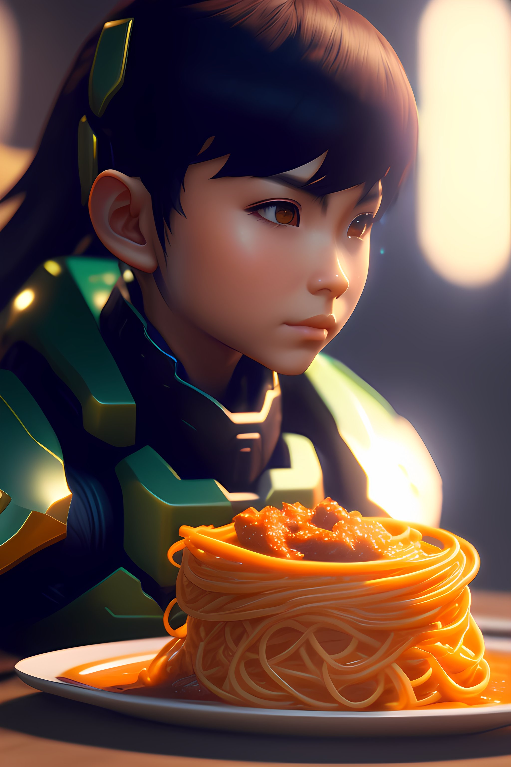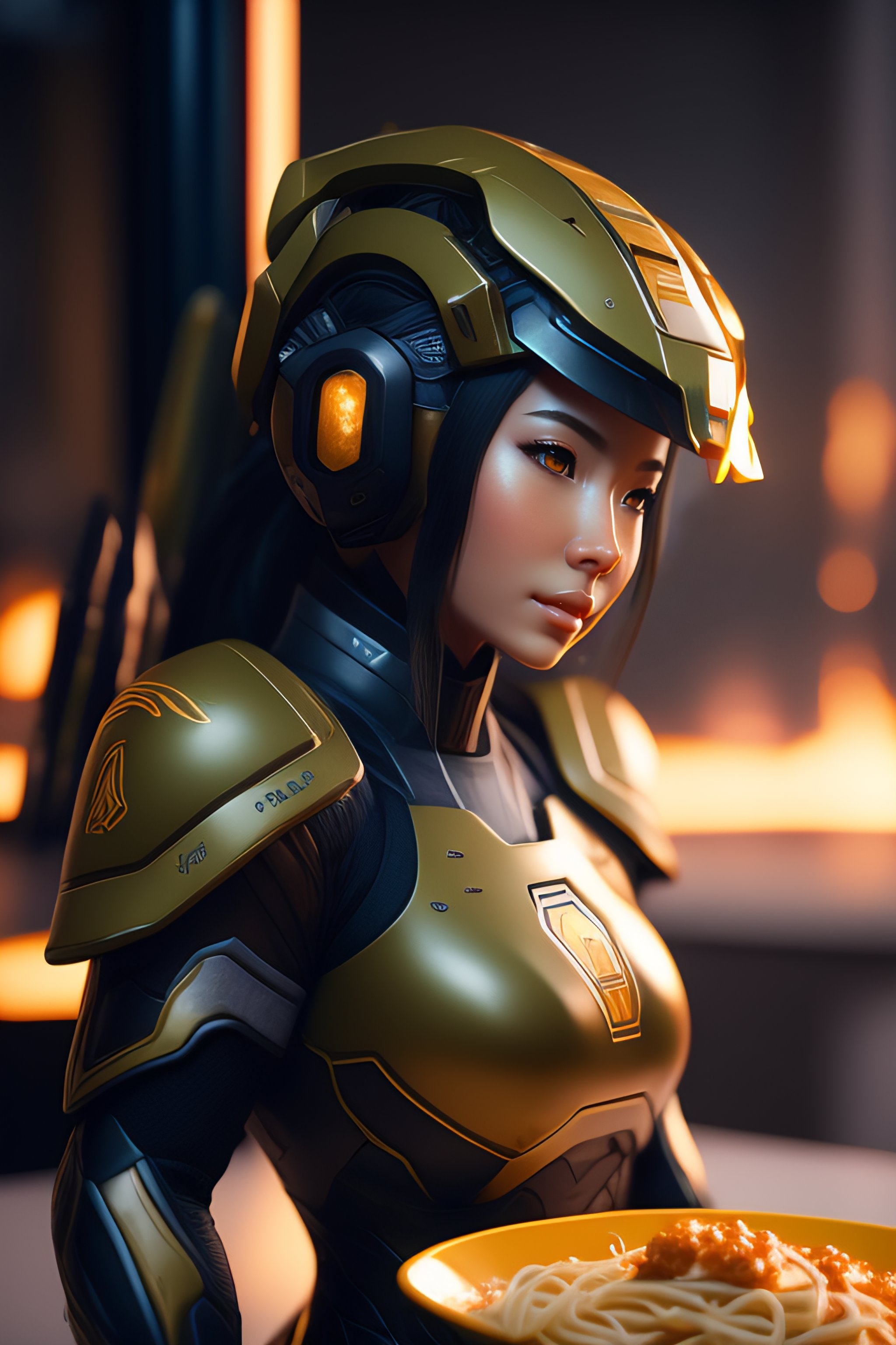 Master chief (halo), maile, eating pasta by wlop, ilya kuvshinov, krenz cushart, greg rutkowski, trending on pixiv. zbrush sculpt, octane, maya, houdini, vfx. sharp focus, volumetric lighting.
