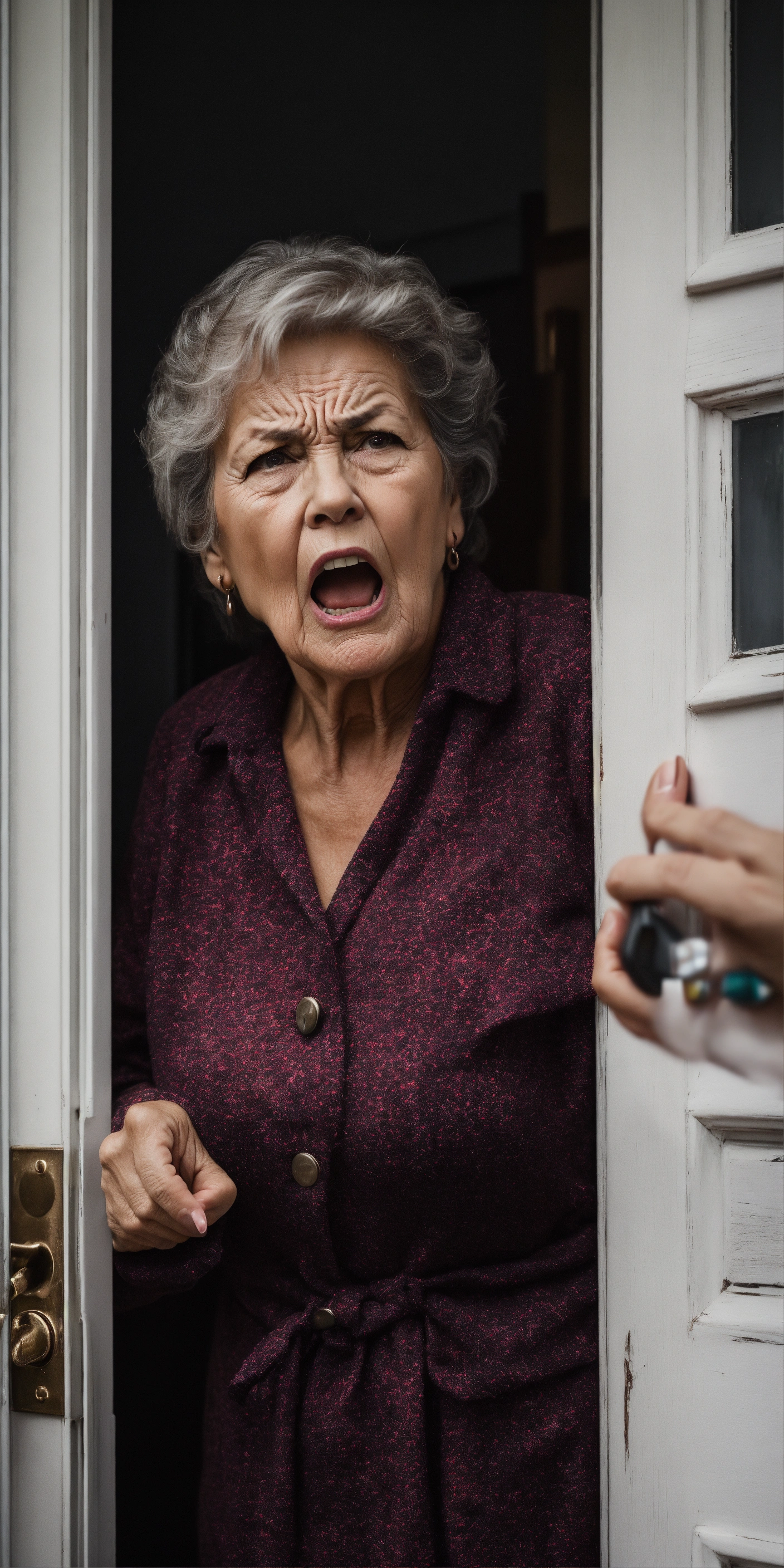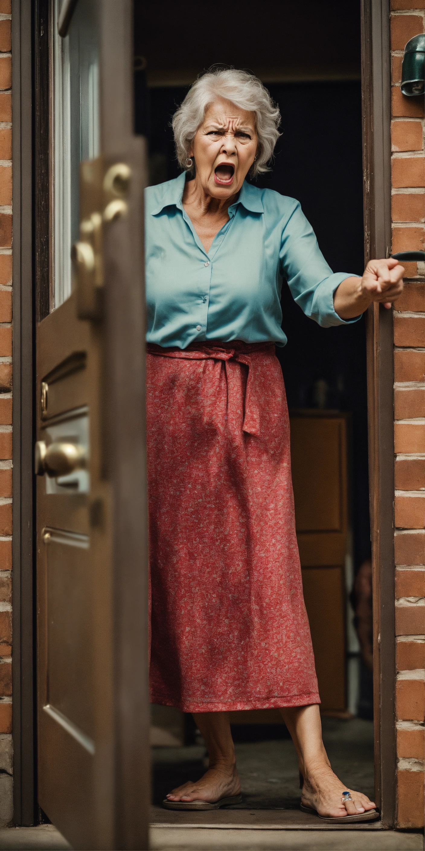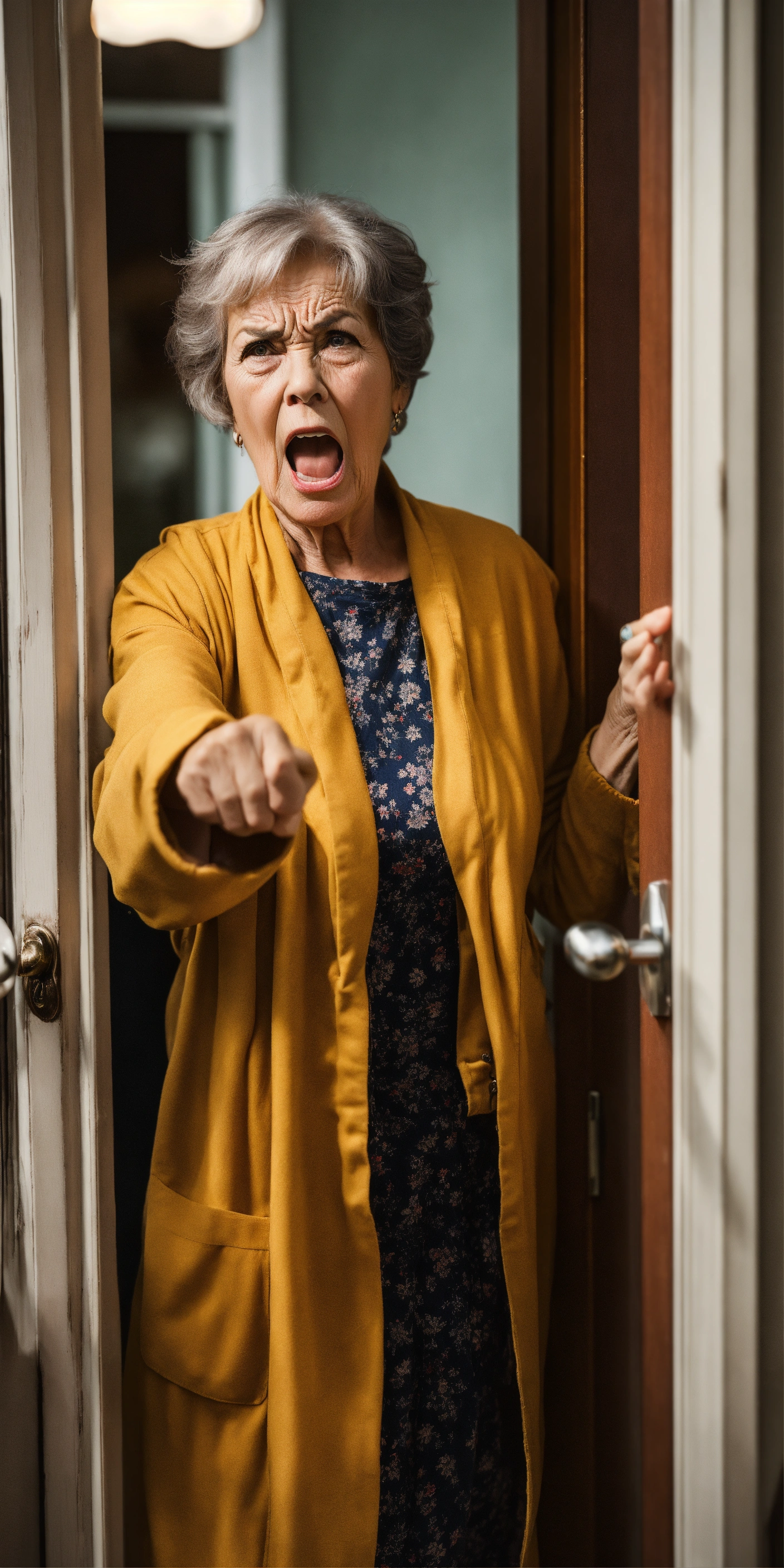 A woman in her 60 years old with an angry expression points her finger at the door, kicking someone out of the house. the woman has an angry, stern face and is shouting. the woman is looking at the camera. realistic photo