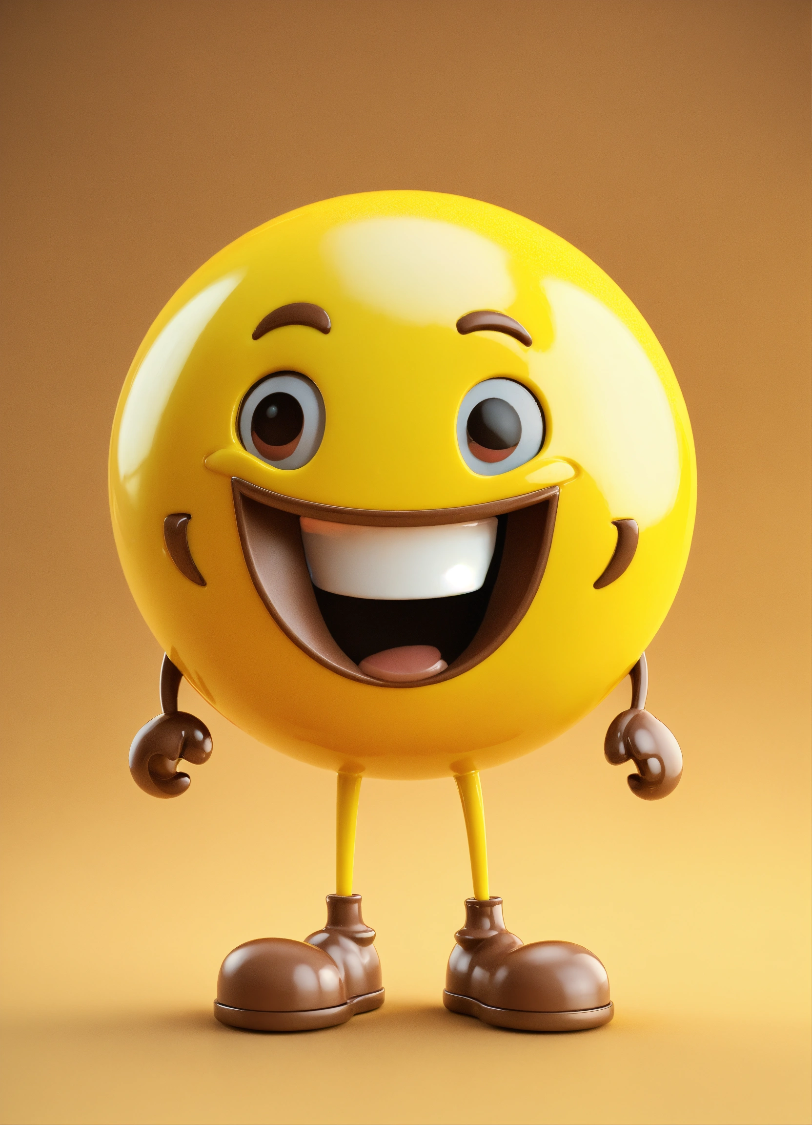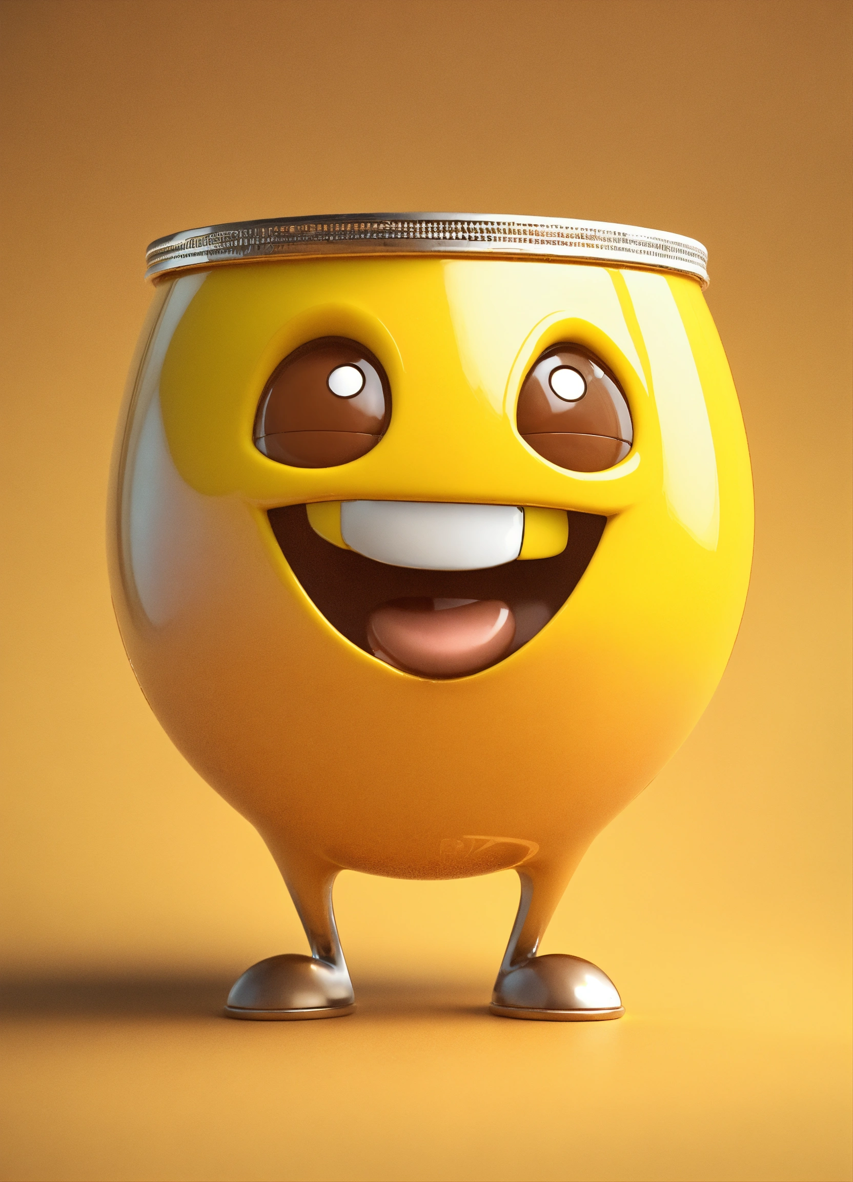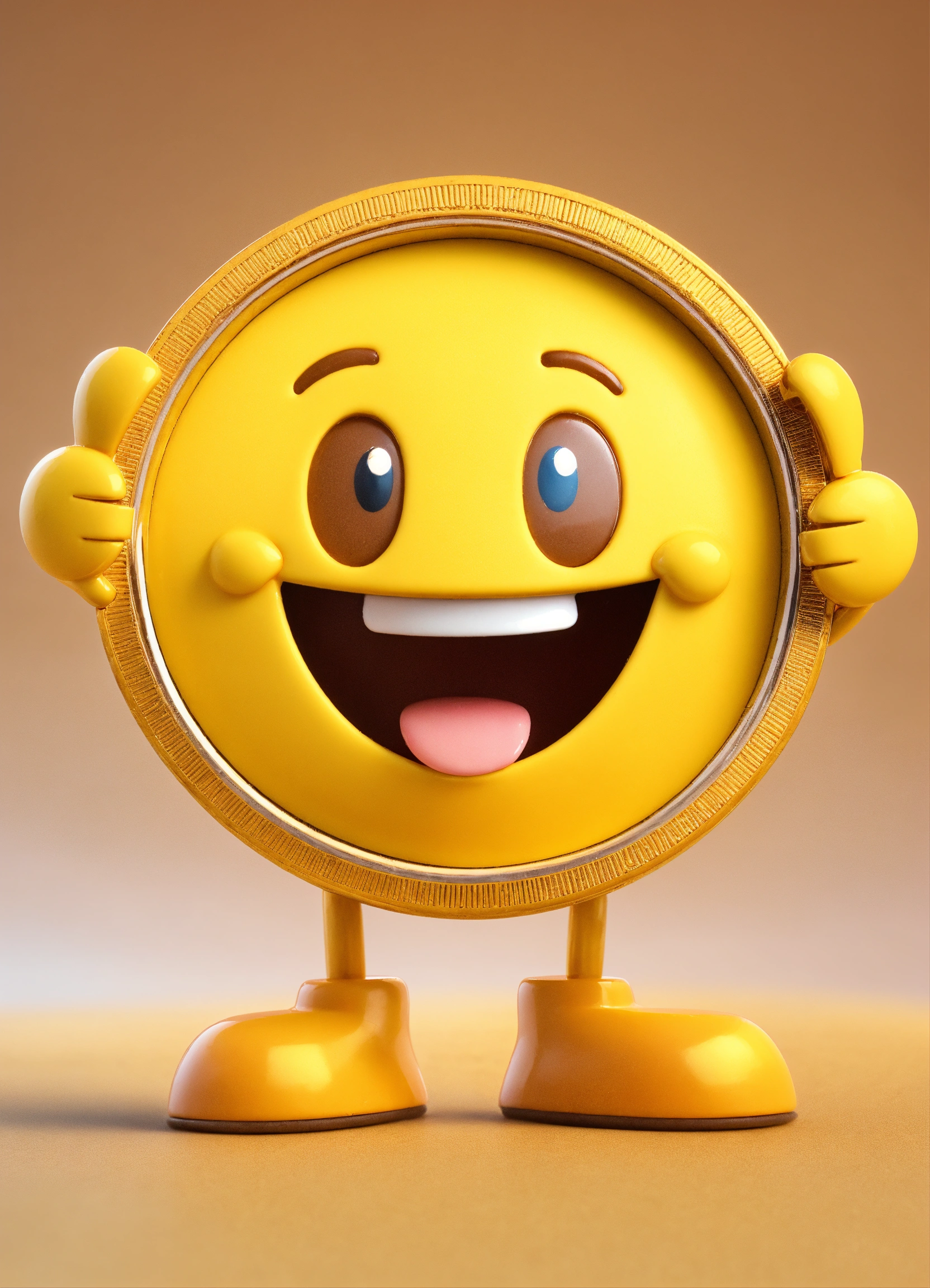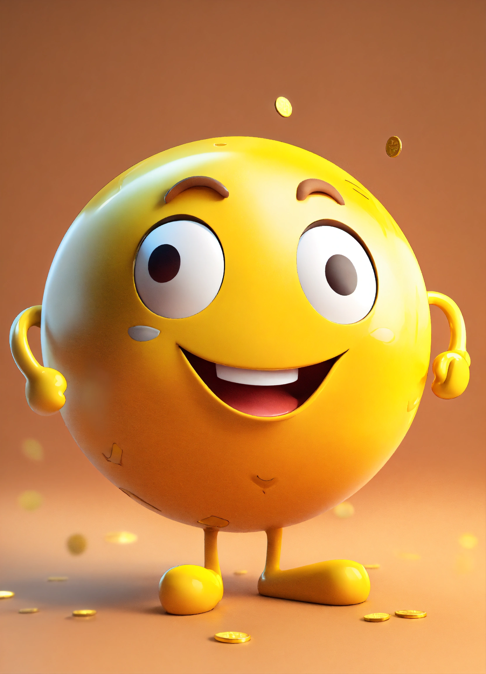 A coin character is a portrait with arms and legs and a smiling face, happy and cute erect yellow body and brown face color name is crazycup 3d