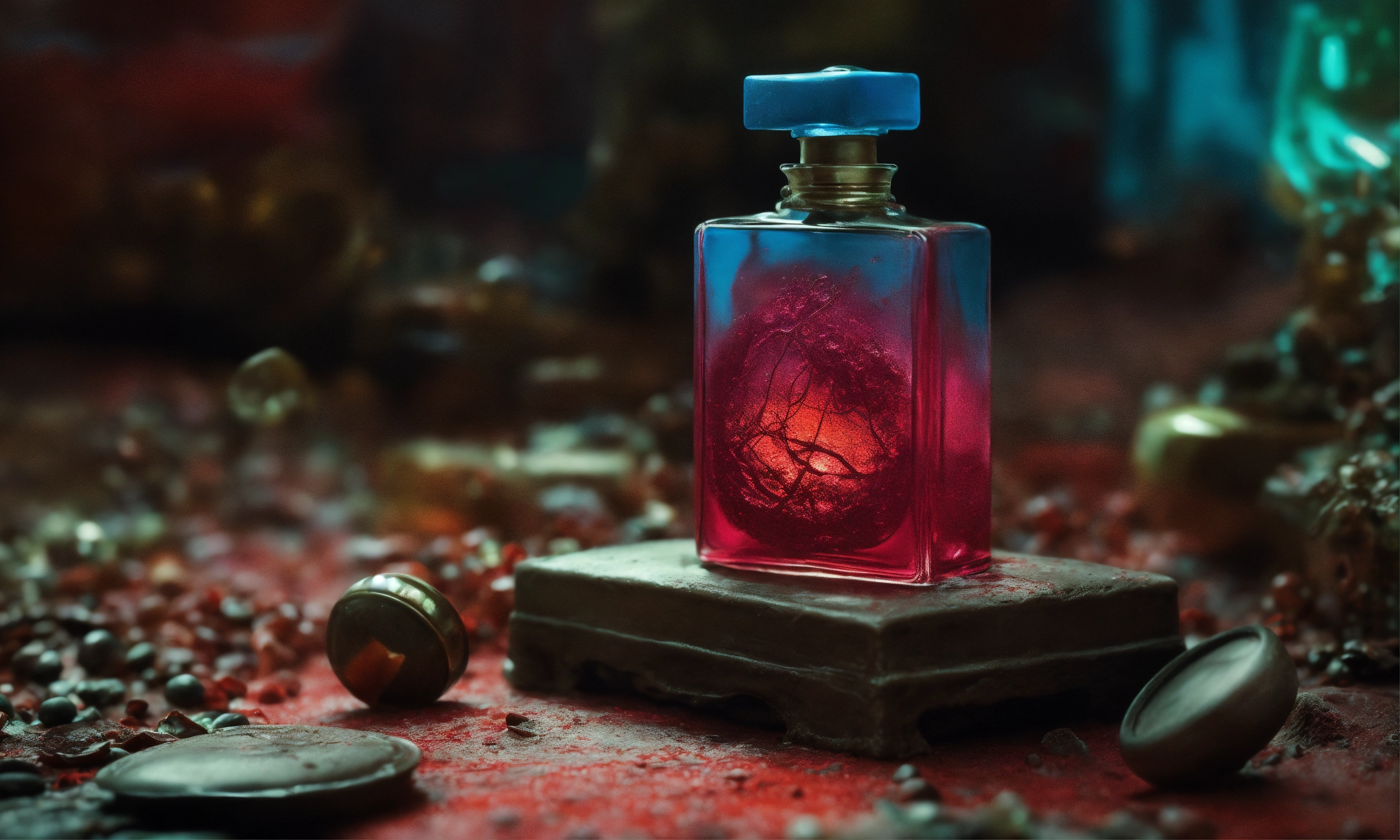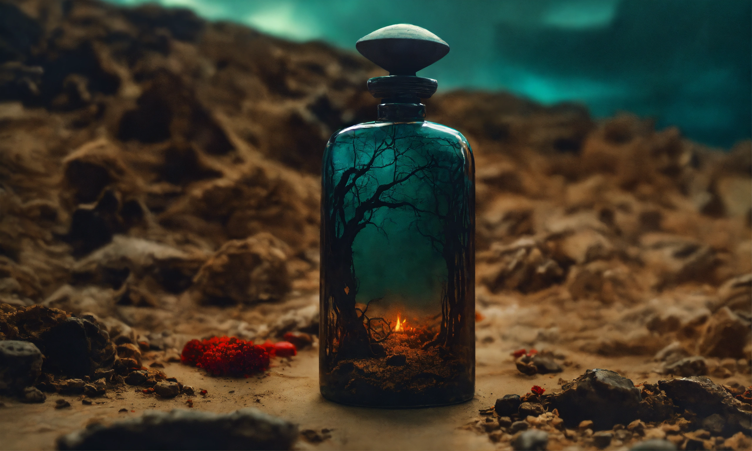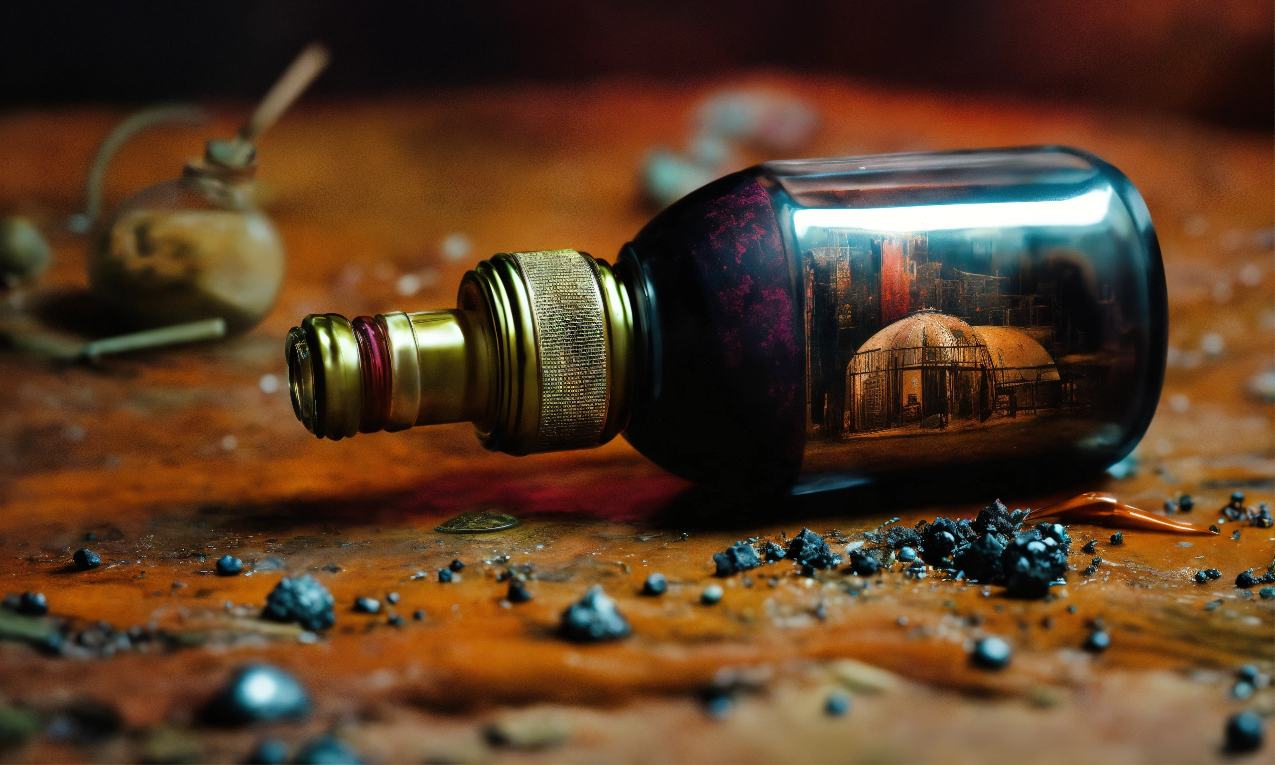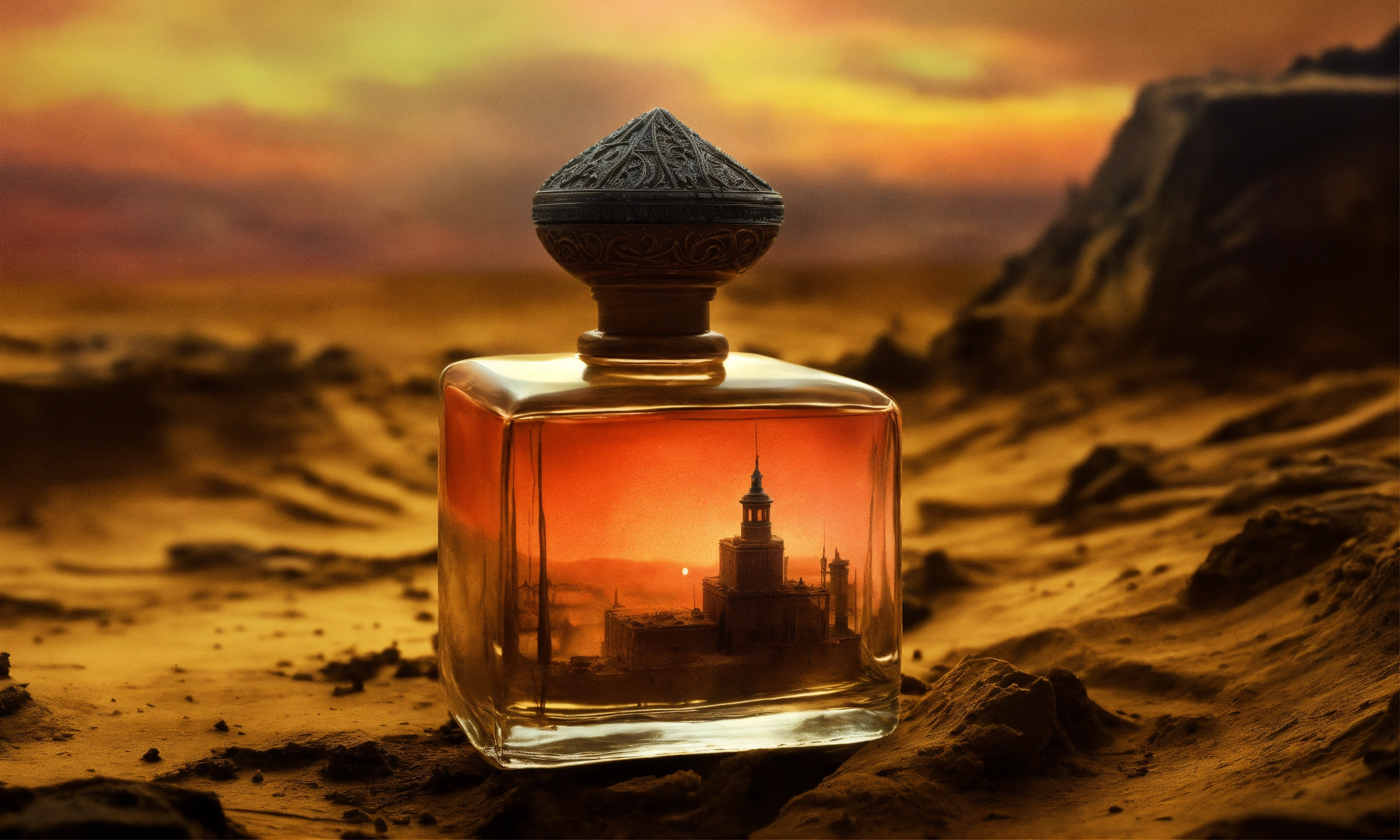 Hand-made modeling clay, dark and surreal artworks, often featuring nightmarish and dystopian elements, close-up view of perfume bottle, zdzisław beksiński inspiration.