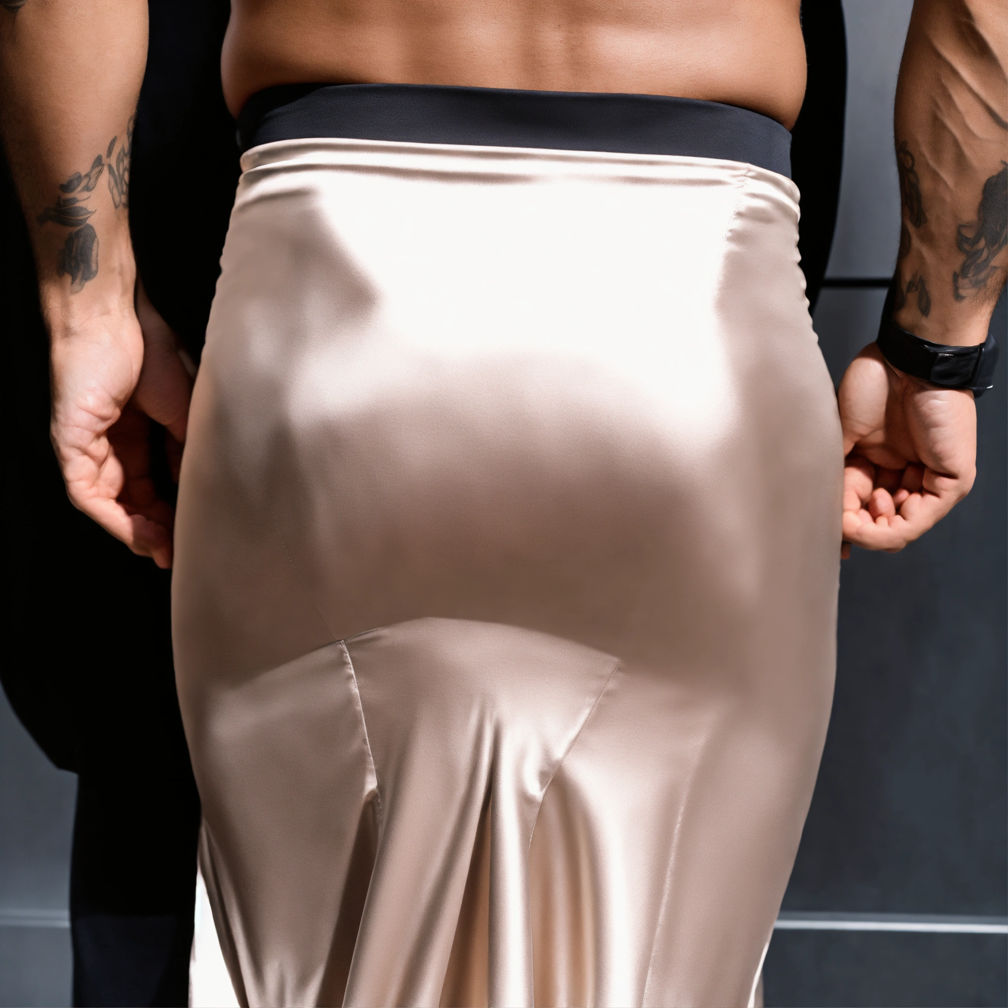 Close up of man wearing white satin shiny figure-hugging clingy pencil maxi skirt, pulled taut. close up. manly body part straining through fabric. toned bulking body. bu lge. ere ct. intimate. tumescent. extremely tight skirt. hard outline.