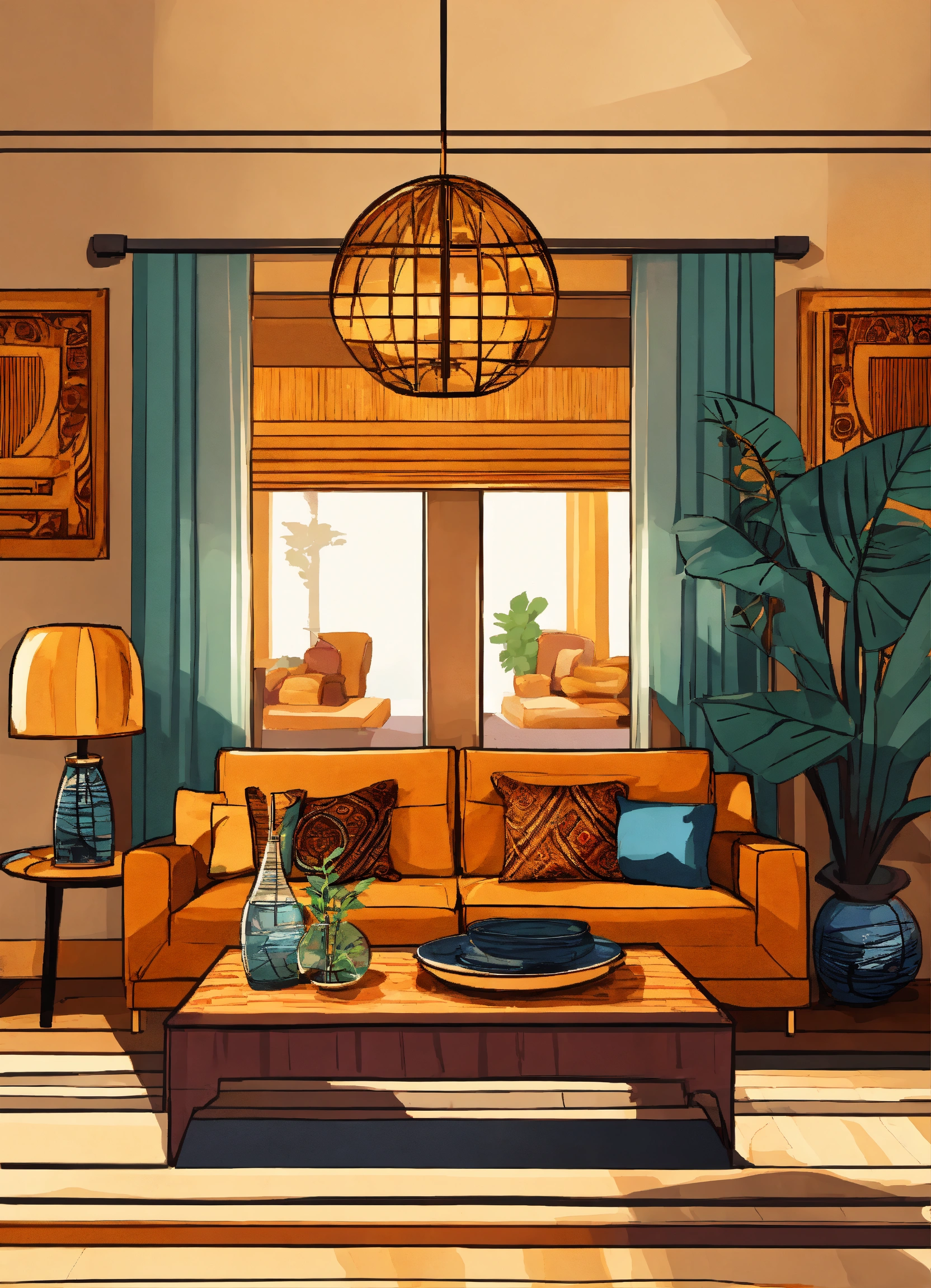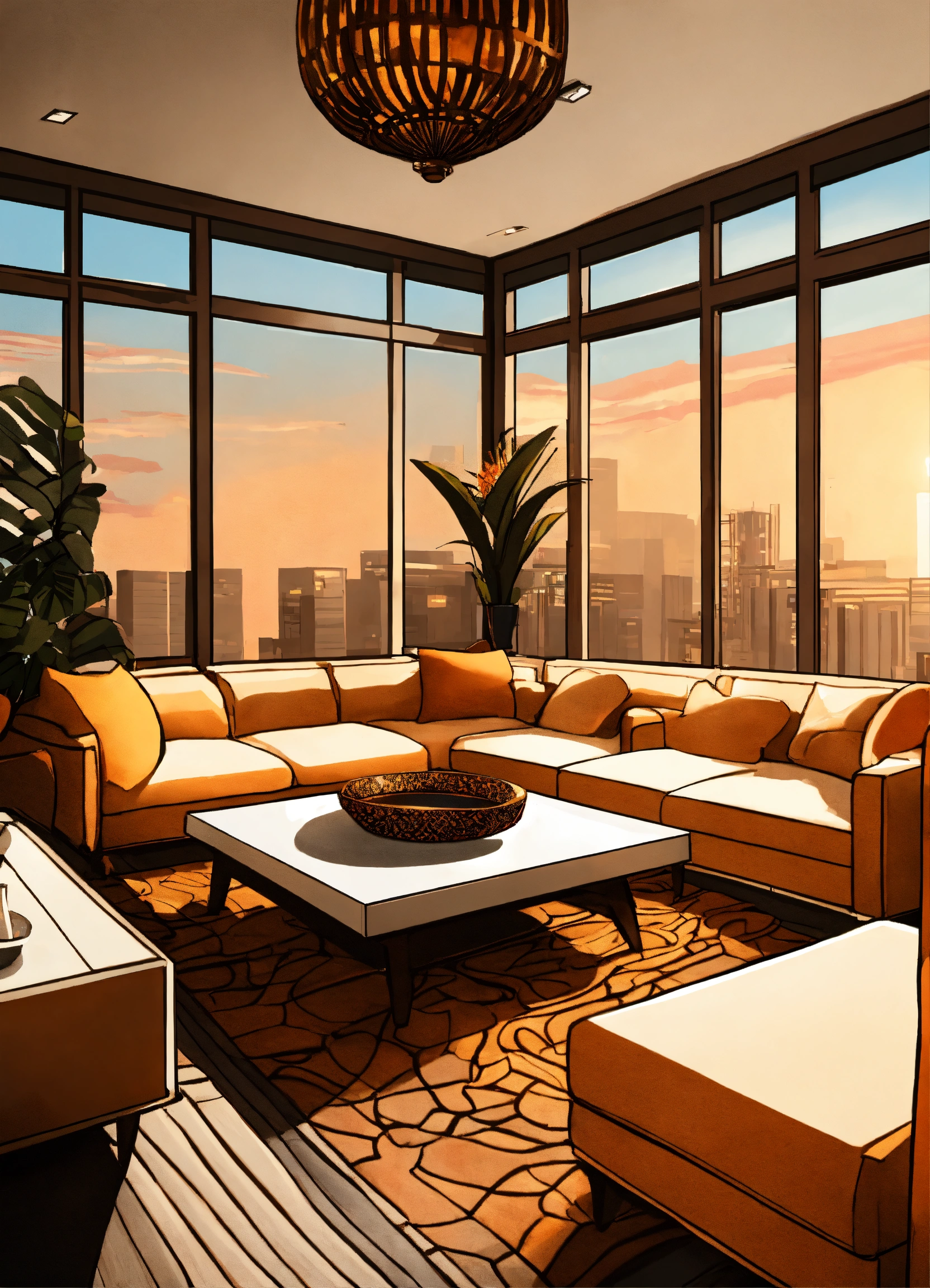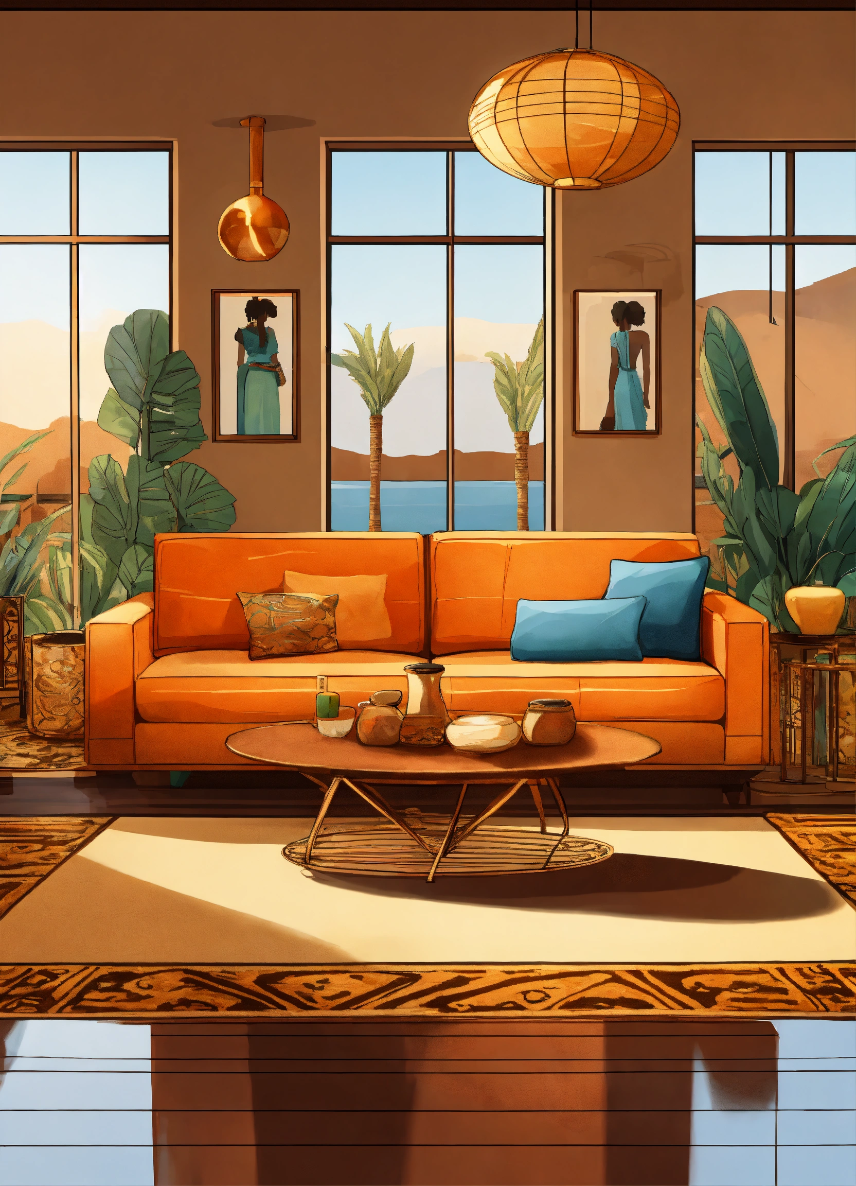 A cartoon illustration of a modern living room with luxury decor that is african inspired and