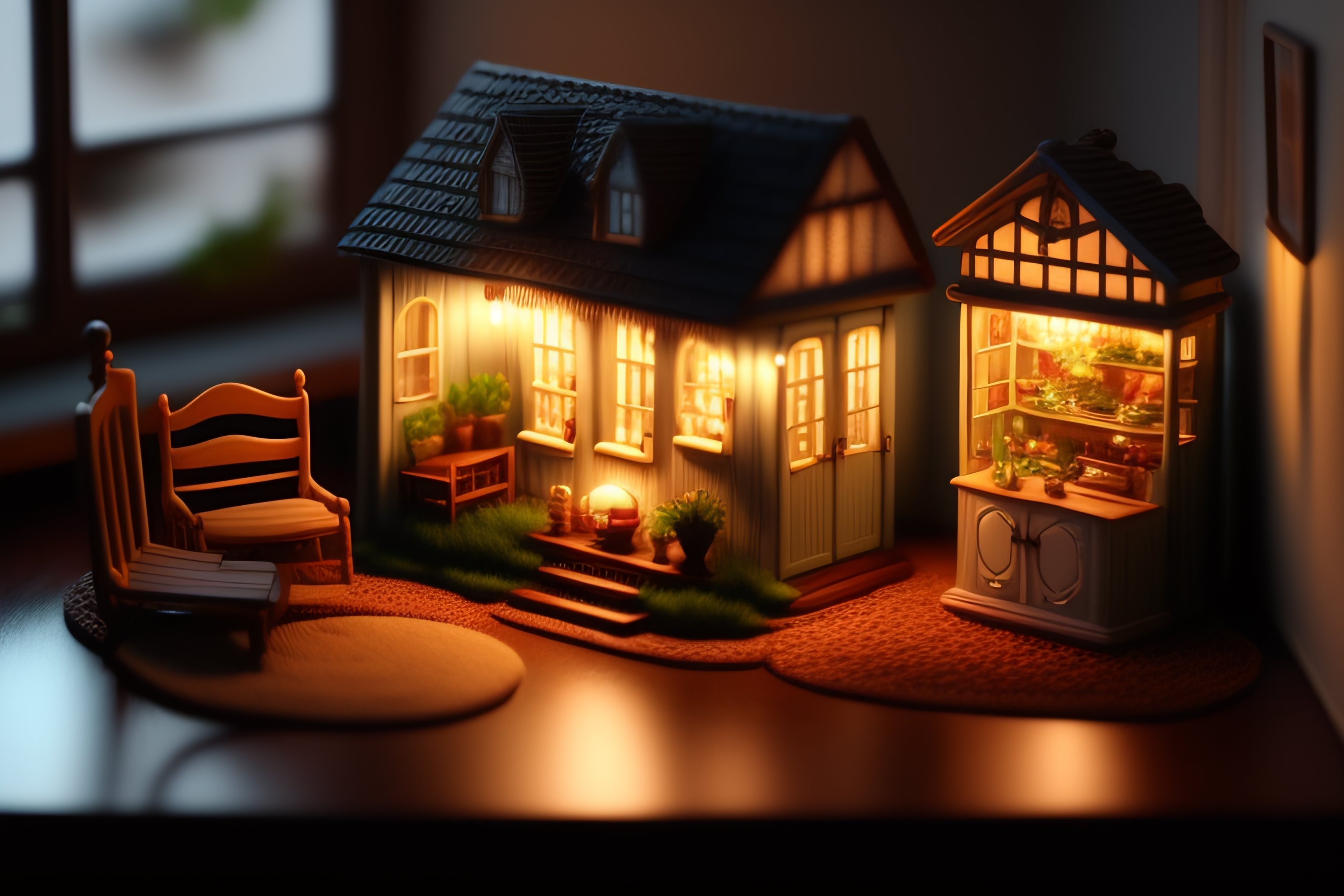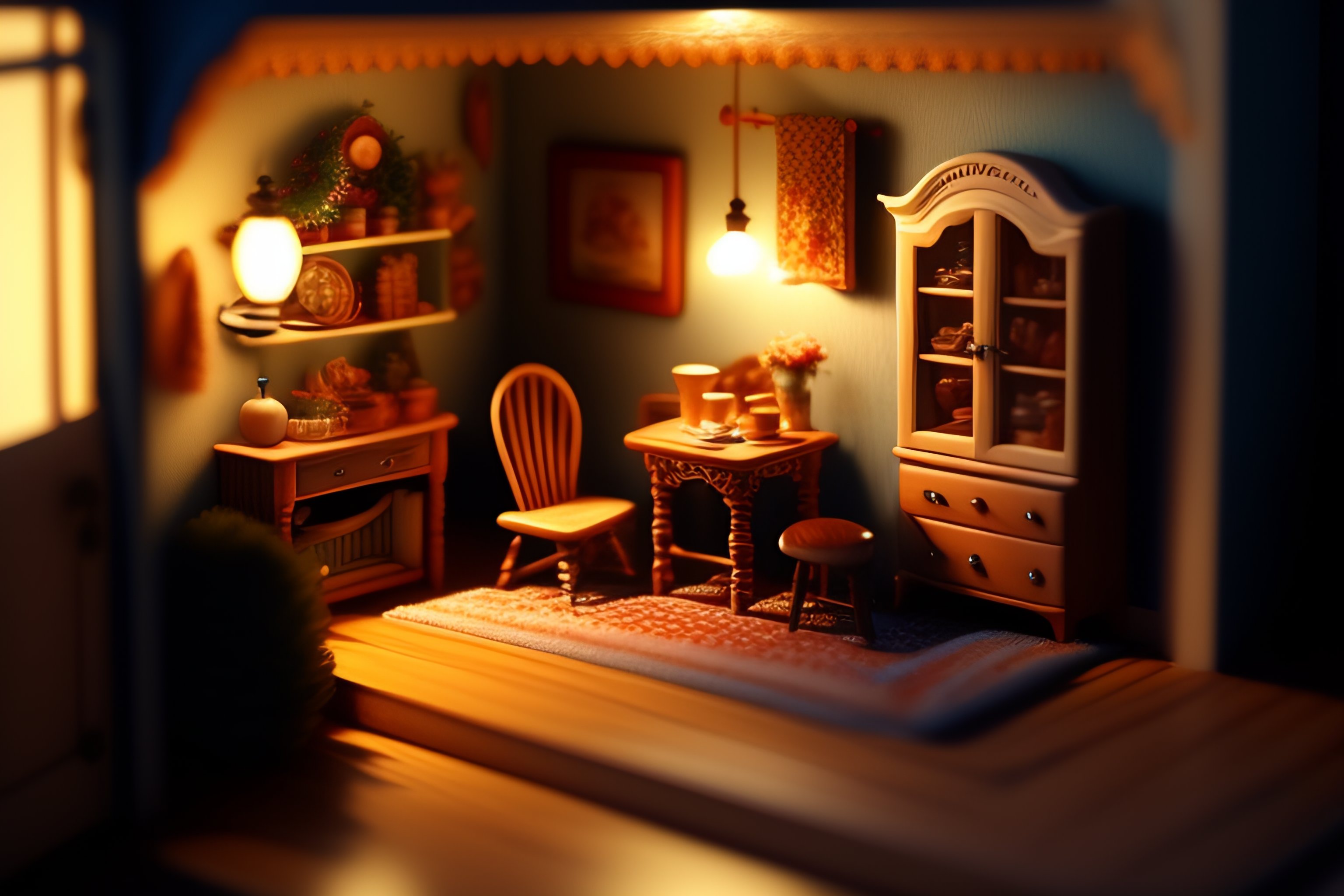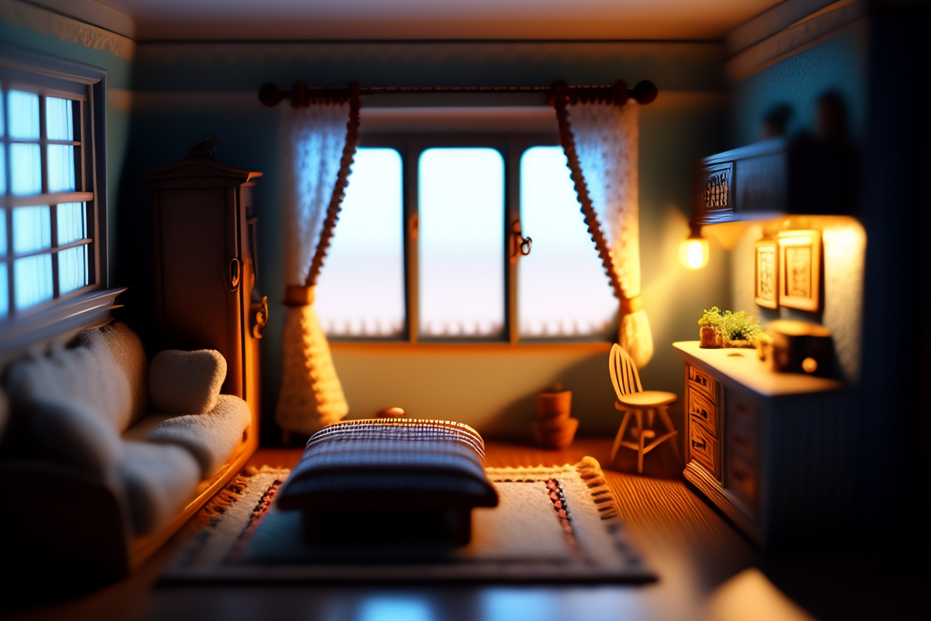 Vintage, cozy interior lighting, artstation, ultra detailed, cinematic, hyper realistic, a realistic dollhouse bedroom with furniture and window at night. artwork table decoration with handmade realistic dollhouse.