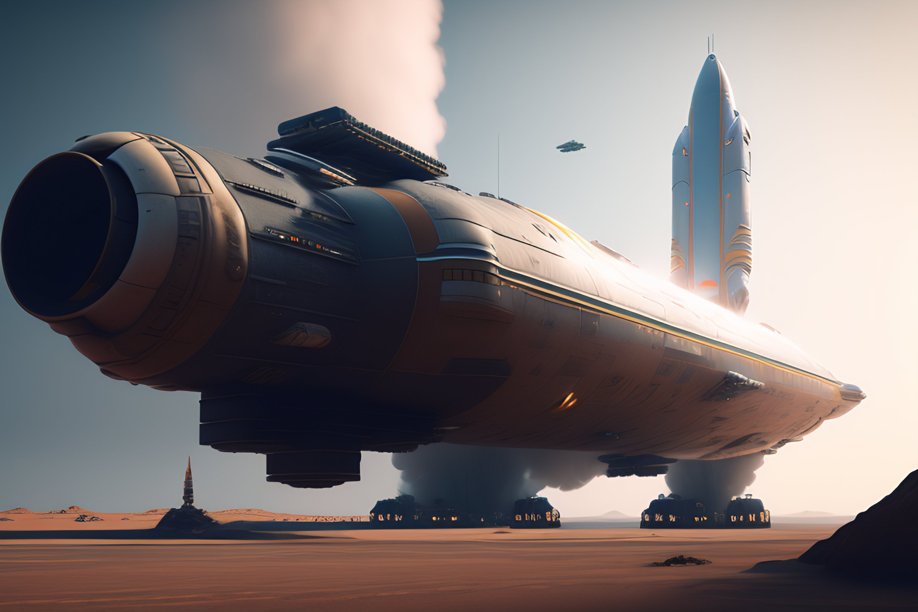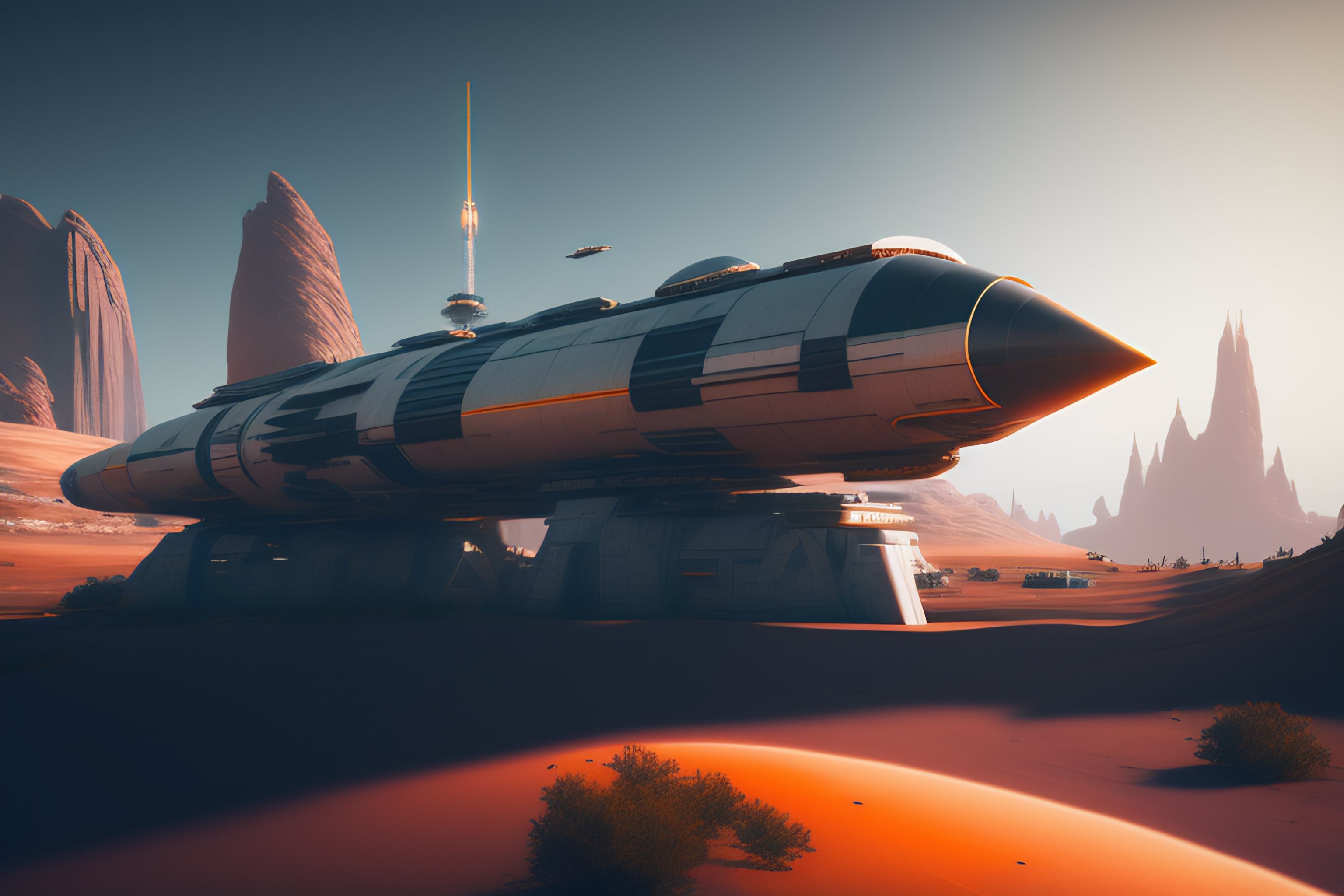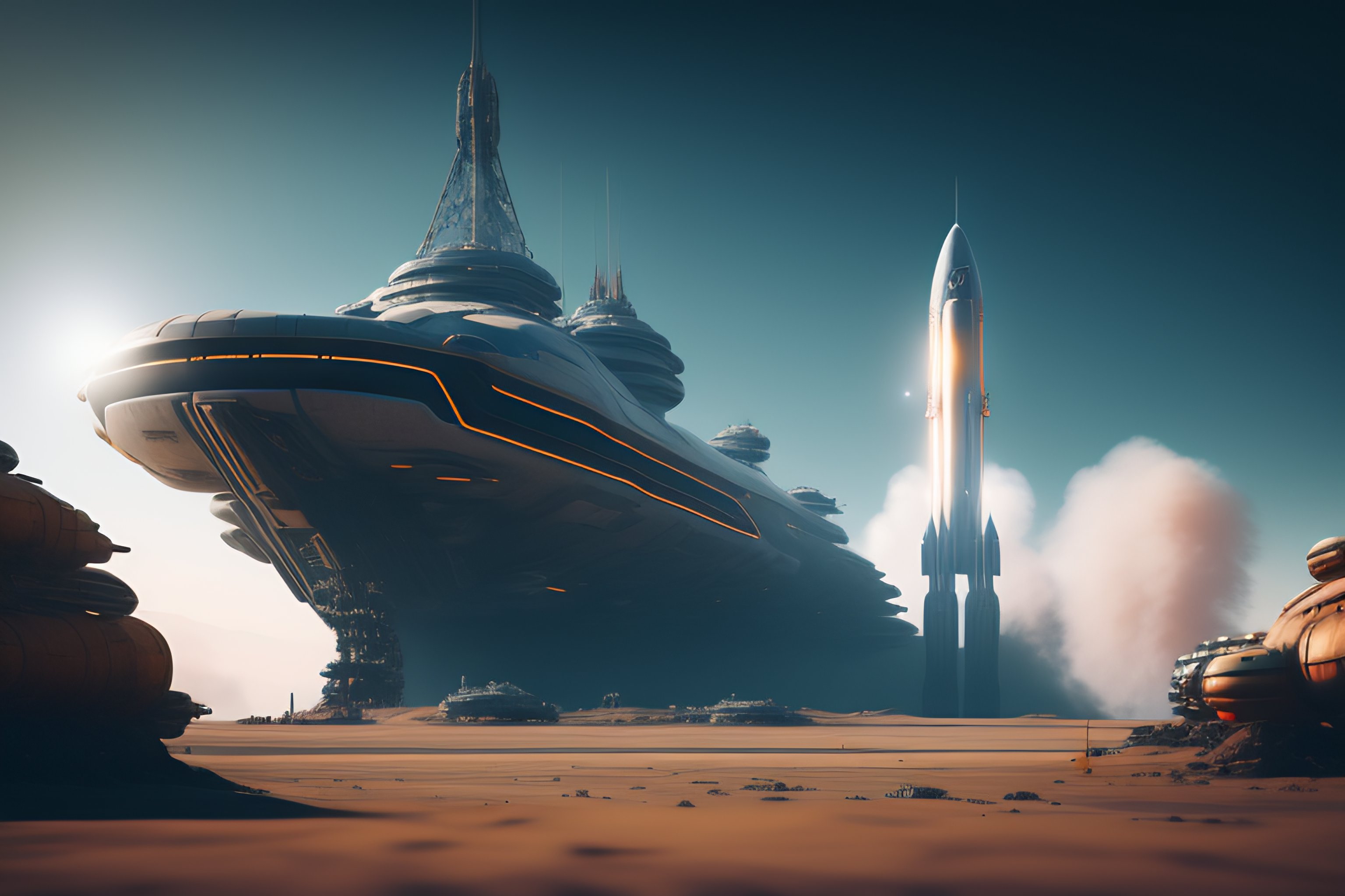 Grey scifi space rocket, fired from launch platform, exhaust engine fire, landscape, alex ross, eddie mendoza, raphael lacoste, george lucas, star wars, star citizen, horizon zero dawn, sebastian ludke, concept art, matte painting, highly detailed, rule of thirds, dynamic lighting, cinematic, realism, realistic, photo real, detailed, magnificiant landscape, denoised, centerd