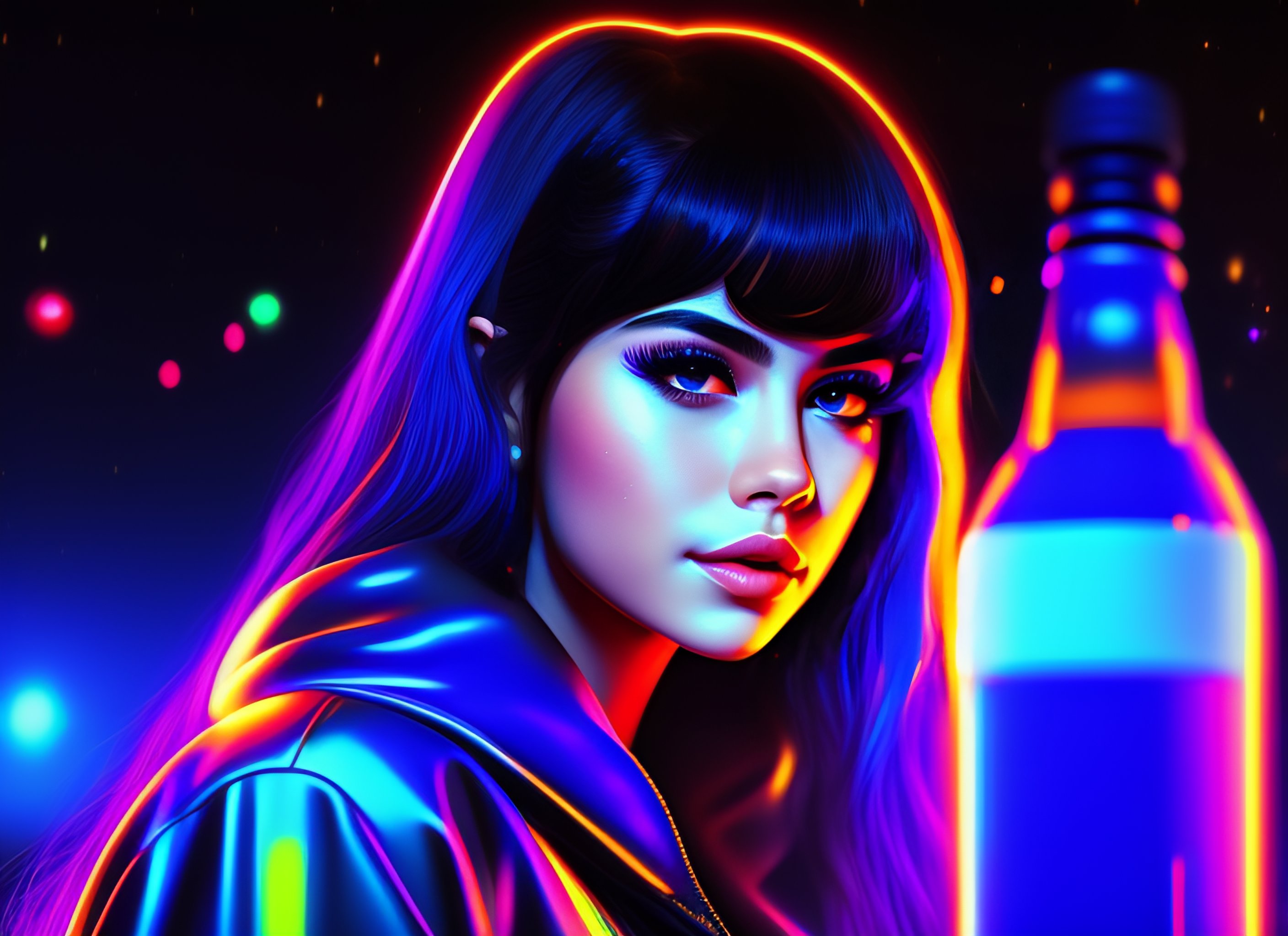 Full body kawai selena gomez emo girl drinking coke, on a deep space, 4k, 8k, trending in artstation, trending in deviantart, rendered, ultra realistic, high detailed, masterpiece, vibrant colors, hdr, octane render, unreal engine, ray tracing, by hajime sorayama, greg tocchini, virgil finlay, sci-fi, colors, neon lights. line art