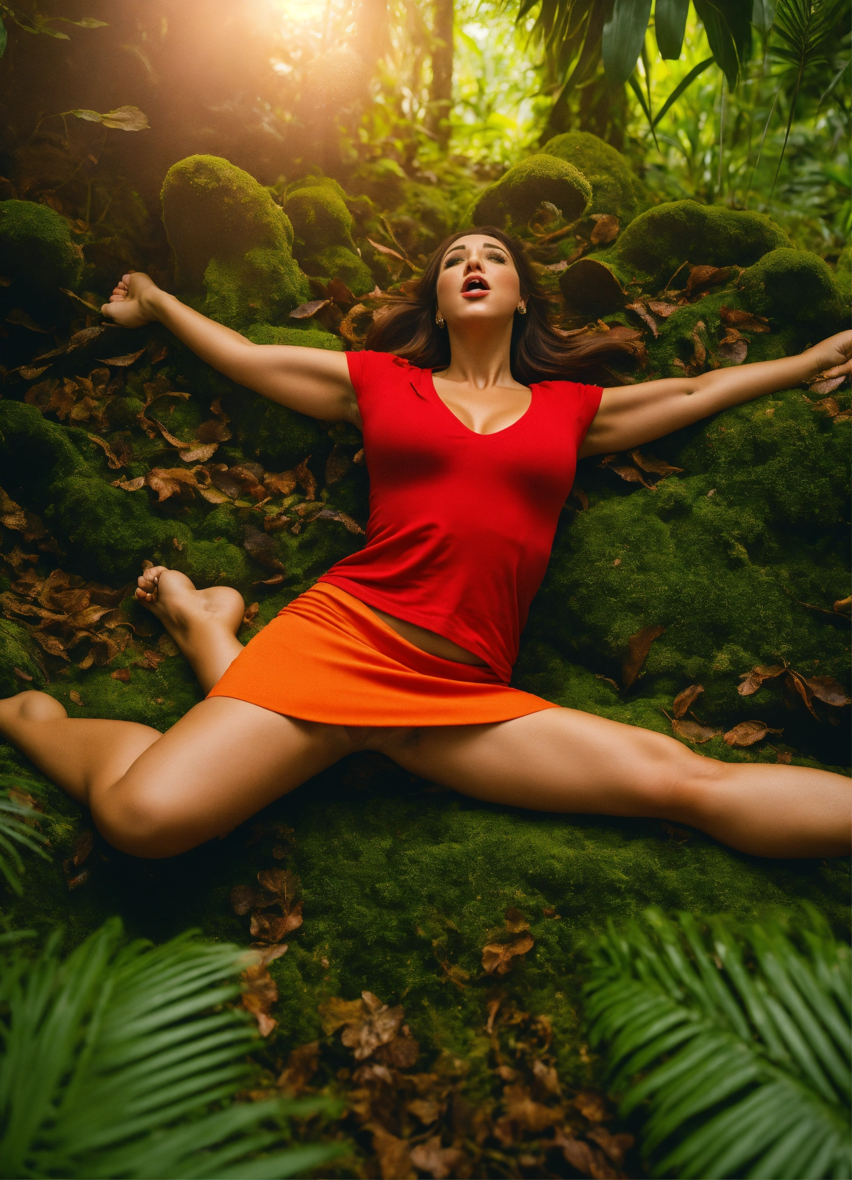 Full body 8k wide angle top down image of scared and shocked in pain lacey chabert wearing a tight mid sleeved orange low cut v-neck top, a red mini skirt, wedges, laying with her legs together and arms wide open on the tropical forest floor, arms on arm rests, top view picture, arms out wide, bright green eye iris color, mouth wide open in pain, stomach showing