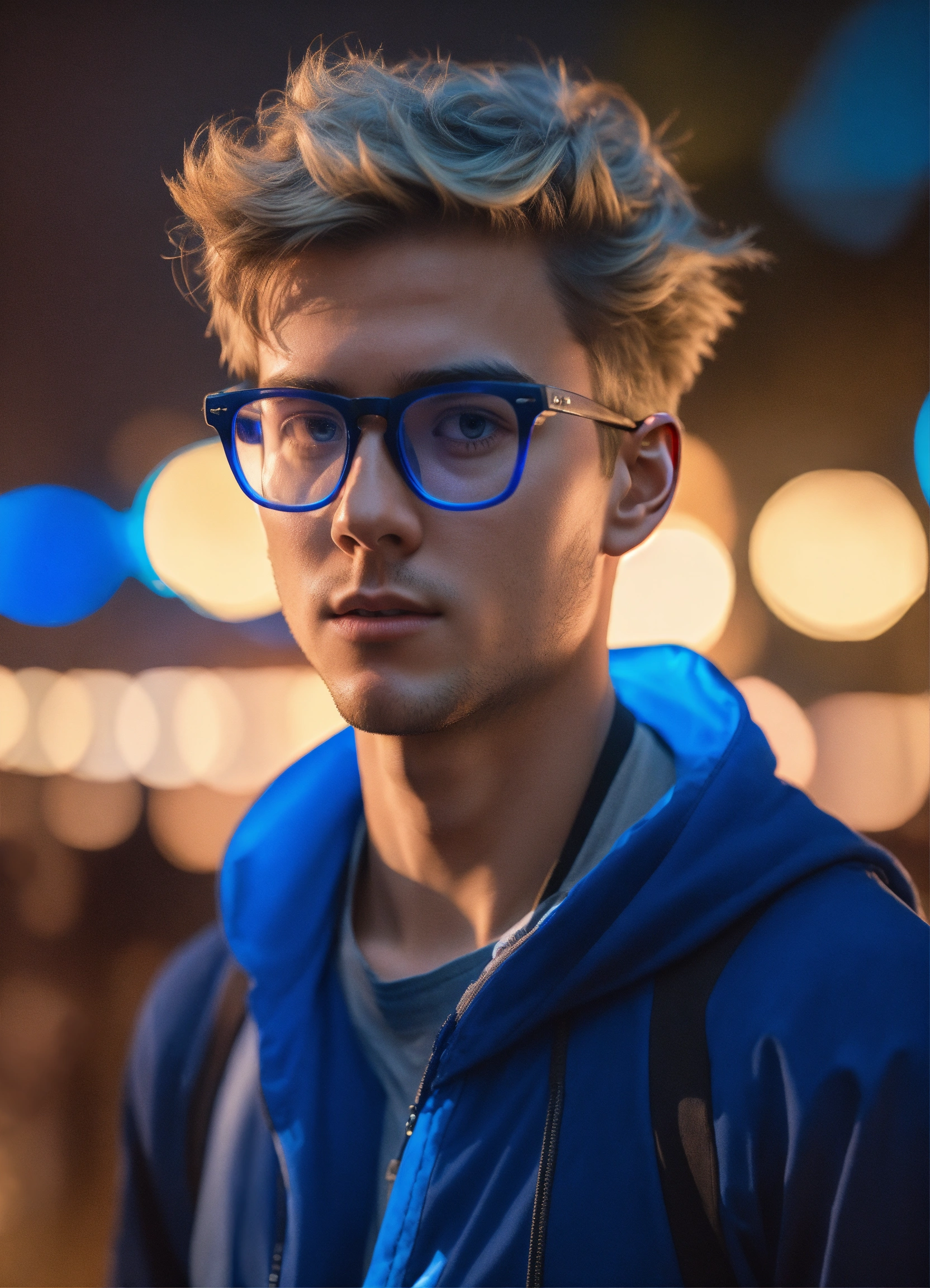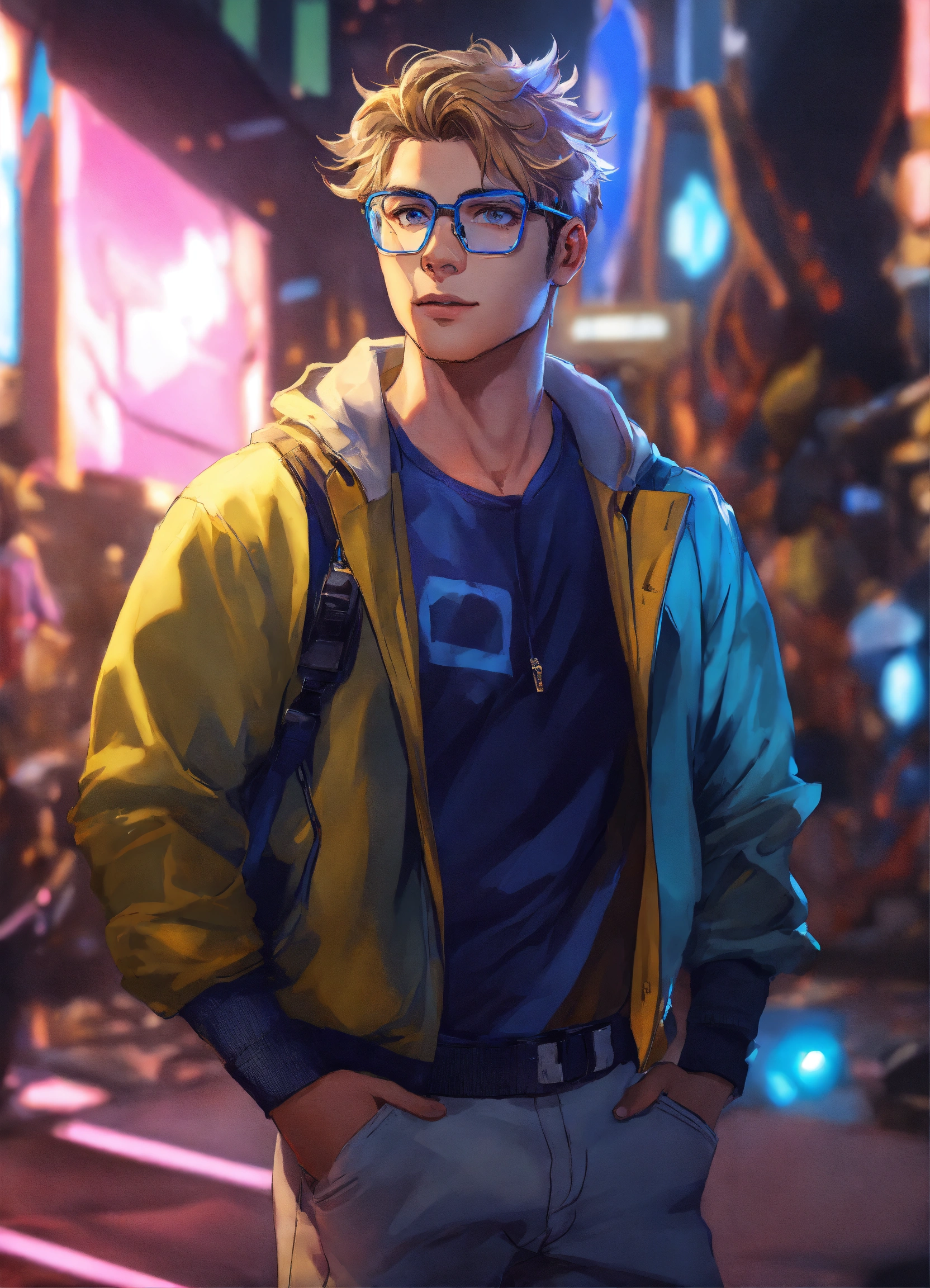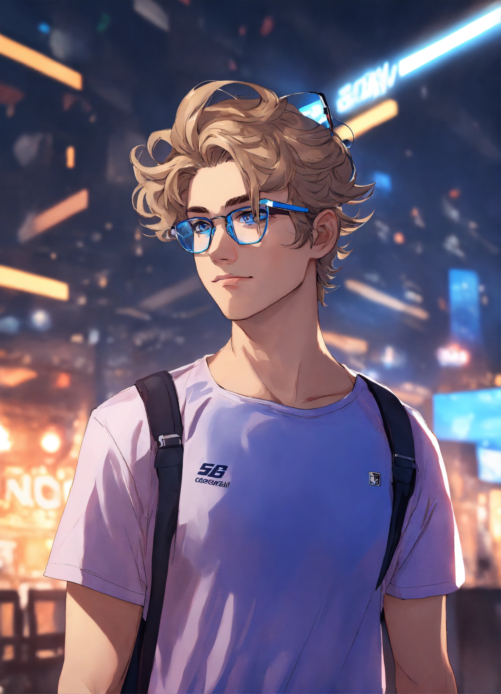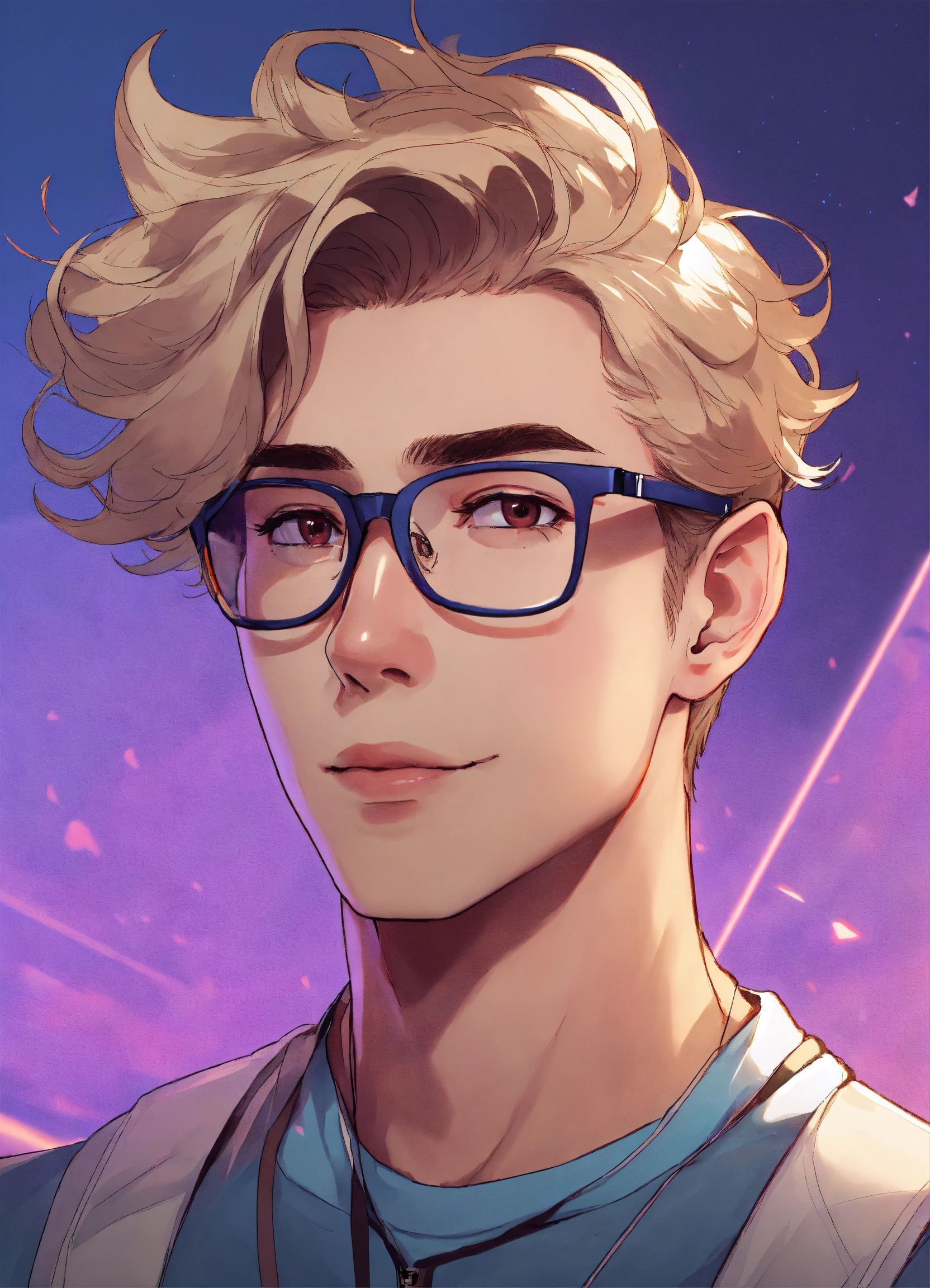 Male streamer, short dark blonde hair, no facial hair, square jaw, blue light glasses, hair flipped up, wavy hair, athletic