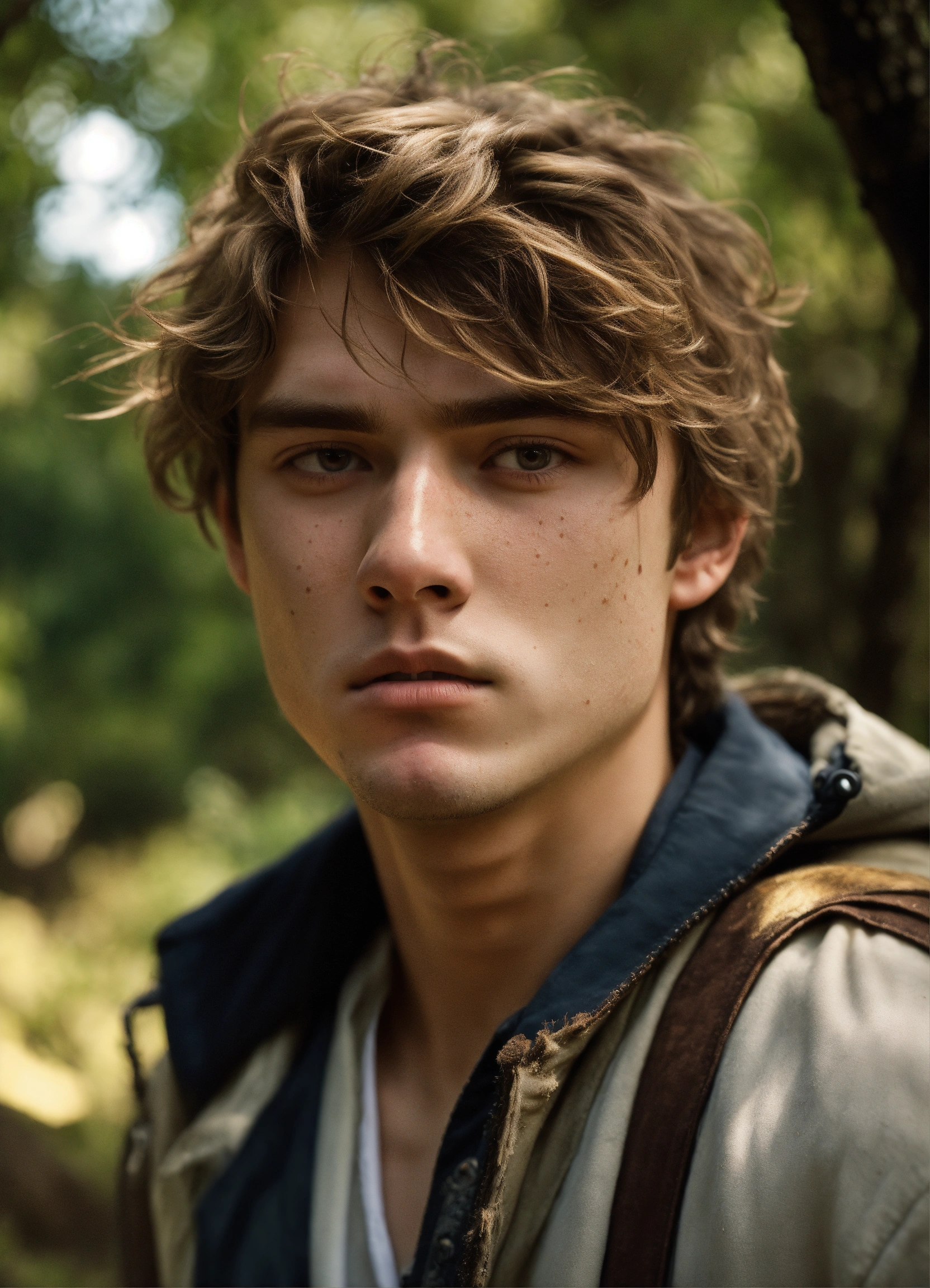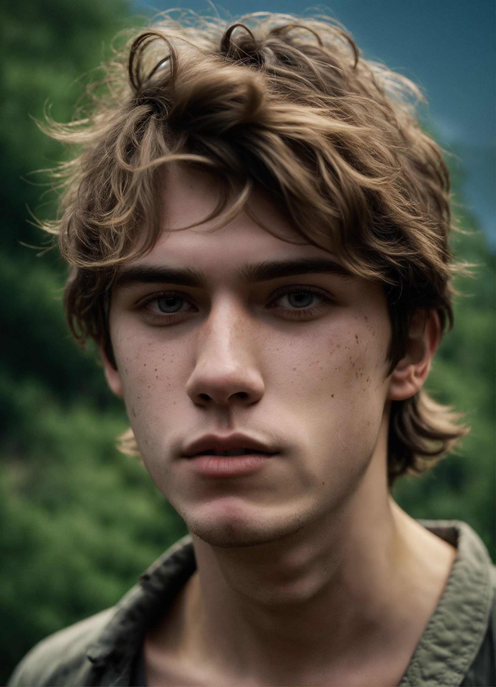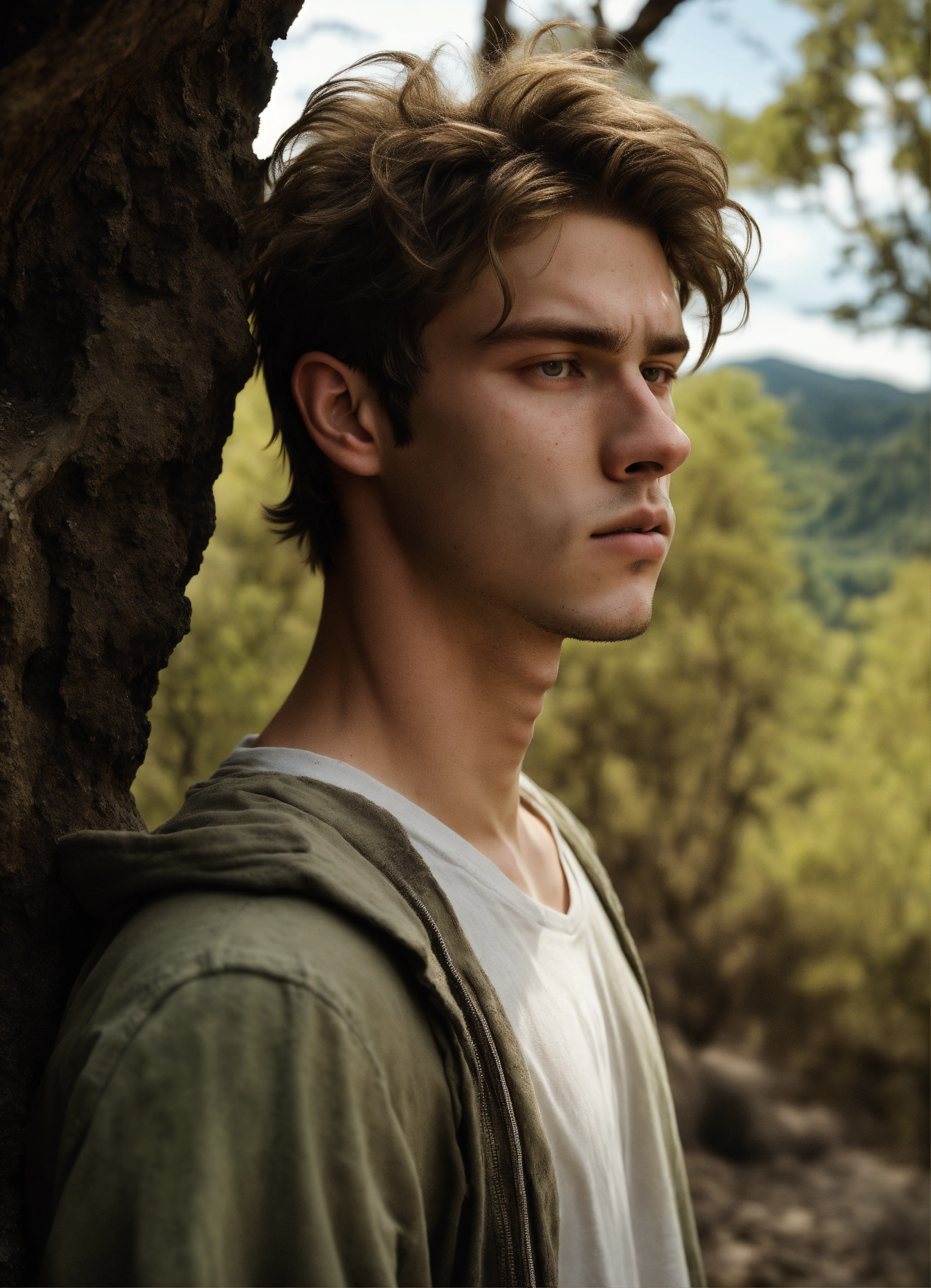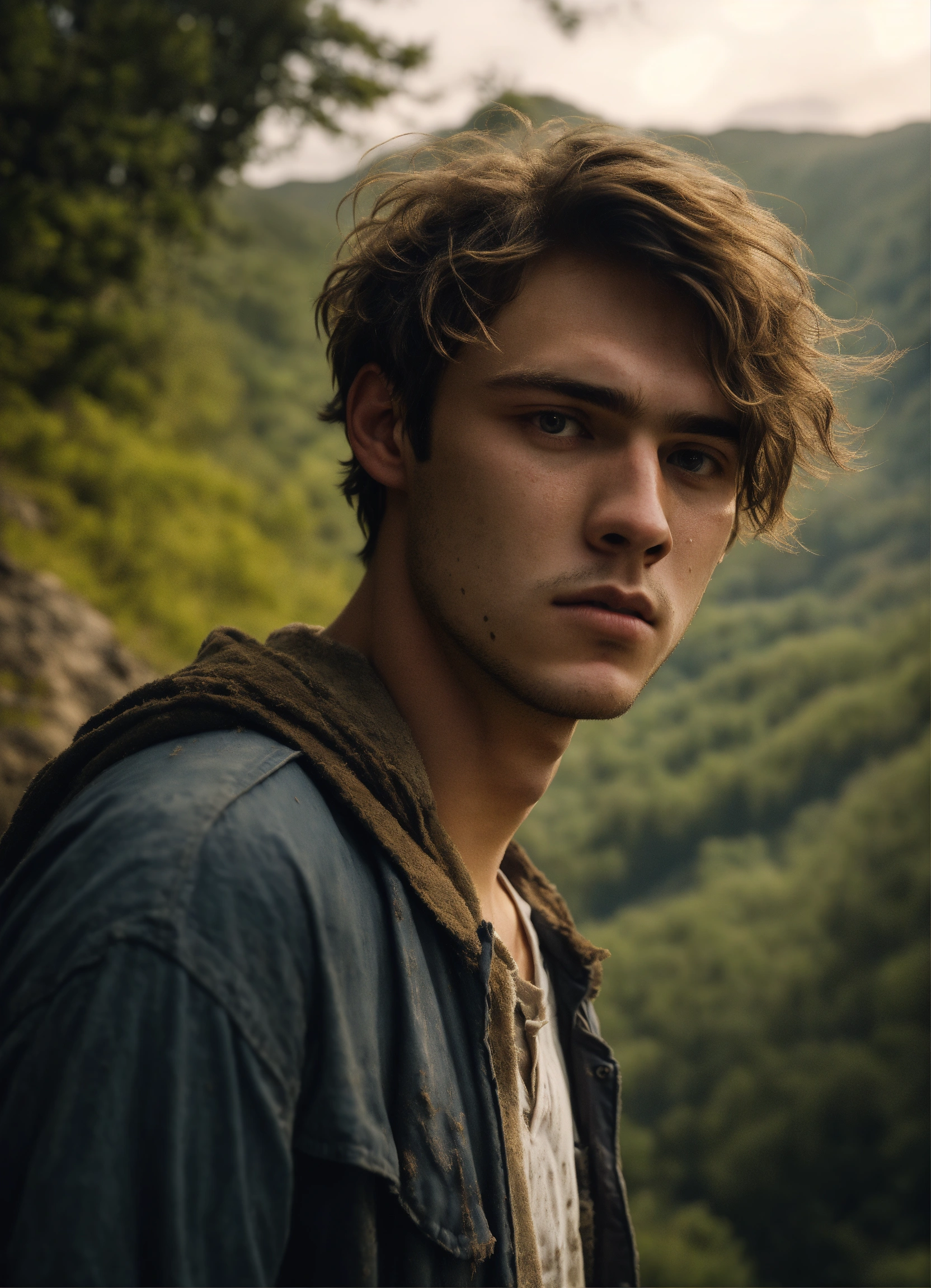 A highly realistic photograph of a white 21 years old boy, with dirty face, thin lips, dark blonde hair, brown slanted eyes, messy hair, with some facial hair, white skin, sad expression, a rocky narrow valley with trees in the background, hyperrealistic, hyperdetailed, 4k